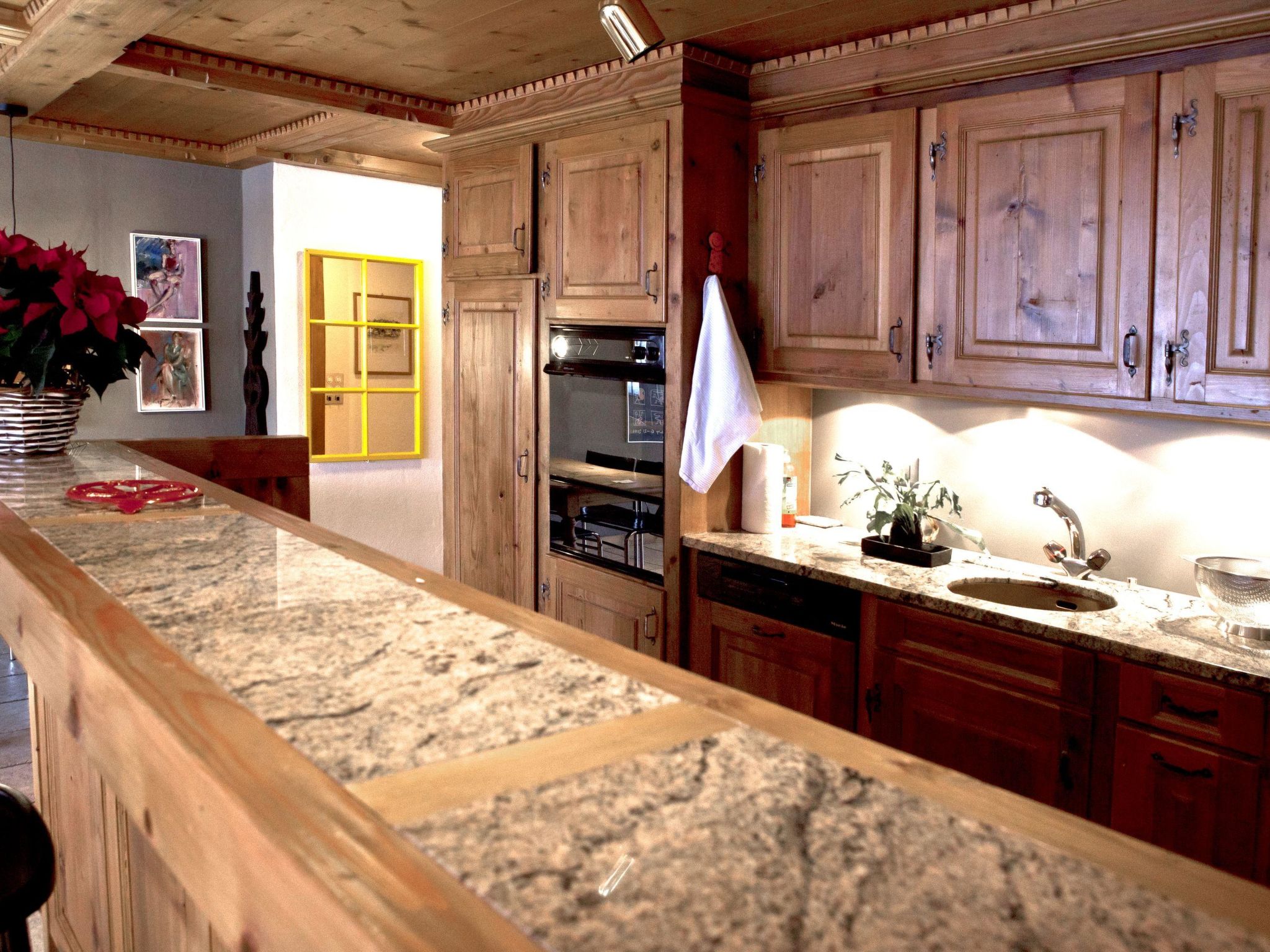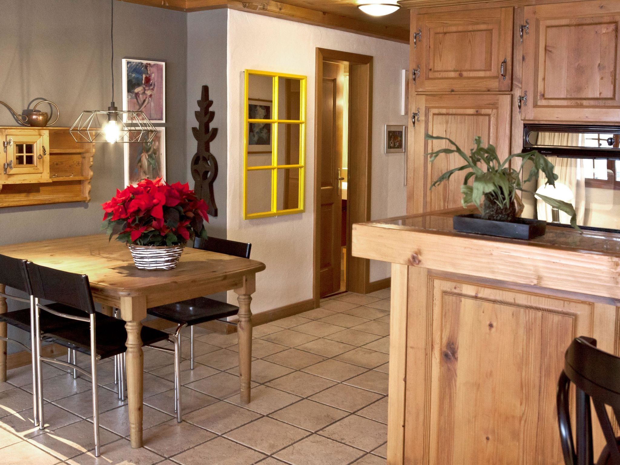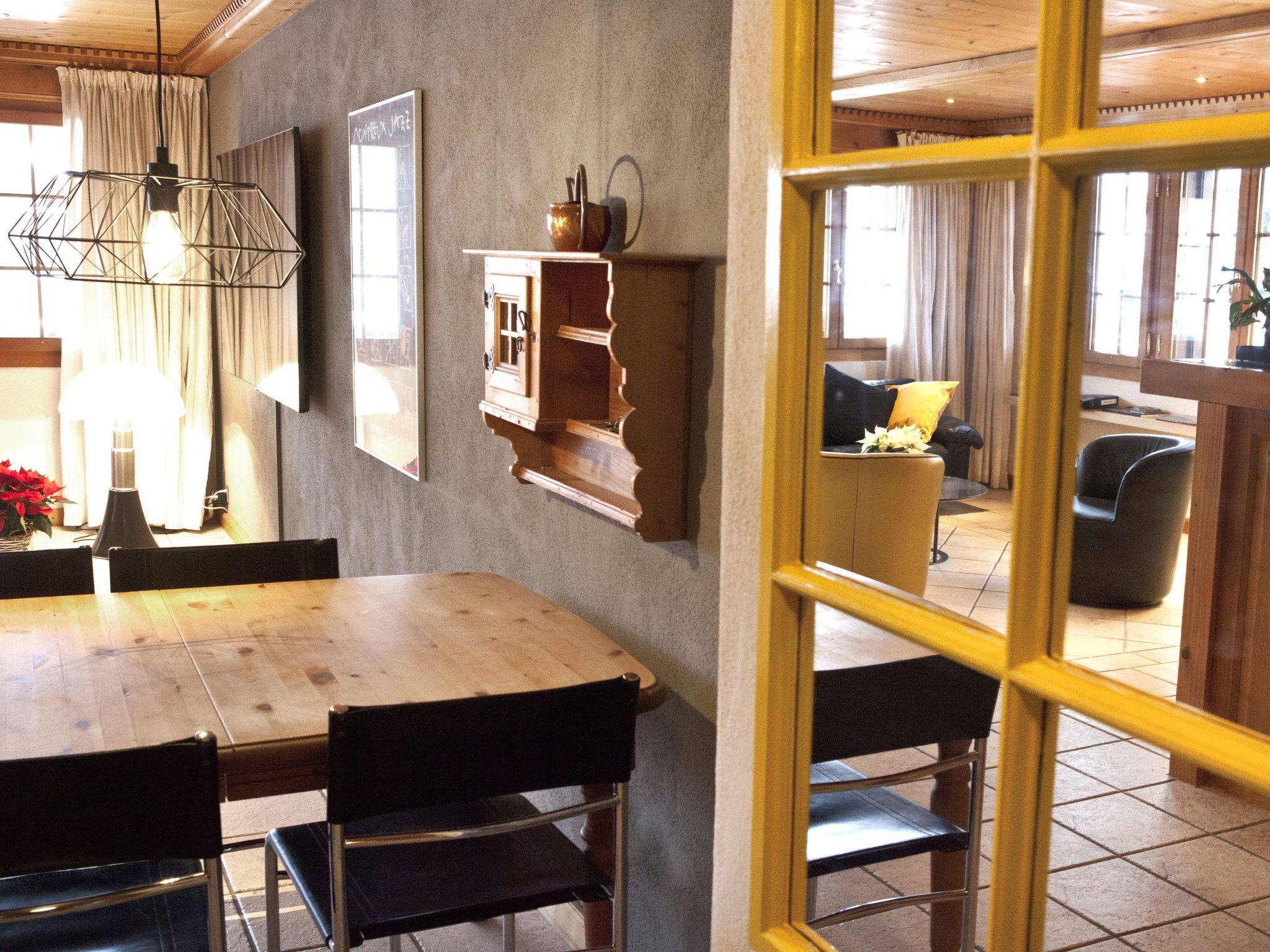Personenlift, Einbauschrank für Garderobe. Gemütliches Wohnzimmer mit ein 2er-Sofa, 2 Sesseln, grosser Flachbildschirm-TV/Radio, WiFi. Esstisch ausziehbar mit 6 Stühlen. Offene Küche mit Glaskeramikherd und Dampfabzug, Kühlschrank mit Gefrierfach, Backofen, Geschirrspüler, Toaster, Mikrowellegerät, Kapsel-Kaffeemaschine (Nespresso) und Fondue-Set. Eltern-Schlafzimmer mit 2 Betten (90x190cm), Einbauschrank und separate Dusche/WC, Kinder-Schlafzimmer mit 2 Betten (90x190cm), Einbauschrank. Badezimmer mit Bad und WC.