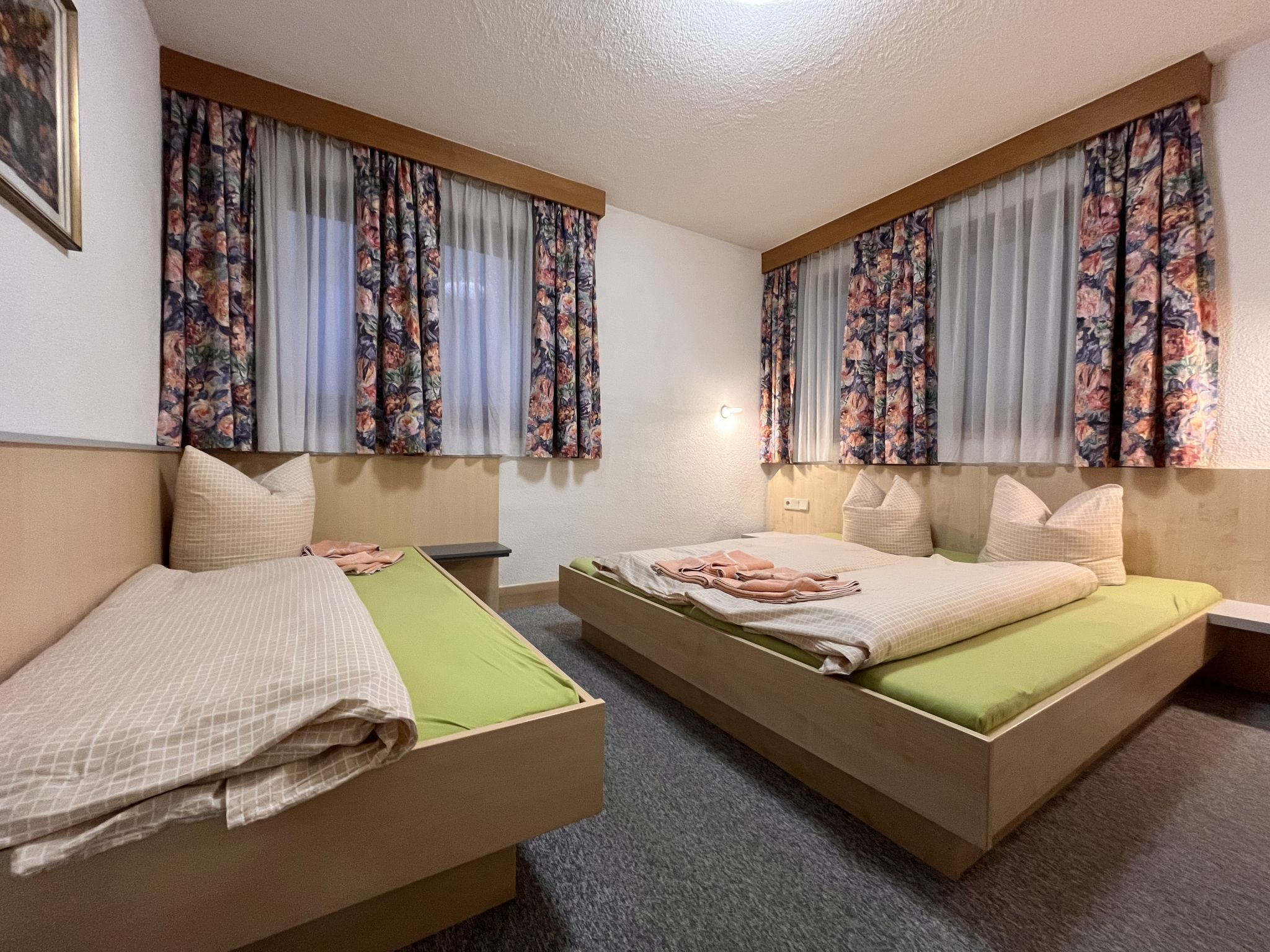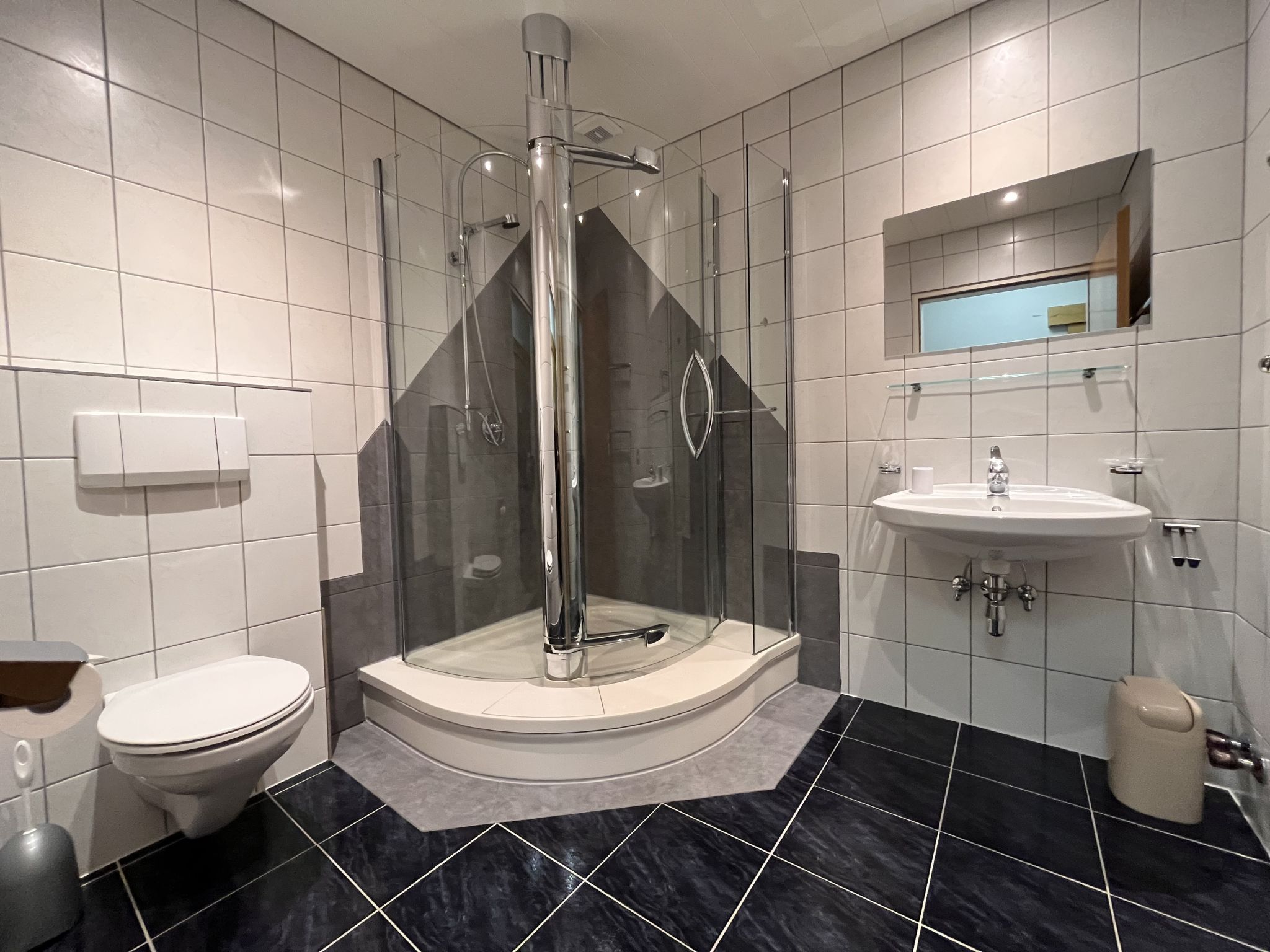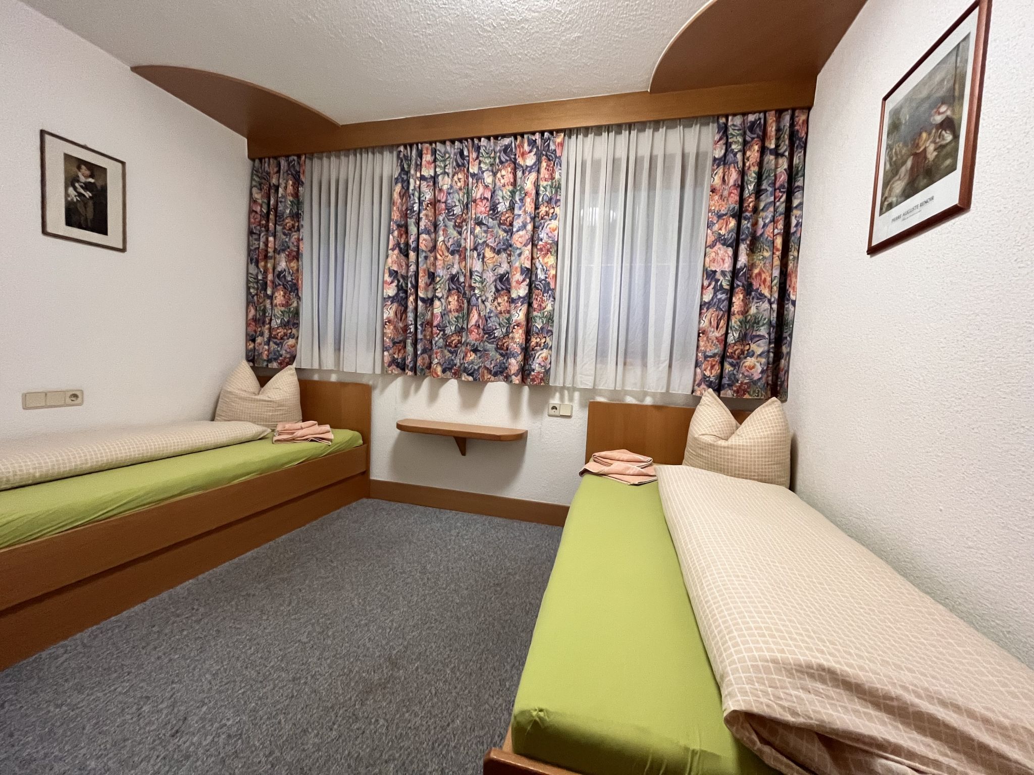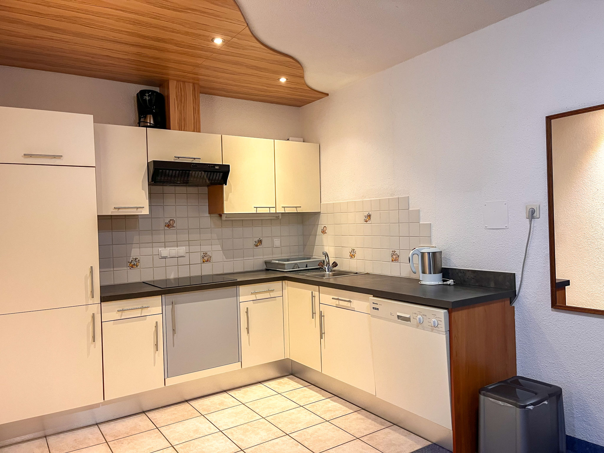 4-Zimmer-Wohnung, Erdgeschoss/Untergeschoss (Hanglage), ca. 100 m². Separater Zugang. Wohn-/Schlafraum mit Sitzgruppe und Einzelbett, großer Essplatz (Eckbank), Küchenzeile (4 Ceranfelder, Geschirrspüler, Kühlschrank, Kaffeemaschine). Vom Wohn-/Schlafraum Zugang zu Doppelzimmer mit Dusche/WC sowie zu kleiner Zwischendiele, von dieser weiter in: Zweibettzimmer (Schachtfenster). Schlafzimmer mit Doppelbett und Einzelbett (Schachtfenster). Dusche/WC. Sep.WC.
