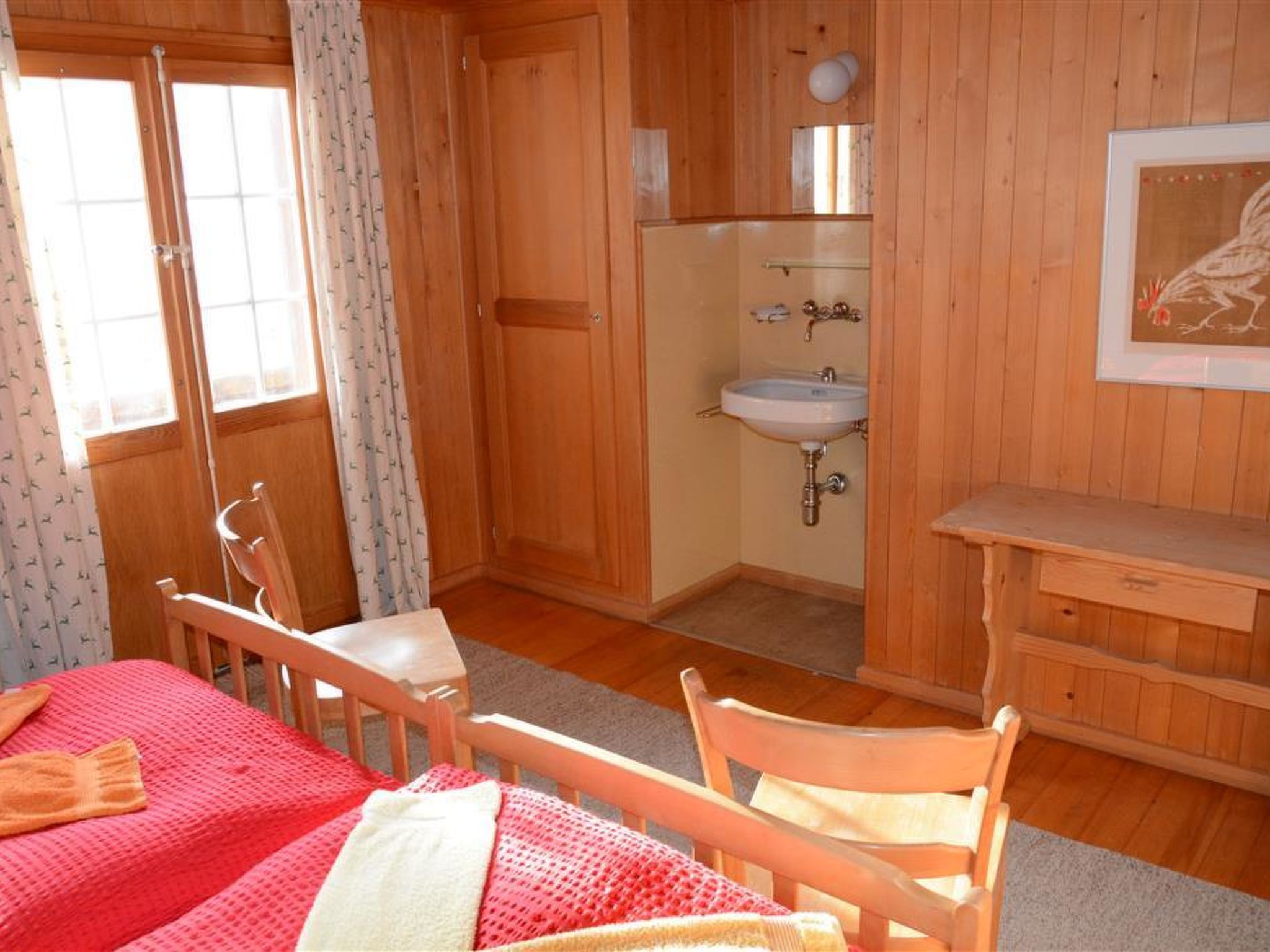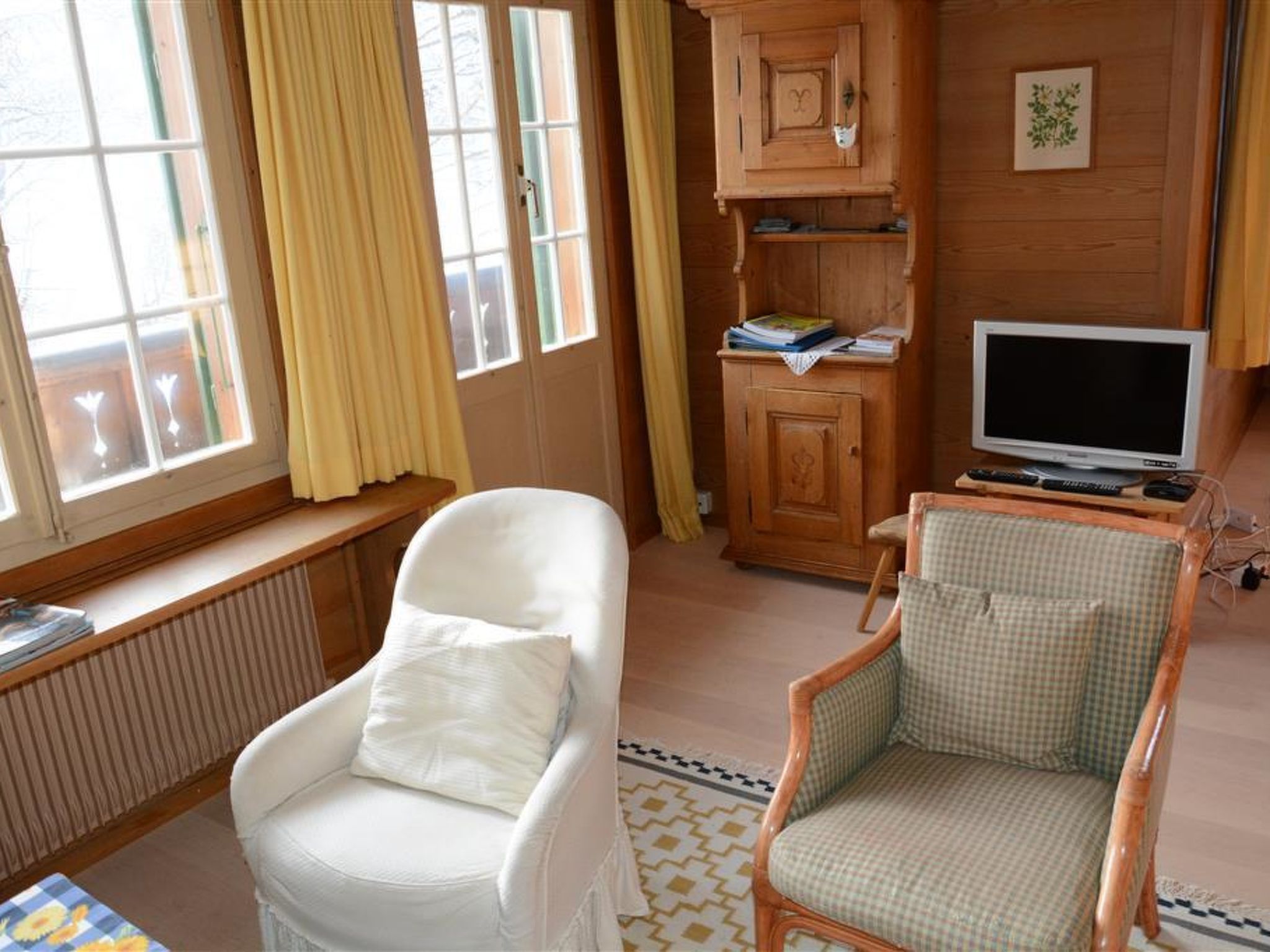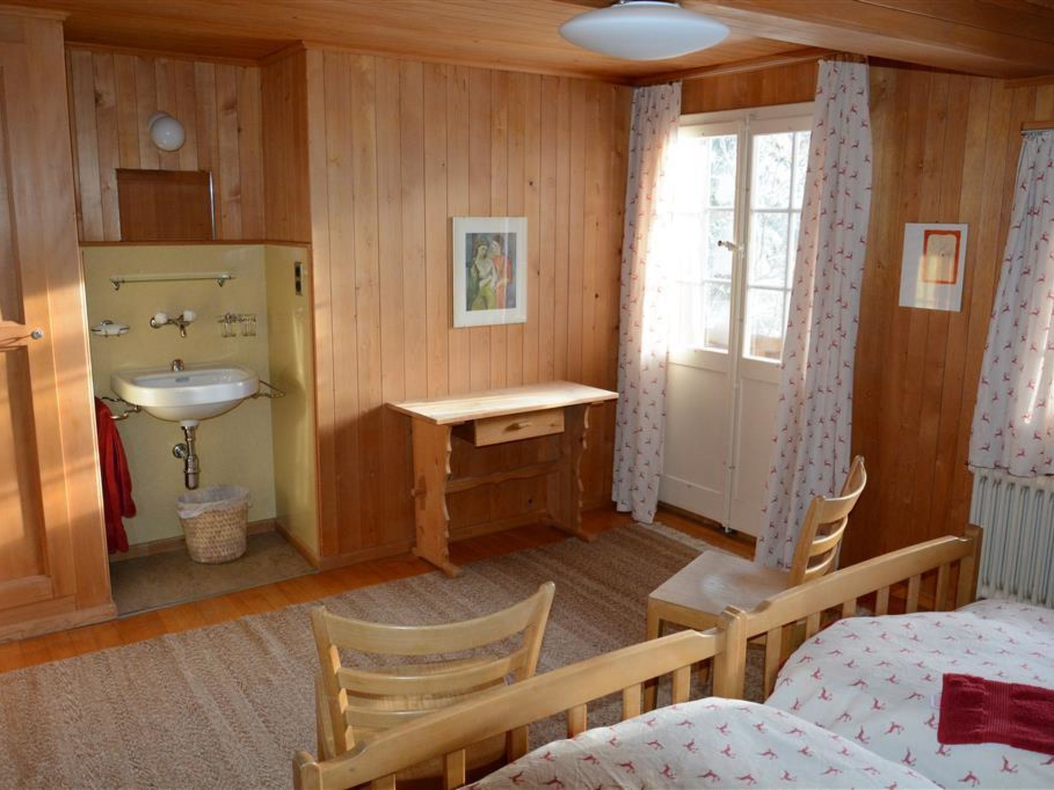 Gemütliches Holz-Chalet auf 3 Etagen. Erdgeschoss: Spielzimmer mit Tischtennistisch. Waschmaschine und Wäschetrockner. 1. Stock: Ess-/Wohnzimmer mit Sitzgruppe, Radio, TV, Balkon. Ältere Küche u.a. ausgestattet mit Mikrowelle, Geschirrspüler, Kühlschrank mit Gefrierfach, Kaffeevollautomat, Fondue- und Raclette-Set sowie Durchreiche ins Ess-/Wohnzimmer. 1 kleineres Schlafzimmer mit Doppelbett (2x90x200cm). Bad, WC. 2. Stock: 1 kleines Schlafzimmer mit Einzelbett (90x200cm) und Lavabo. 2 Schlafzimmer mit Doppelbett (2x90x200cm), Lavabo und Balkon. Dusche/WC. WiFi.