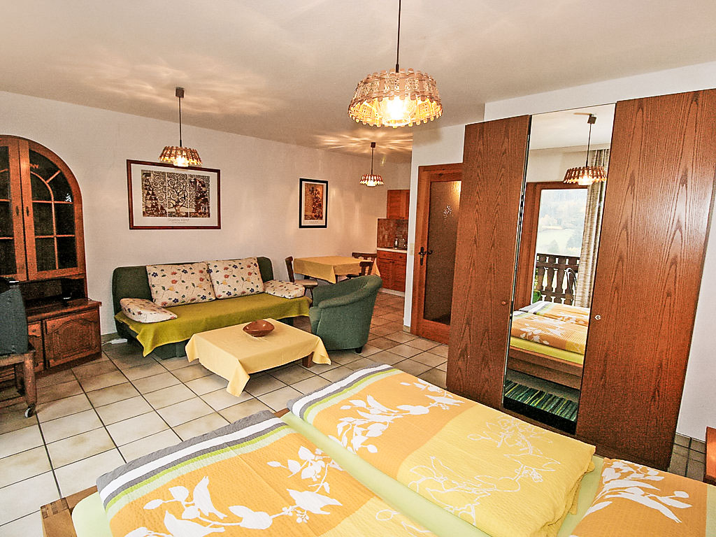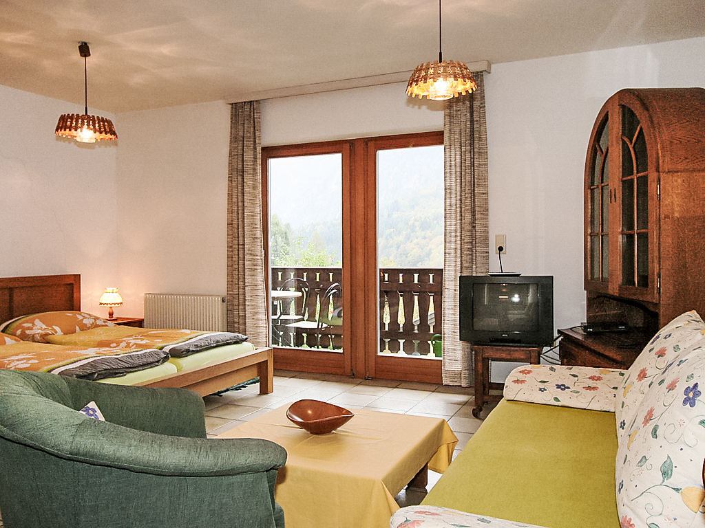 1-Zimmer-Studio 38 m2. Gemütlich eingerichtet: Wohn-/Schlafzimmer mit 1 Diwanbett, 1 Doppelbett, Esstisch und Sat-TV. Kleine, offene Küche (4 Kochplatten). Dusche/WC. Balkon, Südlage. Balkonmöbel. Schöne Sicht auf die Berge. Zur Verfügung: Telefon. Internet (Wireless LAN, gratis). 1 Haustier/Hund erlaubt.