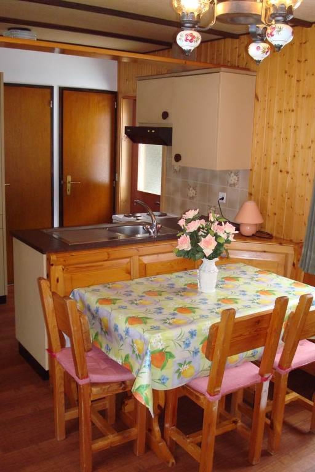 2 Zimmer Chalet, ca. 29 m2, Wohn und Schlafraum mit Doppelbettcouch, Zweibettzimmer, Essecke, Kochnische (3 Platten, Backofen, Dampfabzug, Kühlschrank mit Gefrierfach, Kaffeemaschine und Wasserkocher ), TV, Dusche/WC