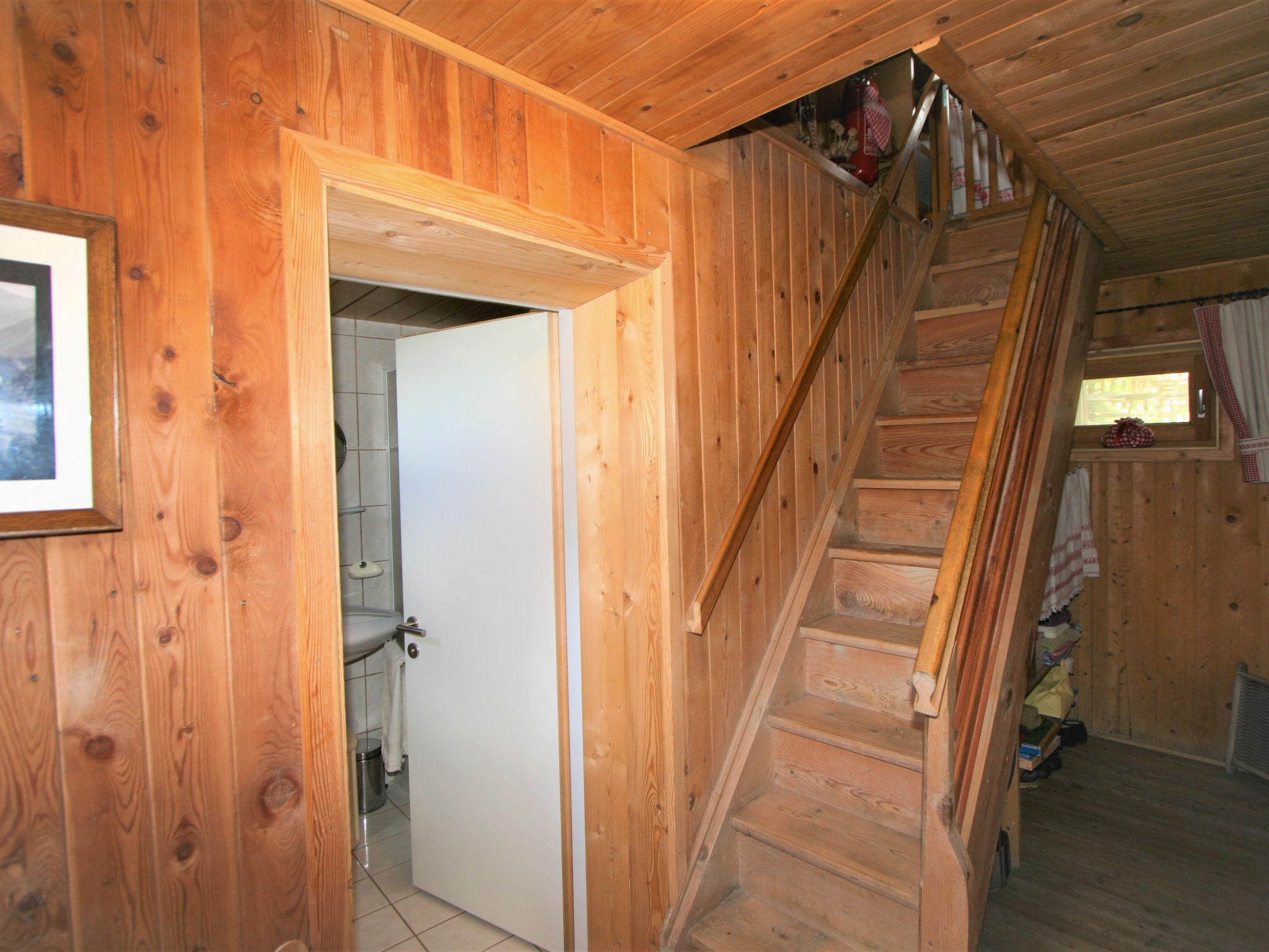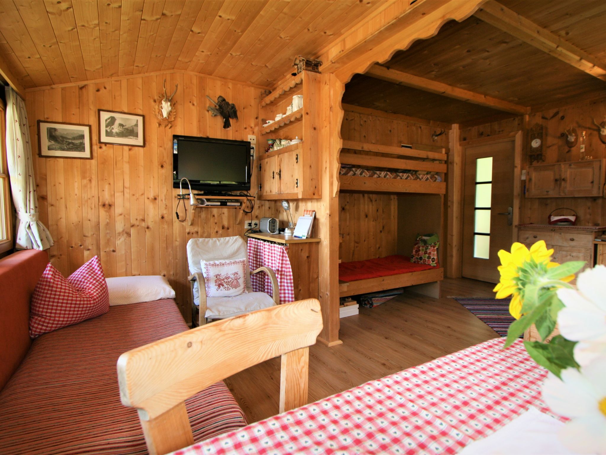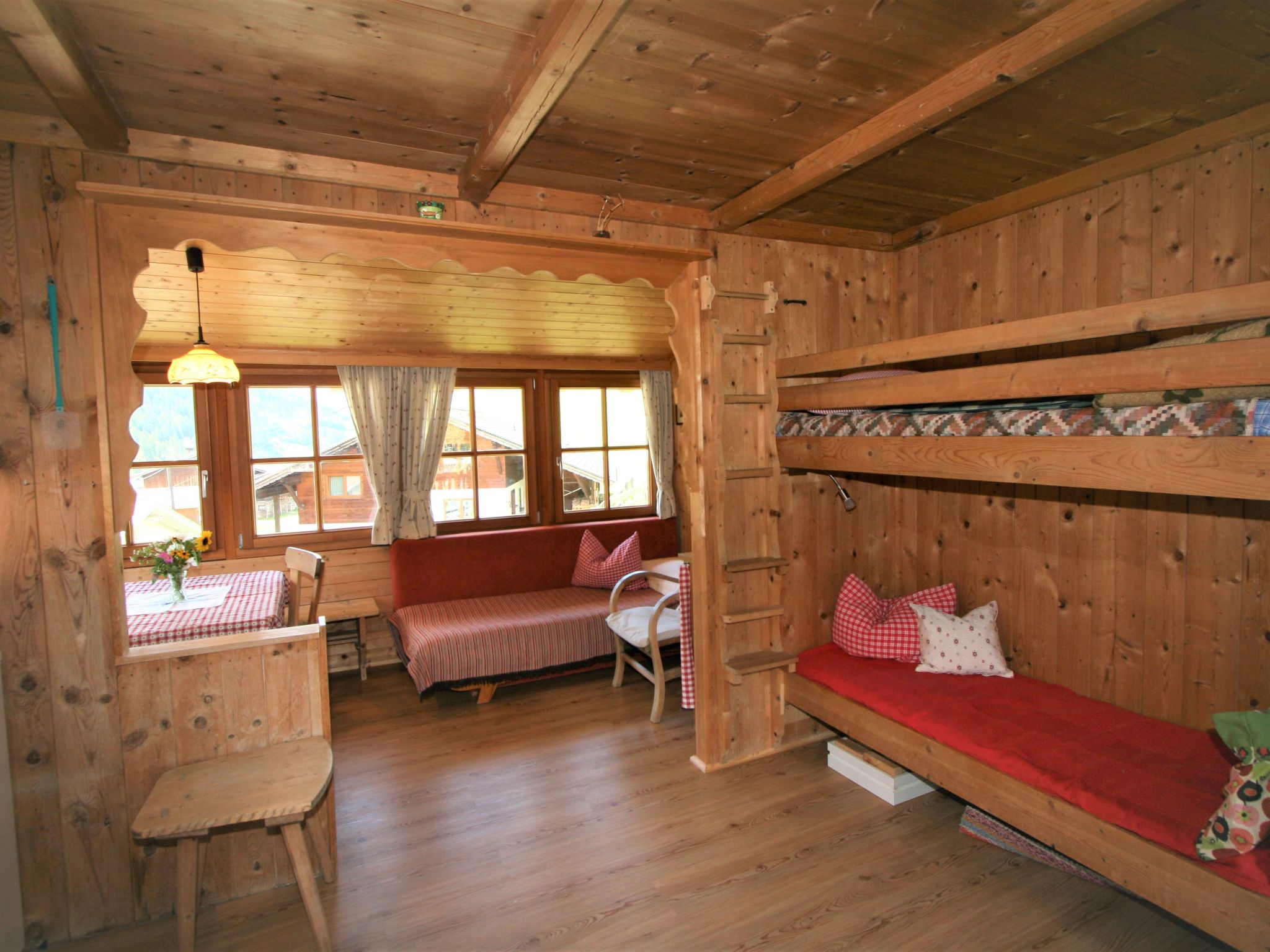 2-Zimmer-Haus 50 m2 auf 2 Stockwerken. Einfach und rustikal eingerichtet: offenes Wohn-/Esszimmer mit 1 Doppeldiwanbett (140 cm, Länge 200 cm), Essecke und Sat-TV. Offene Galerie mit 1 Bett. Wohnküche (4 Kochplatten, Backofen). Unteres Geschoss: 1 Zimmer mit 1 Bett (Länge 180 cm), 1 Doppelbett (Länge 190 cm). Ausgang zum Garten. Dusche/WC. Bodenheizung. Balkon. Balkonmöbel. Zur Verfügung: Internet (Wireless LAN, gratis). Bei der Galerie handelt es sich um einen Gang, der durch einen Vorhang abgetrennt wird . Holzzusatzherd.