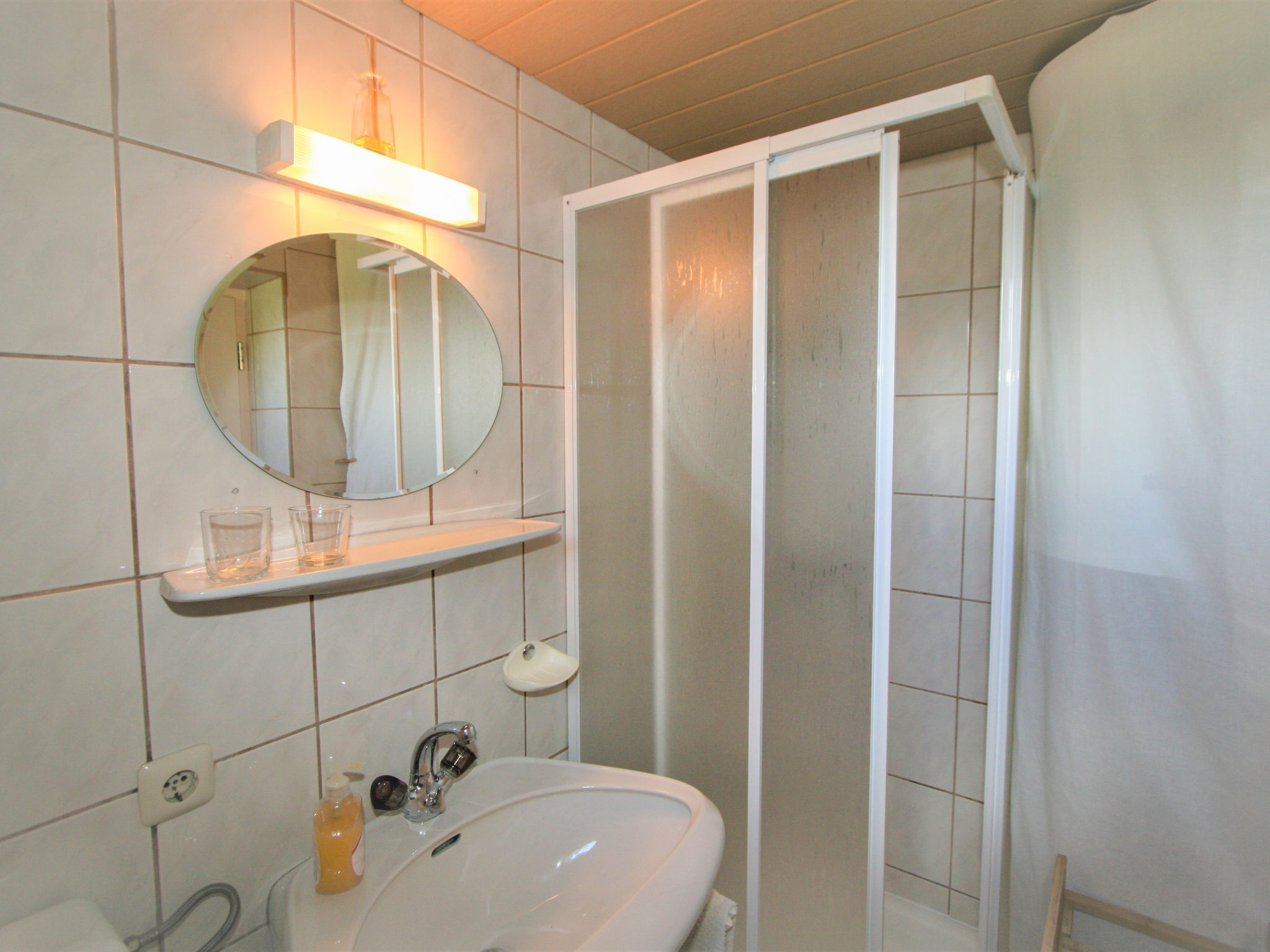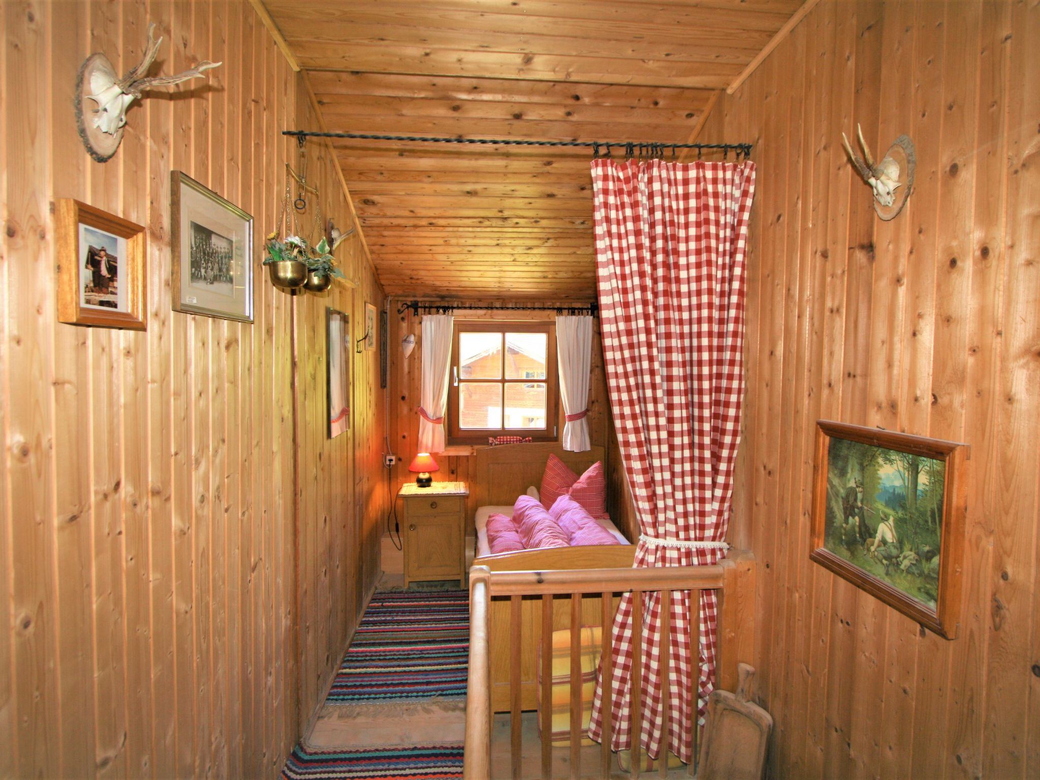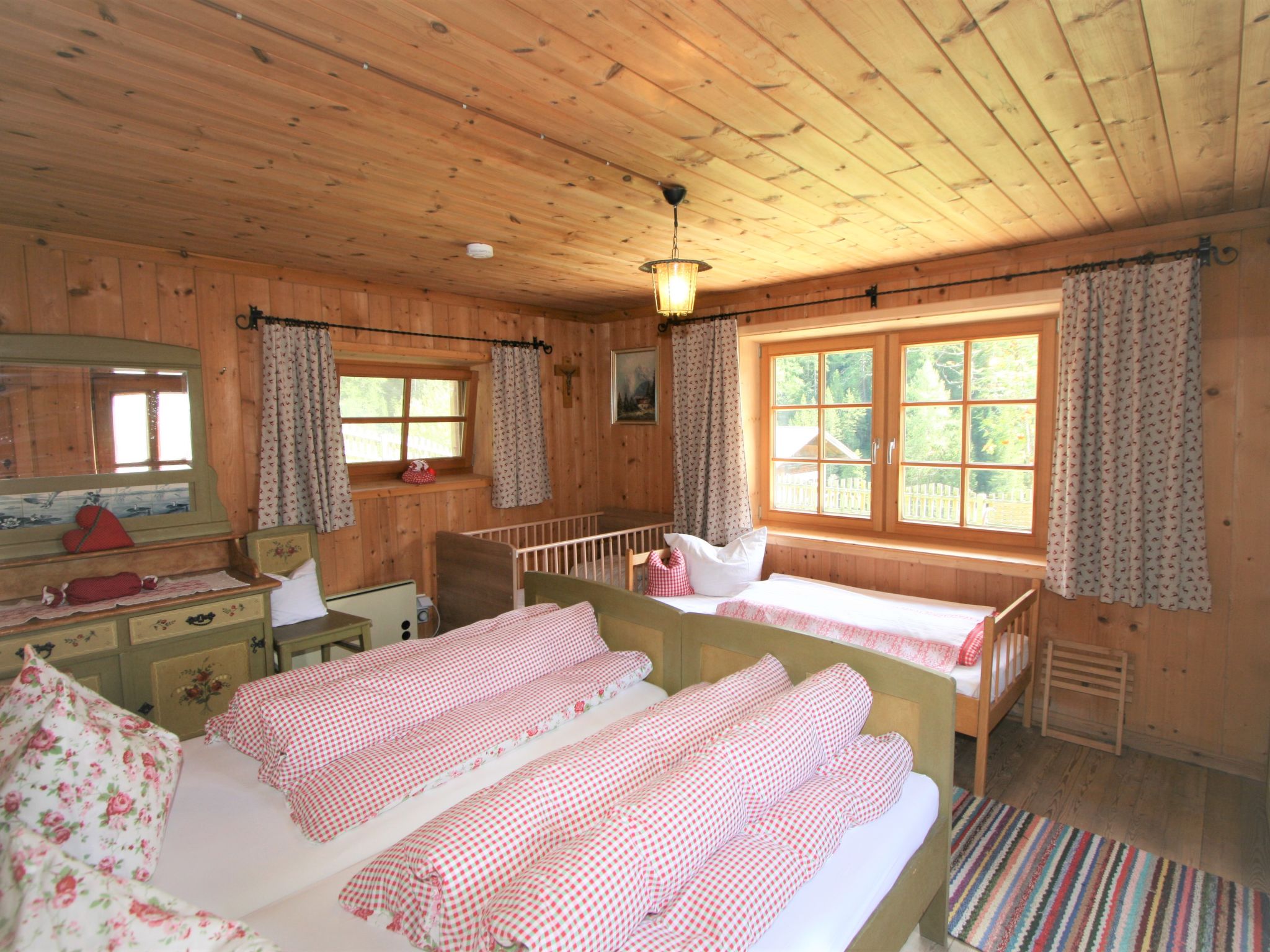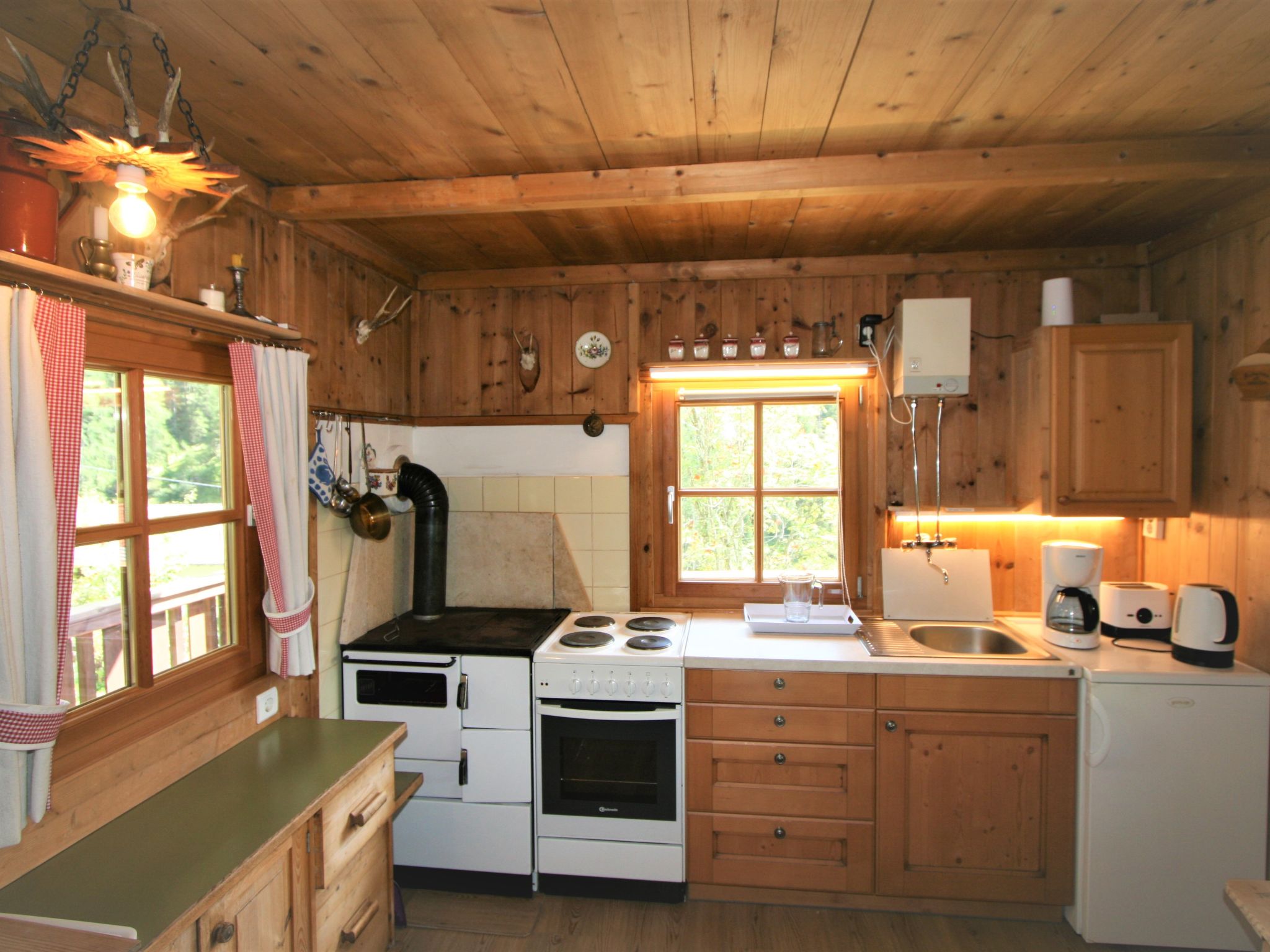 2-Zimmer-Haus 50 m2 auf 2 Stockwerken. Einfach und rustikal eingerichtet: offenes Wohn-/Esszimmer mit 1 Doppeldiwanbett (140 cm, Länge 200 cm), Essecke und Sat-TV. Offene Galerie mit 1 Bett. Wohnküche (4 Kochplatten, Backofen). Unteres Geschoss: 1 Zimmer mit 1 Bett (Länge 180 cm), 1 Doppelbett (Länge 190 cm). Ausgang zum Garten. Dusche/WC. Bodenheizung. Balkon. Balkonmöbel. Zur Verfügung: Internet (Wireless LAN, gratis). Bei der Galerie handelt es sich um einen Gang, der durch einen Vorhang abgetrennt wird . Holzzusatzherd.