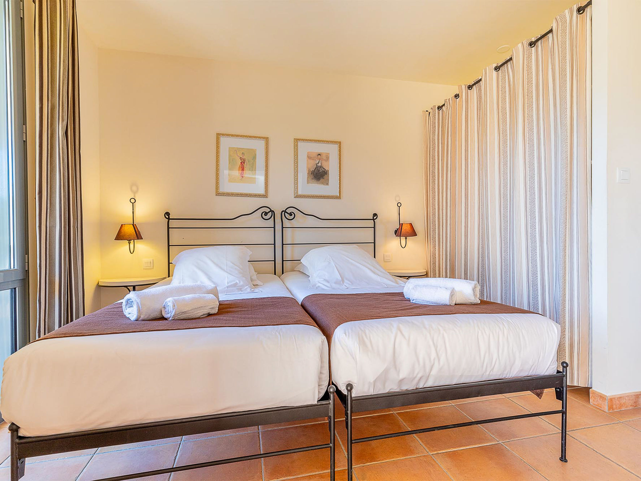 "Provence Country Club", 2-Zimmer-Wohnung 38 m2. Zweckmässig eingerichtet: Wohn-/Schlafzimmer mit 1 Diwanbett, 1 Ausziehbett, Esstisch und TV. 1 Zimmer mit Schiebetür mit 2 Betten. Kochnische (Geschirrspüler, 4 Glaskeramikplatten, Toaster, Wasserkocher, Mikrowelle, elektrische Kaffeemaschine). Bad, sep. WC. E-Heizung. Balkon oder Terrasse. Terrassenmöbel, Balkonmöbel. Zur Verfügung: Safe (extra), Kinderhochstuhl, Babybett. Internet (WLAN, extra). Parkplatz. Bitte beachten: Nichtraucher-Unterkunft. Maximal 2 Haustiere/Hunde erlaubt. Rauchmelder, Feuerlöscher.