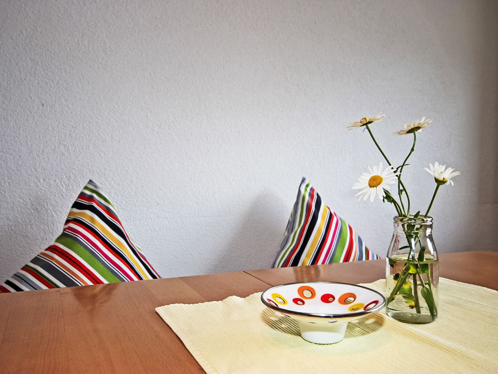 3-Zimmer-Wohnung 52 m2 im 1. Stock. Gemütlich eingerichtet: Wohn-/Schlafzimmer mit 1 Diwanbett, Esstisch, Sat-TV und DVD. 2 Doppelzimmer. Kochnische (4 Kochplatten, Backofen, Geschirrspüler, Mikrowelle, elektrische Kaffeemaschine). Dusche, sep. WC, Doppelwaschbecken. Balkon. Balkonmöbel. Schöne Sicht auf die Berge und die Ortschaft. Zur Verfügung: Safe, Haartrockner. Internet (Wireless LAN, gratis). Bitte beachten: Nichtraucher-Unterkunft.
