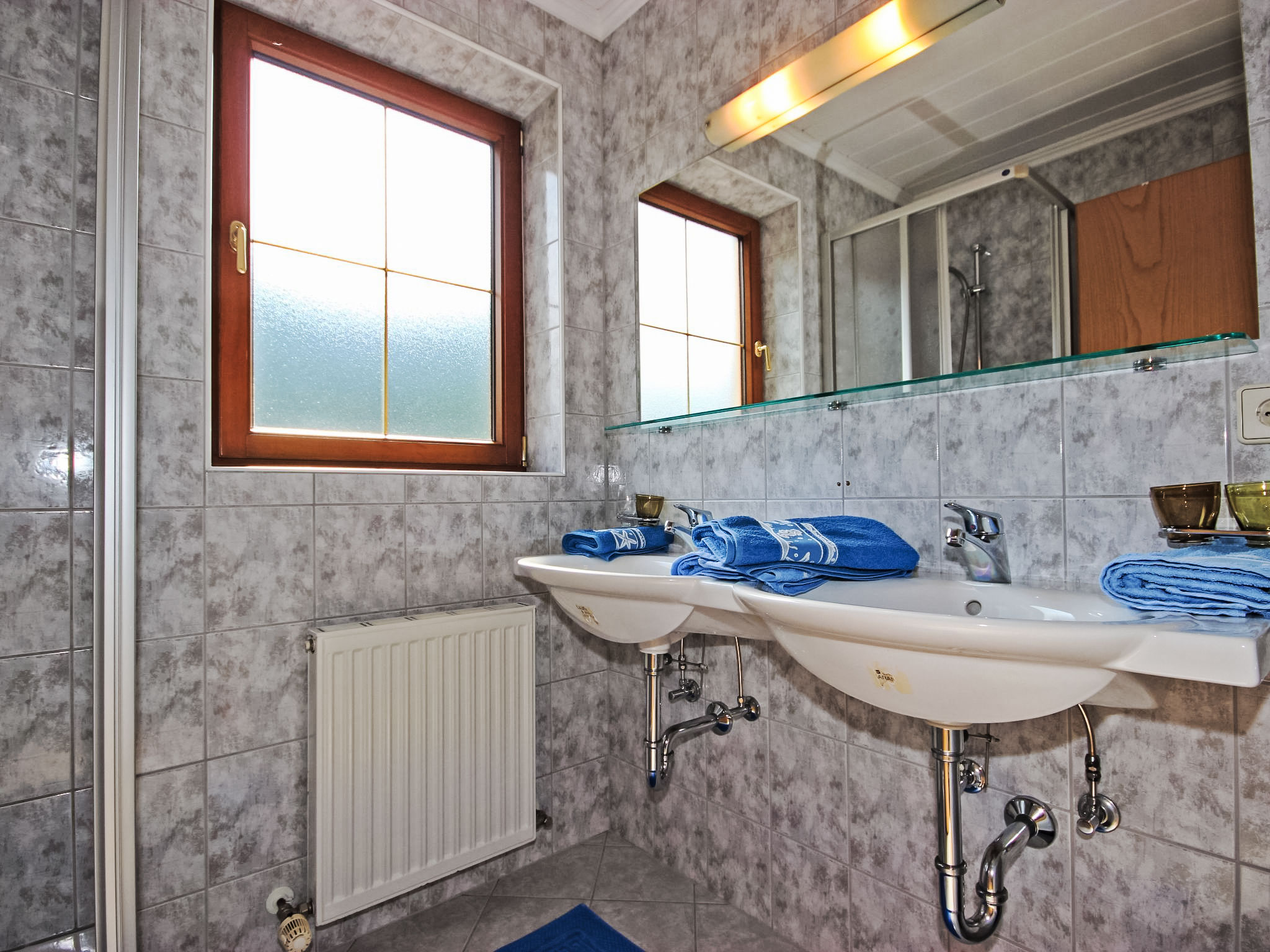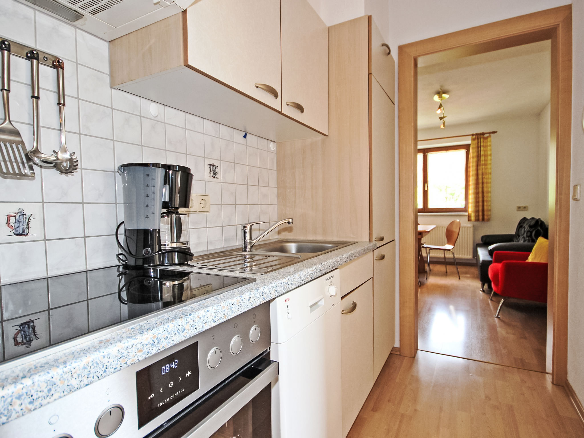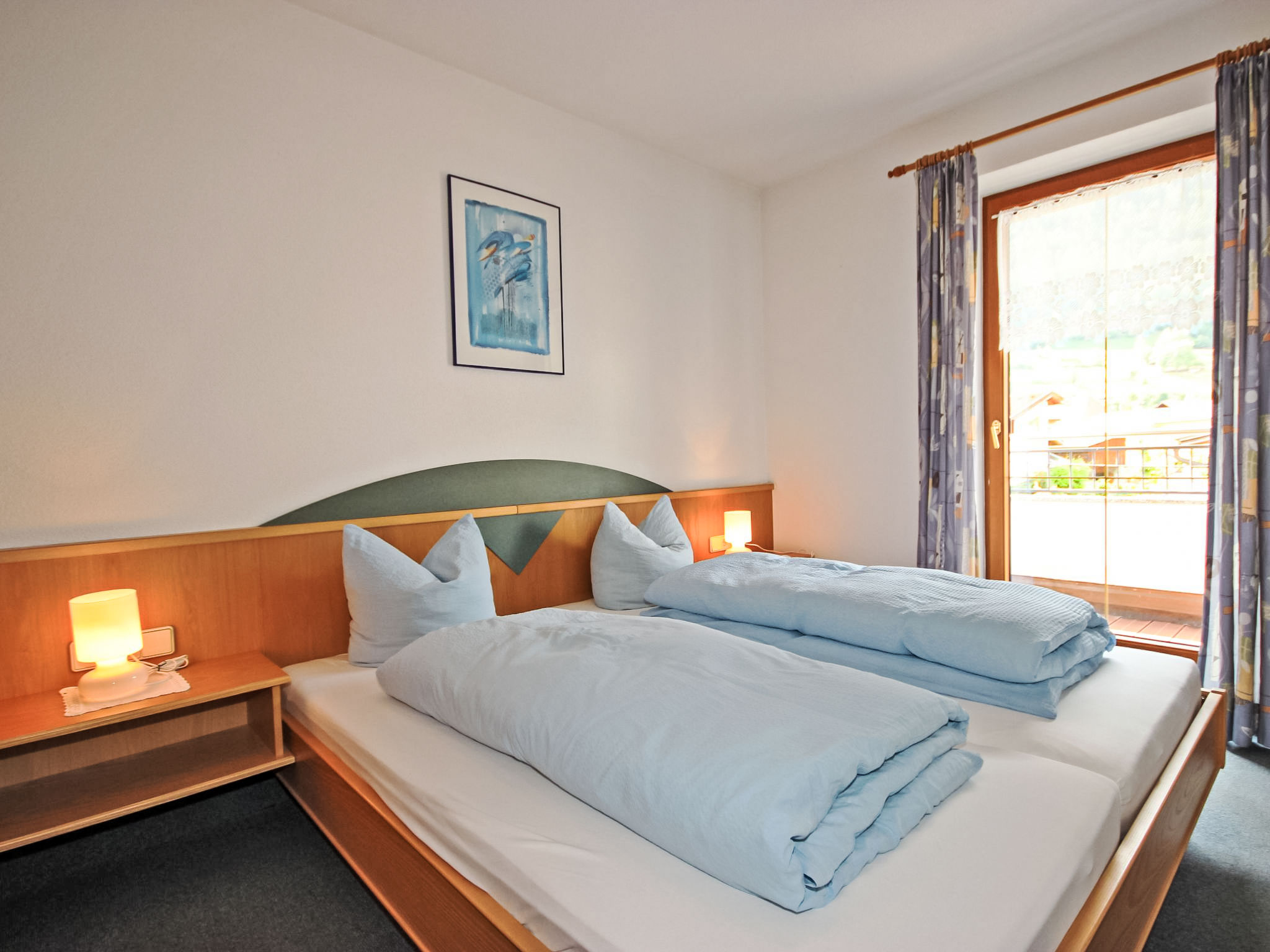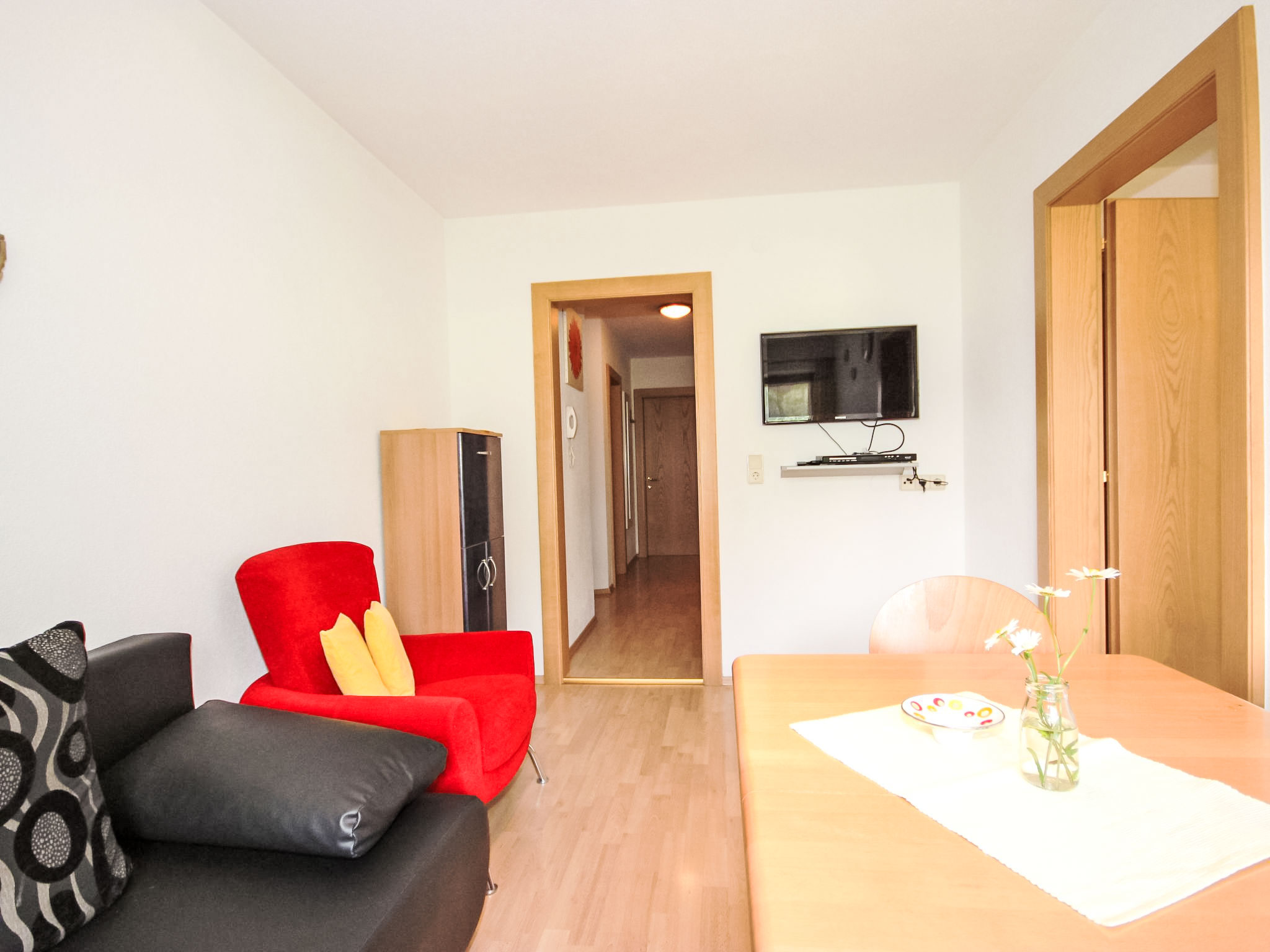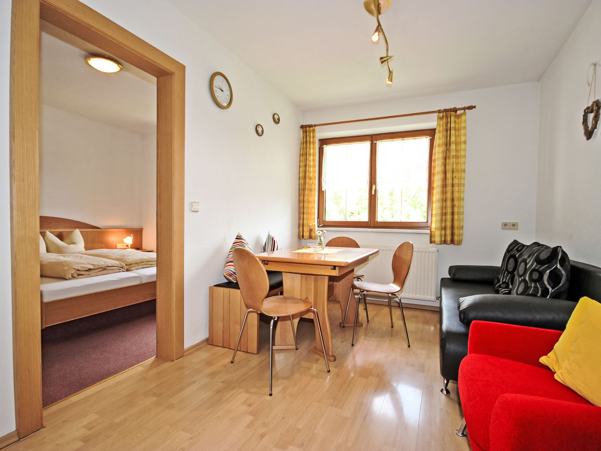 3-Zimmer-Wohnung 52 m2 im 1. Stock. Gemütlich eingerichtet: Wohn-/Schlafzimmer mit 1 Diwanbett, Esstisch, Sat-TV und DVD. 2 Doppelzimmer. Kochnische (4 Kochplatten, Backofen, Geschirrspüler, Mikrowelle, elektrische Kaffeemaschine). Dusche, sep. WC, Doppelwaschbecken. Balkon. Balkonmöbel. Schöne Sicht auf die Berge und die Ortschaft. Zur Verfügung: Safe, Haartrockner. Internet (Wireless LAN, gratis). Bitte beachten: Nichtraucher-Unterkunft.