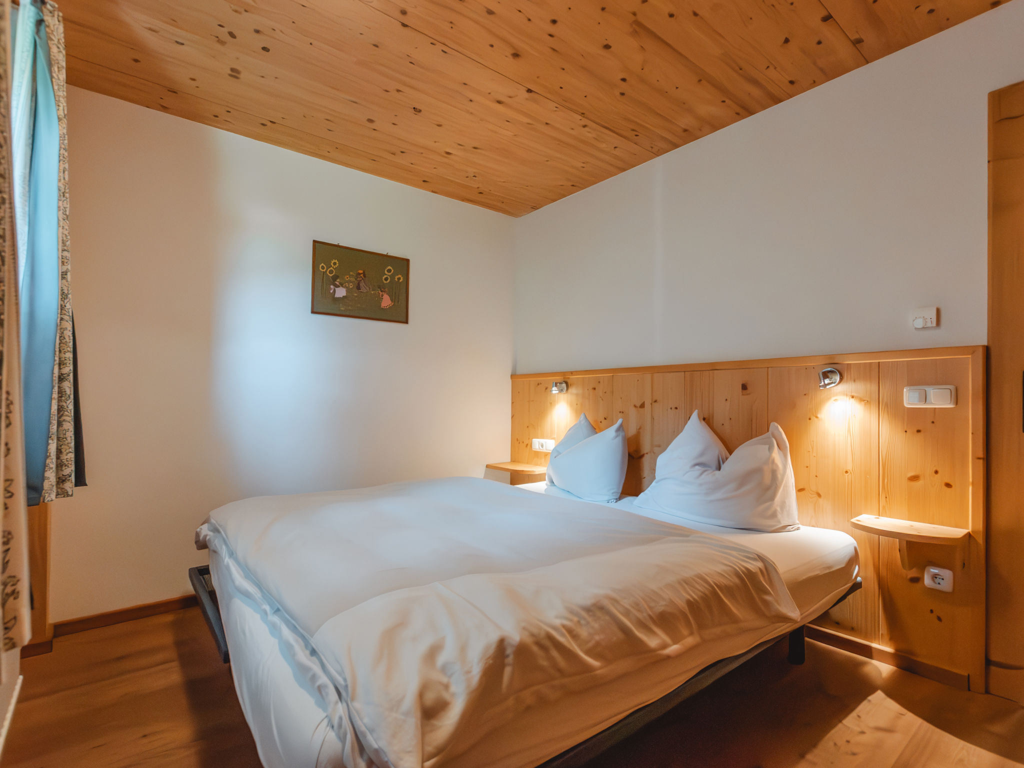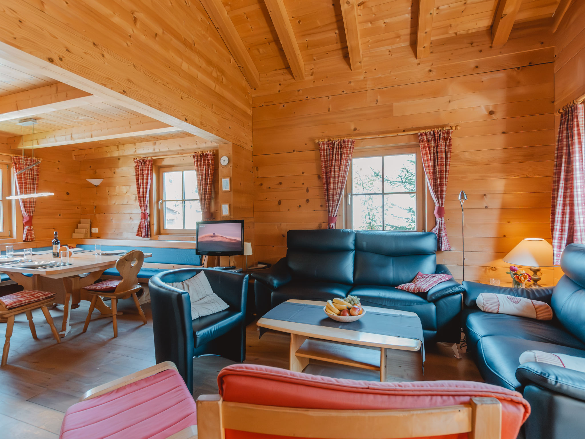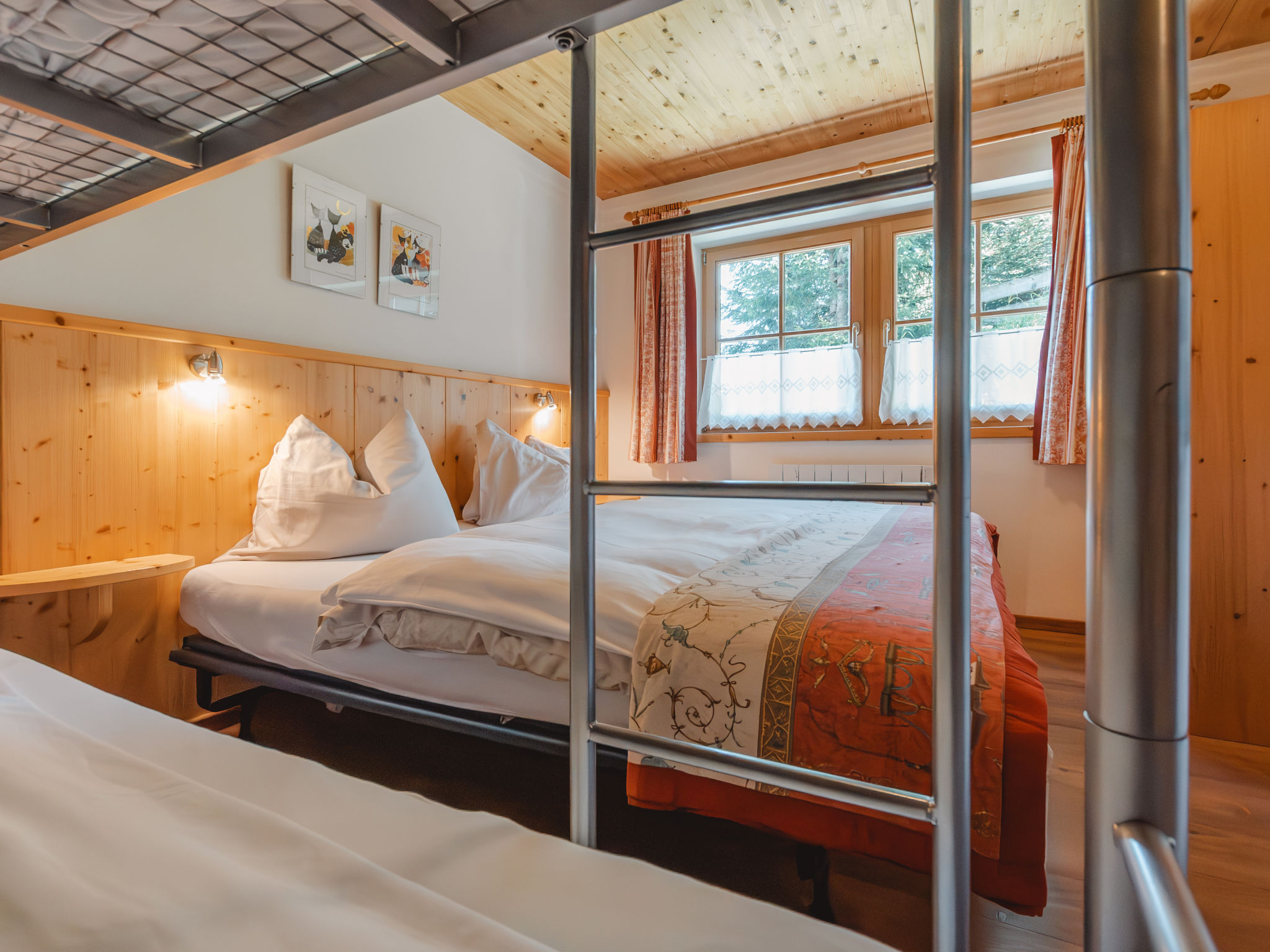 4-Zimmer-Haus 100 m2 auf 2 Stockwerken. Komfortabel und geschmackvoll eingerichtet: grosses Wohn-/Schlafzimmer mit Schwedenofen und Sat-TV. 2 Doppelzimmer. 1 Zimmer mit 1 x 2 Etagenbetten, 1 Doppelbett. Offene Küche (Backofen, Geschirrspüler, 4 Glaskeramikherd Platten, Mikrowelle). 2 Duschen/WC. Balkon, Terrasse. Terrassenmöbel. Schöne Sicht auf die Berge. Zur Verfügung: Waschmaschine. Internet (Wireless LAN, gratis). Parkplatz (überdacht). Bitte beachten: Nichtraucher-Unterkunft.