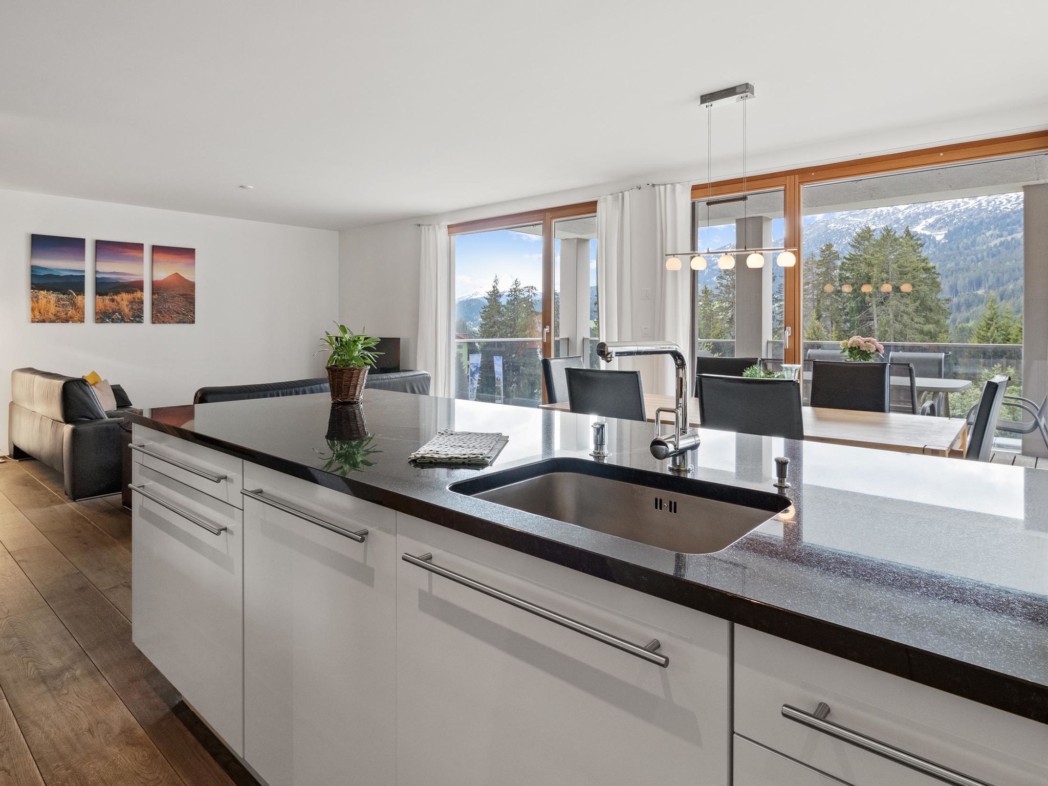 Neumöbilierte Wohnung mit schöner, offener Wohnküche, Steamer, Kühl- und Gefrierschrank, Nespresso-Kapselmaschine, Geschirrspüler, Herd und Umluftofen, Essecke, Wohnzimmer mit Sofa, Cheminée, TV, 3 Doppelschlafzimmer. Badezimmer mit Dusche/WC und Badewanne, Fön, Internetanschluss, möbilierte Terrasse mit Grill, Waschmaschine/Tumbler, Skiraum, Skischuhheizung, Tiefgaragenplatz. 150 m2. Aufzug