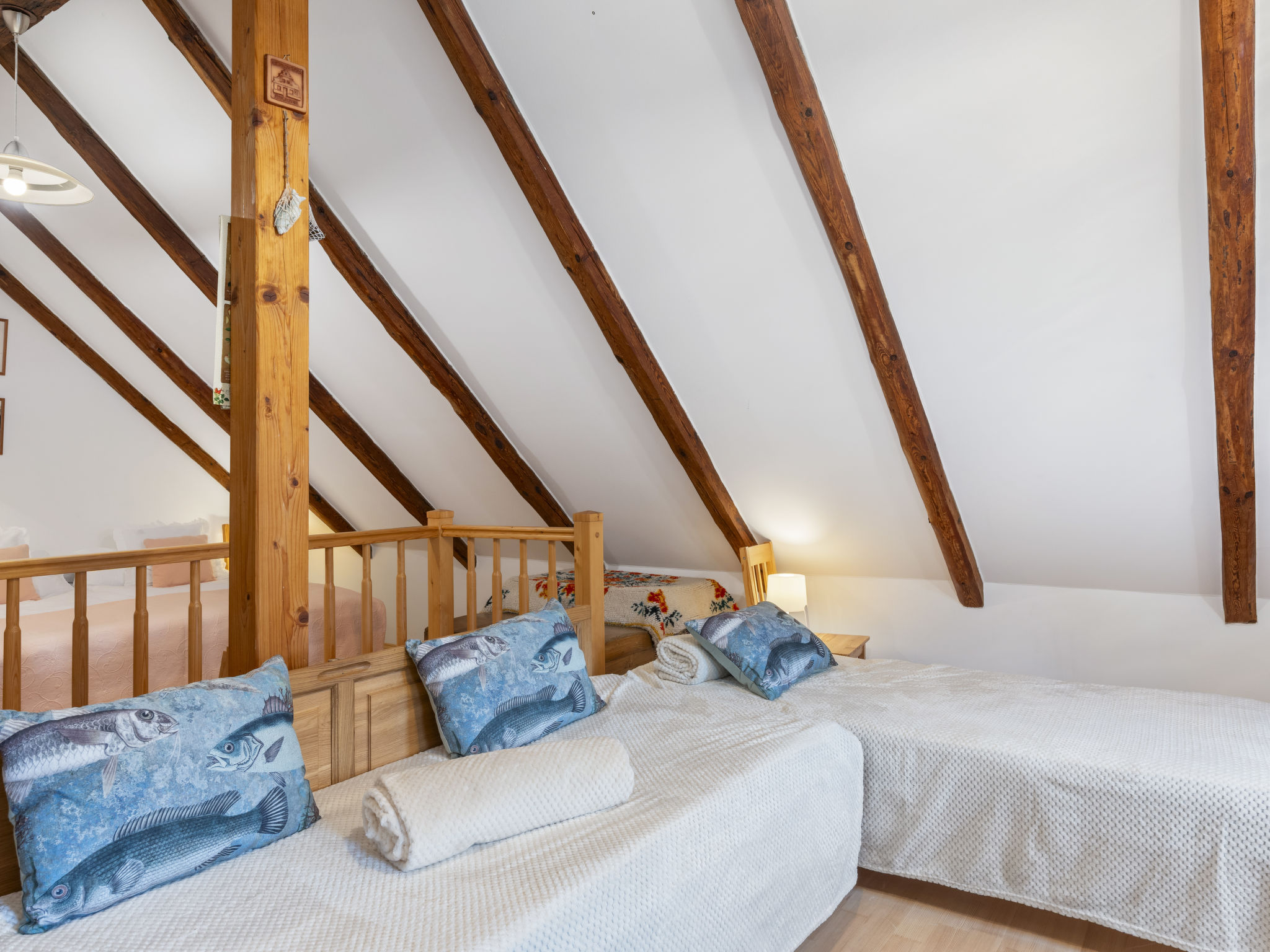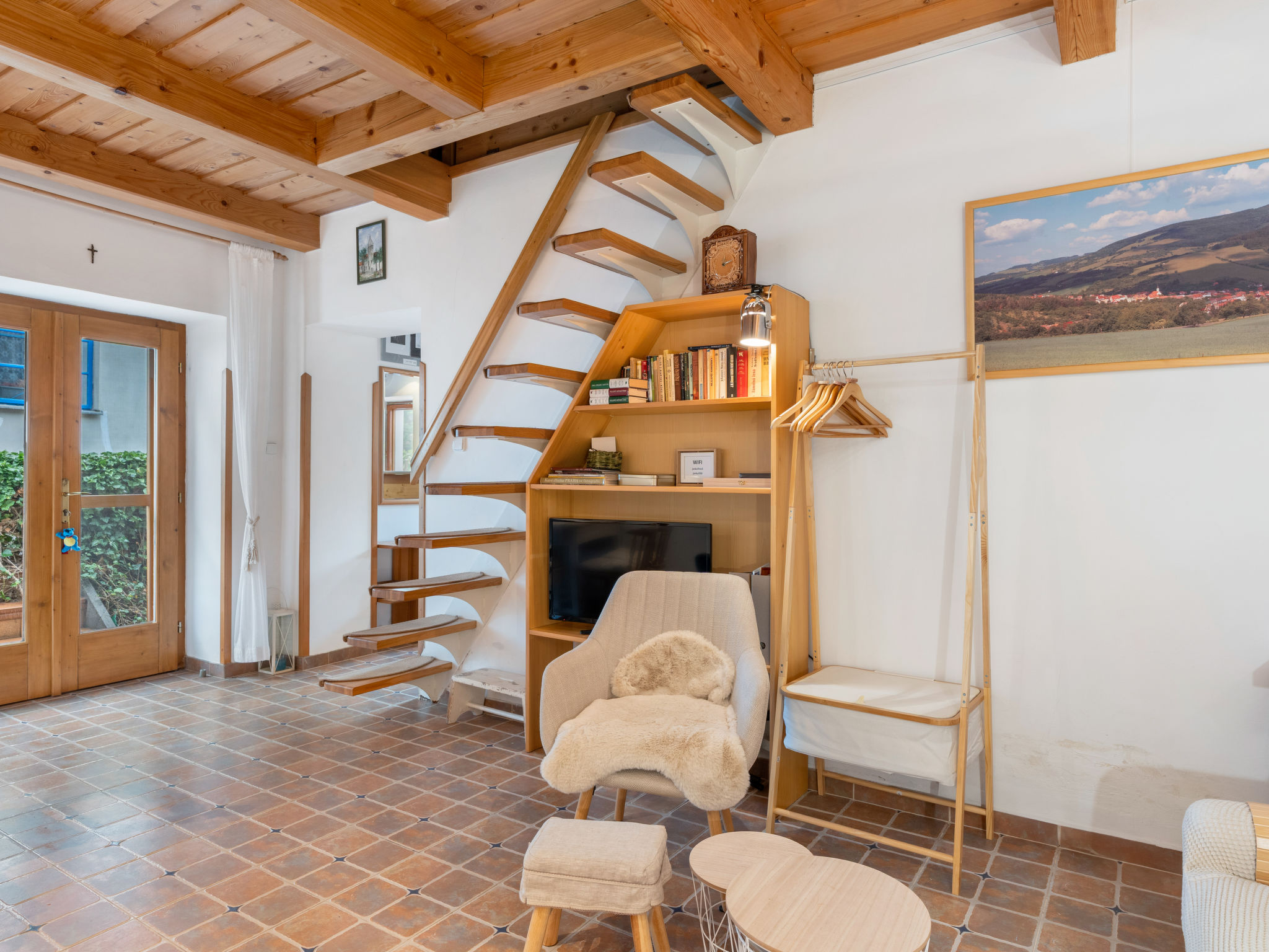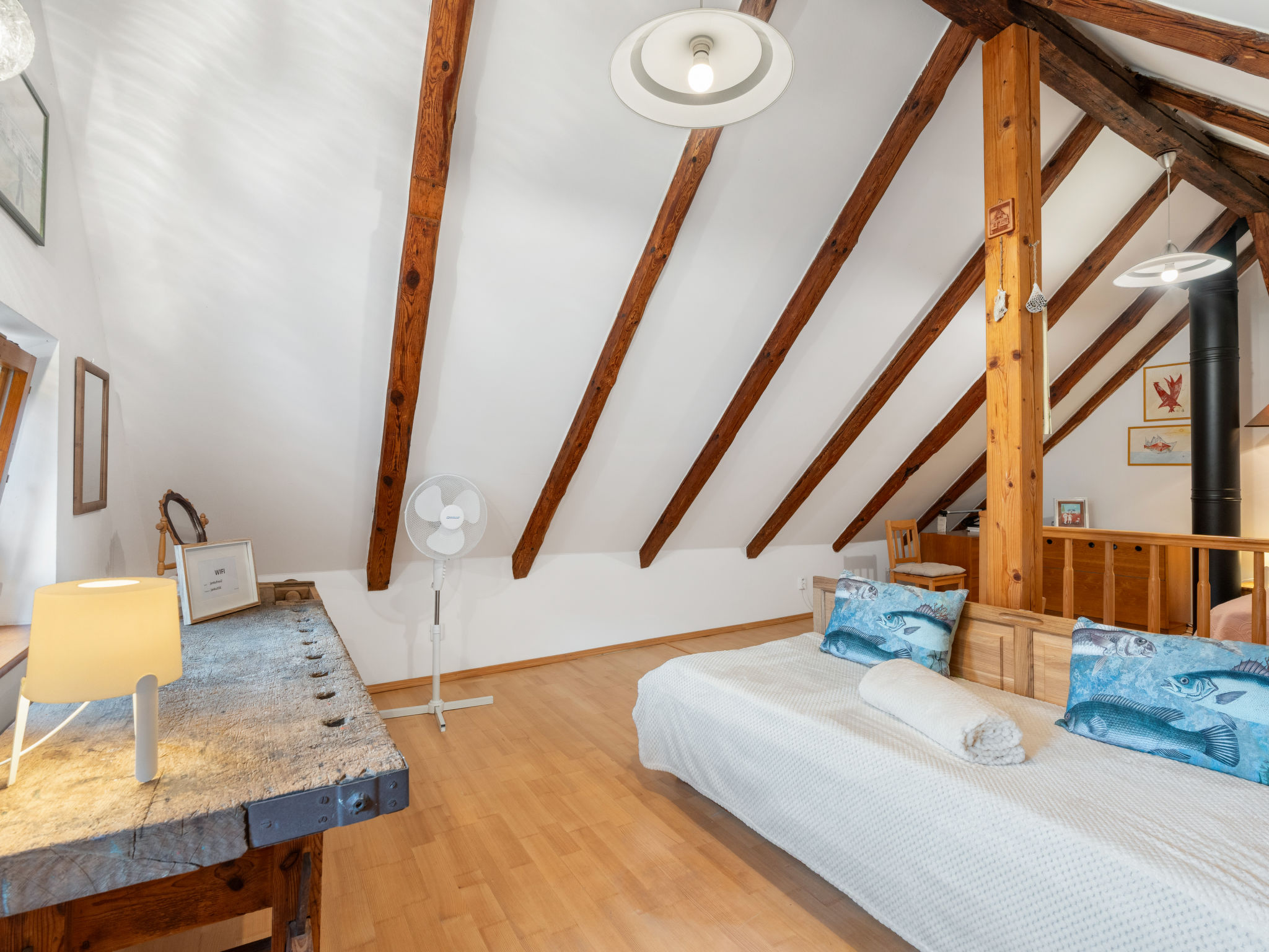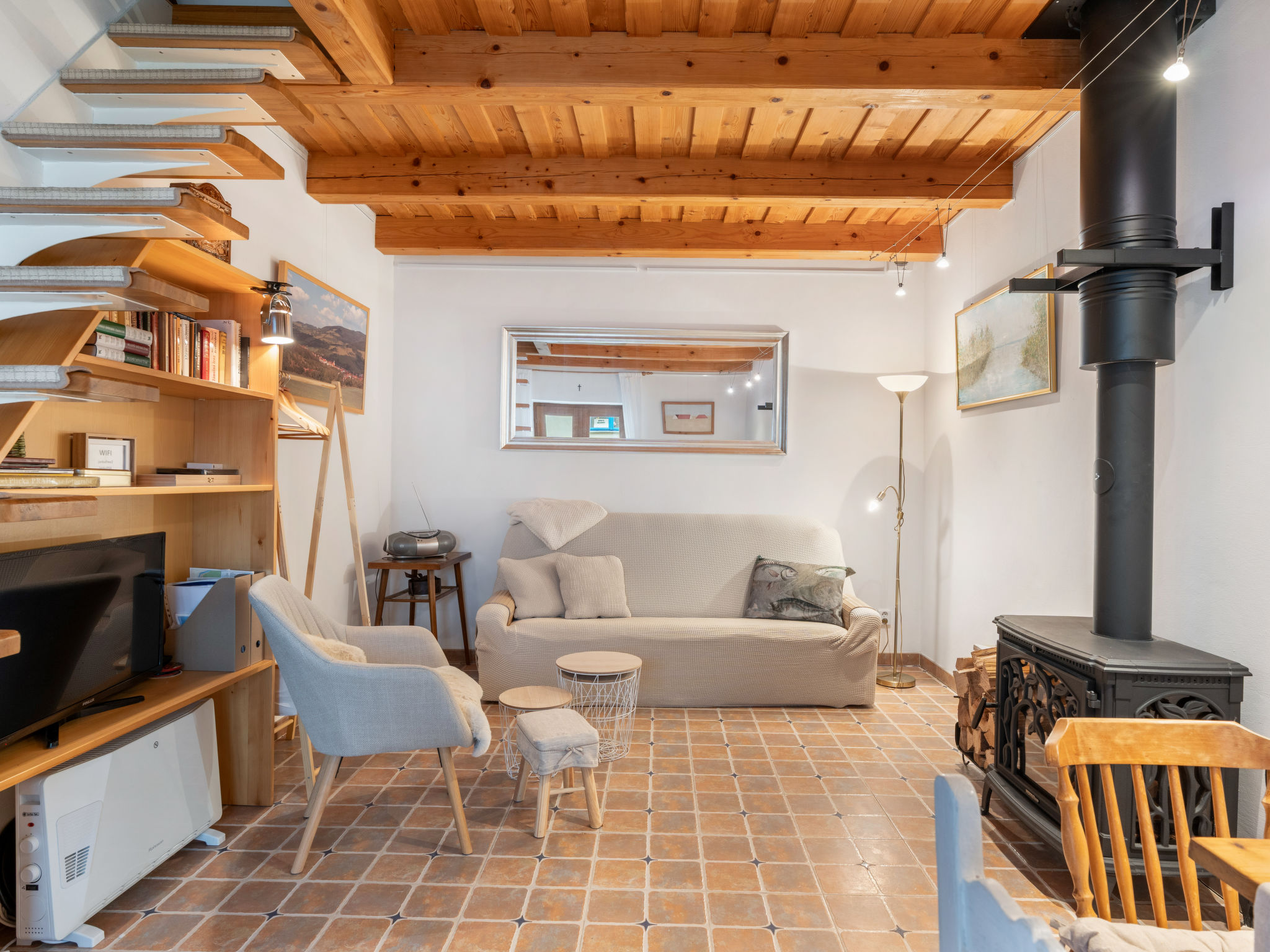 2-Zimmer-Haus 60 m2 auf 2 Stockwerken. Teilweise abgeschrägt, sehr schön und gemütlich eingerichtet: Wohn-/Esszimmer mit 1 Doppeldiwanbett, Sat-TV und Radio. Kleine Küche (2 Kochplatten, Backofen, Mikrowelle). Dusche/WC. Bodenheizung, Boiler (60 Liter). Obergeschoss: abgeschrägt 1 Zimmer mit 2 Betten und 1 franz. Bett. Terrasse. Zur Verfügung: Internet (Wireless LAN, gratis). Bitte beachten: Nichtraucher-Unterkunft.