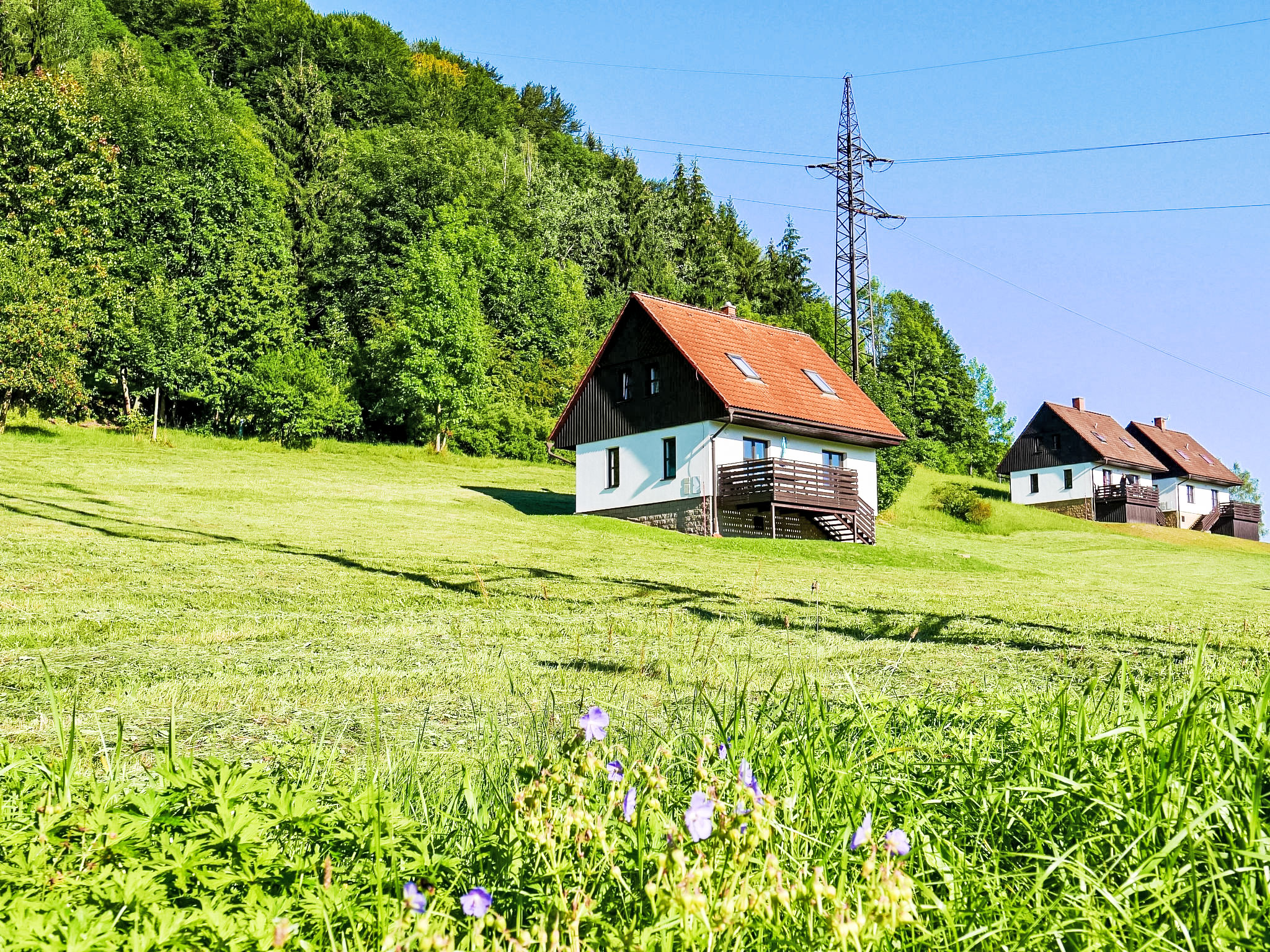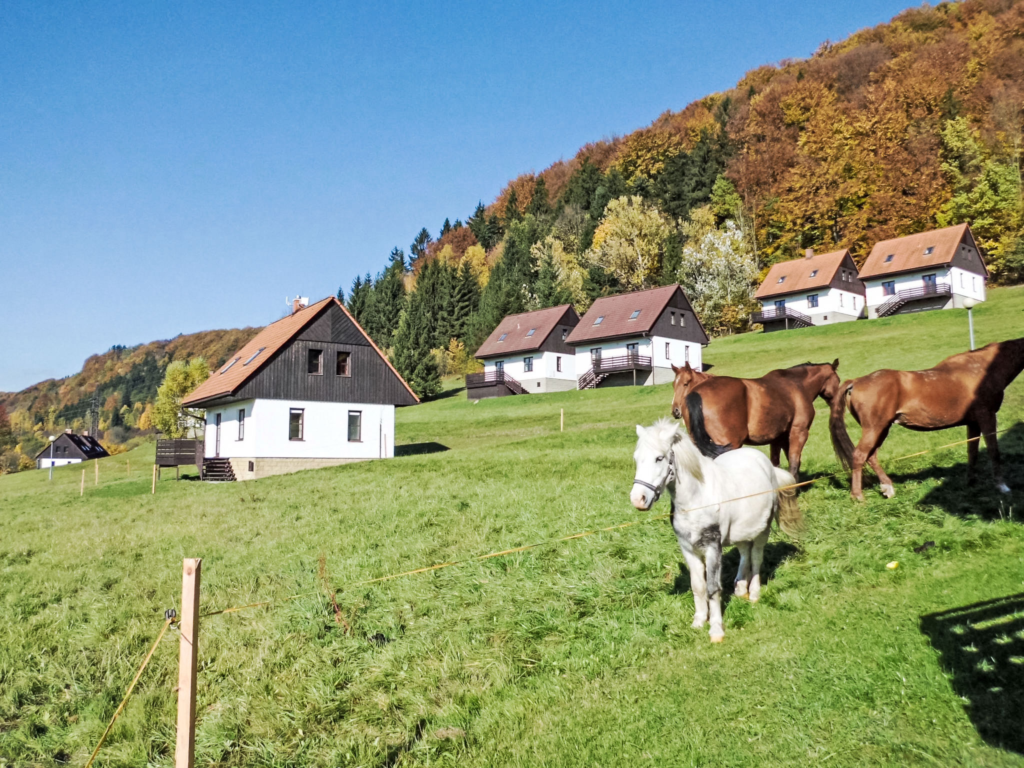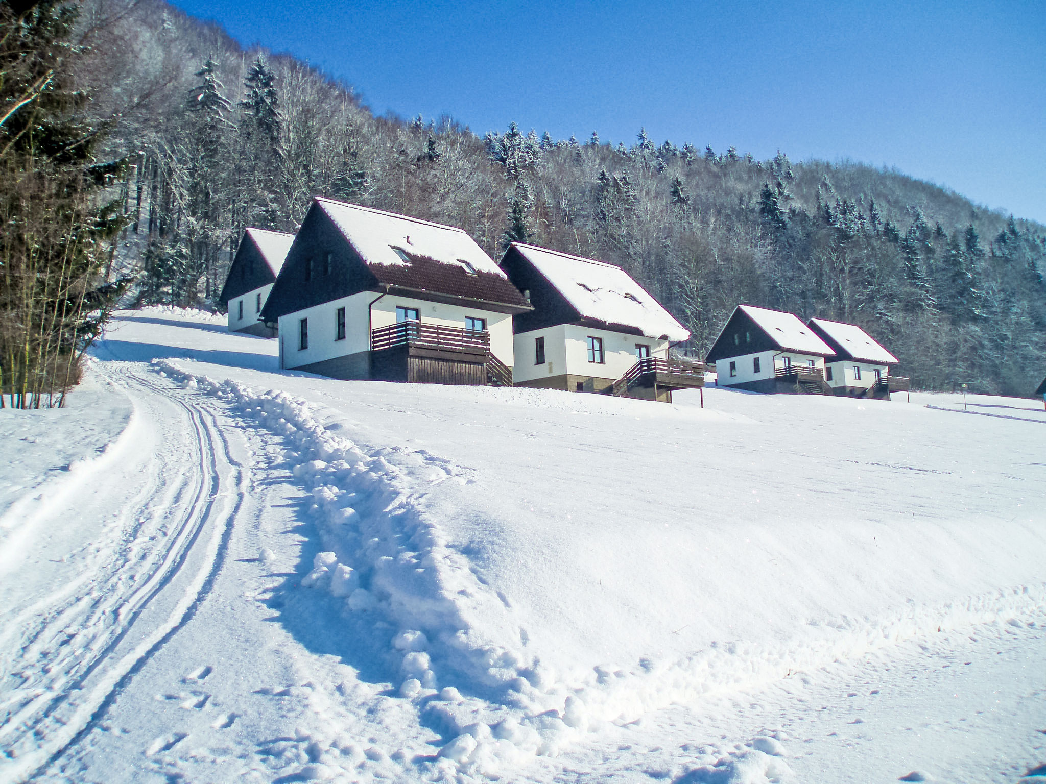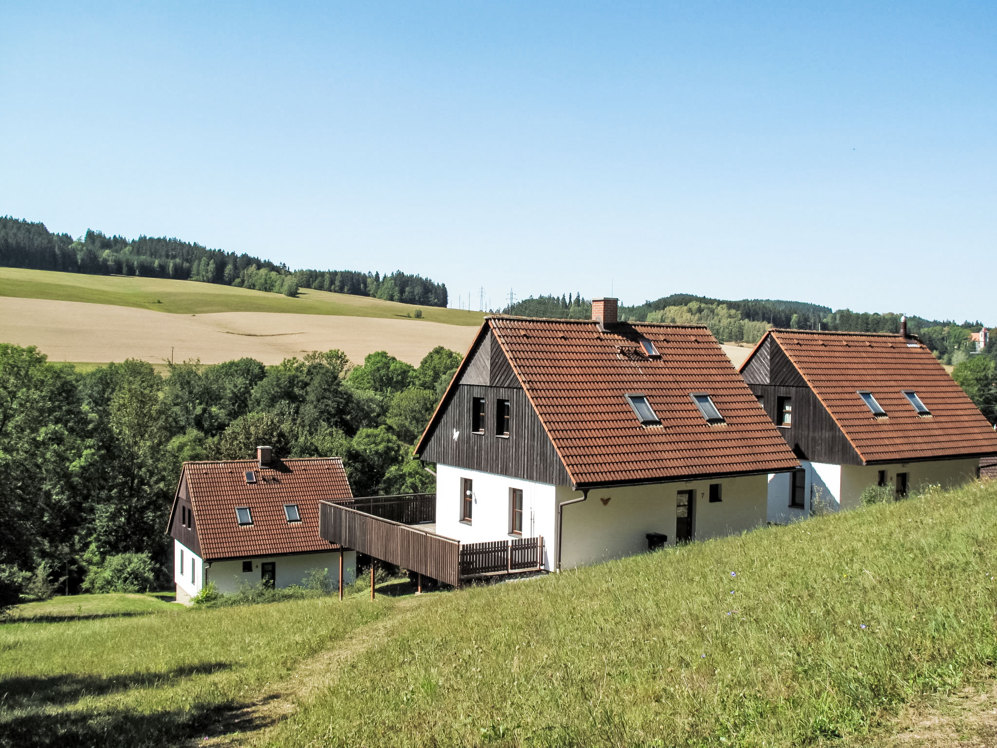 Stárkov 18 km von Náchod: Ferienanlage "Stárkov", 450 m.ü.M., Baujahr 1997, umgeben von Wiesen. 22 Häuser im Ferienresort. Am Ortsrand, sonnige, erhöhte Lage am Hang, direkt am Waldrand, 24 km vom See, 10 km vom Skigebiet, im Grünen. Zur Mitbenutzung: Grundstück 10 ha, Wiese, Teich, Schwimmbad (8 x 4 m, 150 cm tief, saisonale Verfügbarkeit: 15.Jun.-16.Sep.). Tischtennis, Volleyball, Badminton, Volleyballfeld, Beachvolleyball, Sitzplatz, Grill, Feuerstelle, Kinderspielplatz (Rutschbahn, Schaukel, Sandkasten). In der Anlage: Empfang, Aufenthaltsraum, Bistro, Massage (extra). Billard, Spielzimmer, Tischfussball, Trampolin, Kiosk, Einstellraum für Fahrräder, Wäscherei (extra), Fahrradverleih. Wäschewechsel (zusätzlich extra). Handtuchwechsel (zusätzlich extra). Wohnungsreinigung möglich (extra). Brötchenservice möglich auf Anfrage. Einkaufsservice vor Anreise möglich. Zufahrt bis 200 m zum Haus. Zentralparkplätze. Lebensmittelgeschäft 1 km, Supermarkt 8 km, Restaurant 1 km, Café 10 m, Bushaltestelle "Stárkov, mlékárna" 50 m, Bahnstation "Hronov" 8 km, Hallenbad 18 km. Golfplatz (9 Loch) 26 km, Segelschule 26 km, Tennis 500 m, Minigolf, Reitstall, Wanderwege ab Haus, Radweg 10 m, Skilift 6 km, Skischule 17 km, Langlaufloipe 100 m, Eisfeld 8 km, Kinderspielplatz 10 m. Nahe gelegene Sehenswürdigkeiten: Adršpašsko-teplické skály 15 km, Náchod 17 km, Broumovské stěny 17 km, Ratibořice a Babiččino údolí 22 km, Broumov 24 km, Relaxpark Pec pod Sněžkou 50 km. Bekannte Skigebiete sind gut erreichbar: Radvanice 10 km, Petříkovice 17 km, Mladé Buky 36 km. Bekannte Seen in der Umgebung sind gut erreichbar: vodní nádrž Rozkoš 26 km. Bitte beachten: geeignet für Familien, Babyausstattung auf Anfrage (inkl.). Be- und Entladen am Ferienhaus möglich. Das Foto ist nur ein Hausbeispiel. Alle Häuser/Wohnungen sind individuell eingerichtet.