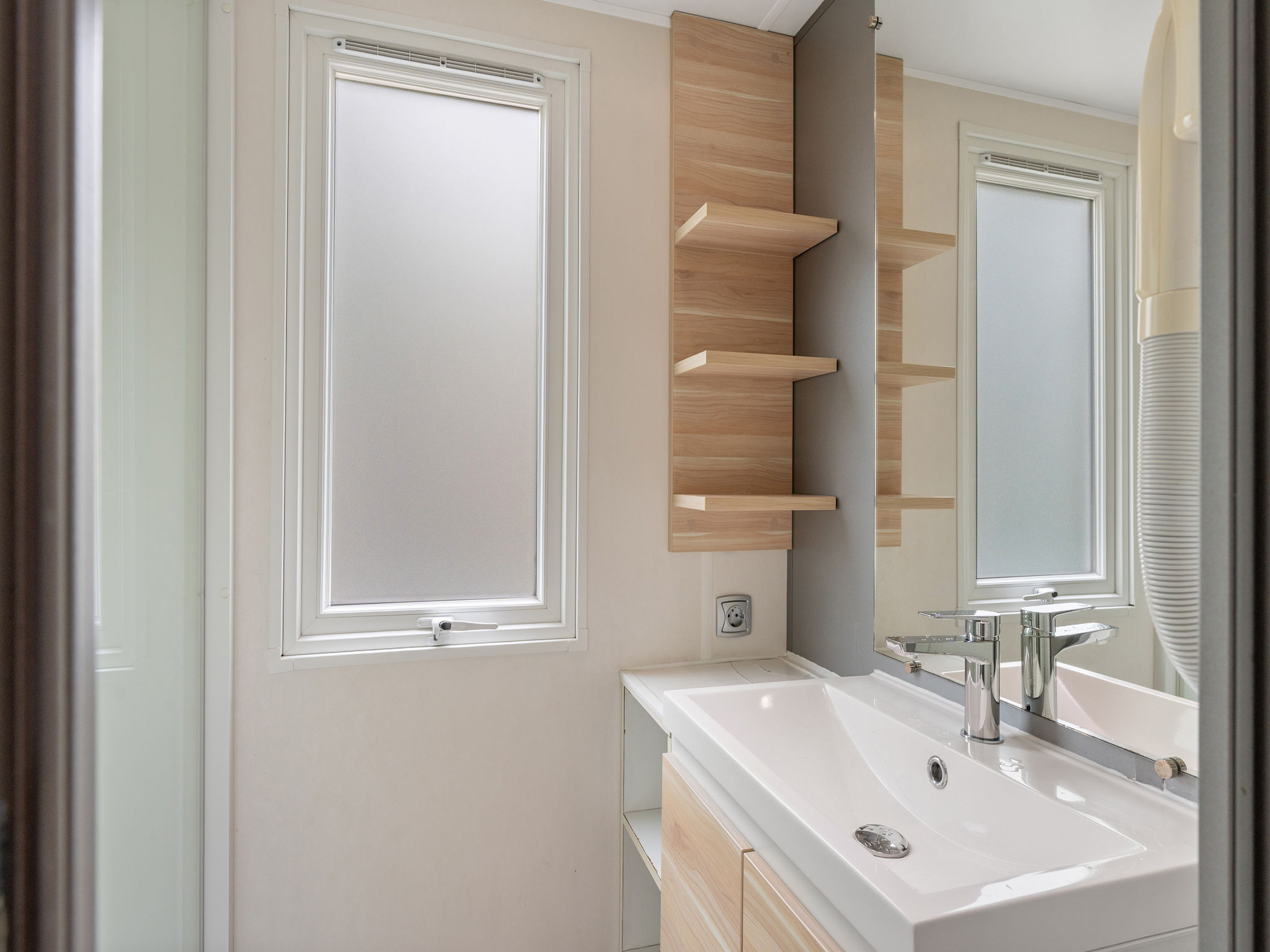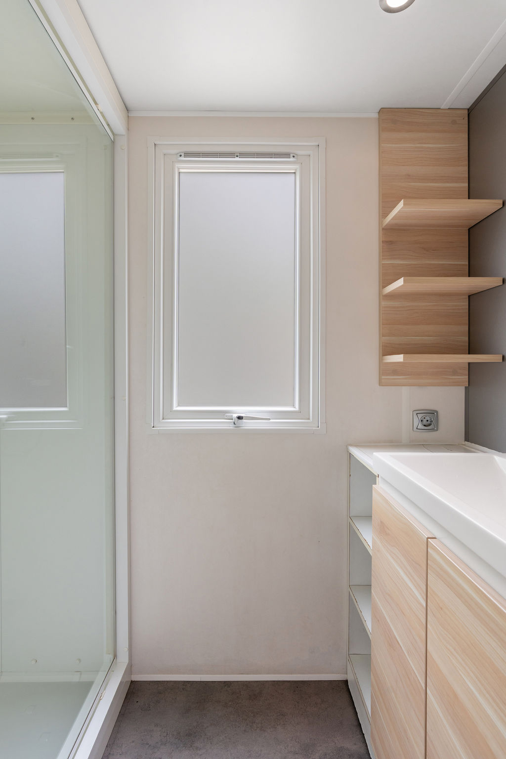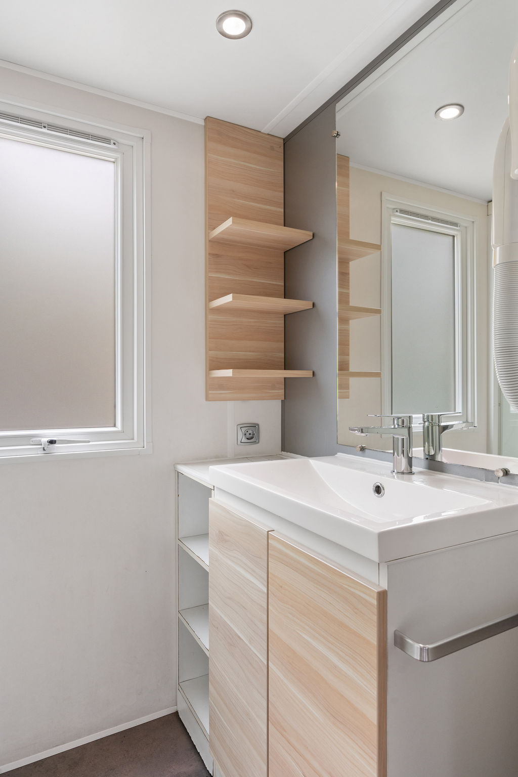 "Sunset Terrace", 3-Zimmer-Mobilheim 32 m2. Wohnzimmer mit Esstisch. 1 Zimmer mit 1 Doppelbett. 1 Zimmer mit 2 Betten. Küche (4 Flammen, Mikrowelle, Tiefkühler, elektrische Kaffeemaschine). Dusche, sep. WC. Terrasse. Terrassenmöbel. Zur Verfügung: Internet (Wireless LAN, gratis). Maximal 1 Haustier/Hund erlaubt.