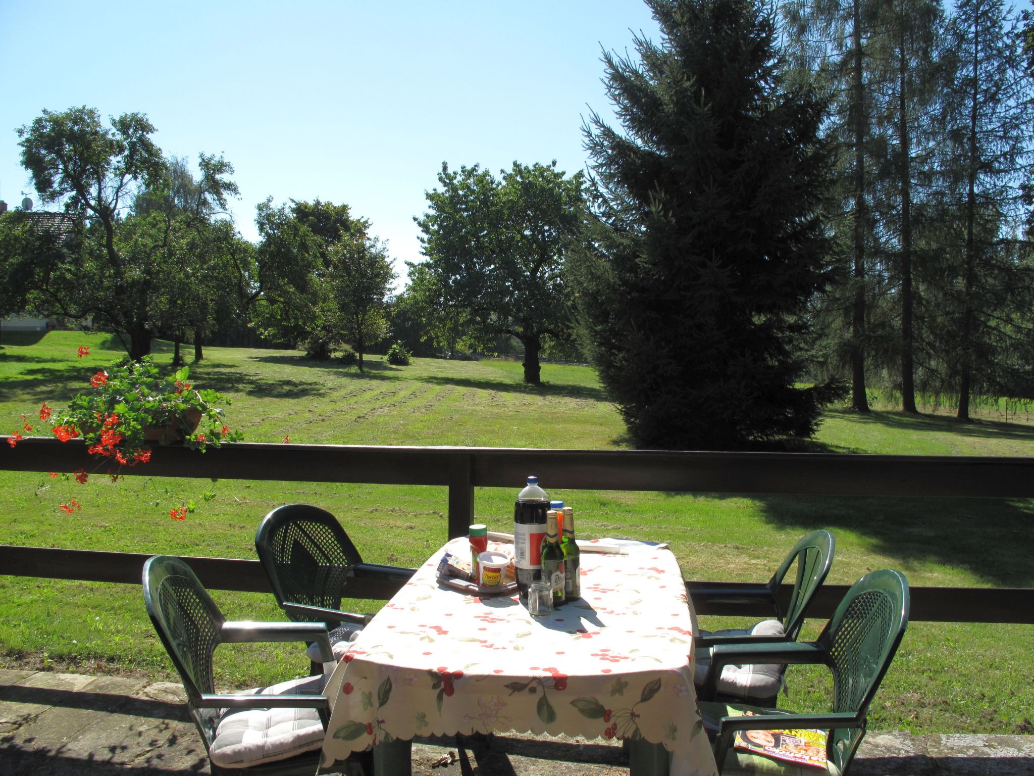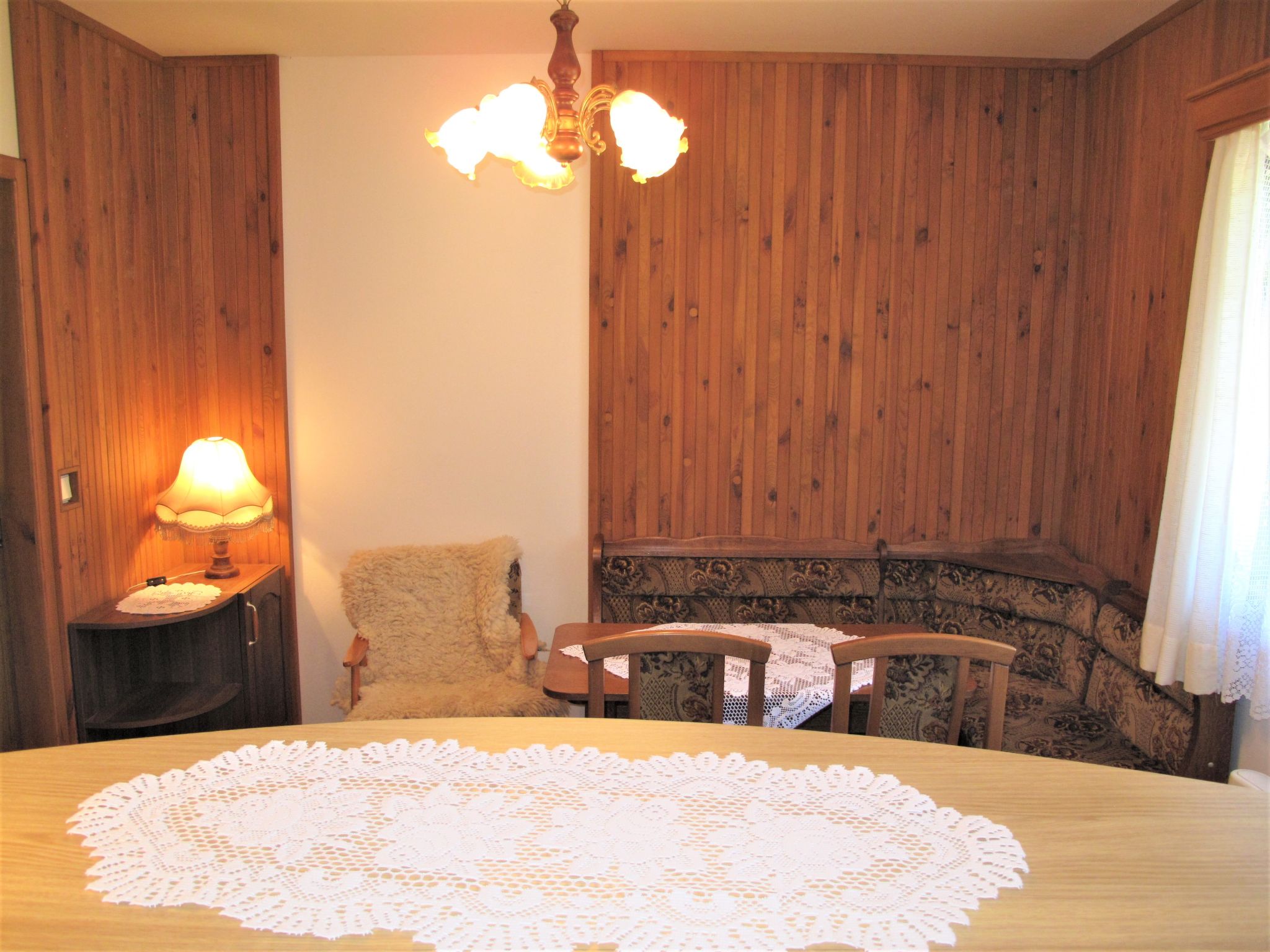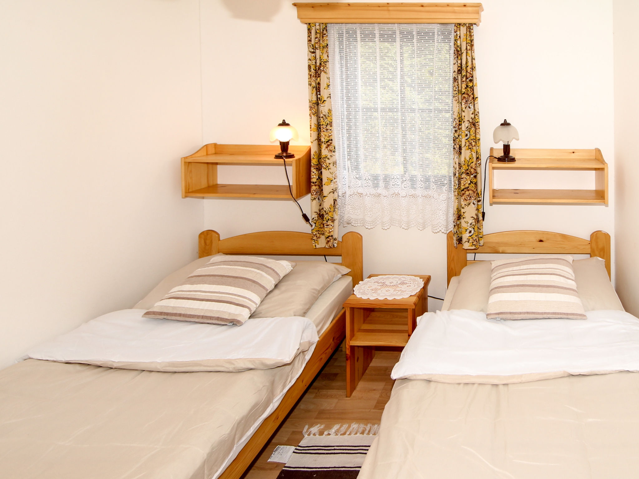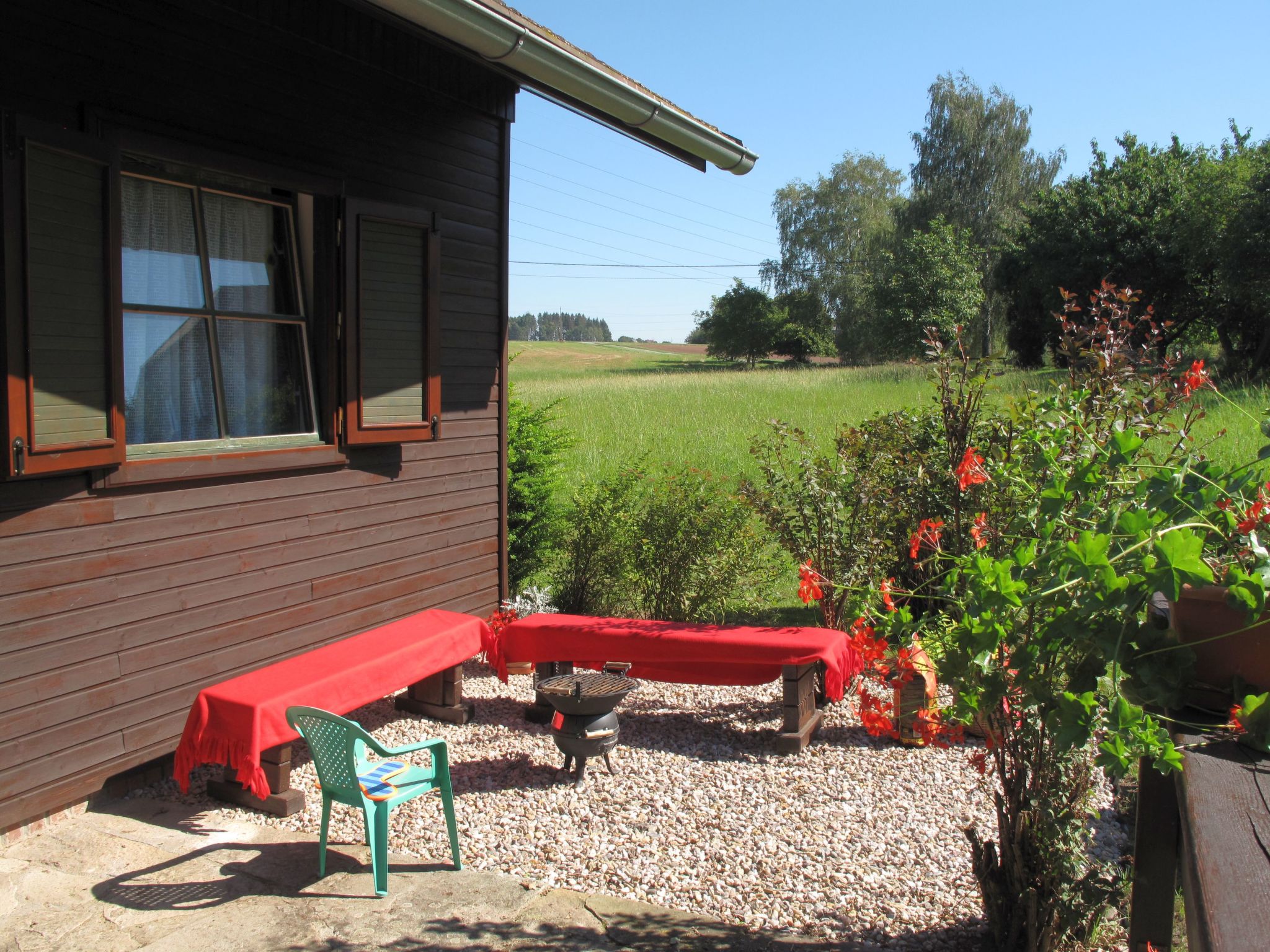 3-Zimmer-Haus 50 m2, im Erdgeschoss. Stilvoll eingerichtet: Wohn-/Esszimmer mit Esstisch, Sat-TV und DVD. 1 Zimmer mit 2 Betten. 1 Zimmer mit 2 Betten. Kochnische (4 Glaskeramikherd Platten, Toaster, Wasserkocher, Mikrowelle, elektrische Kaffeemaschine). Dusche, sep. WC. E-Heizung. Terrasse. Terrassenmöbel, Gartengrill (mobil). Sicht auf die Landschaft. Zur Verfügung: Kinderhochstuhl, Babybett. Bitte beachten: Nichtraucher-Haus.