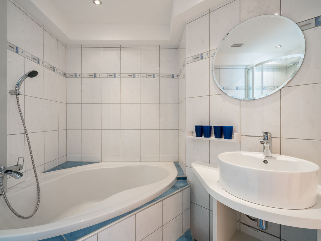 3-Zimmer-Wohnung, Erdgeschoss, ca. 87 m². Separater Zugang. Großer Wohn-/Schlafraum mit Doppelbettcouch, Essplatz, Küchenzeile (4 Platten, Backofen, Mikrowelle, Geschirrspüler, Kühlschrank, Gefrierschrank, Kaffeemaschine), große Fensterfront. 2 Doppelzimmer (Dachkuppelfenster). Bad (Eckbadewanne)/Dusche. Sep.WC.