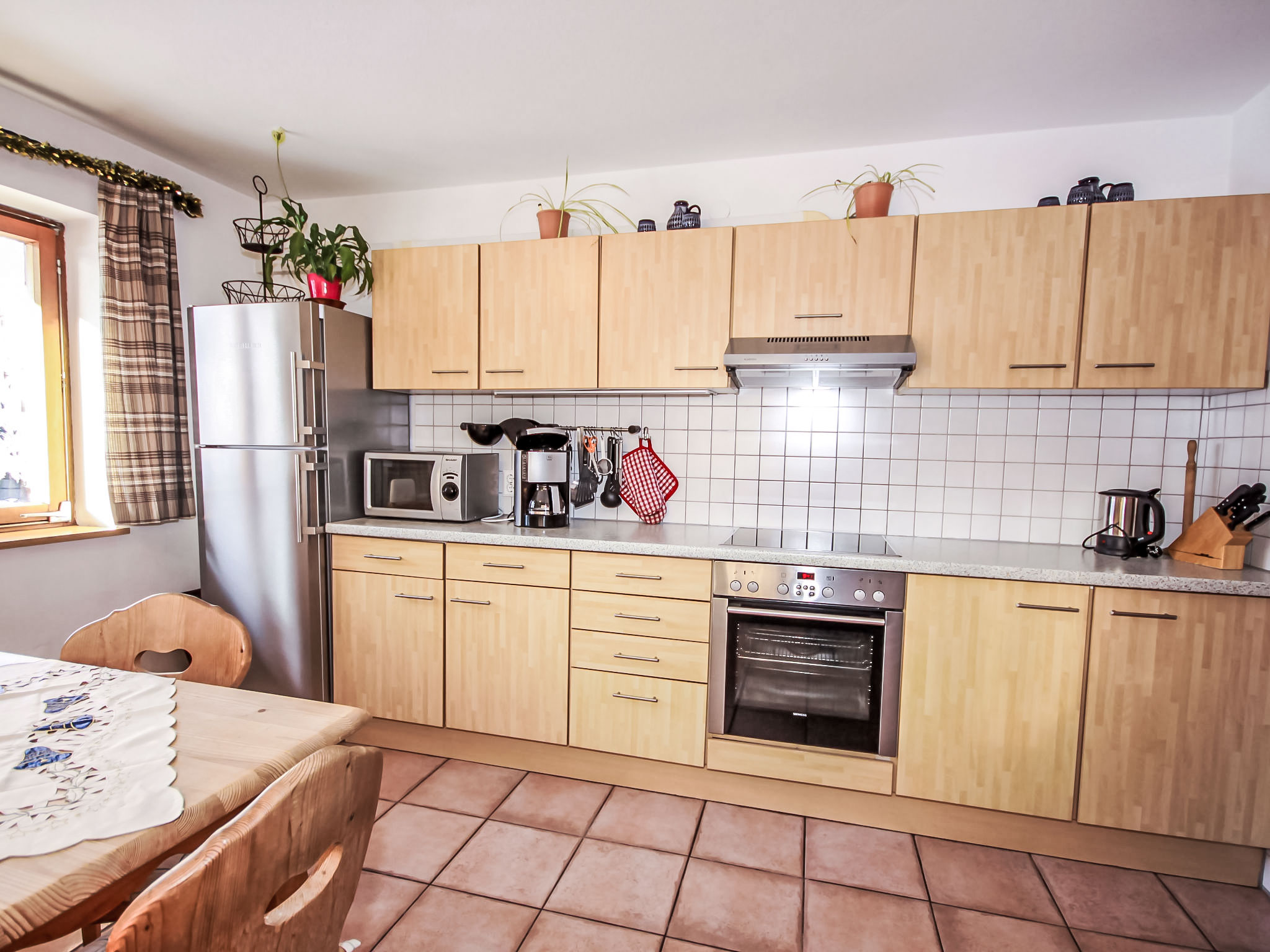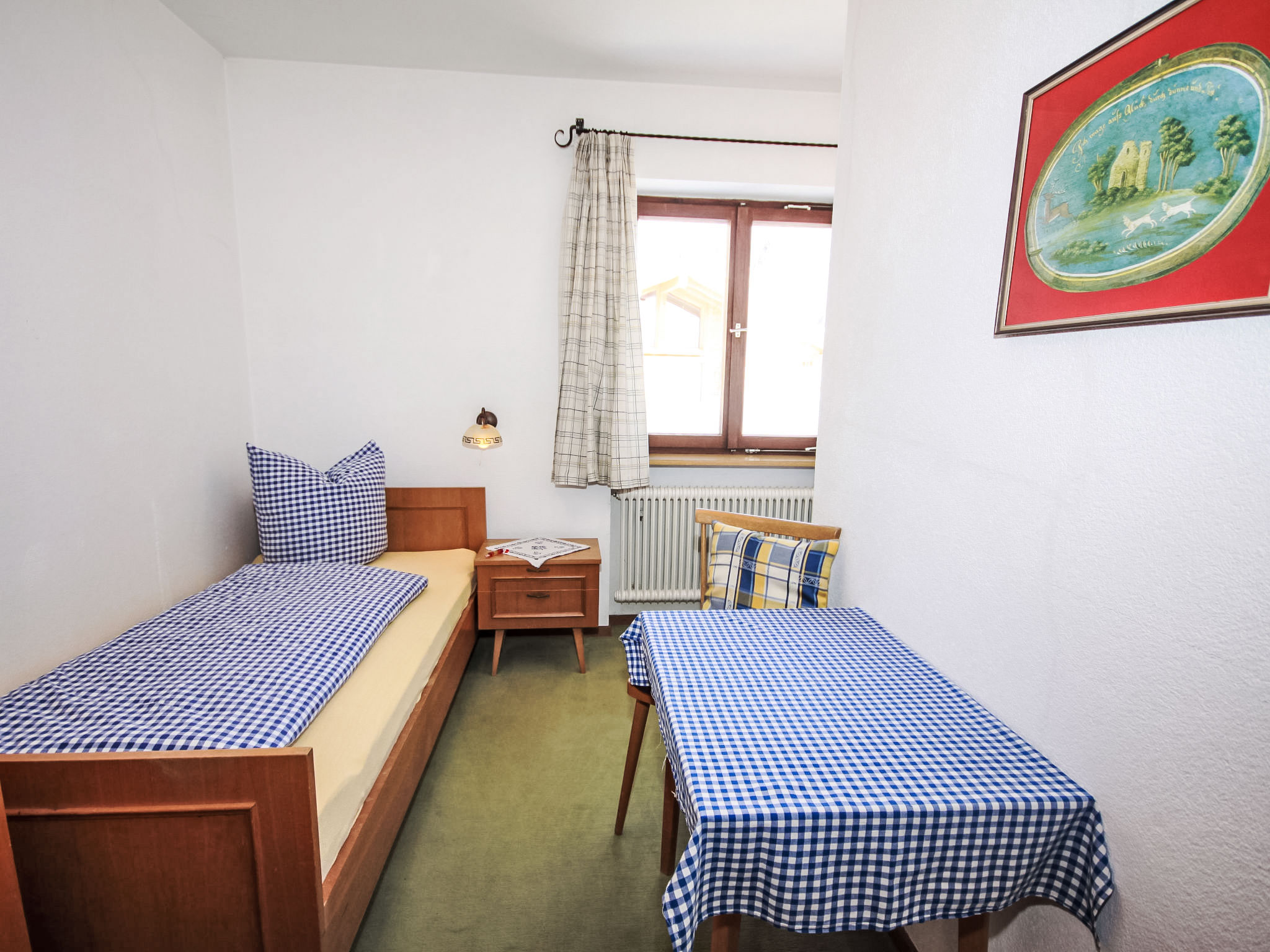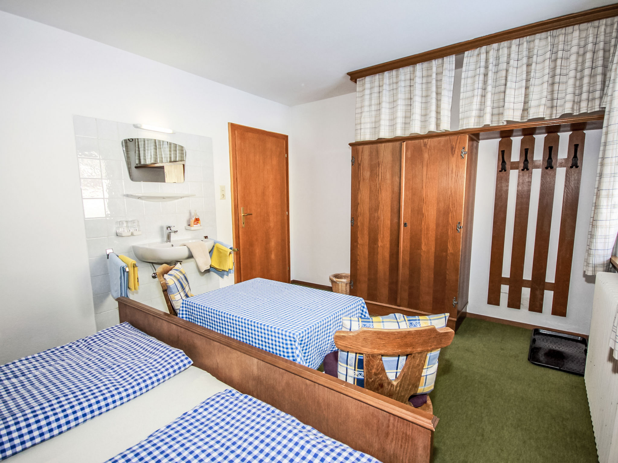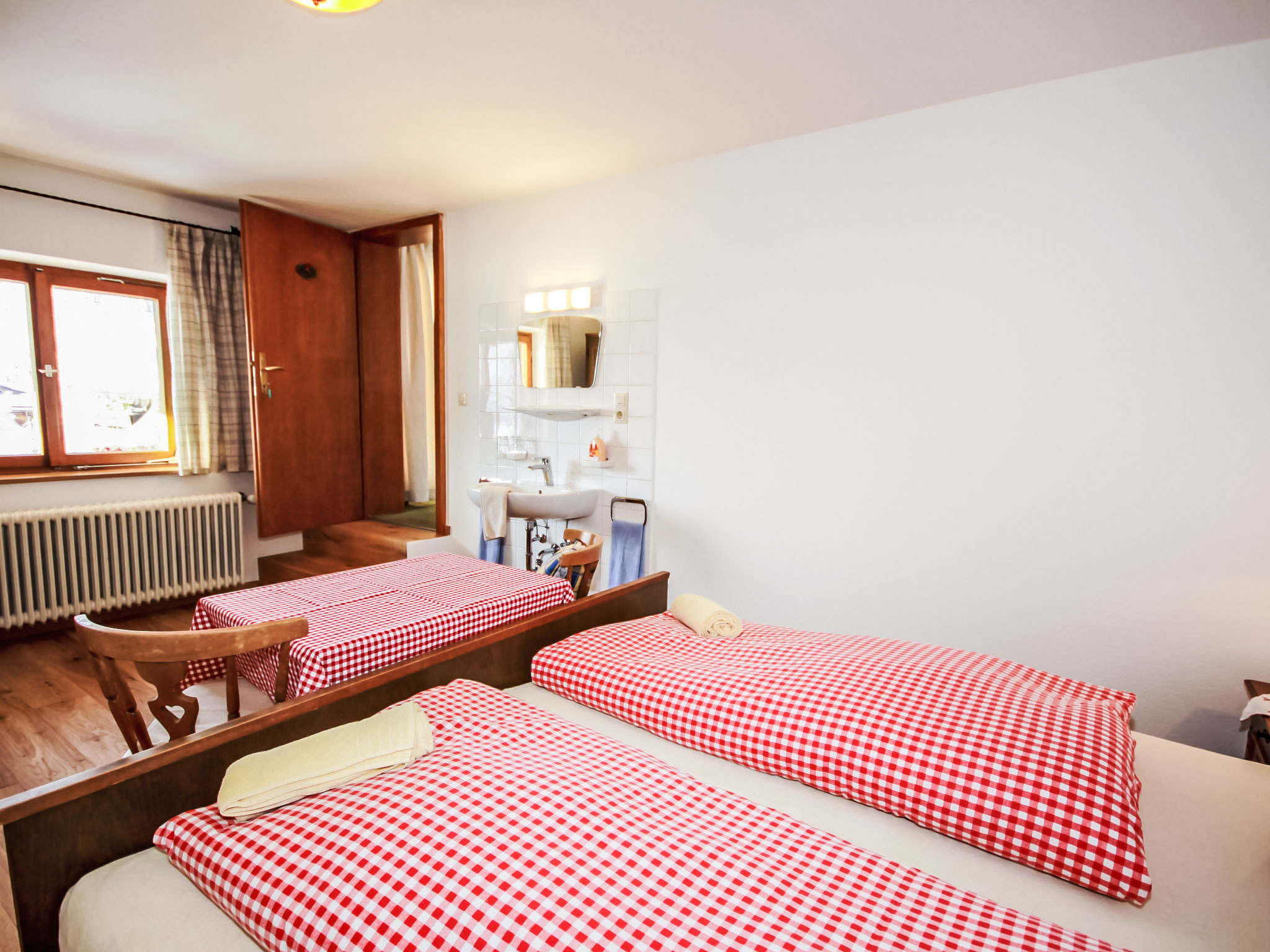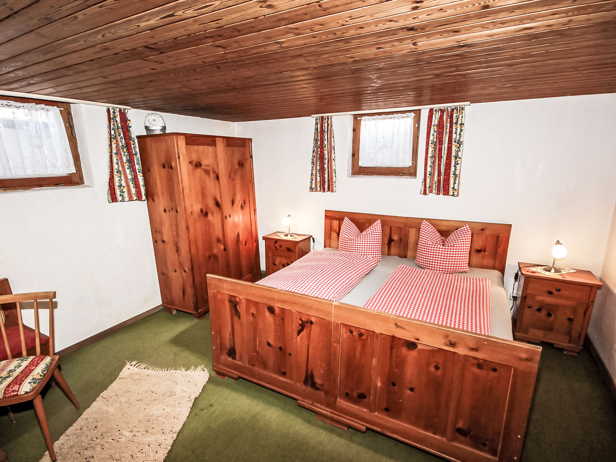 "Fliegerklause", 8-Zimmer-Haus 180 m2 auf 3 Stockwerken. Rustikal eingerichtet: Eingang. Wohnzimmer mit Sat-TV und Flachbildschirm. Küche (Backofen, Geschirrspüler, 5 Glaskeramikherd Platten, Wasserkocher, Mikrowelle, Tiefkühler, elektrische Kaffeemaschine) mit Essecke. Bad/Dusche, sep. WC. Unteres Geschoss: 1 Doppelzimmer mit 1 Doppelbett (2 x 90 cm, Länge 190 cm), Waschbecken. Obergeschoss: 2 Doppelzimmer, jedes Zimmer mit 1 Doppelbett (2 x 90 cm, Länge 190 cm), Waschbecken. Ausgang zum Balkon. 1 Doppelzimmer mit 1 Doppeldiwanbett (2 x 90 cm, Länge 200 cm), Waschbecken. 1 Doppelzimmer mit 1 Doppelbett (2 x 90 cm, Länge 190 cm), Waschbecken. 1 Zimmer mit 1 Bett (90 cm, Länge 190 cm), Waschbecken. Dusche/WC, sep. WC. Grosser Balkon. Abstellkammer. Schöne Sicht auf die Berge und die Landschaft. Zur Verfügung: Internet (Wireless LAN, gratis). Bitte beachten: geeignet für Familien. Nichtraucher-Haus. 1 kleines Haustier/Hund erlaubt. Pro Buchung ist ein 120 Liter Restmüllsack inkludiert. Weitere Müllsäcke können beim Schlüsselhalter um 7,50€ pro Sack erworben werden. Eine detaillierte Hausordnung wird allen Gästen bei Anreise übergeben und ist verpflichtender Teil der Buchung. Ein Hund bis 15 Kg wird kostenpflichtig (75 € pro Aufenthalt) akzeptiert.
