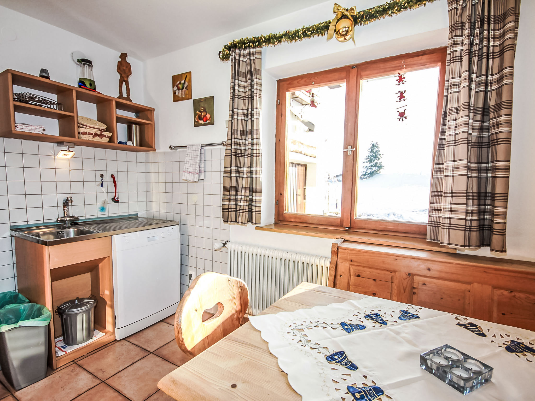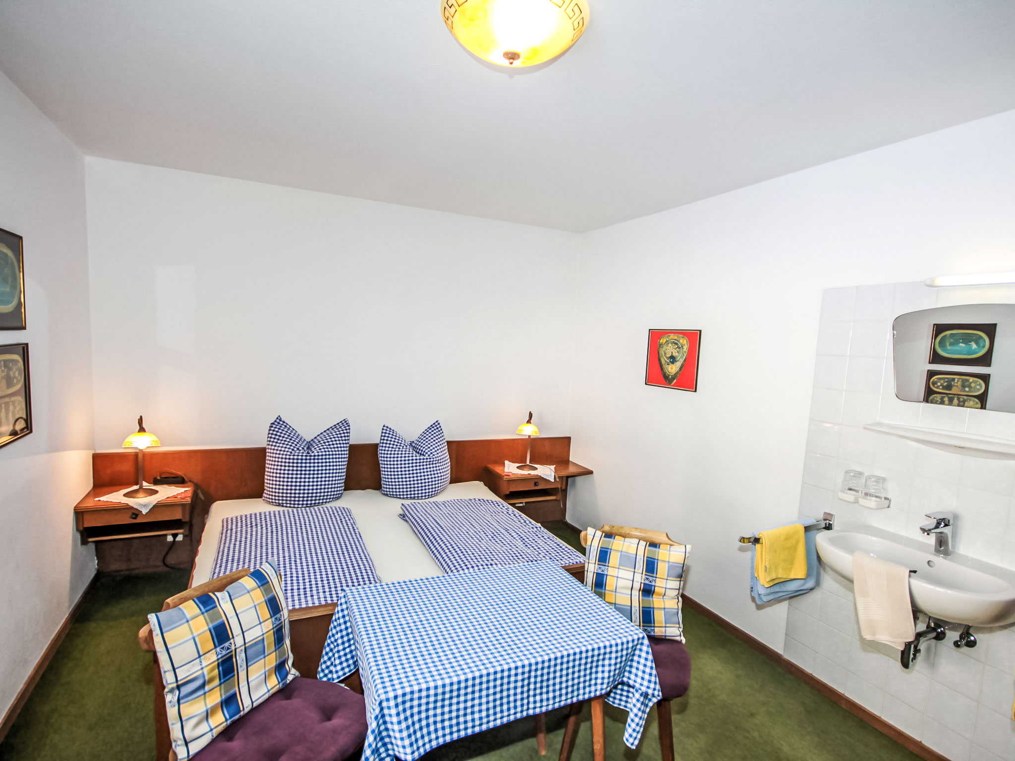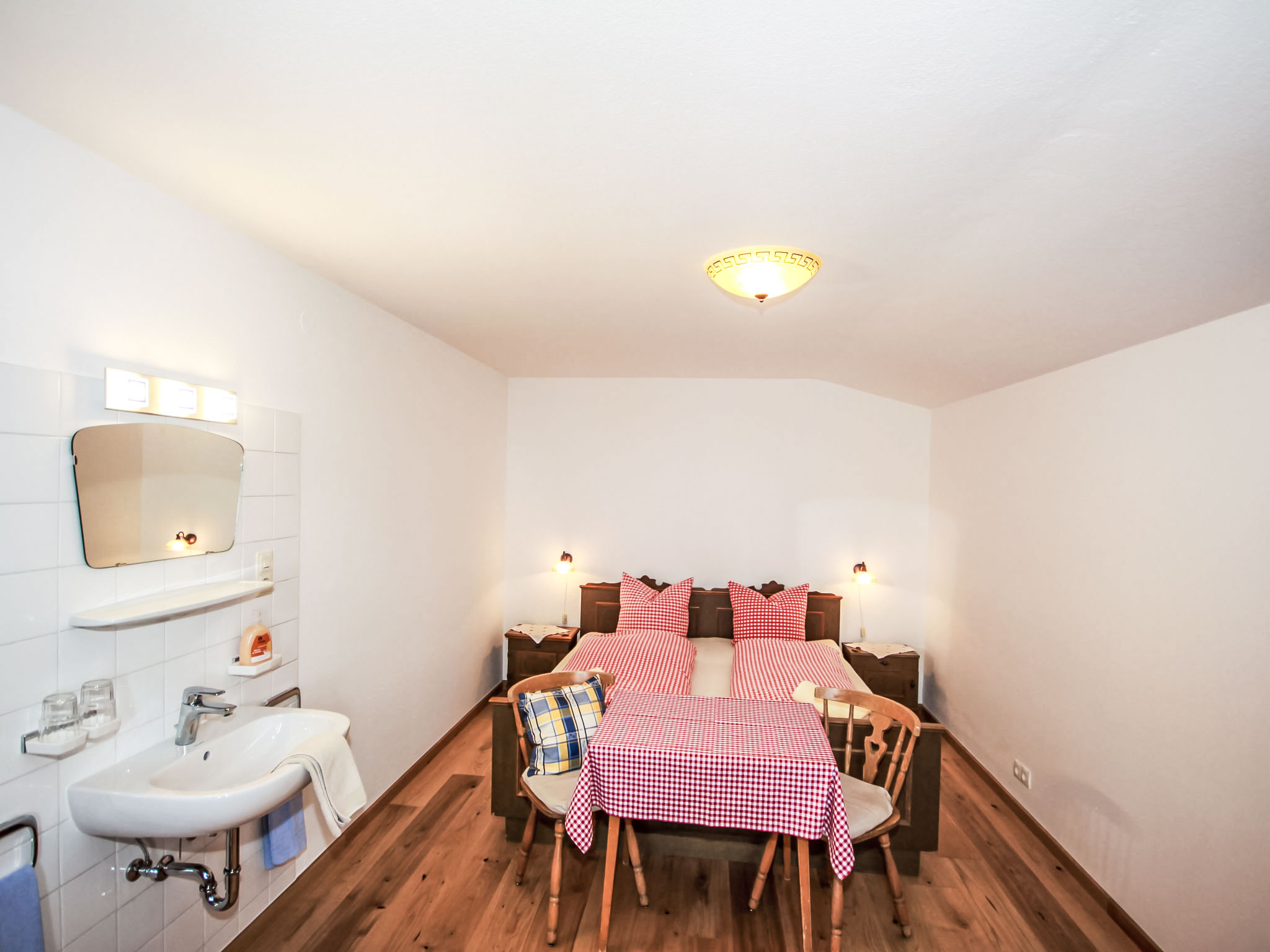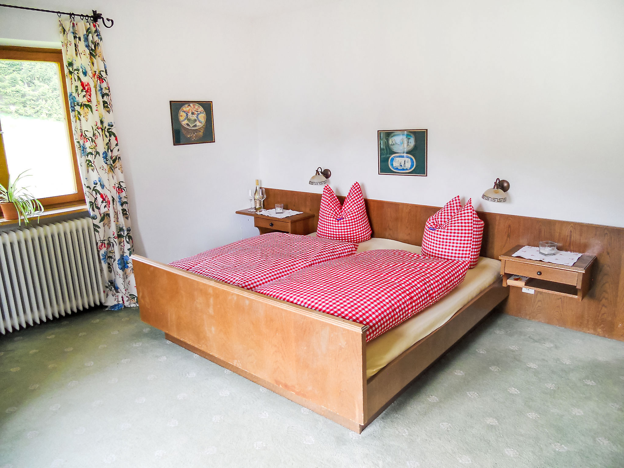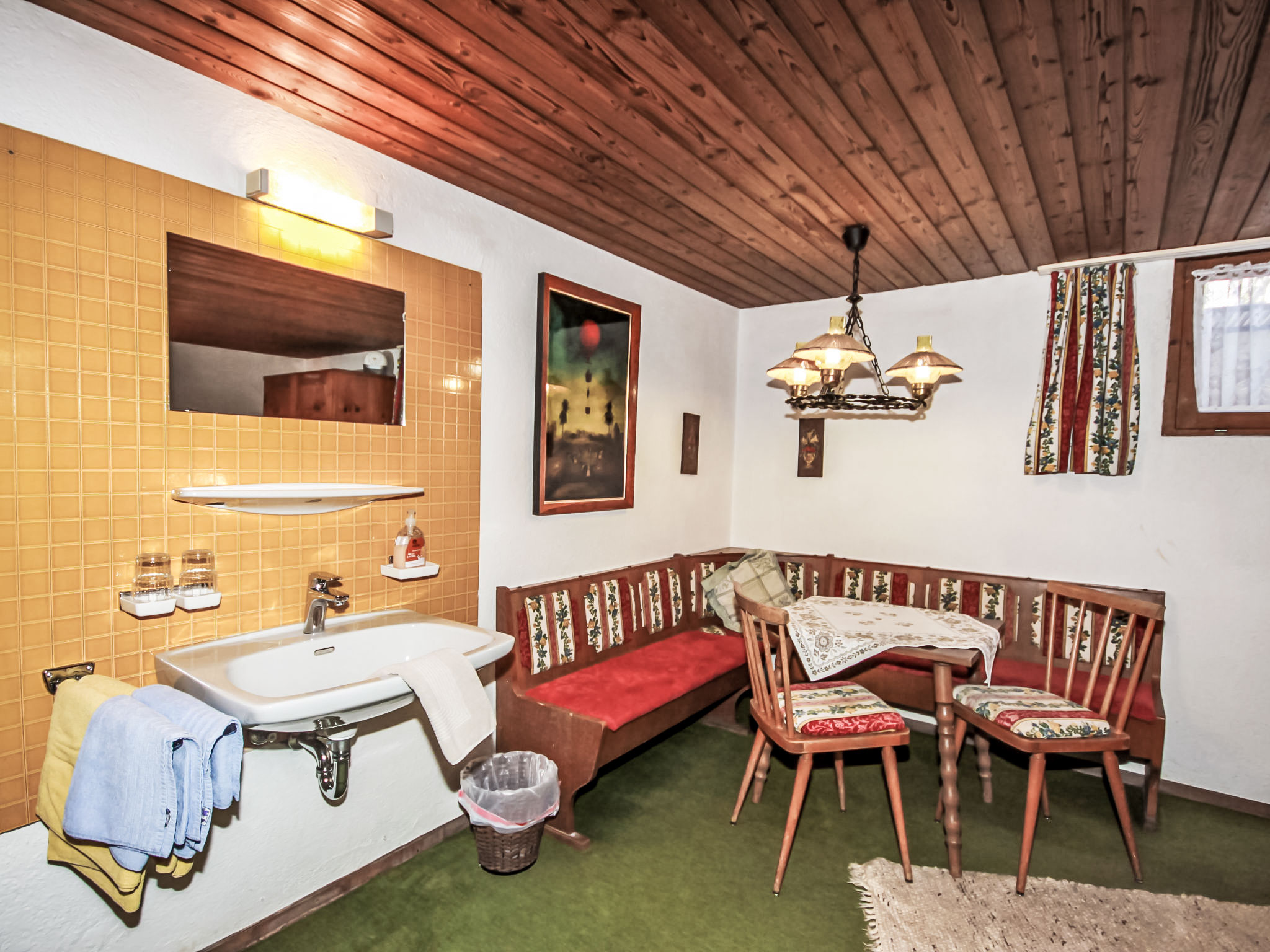 "Fliegerklause", 8-Zimmer-Haus 180 m2 auf 3 Stockwerken. Rustikal eingerichtet: Eingang. Wohnzimmer mit Sat-TV und Flachbildschirm. Küche (Backofen, Geschirrspüler, 5 Glaskeramikherd Platten, Wasserkocher, Mikrowelle, Tiefkühler, elektrische Kaffeemaschine) mit Essecke. Bad/Dusche, sep. WC. Unteres Geschoss: 1 Doppelzimmer mit 1 Doppelbett (2 x 90 cm, Länge 190 cm), Waschbecken. Obergeschoss: 2 Doppelzimmer, jedes Zimmer mit 1 Doppelbett (2 x 90 cm, Länge 190 cm), Waschbecken. Ausgang zum Balkon. 1 Doppelzimmer mit 1 Doppeldiwanbett (2 x 90 cm, Länge 200 cm), Waschbecken. 1 Doppelzimmer mit 1 Doppelbett (2 x 90 cm, Länge 190 cm), Waschbecken. 1 Zimmer mit 1 Bett (90 cm, Länge 190 cm), Waschbecken. Dusche/WC, sep. WC. Grosser Balkon. Abstellkammer. Schöne Sicht auf die Berge und die Landschaft. Zur Verfügung: Internet (Wireless LAN, gratis). Bitte beachten: geeignet für Familien. Nichtraucher-Haus. 1 kleines Haustier/Hund erlaubt. Pro Buchung ist ein 120 Liter Restmüllsack inkludiert. Weitere Müllsäcke können beim Schlüsselhalter um 7,50€ pro Sack erworben werden. Eine detaillierte Hausordnung wird allen Gästen bei Anreise übergeben und ist verpflichtender Teil der Buchung. Ein Hund bis 15 Kg wird kostenpflichtig (75 € pro Aufenthalt) akzeptiert.