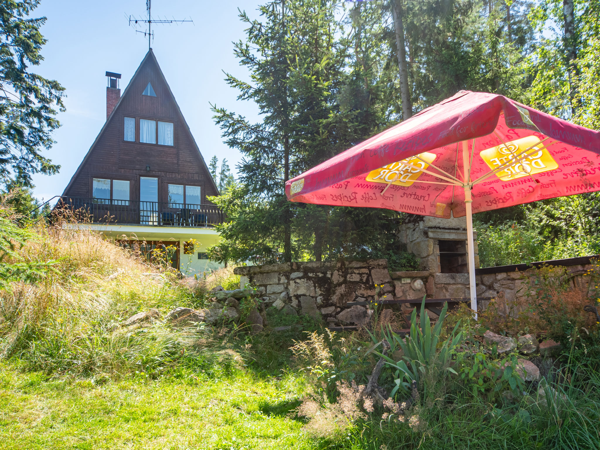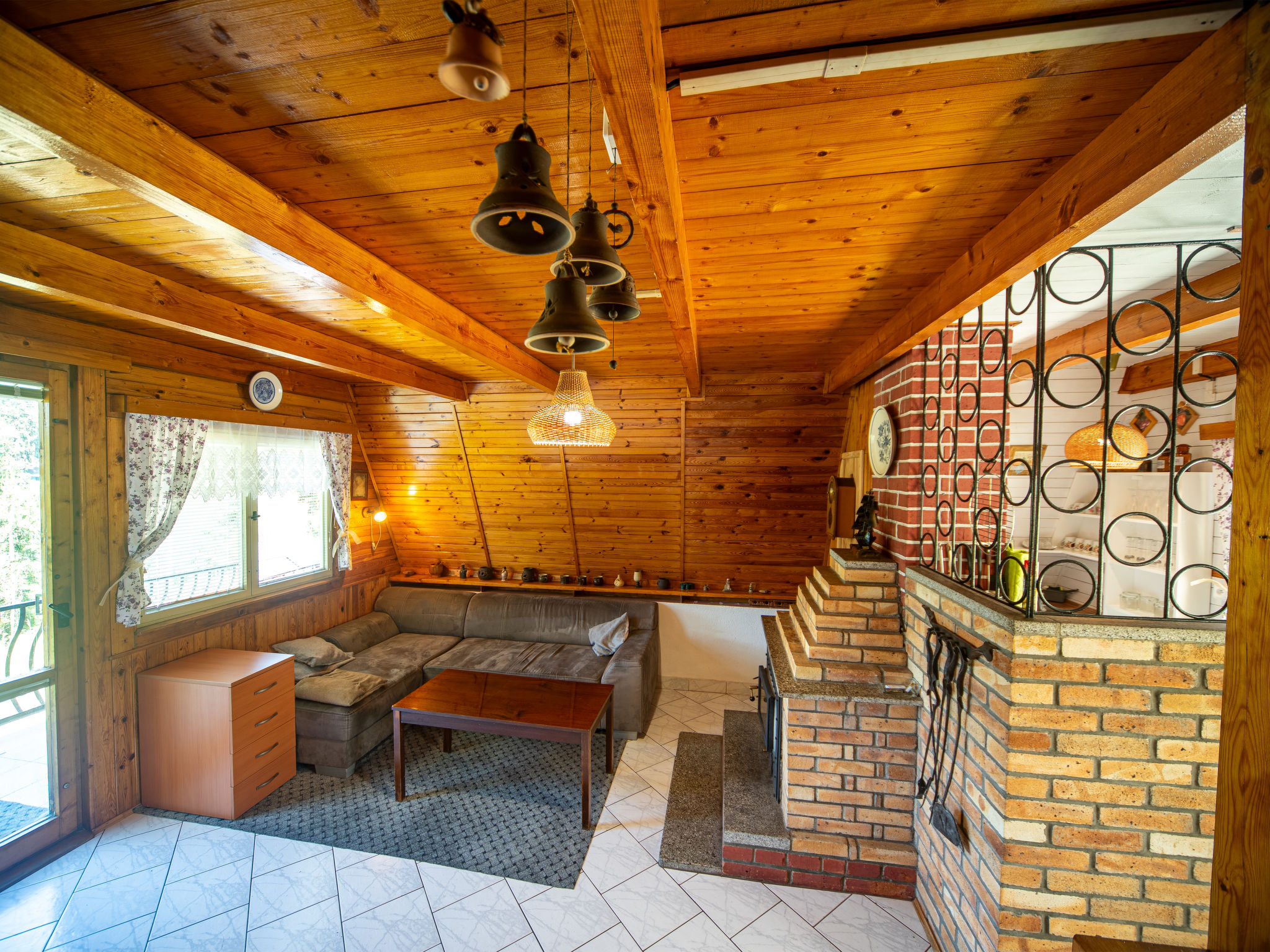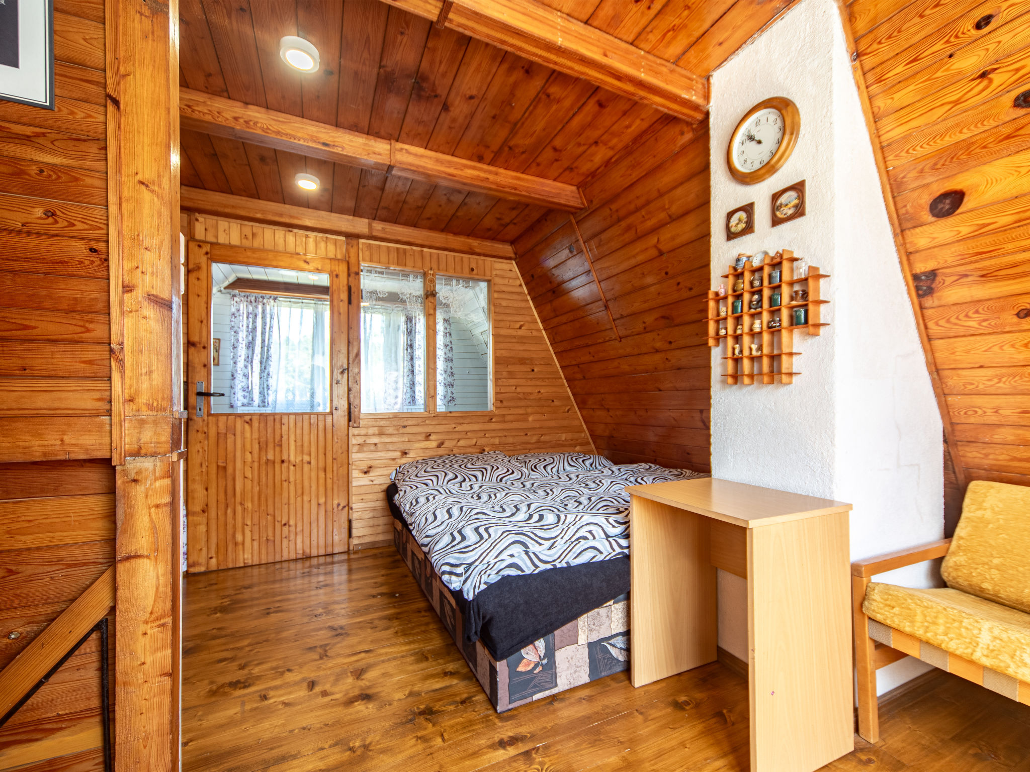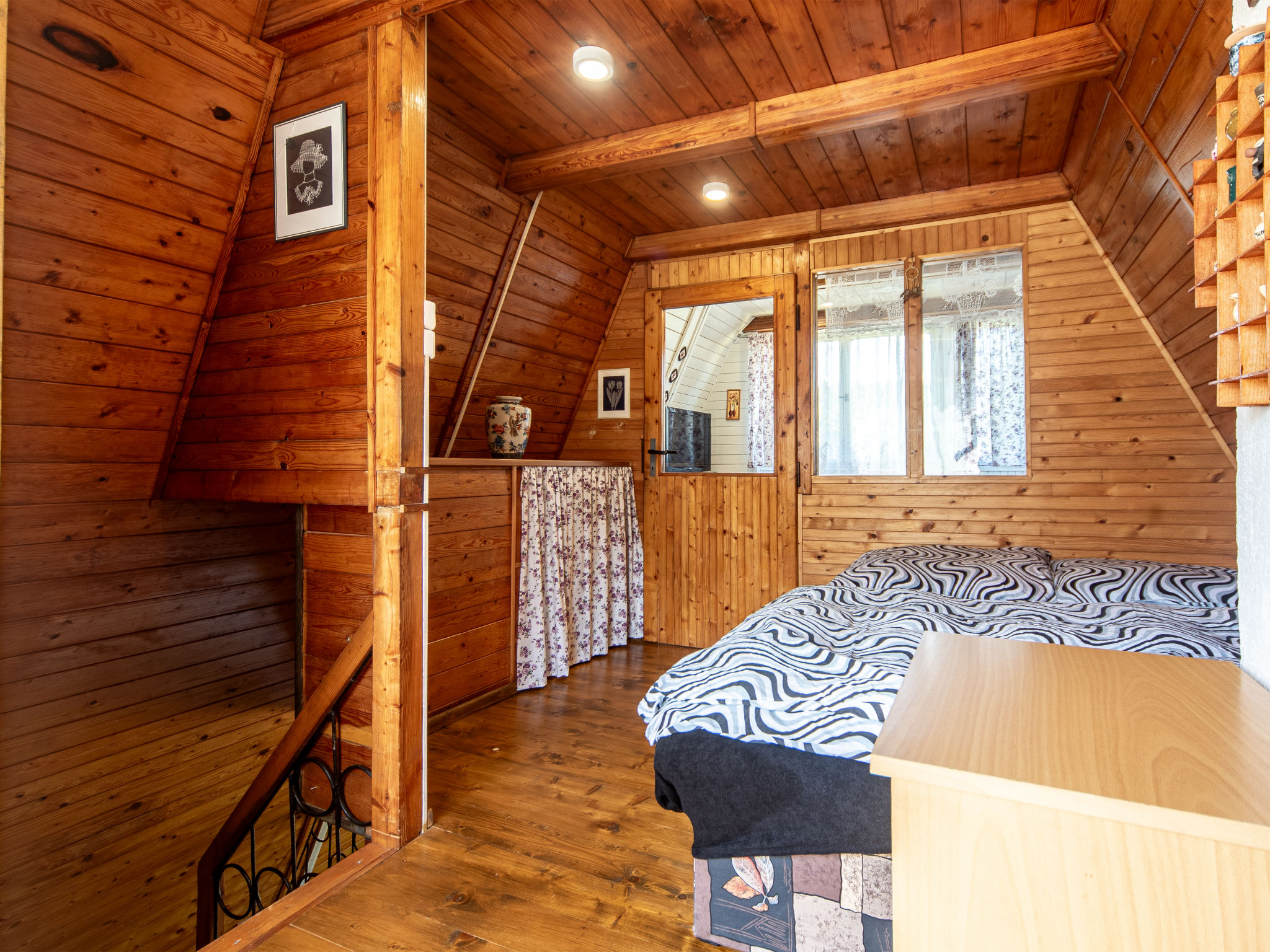 4-Zimmer-Haus 70 m2 auf 3 Stockwerken. Gemütlich eingerichtet: Wohnzimmer mit Sat-TV. Bad/Dusche/WC. Obergeschoss: Wohn-/Schlafzimmer mit 1 Doppeldiwanbett, offenem Kamin, Esstisch, Sat-TV, Radio und DVD. Ausgang zum Balkon. Offene Küche (4 Kochplatten, Backofen, Toaster, Wasserkocher, Mikrowelle, Tiefkühler, elektrische Kaffeemaschine). Dachgeschoss: abgeschrägtes kleines Durchgangszimmer mit 1 Doppelbett. 1 abgeschrägtes kleines Zimmer mit 1 Doppelbett. Grosser Balkon. Balkonmöbel, Gartengrill. Herrliche Sicht auf den See. Zur Verfügung: Kinderhochstuhl, Babybett (extra). Internet (Wireless LAN, gratis). Maximal 3 Haustiere/Hunde erlaubt.
