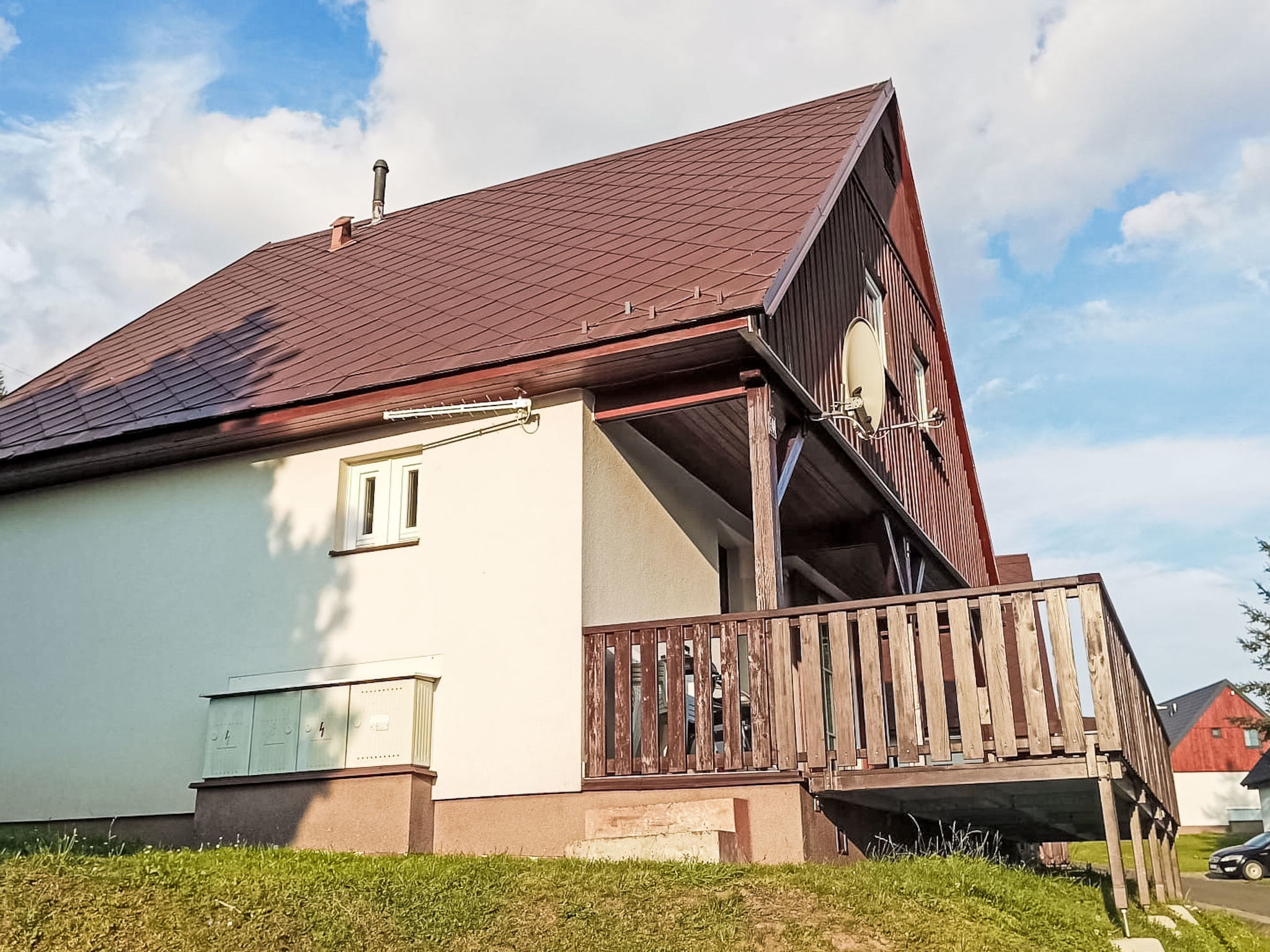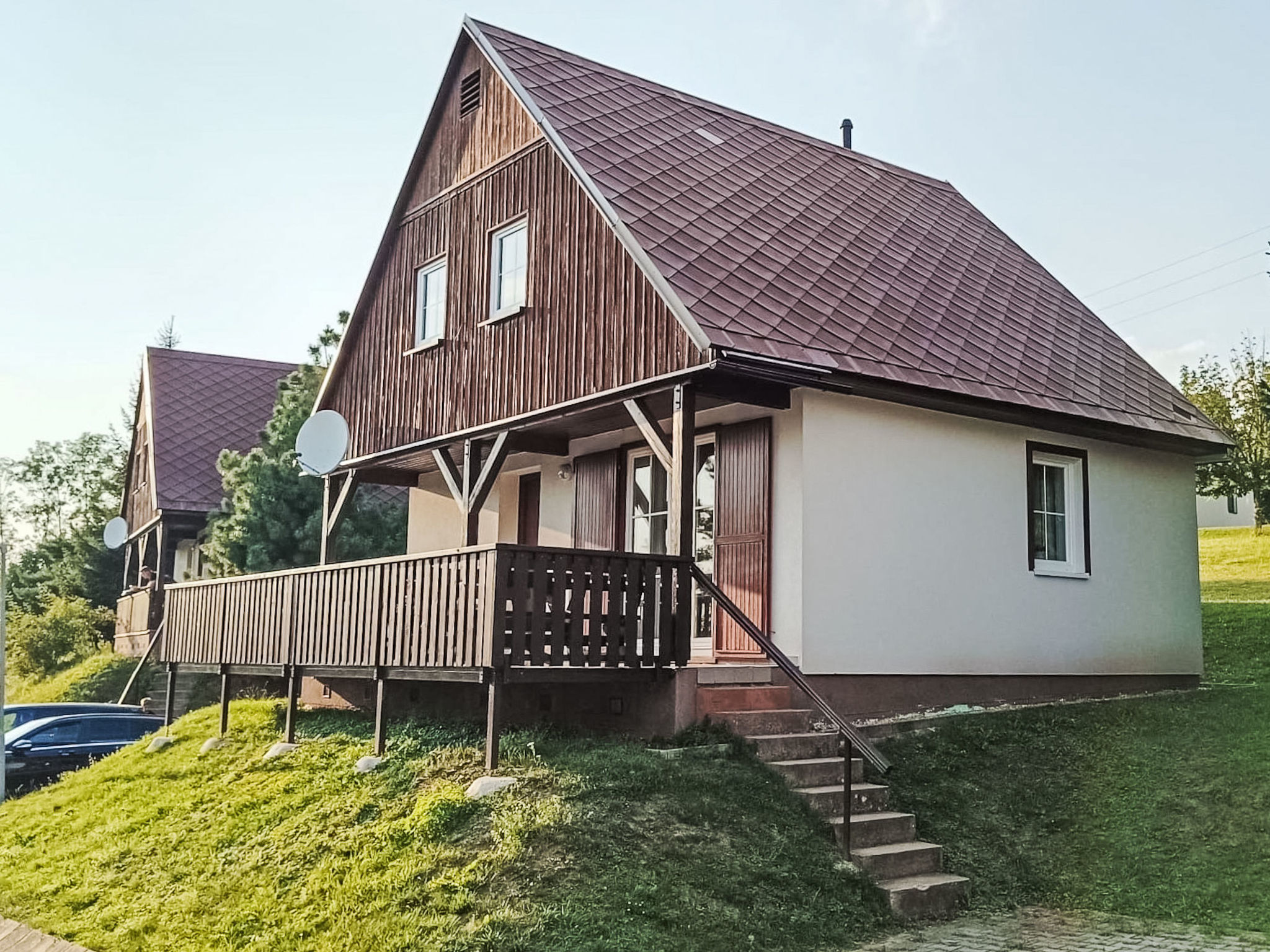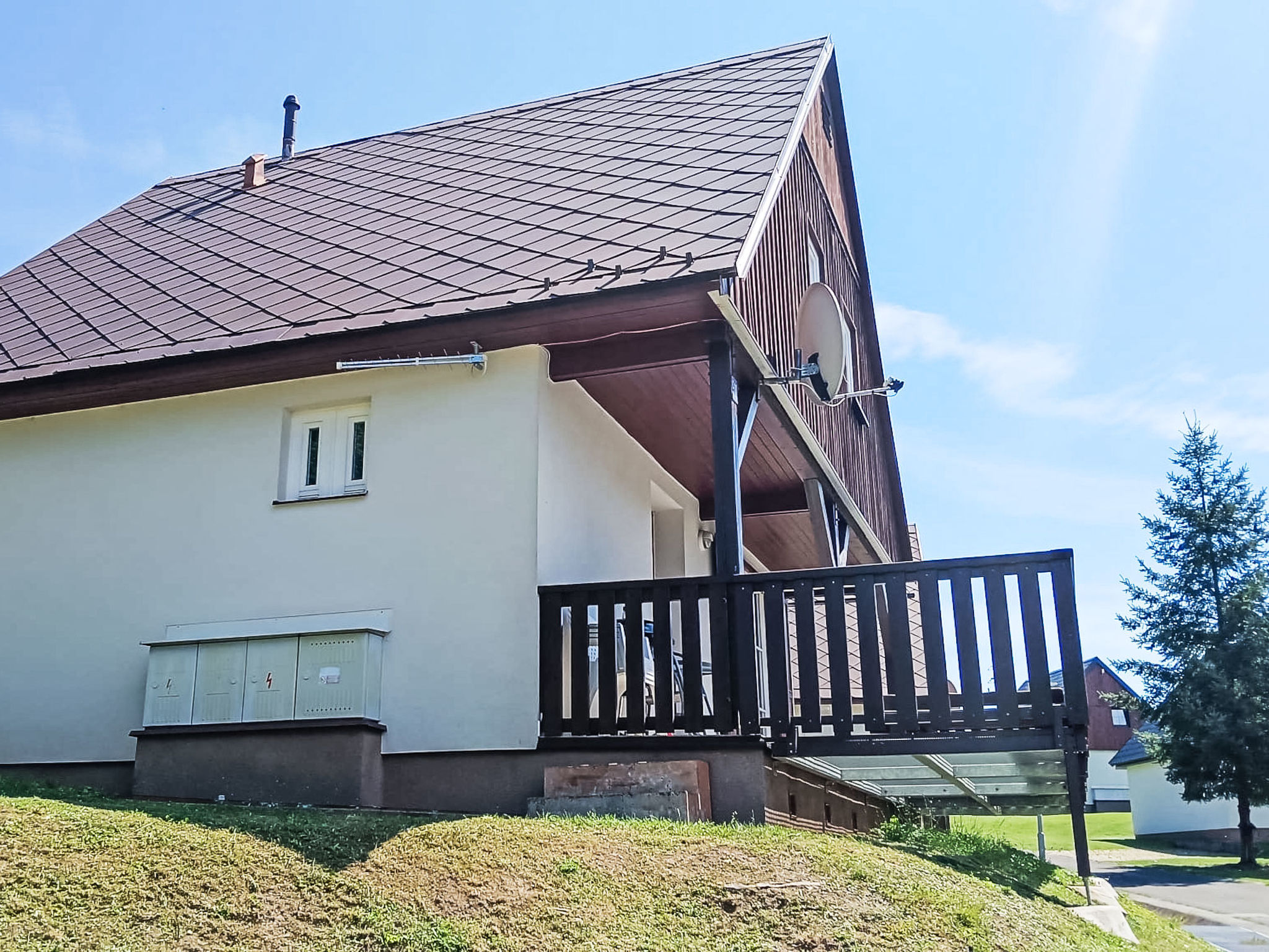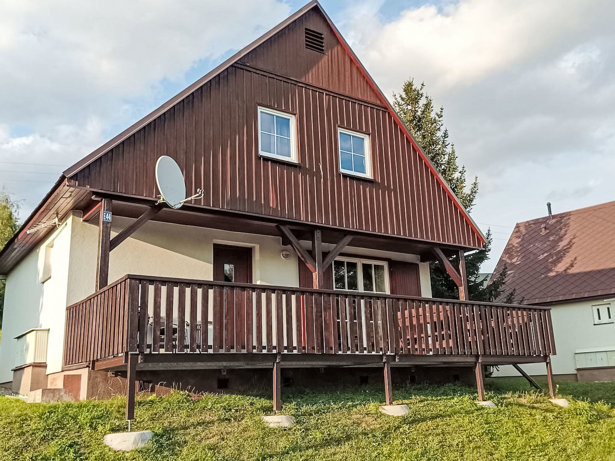 Čistá v Krkonoších 2 km von Černý Důl: Kinderfreundliches, schönes, komfortables Feriendorf "Holiday Hill", 500 m.ü.M., umgeben von Bäumen und Wiesen. 43 Häuser im Ferienresort. Am Ortsrand, alleinstehende, ruhige, sonnige Lage, 1.5 km vom See, 3 km vom Skigebiet, im Grünen. Zur Mitbenutzung: Grundstück 6 ha, Wiese, Schwimmbad beheizt (9 x 4 m, 120 cm tief, saisonale Verfügbarkeit: 01.Jun.-26.Sep. Öffnungszeiten Schwimmbad: 09:00-20:00). Dusche/WC im Poolbereich, Tischtennis, Kinderspielplatz (Schaukel, Sandkasten). In der Anlage: Empfang. Parkplatz (für 2 Autos) beim Haus. Einkaufsgeschäft 2.5 km, Lebensmittelgeschäft 2.5 km, Supermarkt 7.5 km, Restaurant 1.6 km, Biergarten 400 m, Bushaltestelle "Černý Důl, Čistá-pošta" 400 m, Sandstrand 1.5 km (klein), Hallenbad 19 km. Golfplatz (18 Loch) 14 km, Tennis 2.5 km, Sportzentrum 2.5 km, Wanderwege ab Haus, Radweg 100 m, Skilift 3 km, Sessellift 3 km, Skipisten 3 km, Skibushaltestelle 100 m, Skischule 3 km, Kinderskischule 3 km, Schlittelbahn 7 km, Langlaufloipe 100 m. Nahe gelegene Sehenswürdigkeiten: Janské Lázně Spa 9 km, Vrchlabí 10 km, Aquapark Trutnov 25 km, Zoo Safari Dvůr Králové 29 km, Bozkovské jeskyně 37 km, Adršpašské skály 44 km. Bekannte Skigebiete sind gut erreichbar: Černý Důl 3 km, Herlíkovice 15 km, Pec pod Sněžkou 22 km. Bekannte Seen in der Umgebung sind gut erreichbar: Čistá 1.5 km, Vrchlabí 9 km. Wandergebiete: Sněžka 25 km.