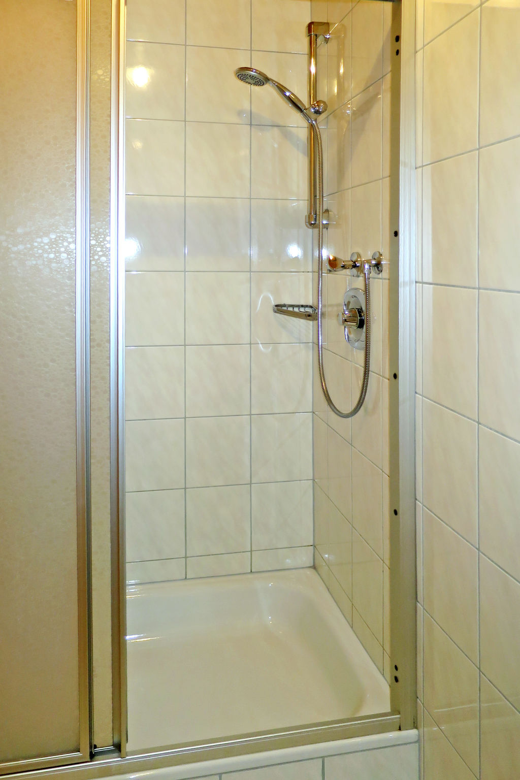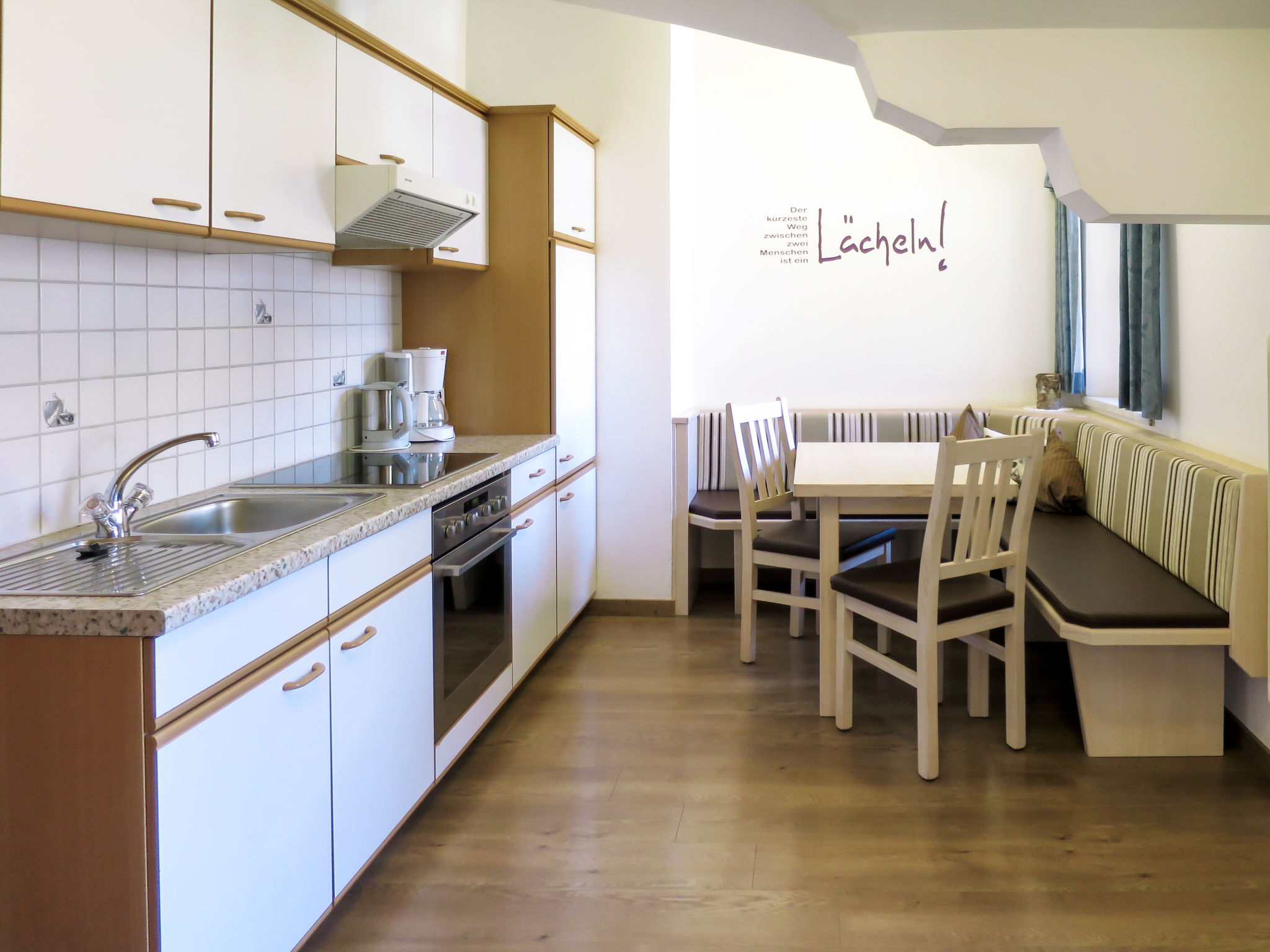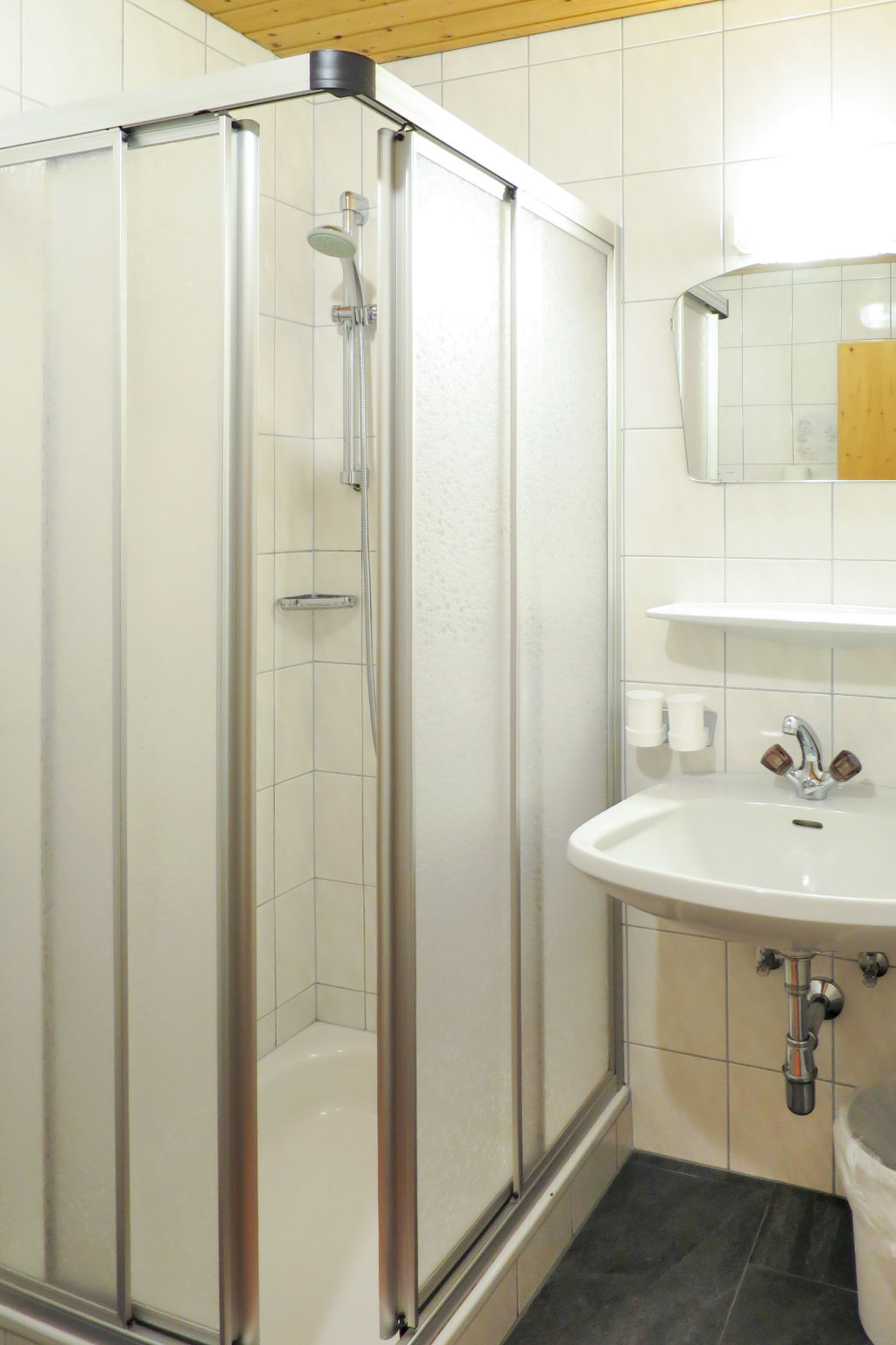 3-Zimmer-Wohnung, 2. Etage (leichte Dachschräge), ca. 55 m². Wohnküche mit Küchenzeile (4 Ceranfelder, Backofen, Kühlschrank, Kaffeemaschine, Wasserkocher), Essplatz (Eckbank) und Balkonausgang. Schlafzimmer mit Doppelbett, Einzelbett und Dusche/WC. Außerhalb der abgeschlossenen Wohnung: Doppelzimmer mit Waschbecken, Dusche/WC. Bei Belegung mit weniger Personen als der maximalen Personenzahl stehen nicht alle Wohneinheiten zur Verfügung.