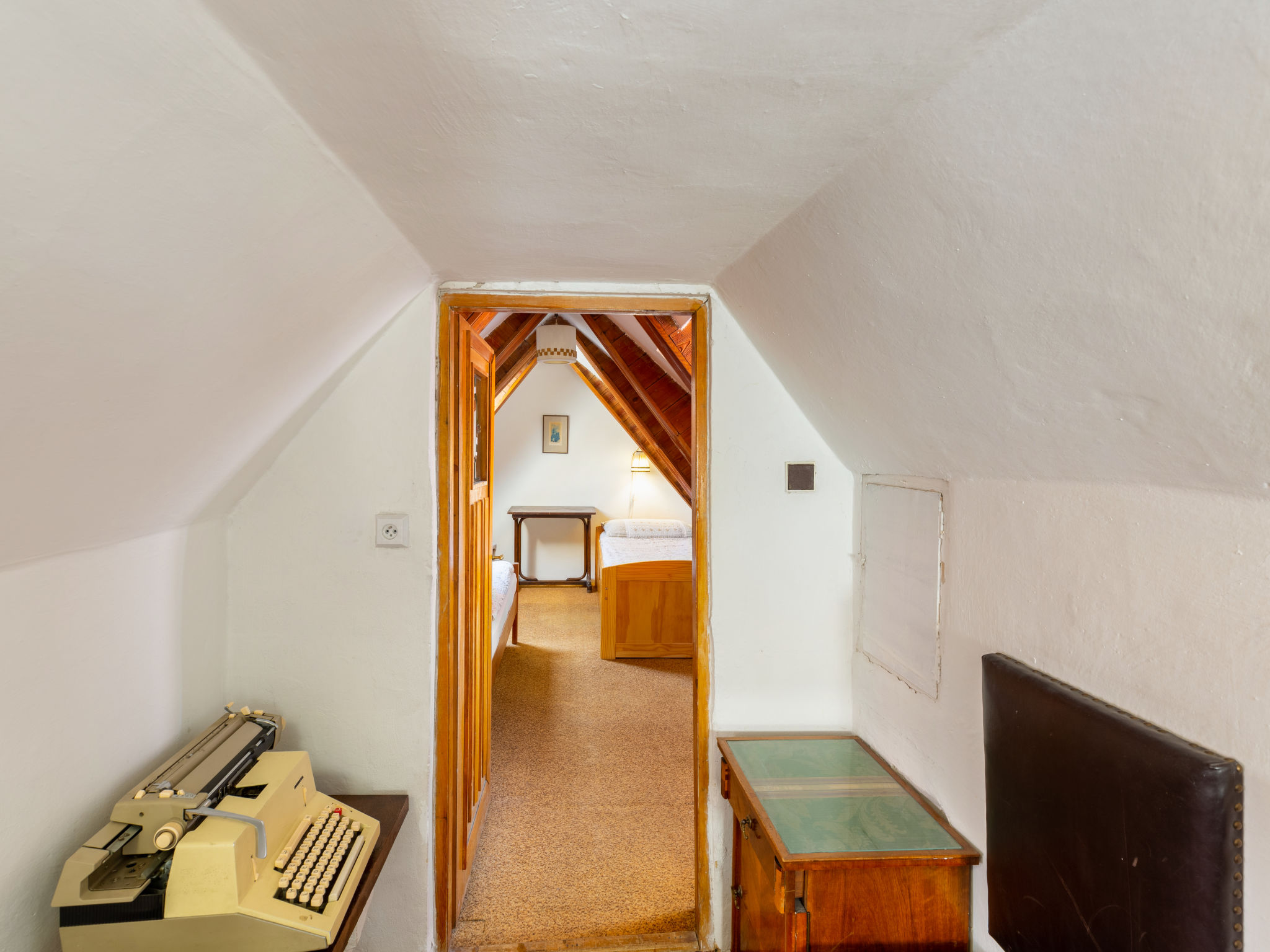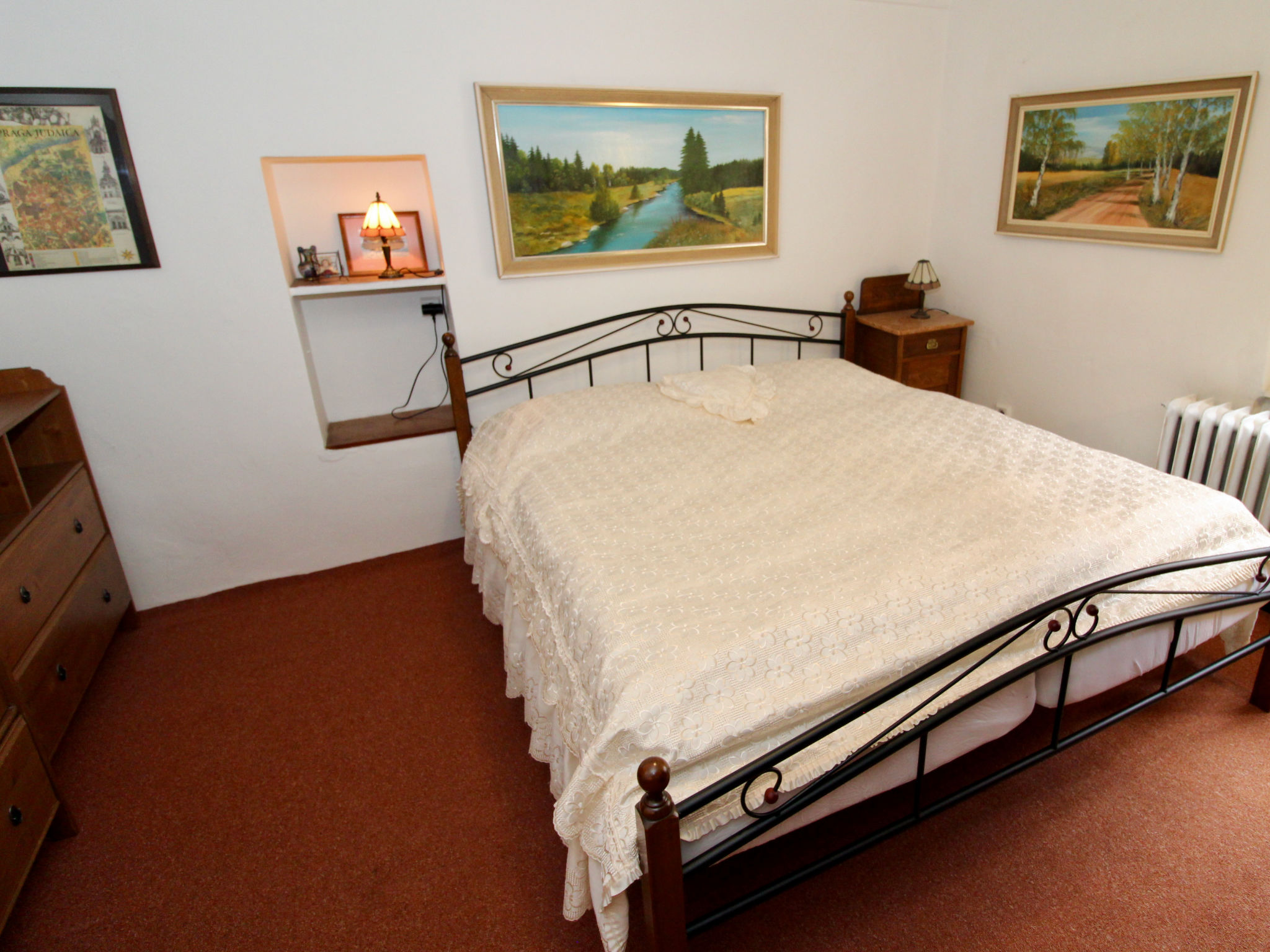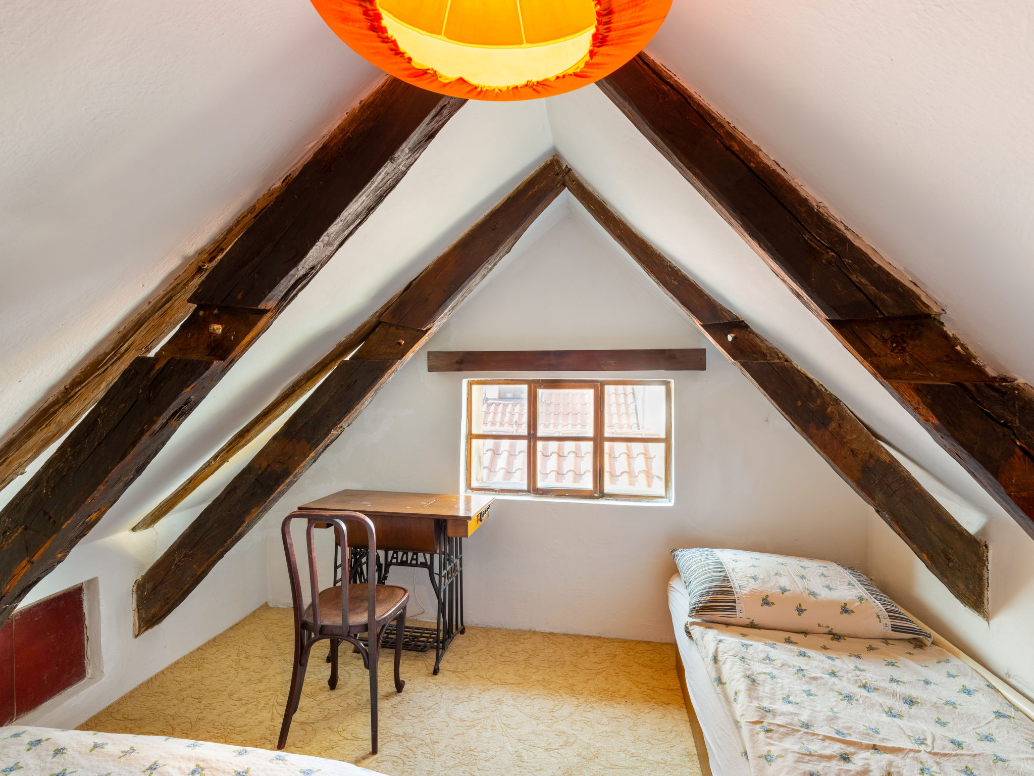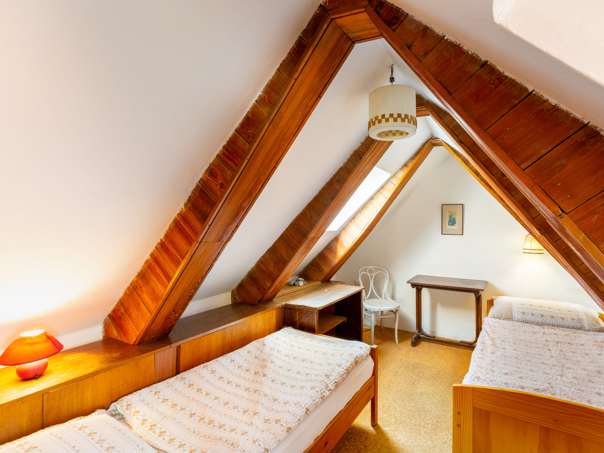 "Nerudova", 4-Zimmer-Wohnung 97 m2 auf 2 Stockwerken im 3. Stock. Teilweise abgeschrägt, einfach und antik eingerichtet: Eingang mit Veranda. Esszimmer mit Esstisch. Wohn-/Esszimmer mit offenem Kamin (nur Deko), Esstisch, TV und Flachbildschirm. 1 Doppelzimmer. Kleine Küche (Backofen, Geschirrspüler, 4 Flammen, Wasserkocher, Mikrowelle, Tiefkühler) mit kleiner Bar. Dusche/WC. G-Heizung. Obergeschoss: 2 abgeschrägte Zimmer, Deckenhöhe 190 - 200 cm, niedrige Türrahmen, Höhe 180 cm, jedes Zimmer mit 2 Betten. Zur Verfügung: Waschmaschine, Bügeleisen, Babybett, Haartrockner. Internet (Wireless LAN, gratis).