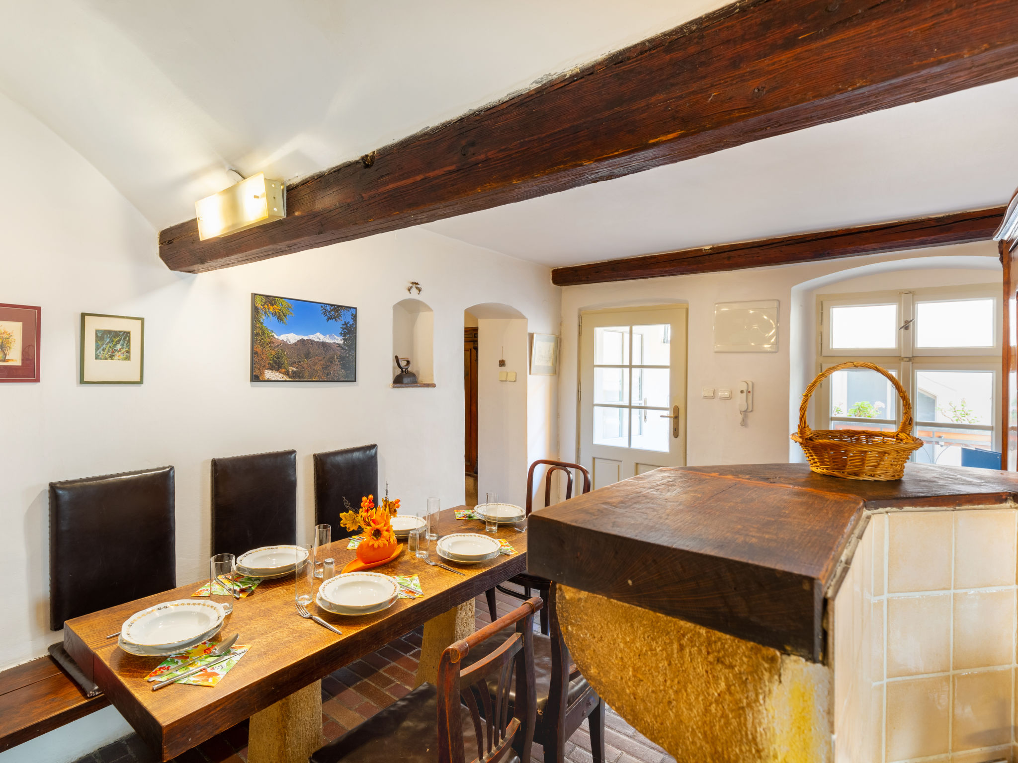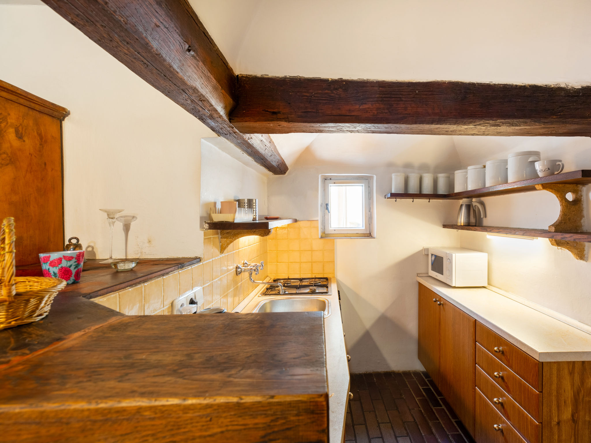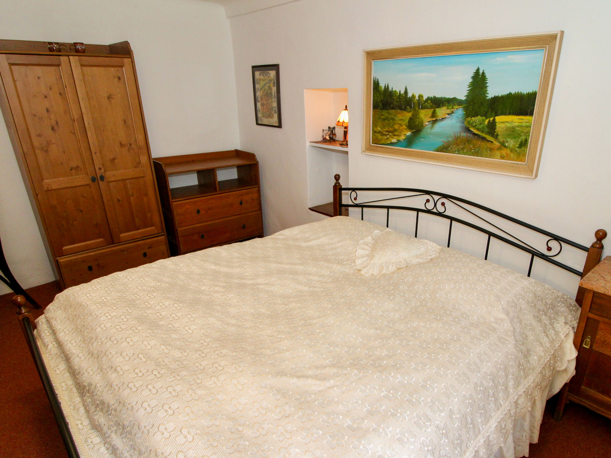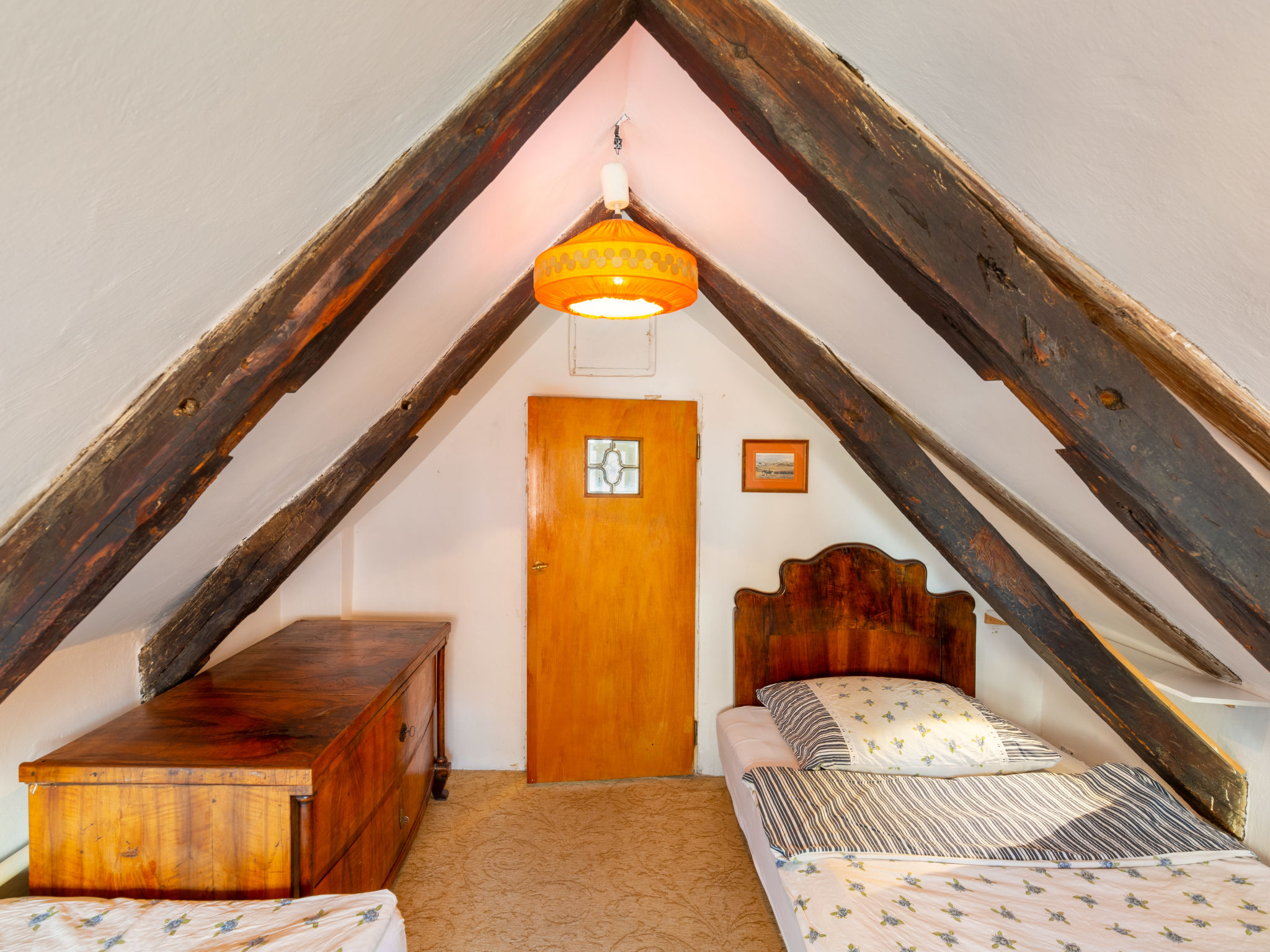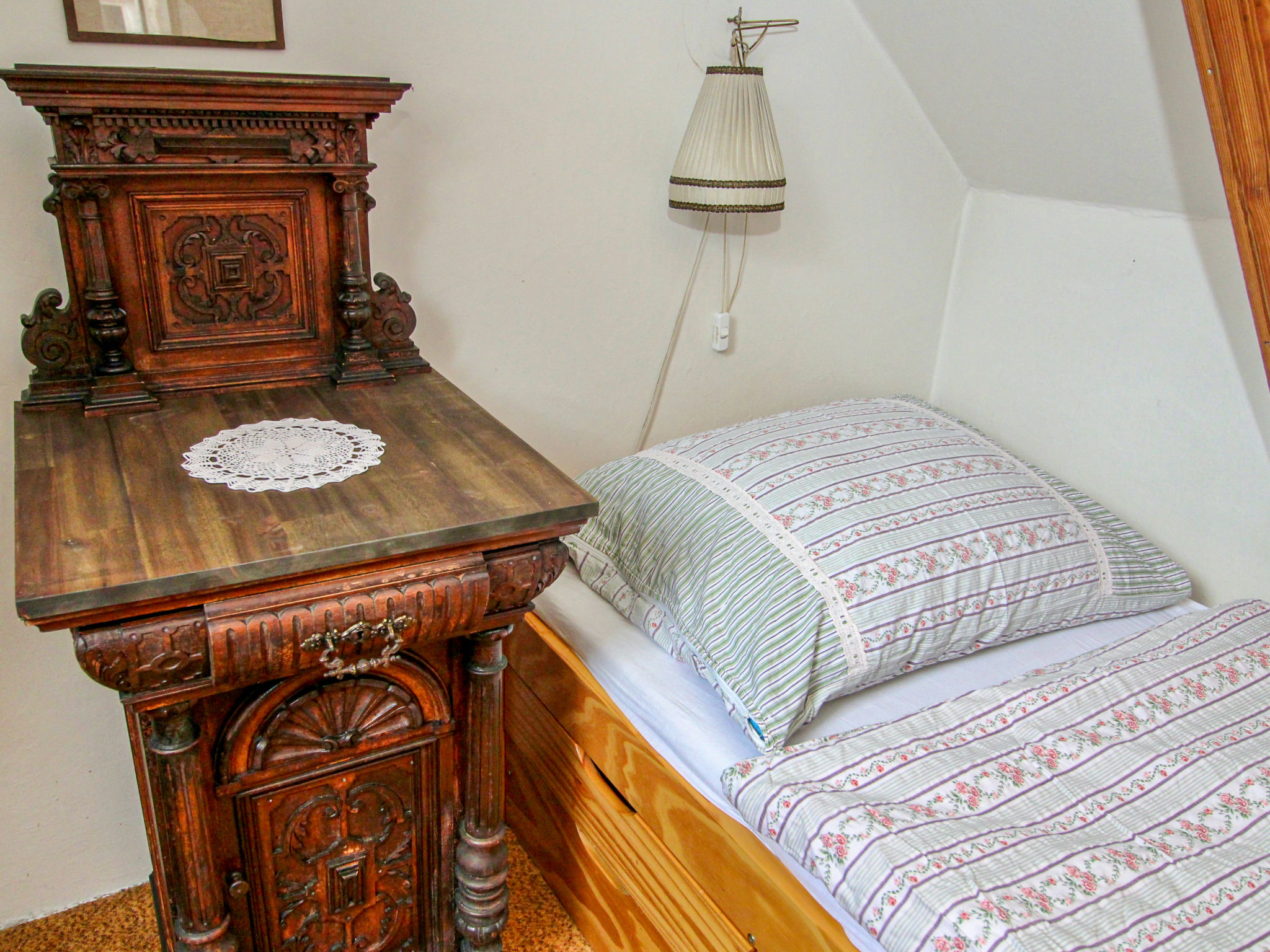 "Nerudova", 4-Zimmer-Wohnung 97 m2 auf 2 Stockwerken im 3. Stock. Teilweise abgeschrägt, einfach und antik eingerichtet: Eingang mit Veranda. Esszimmer mit Esstisch. Wohn-/Esszimmer mit offenem Kamin (nur Deko), Esstisch, TV und Flachbildschirm. 1 Doppelzimmer. Kleine Küche (Backofen, Geschirrspüler, 4 Flammen, Wasserkocher, Mikrowelle, Tiefkühler) mit kleiner Bar. Dusche/WC. G-Heizung. Obergeschoss: 2 abgeschrägte Zimmer, Deckenhöhe 190 - 200 cm, niedrige Türrahmen, Höhe 180 cm, jedes Zimmer mit 2 Betten. Zur Verfügung: Waschmaschine, Bügeleisen, Babybett, Haartrockner. Internet (Wireless LAN, gratis).