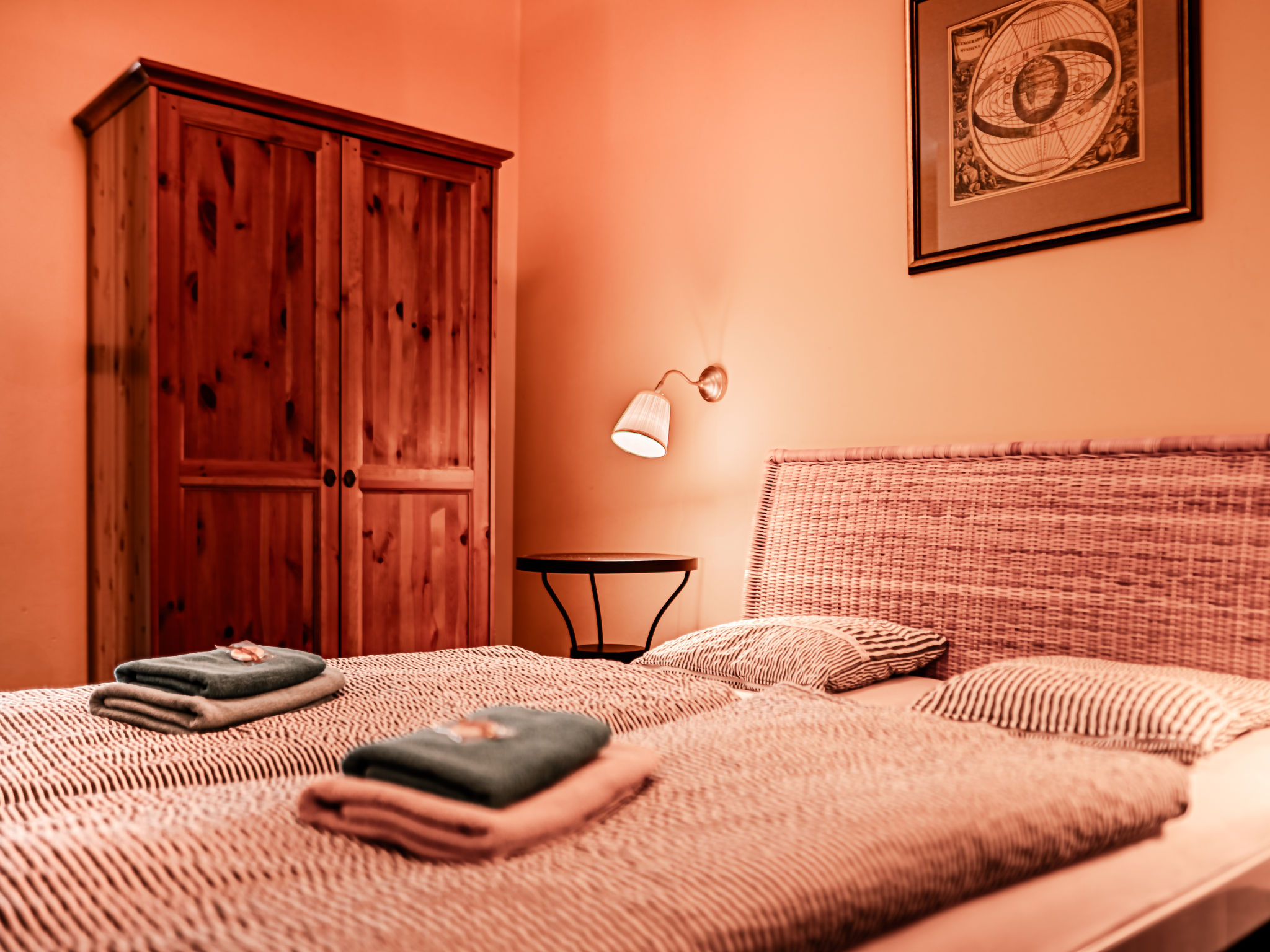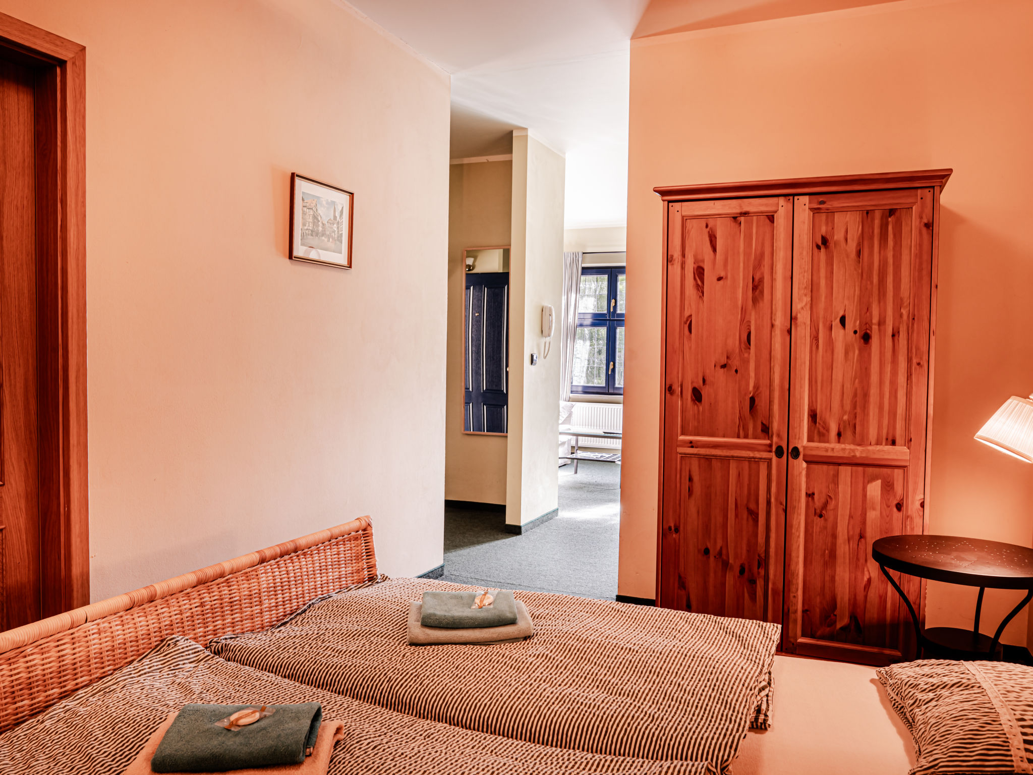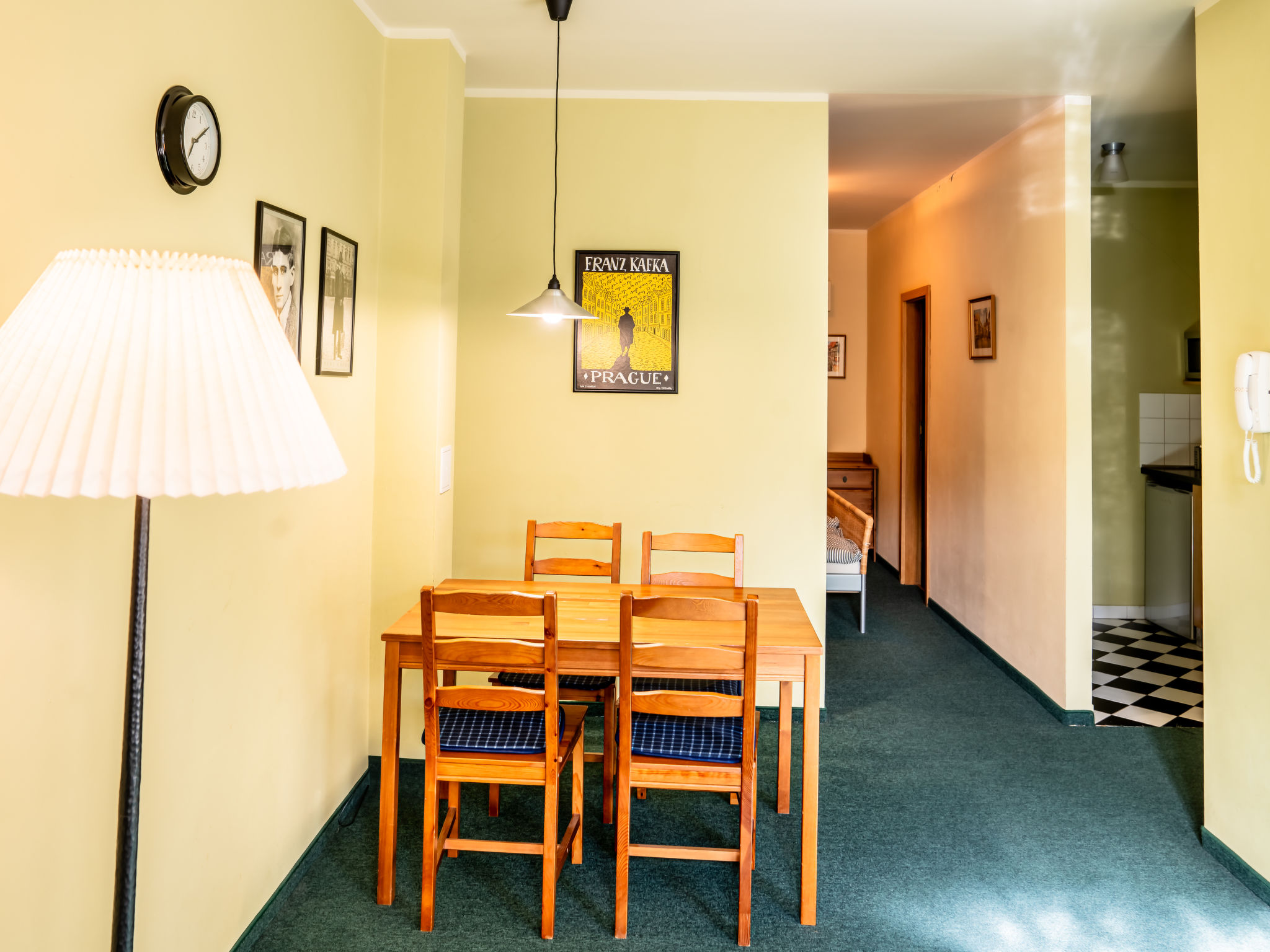 "Kafka", 2-Zimmer-Wohnung 40 m2, unteres Geschoss. Schön und gemütlich eingerichtet: Wohnzimmer mit Esstisch und Sat-TV. 1 Zimmer mit 1 Doppelbett. Kochnische (2 Kochplatten, Wasserkocher, Mikrowelle, Tiefkühler). Dusche/WC. Sehr schöne Sicht auf den Garten. Zur Verfügung: Internet (Wireless LAN, gratis). Parkplatz (eingezäunt) beim Haus. Bitte beachten: Nichtraucher-Unterkunft. Maximal 1 Haustier/Hund erlaubt. Das Wohnzimmer ist vom Zimmer mit Doppelbett zum Teil mit dem Scheibewand getrennt.