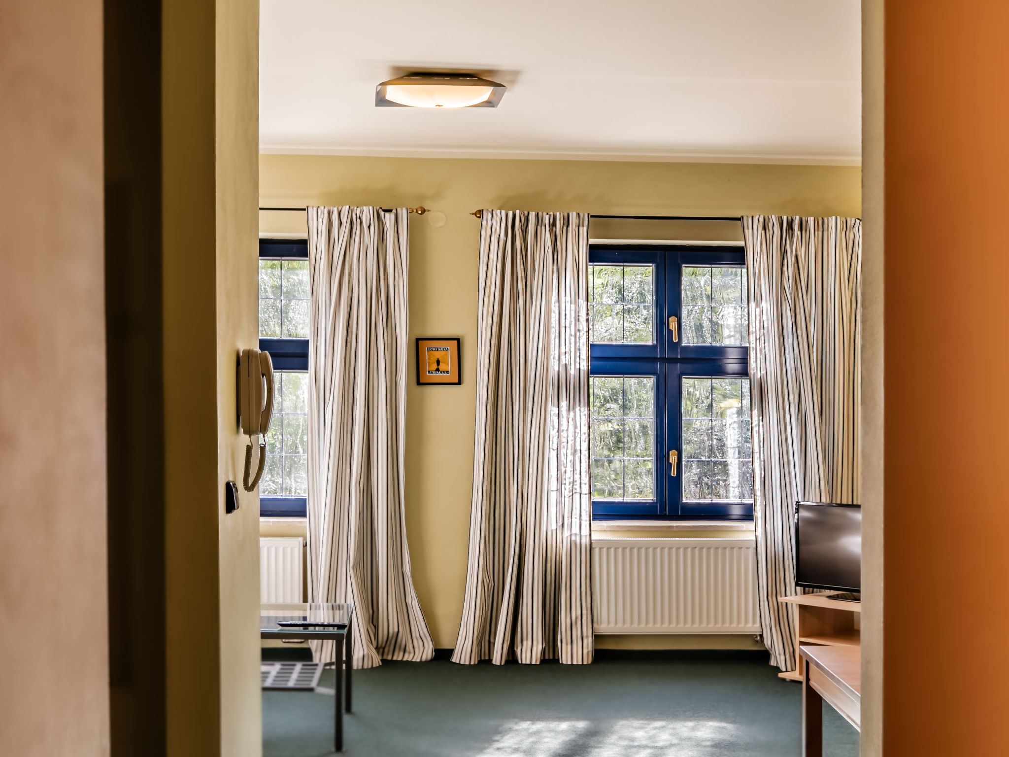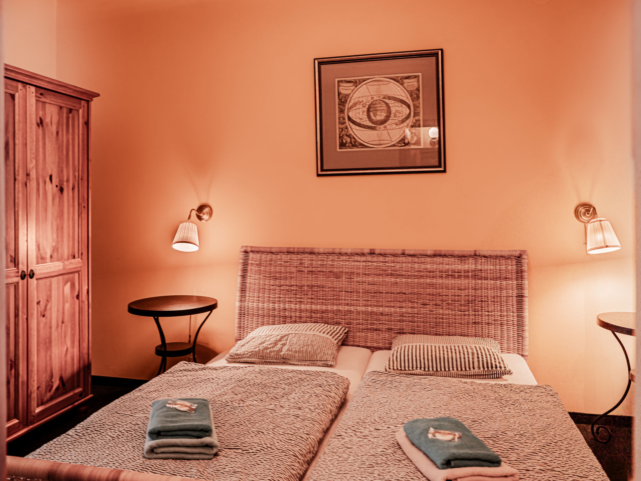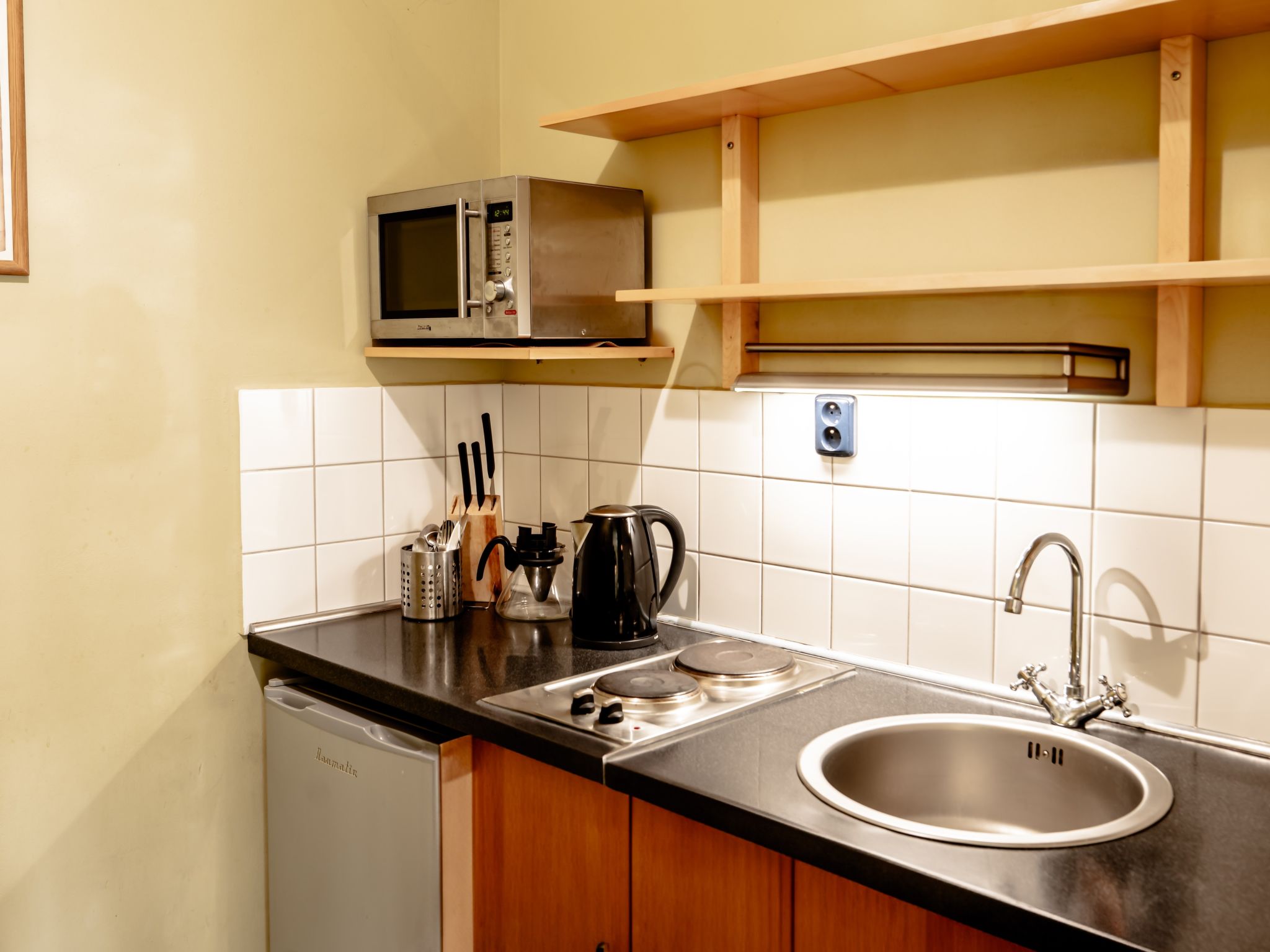 "Kafka", 2-Zimmer-Wohnung 40 m2, unteres Geschoss. Schön und gemütlich eingerichtet: Wohnzimmer mit Esstisch und Sat-TV. 1 Zimmer mit 1 Doppelbett. Kochnische (2 Kochplatten, Wasserkocher, Mikrowelle, Tiefkühler). Dusche/WC. Sehr schöne Sicht auf den Garten. Zur Verfügung: Internet (Wireless LAN, gratis). Parkplatz (eingezäunt) beim Haus. Bitte beachten: Nichtraucher-Unterkunft. Maximal 1 Haustier/Hund erlaubt. Das Wohnzimmer ist vom Zimmer mit Doppelbett zum Teil mit dem Scheibewand getrennt.