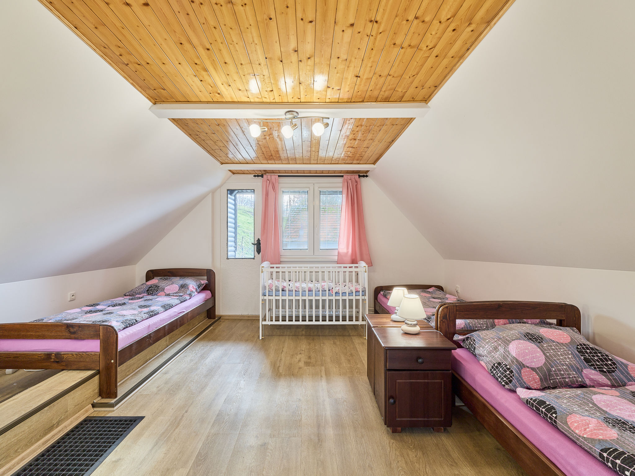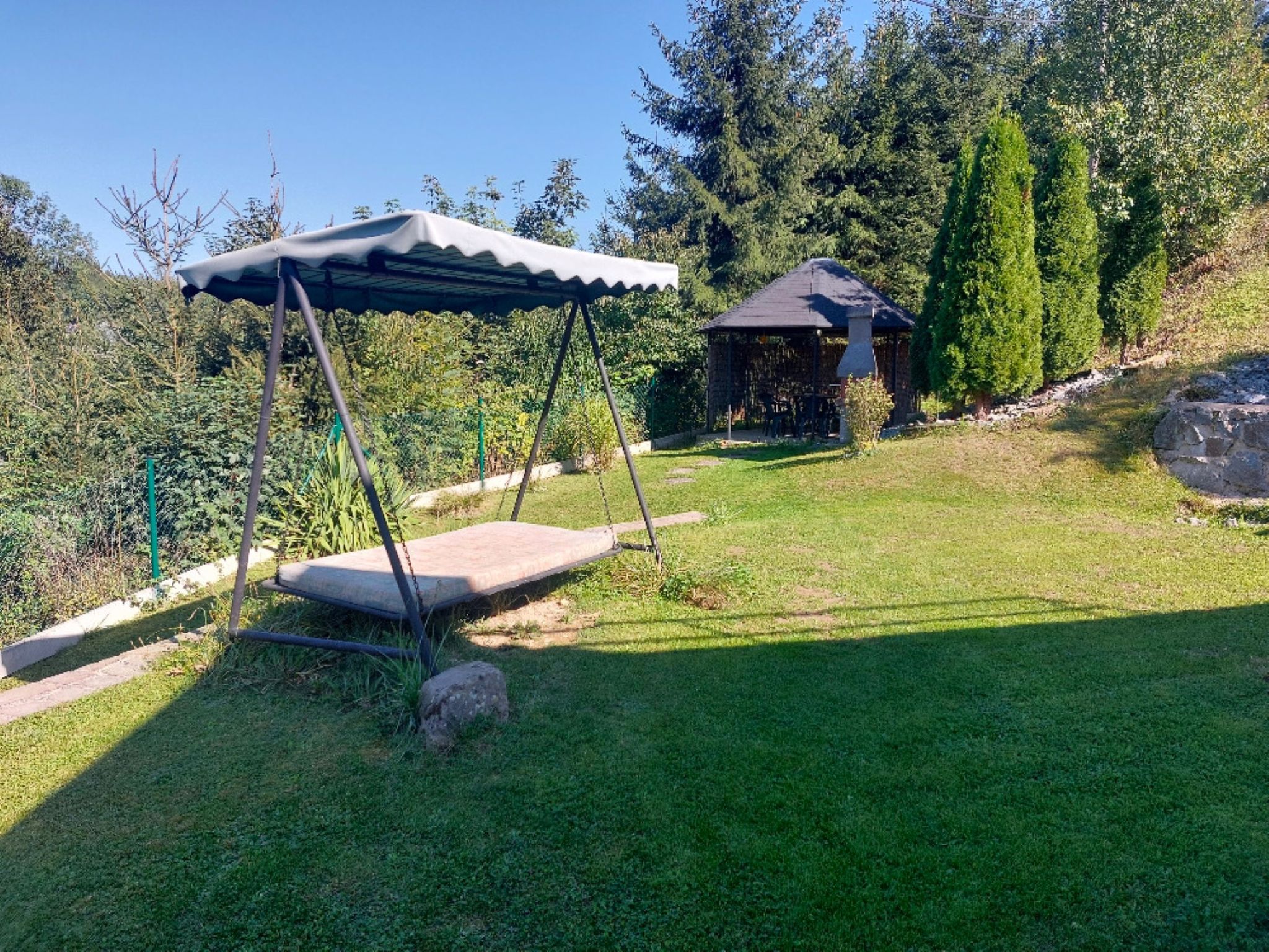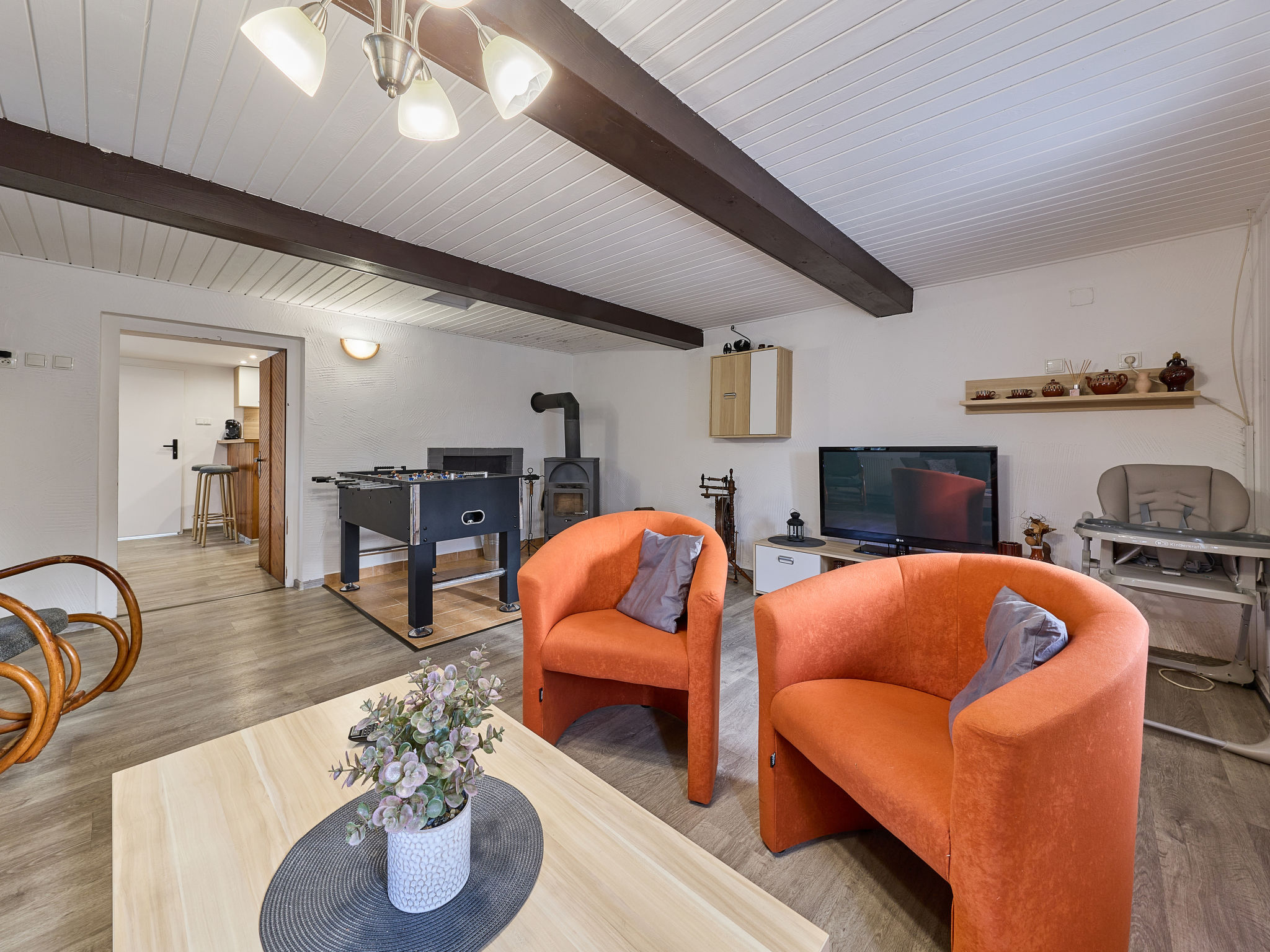 3-Zimmer-Haus 80 m2 auf 2 Stockwerken. Zweckmässig eingerichtet: Wohnzimmer mit Schwedenofen und Sat-TV. Kleine Küche (Backofen, 4 Glaskeramikherd Platten, Toaster, Wasserkocher, Mikrowelle, elektrische Kaffeemaschine) mit Esstisch. Bad, sep. WC. Obergeschoss: abgeschrägtes Durchgangszimmer mit 1 Bett und 1 Doppelbett. 1 abgeschrägtes Zimmer mit 3 Betten. Zur Verfügung: Kinderhochstuhl, Babybett. Internet (Wireless LAN, gratis). 2 kleine Haustiere/Hunde erlaubt.
