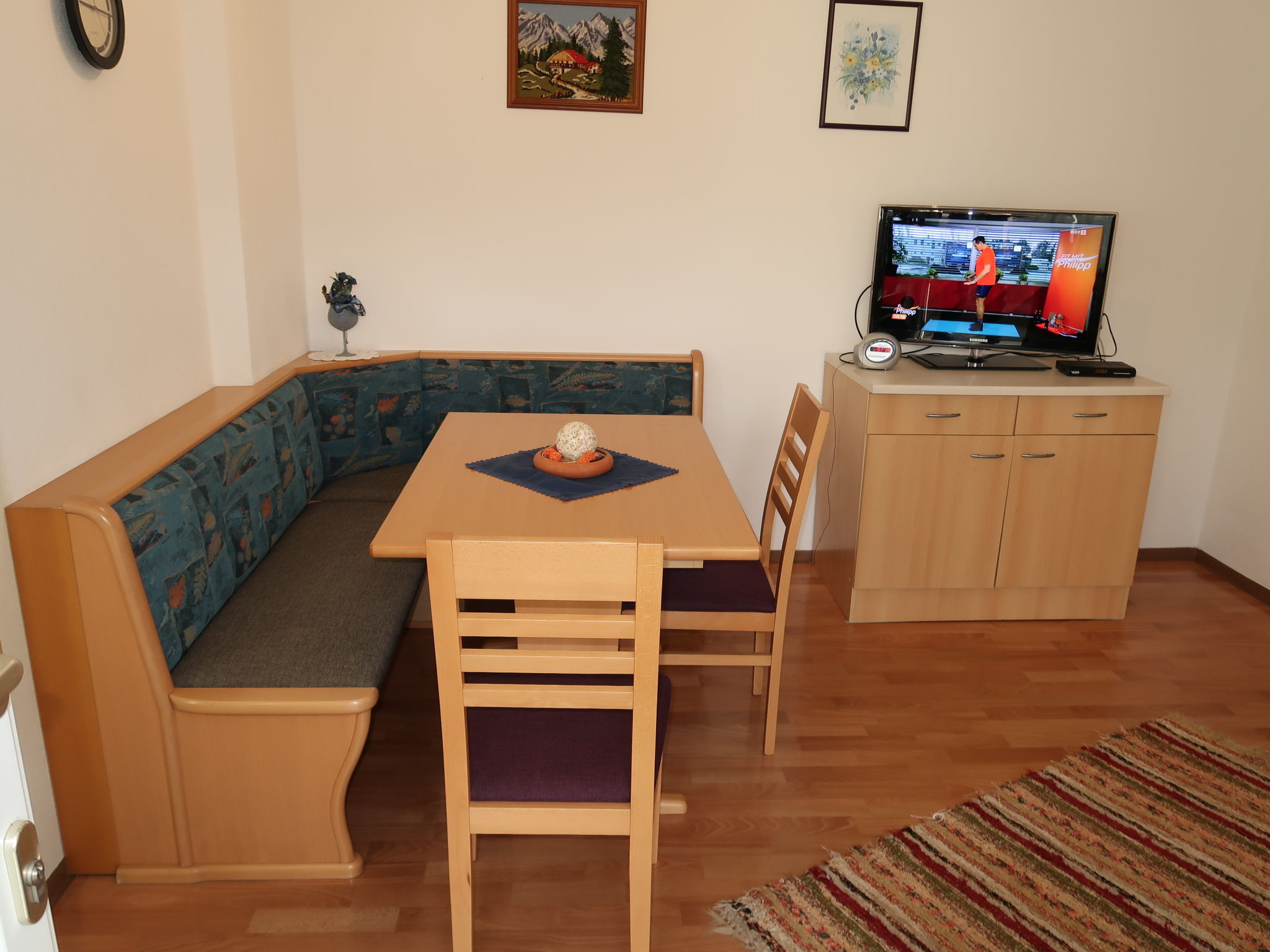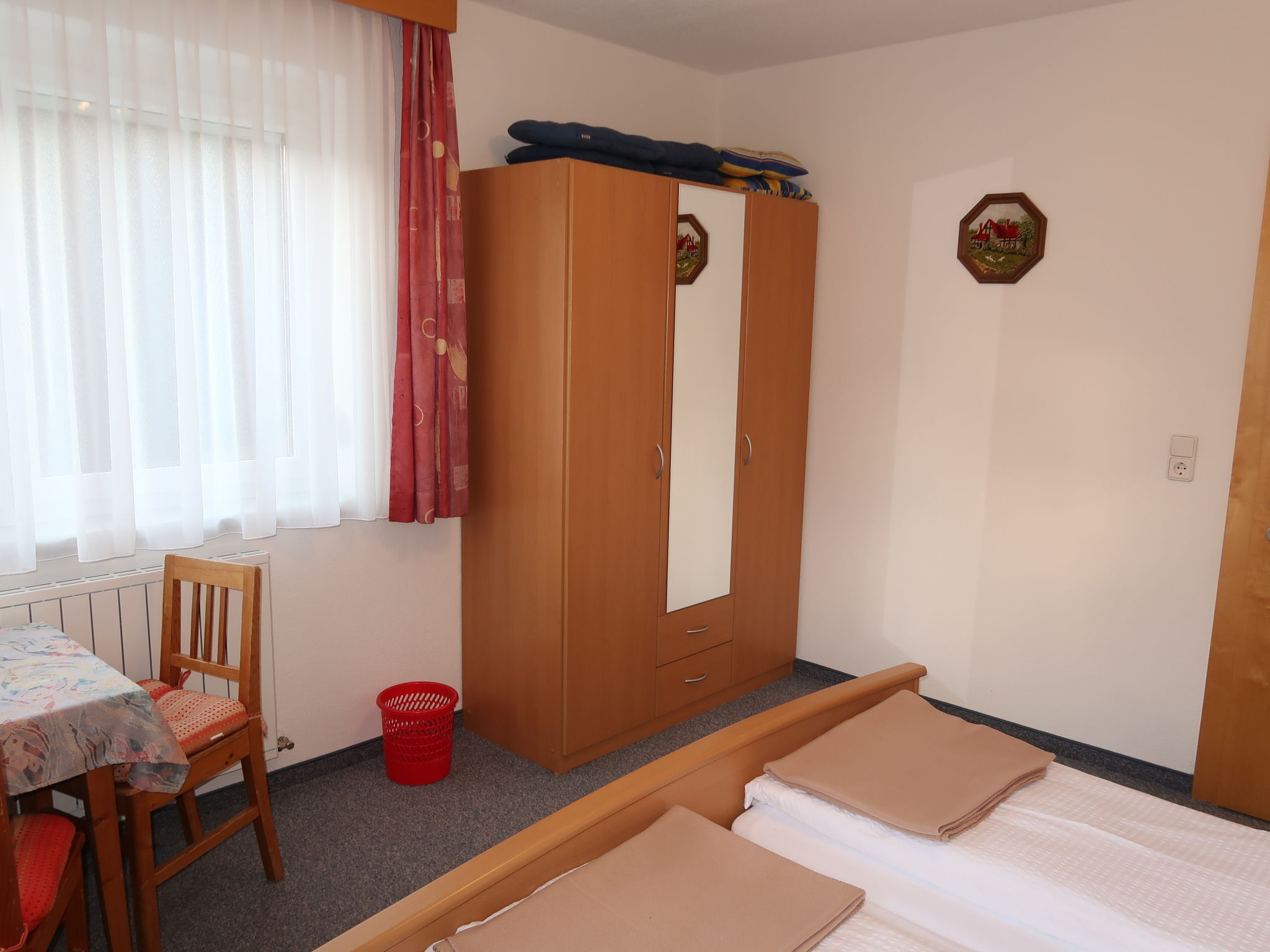 3-Zimmer-Wohnung, Erdgeschoss, ca. 70 m². Separater Eingang in Flur mit Garderobe. Wohnraum mit Sitzcouch und Essplatz (Eckbank), offen zu kleiner Küche (4 Platten, Backofen, Mikrowelle, Geschirrspüler, Kühlschrank, Kaffeemaschine, Wasserkocher, Toaster), Ausgang ins Freie. 2 Doppelzimmer. Dusche/WC.