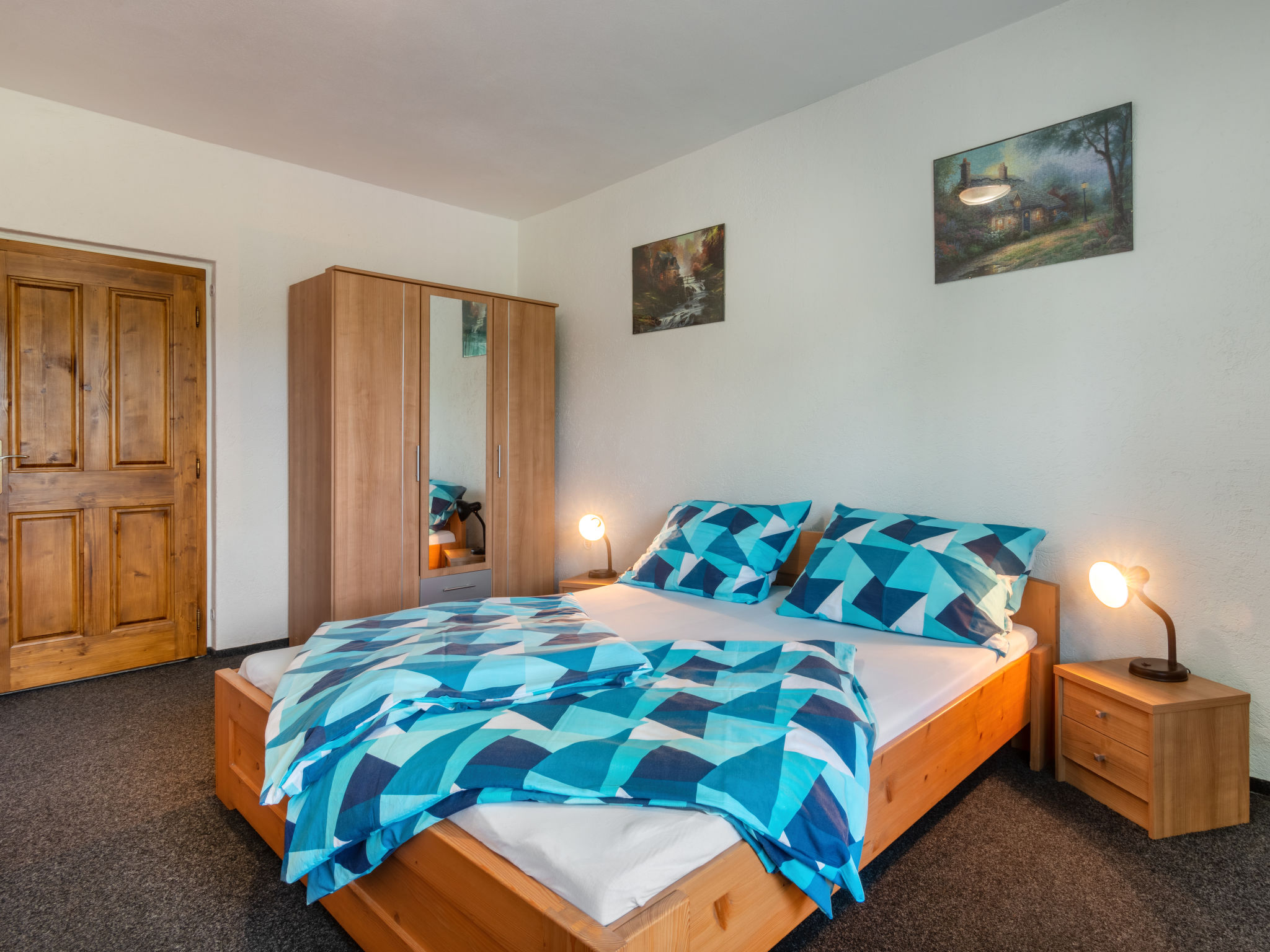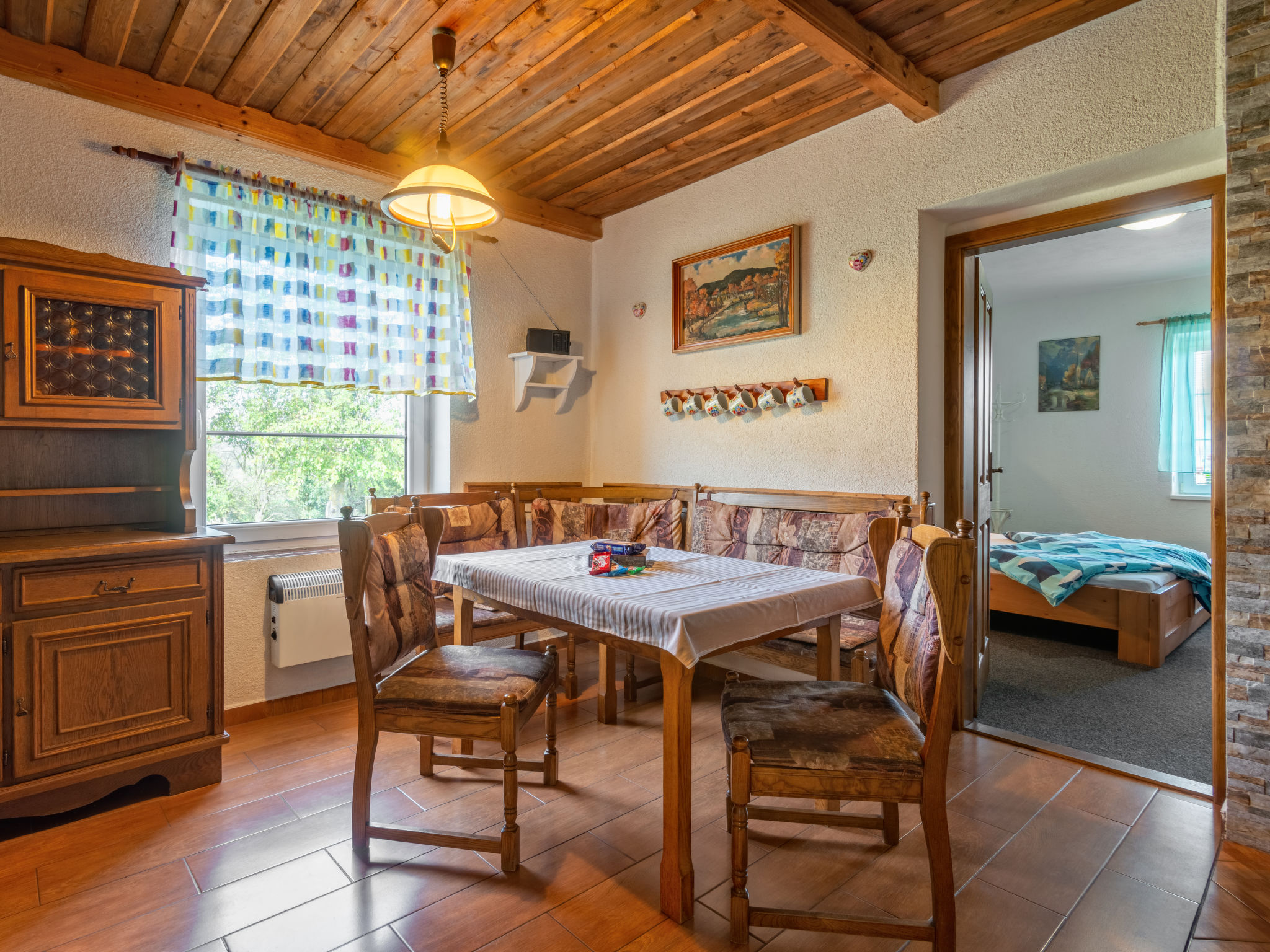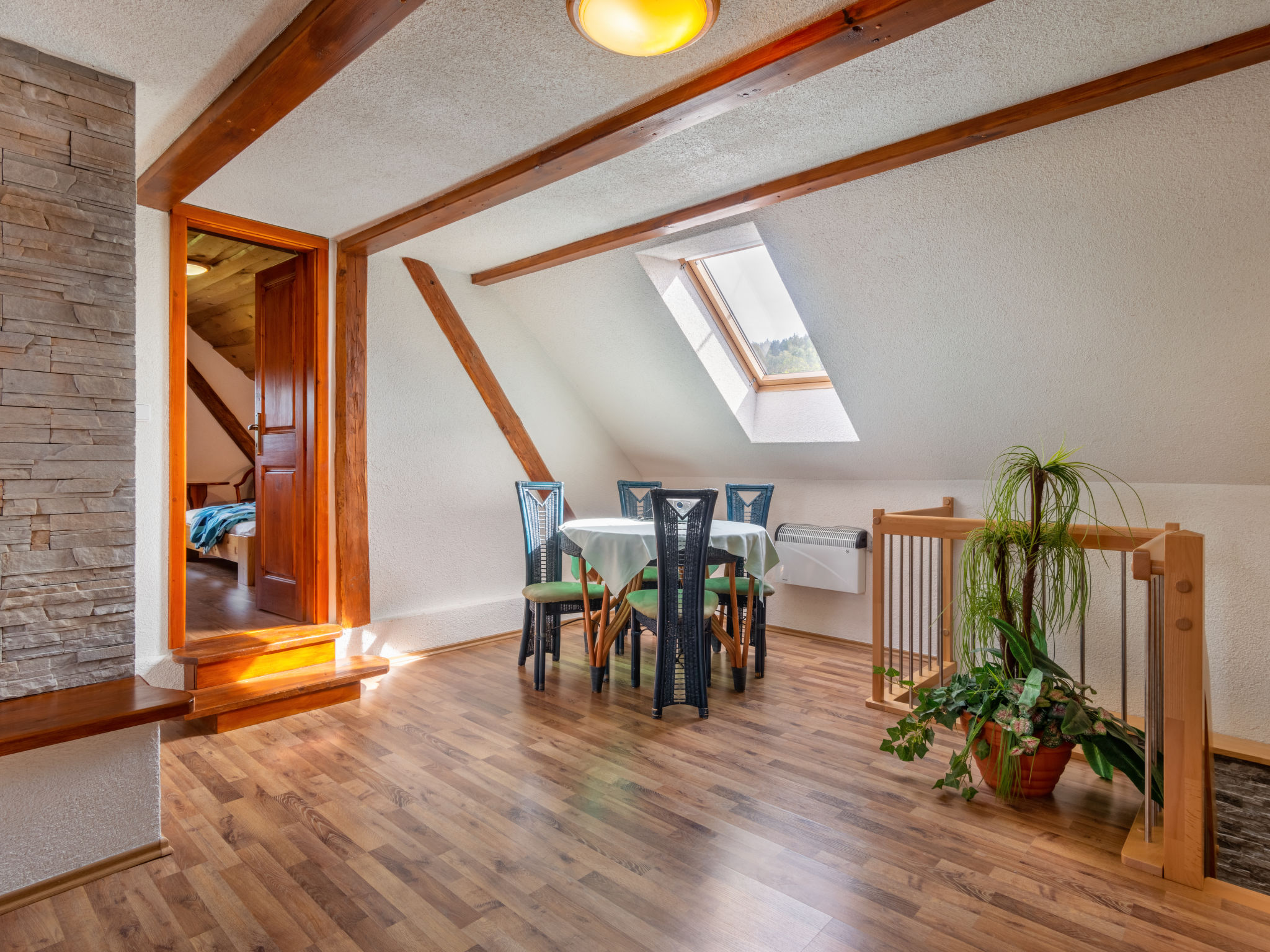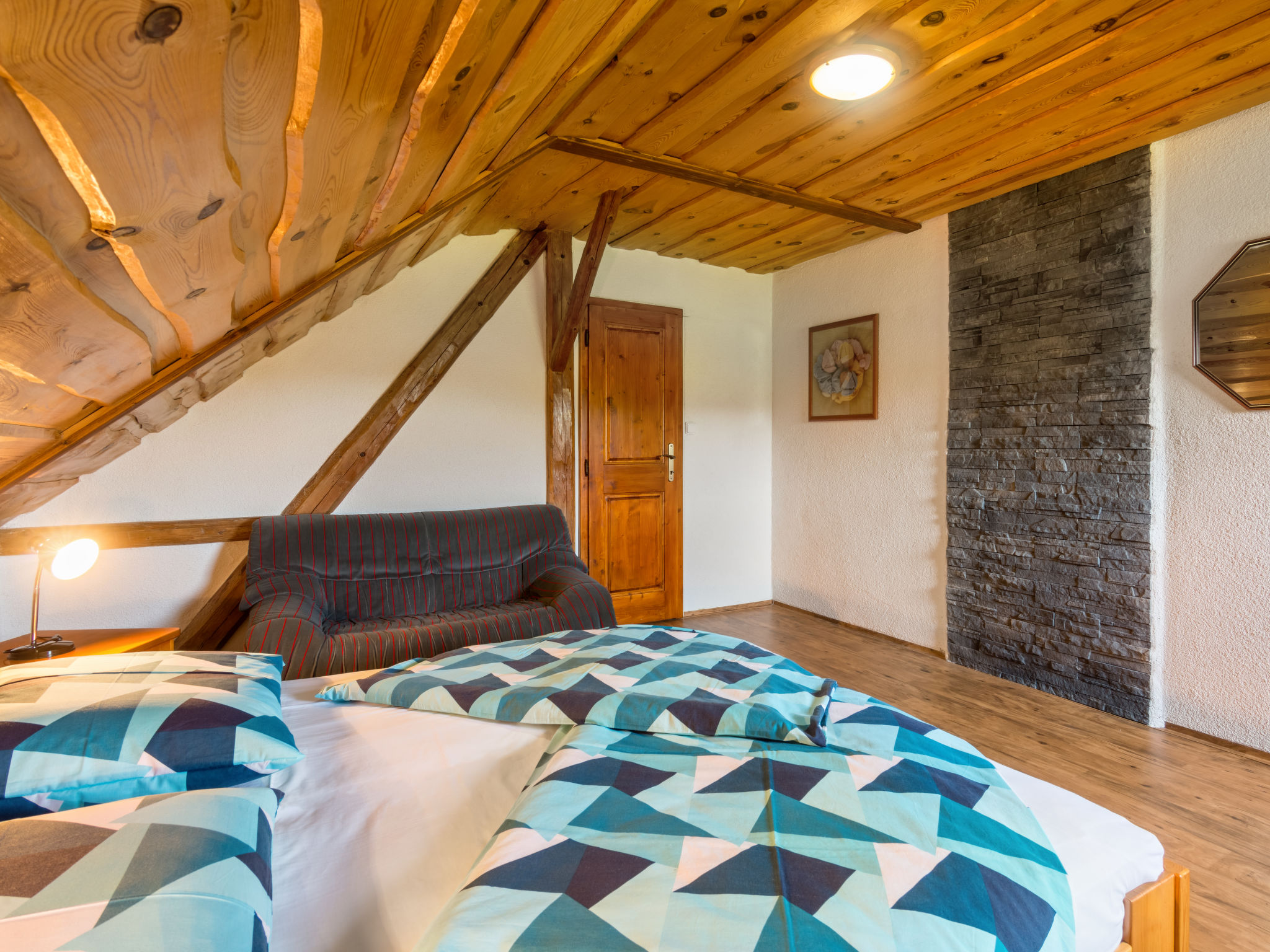 6-Zimmer-Haus 140 m2 auf 2 Stockwerken. Rustikal und gemütlich eingerichtet: Wohnzimmer mit Sat-TV (Flachbildschirm), Radio und DVD. Billardzimmer mit offenem Kamin und Esstisch. 1 Zimmer mit 1 Doppelbett. 1 Zimmer mit 1 Doppelbett. Küche (Backofen, Geschirrspüler, 4 Glaskeramikherd Platten, Toaster, Wasserkocher, Mikrowelle, elektrische Kaffeemaschine) mit Essecke. Dusche, Dusche/Bidet/WC, Doppelwaschbecken, Sauna. E-Heizung. Obergeschoss: 1 abgeschrägtes Zimmer mit 1 Doppelbett. 1 abgeschrägtes Zimmer mit 1 Doppelbett. Dusche/WC. E-Heizung. Gartensitzplatz. Terrassenmöbel, Gartengrill. Panoramasicht. Zur Verfügung: Waschmaschine, Sauna, Kinderhochstuhl, Babybett. Internet (Wireless LAN, gratis). Bitte beachten: Nichtraucher-Unterkunft. Maximal 3 Haustiere/Hunde erlaubt.