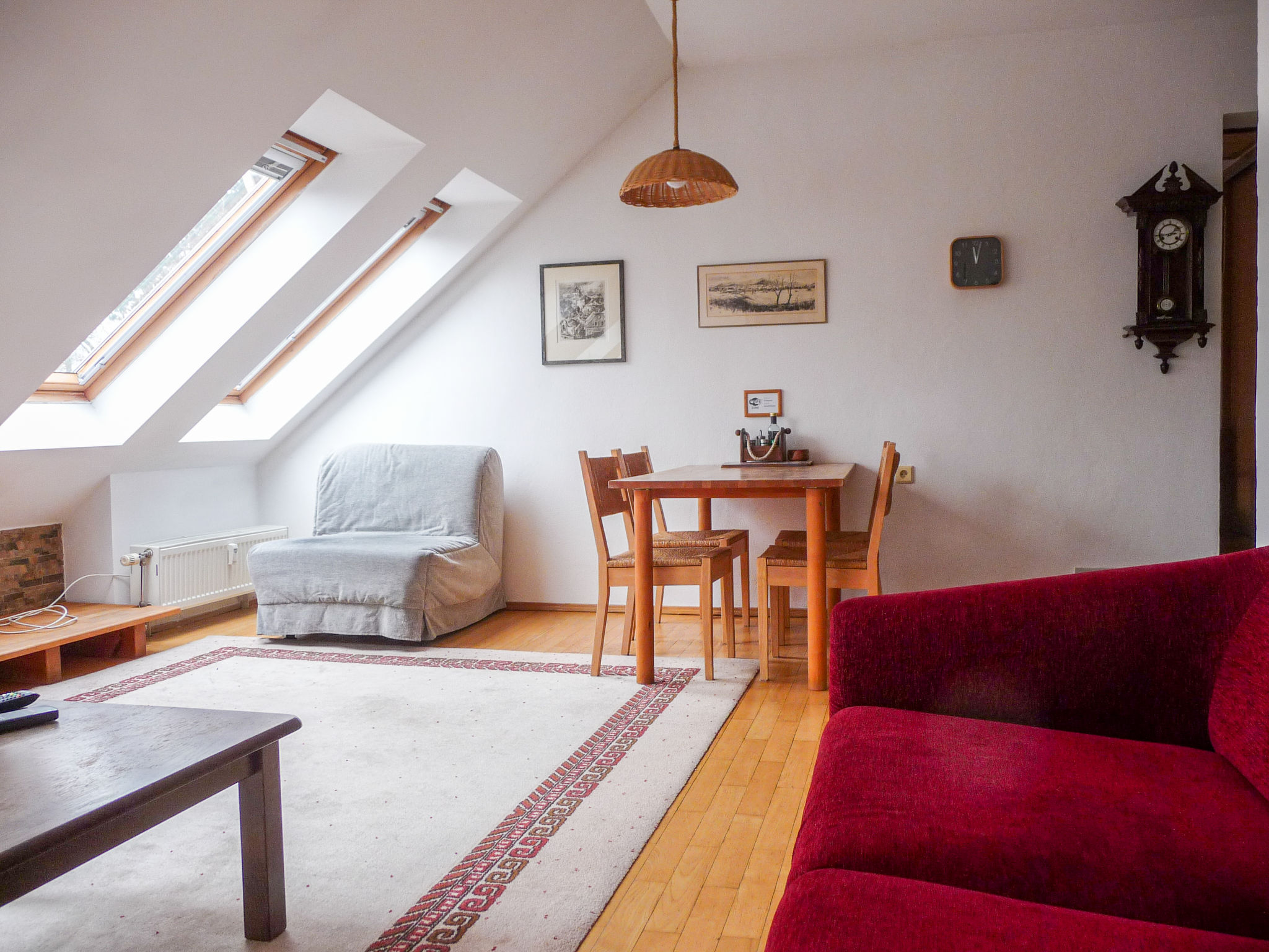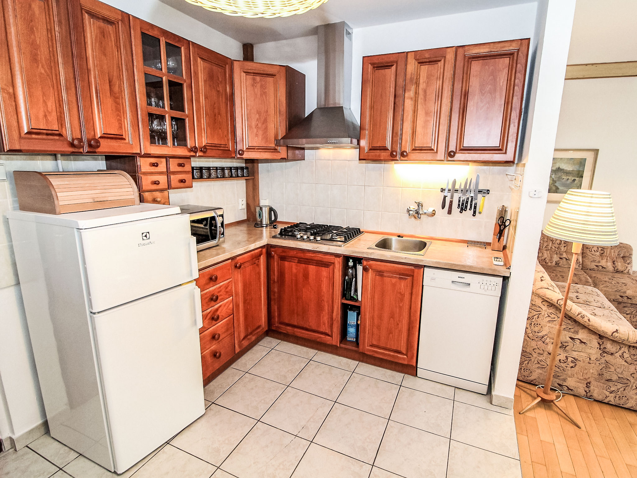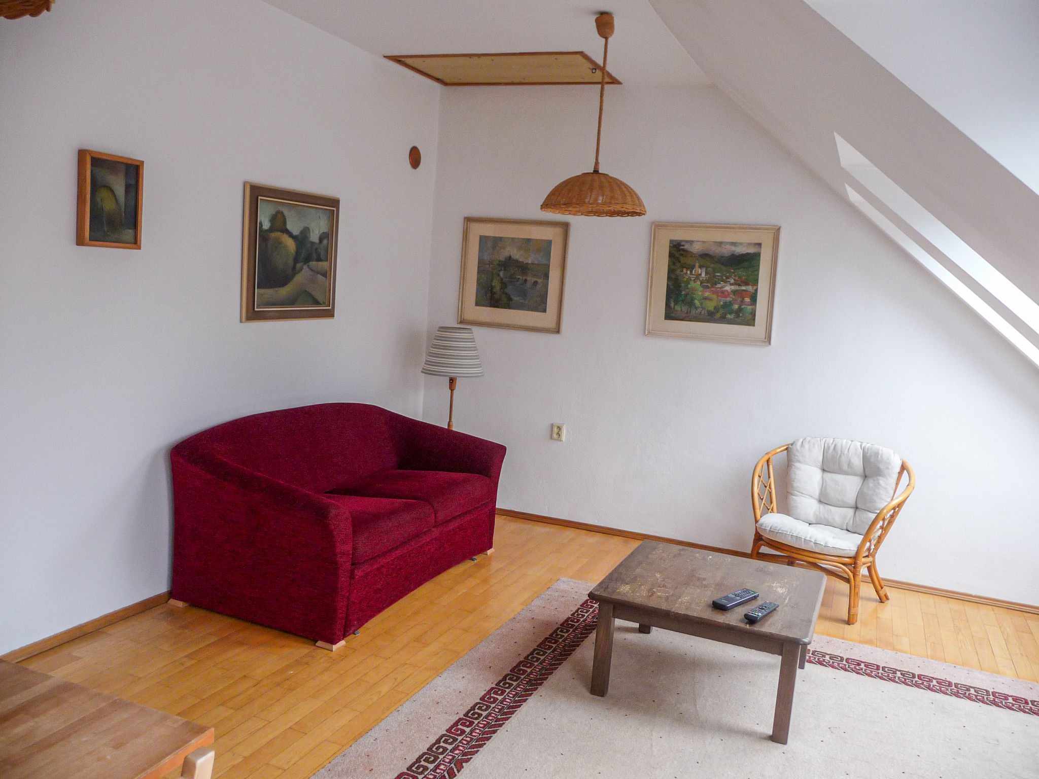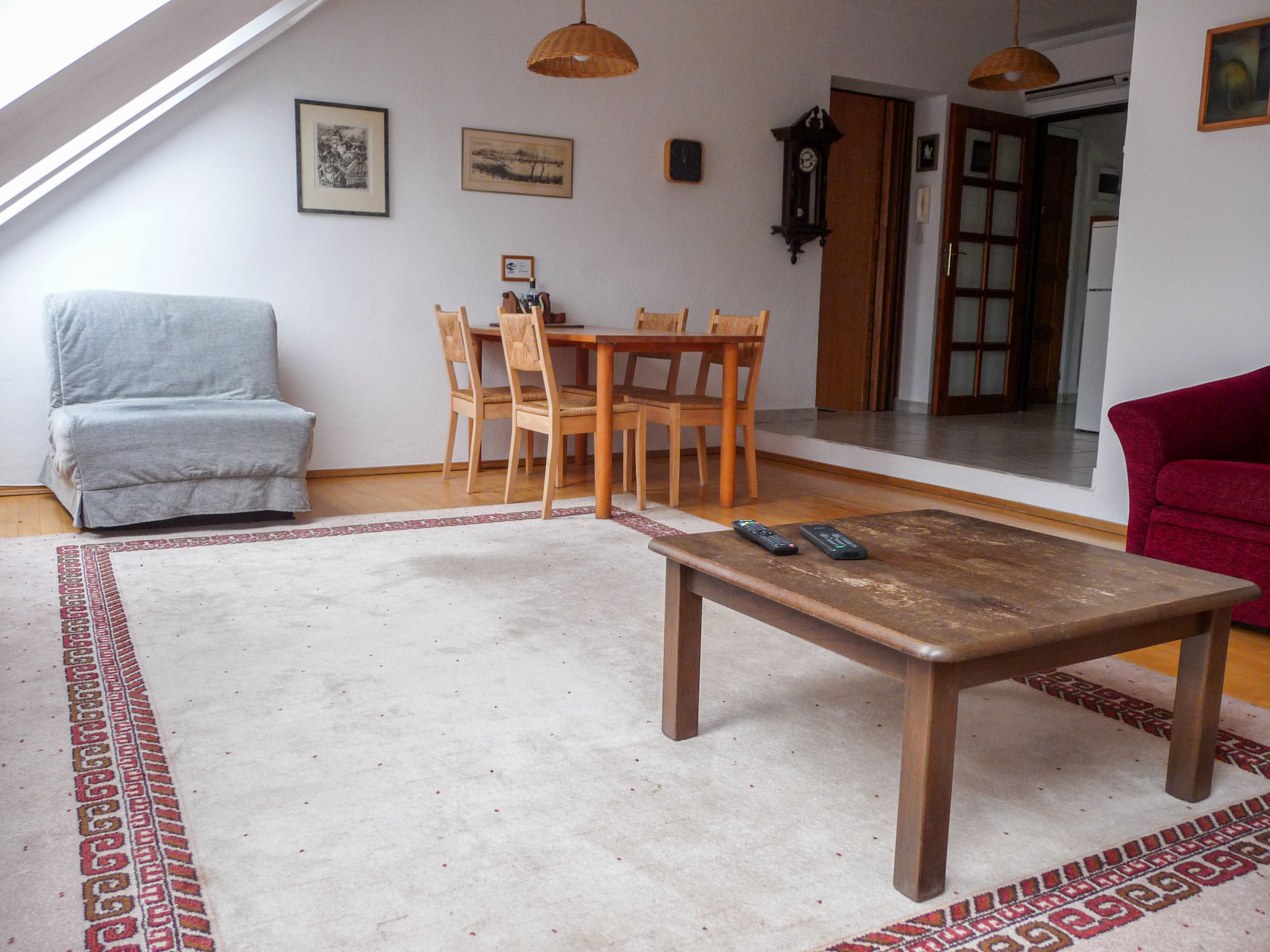 2-Zimmer-Attikawohnung 60 m2 im 2. Stock. Schön und gemütlich eingerichtet: abgeschrägtes, offenes Wohn-/Esszimmer 23 m2 mit 1 Doppeldiwanbett (160 cm, Länge 200 cm), Esstisch, Sat-TV, Video und Radio. 1 abgeschrägtes Zimmer 16 m2 mit Dachfenster mit 2 Betten (80 cm, Länge 200 cm), Klimaanlage. Offene Küche (Geschirrspüler, 4 Flammen, Wasserkocher, Mikrowelle, Tiefkühler, elektrische Kaffeemaschine). Bad/WC. E-Heizung. Balkon 4 m2, Südostlage. Terrassenmöbel. Sicht auf den Garten. Zur Verfügung: Waschmaschine, Bügeleisen. Internet (Wireless LAN, gratis).