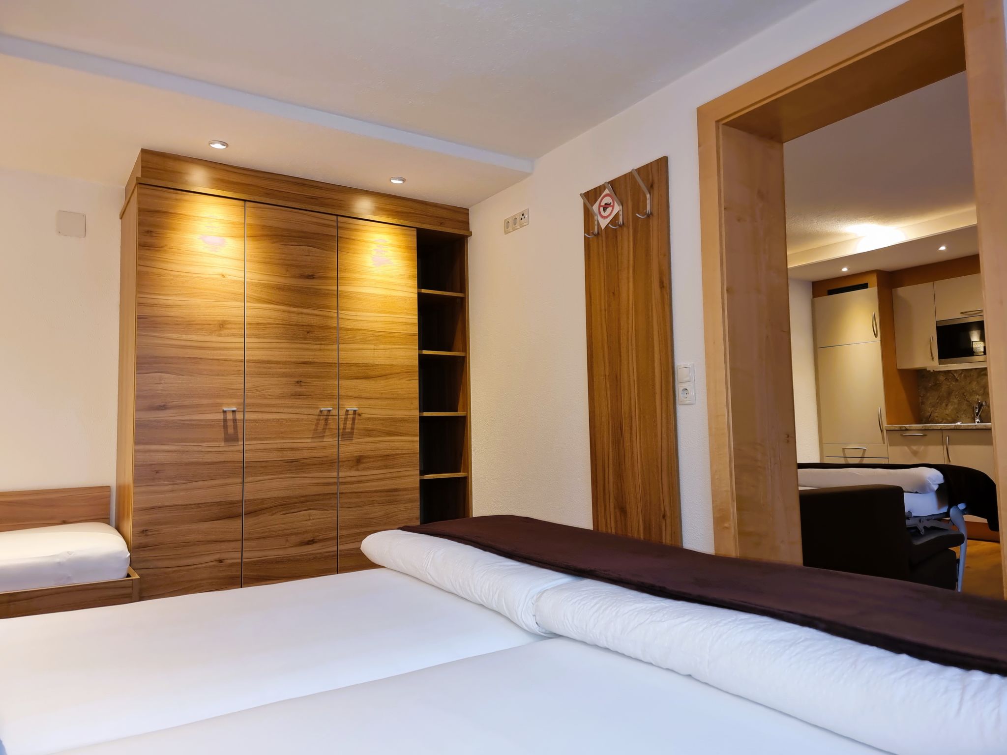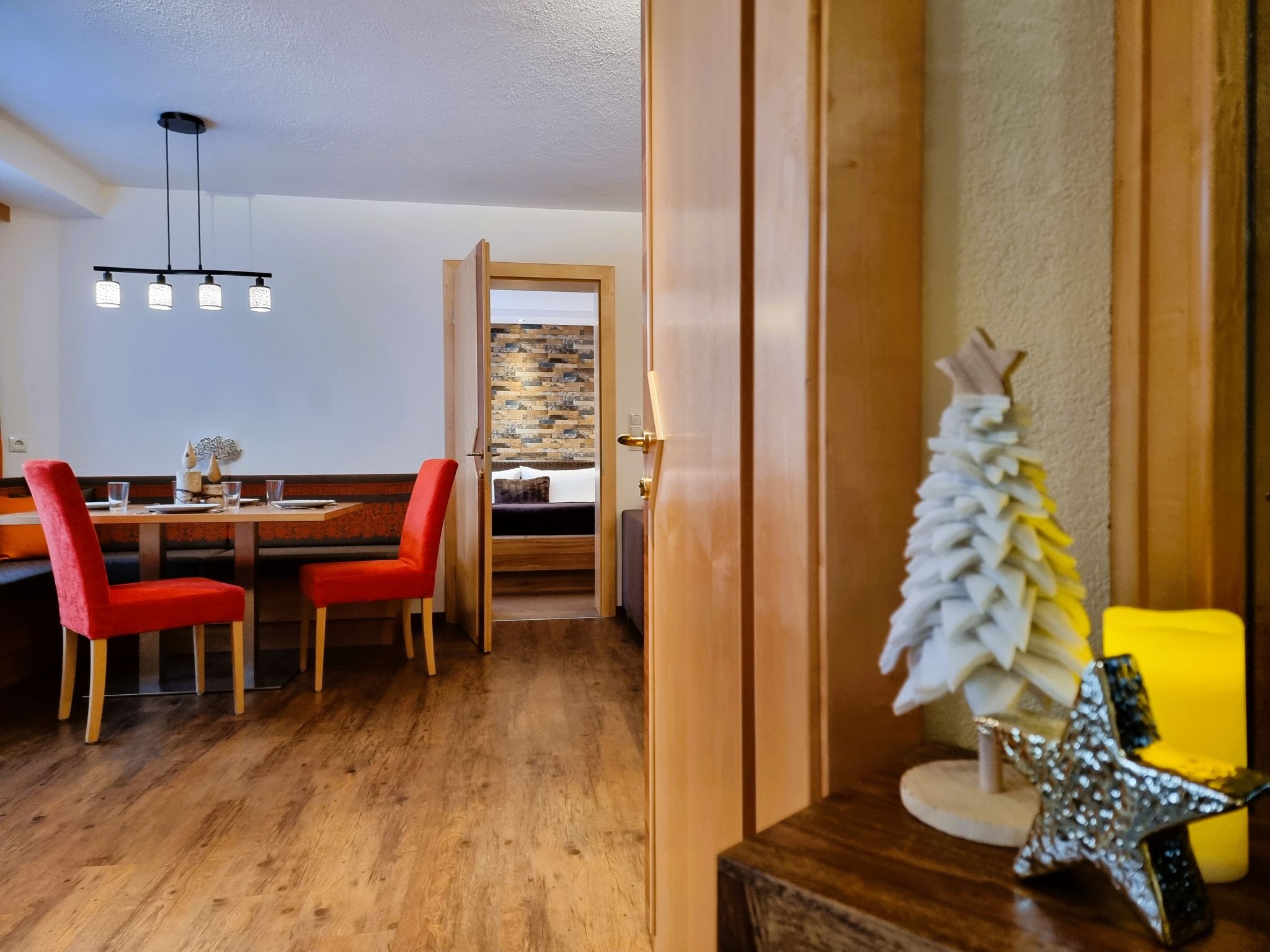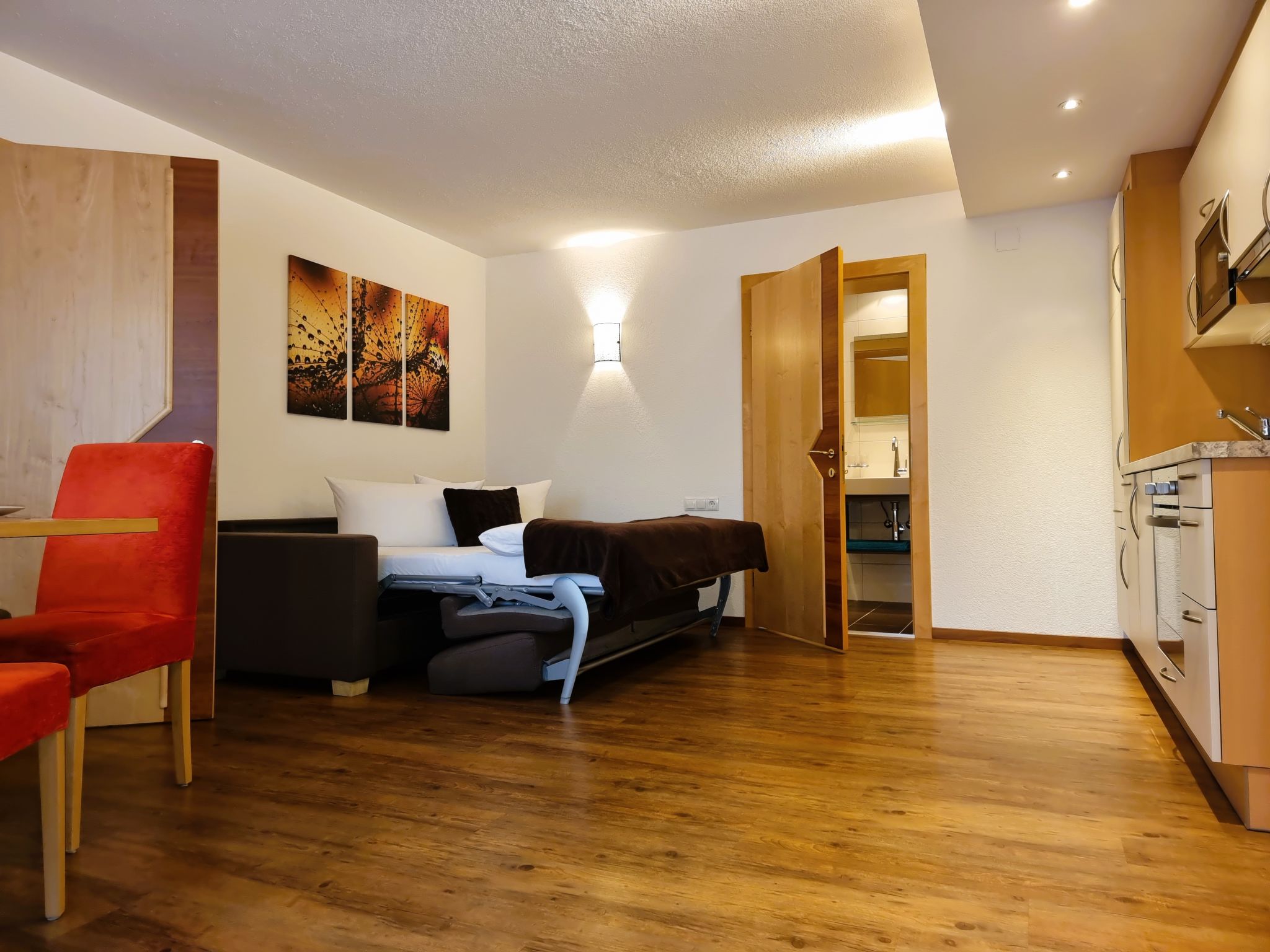 2-Zimmer-Wohnung, Erdgeschoss, ca. 50 m². Separater Eingang. Wohn-/Schlafraum mit Doppelbettcouch (1,60 m breit), Essplatz (Eckbank), Küchenzeile (4 Ceranfelder, Backofen, Mikrowelle, Geschirrspüler, Kühl-/Gefrierkombination, Kaffeemaschine, Toaster). Schlafzimmer mit Doppelbett und Einzelbett. Geräumiges Badezimmer mit Dusche/WC.