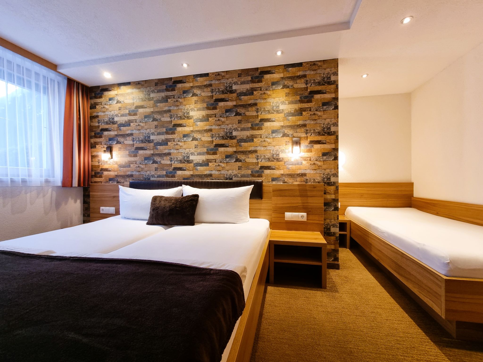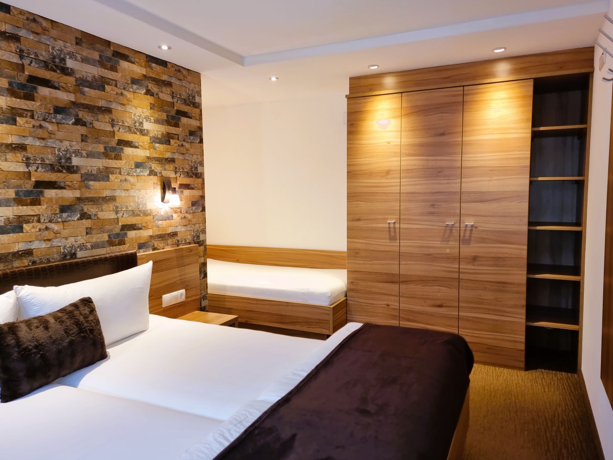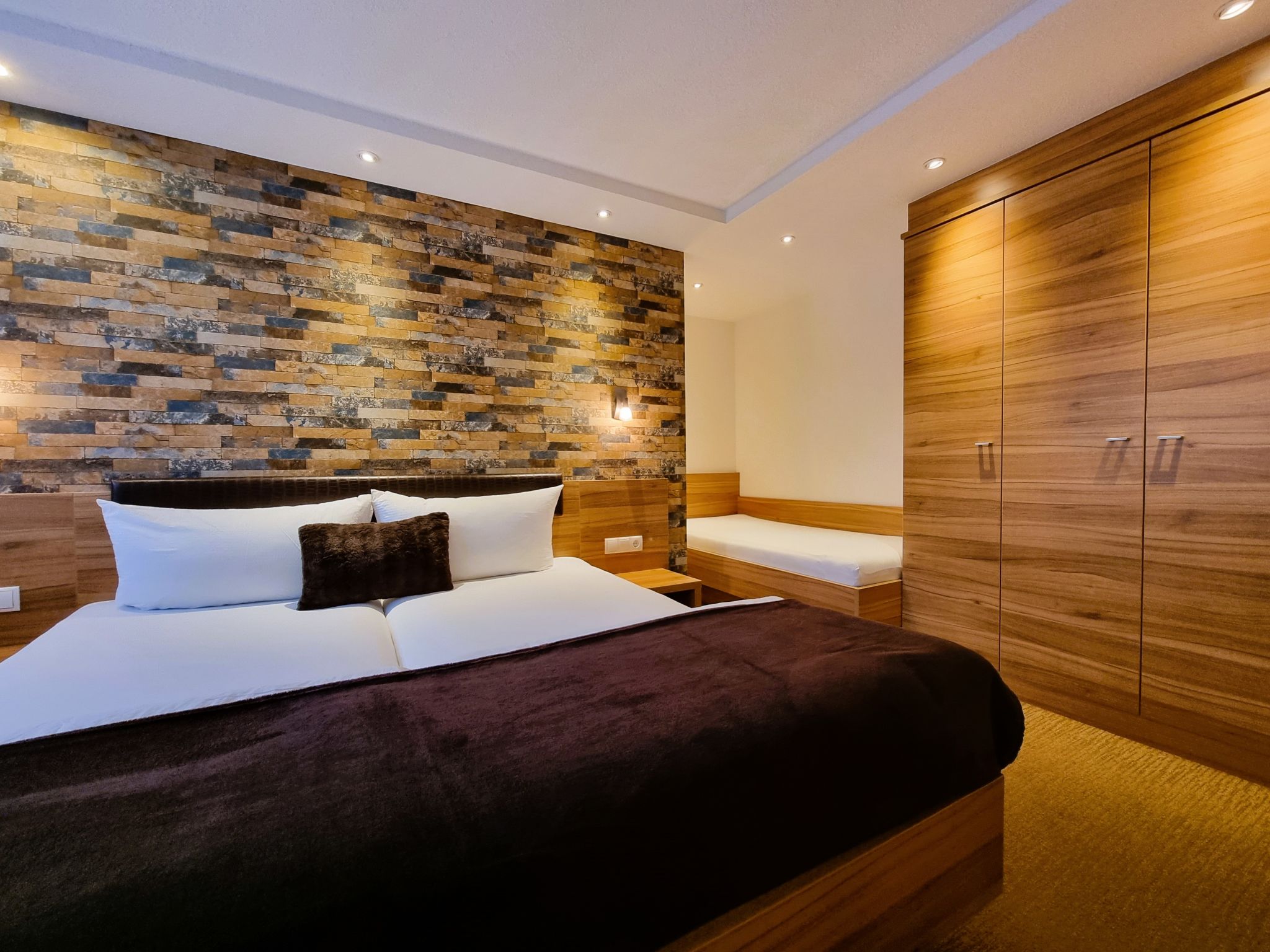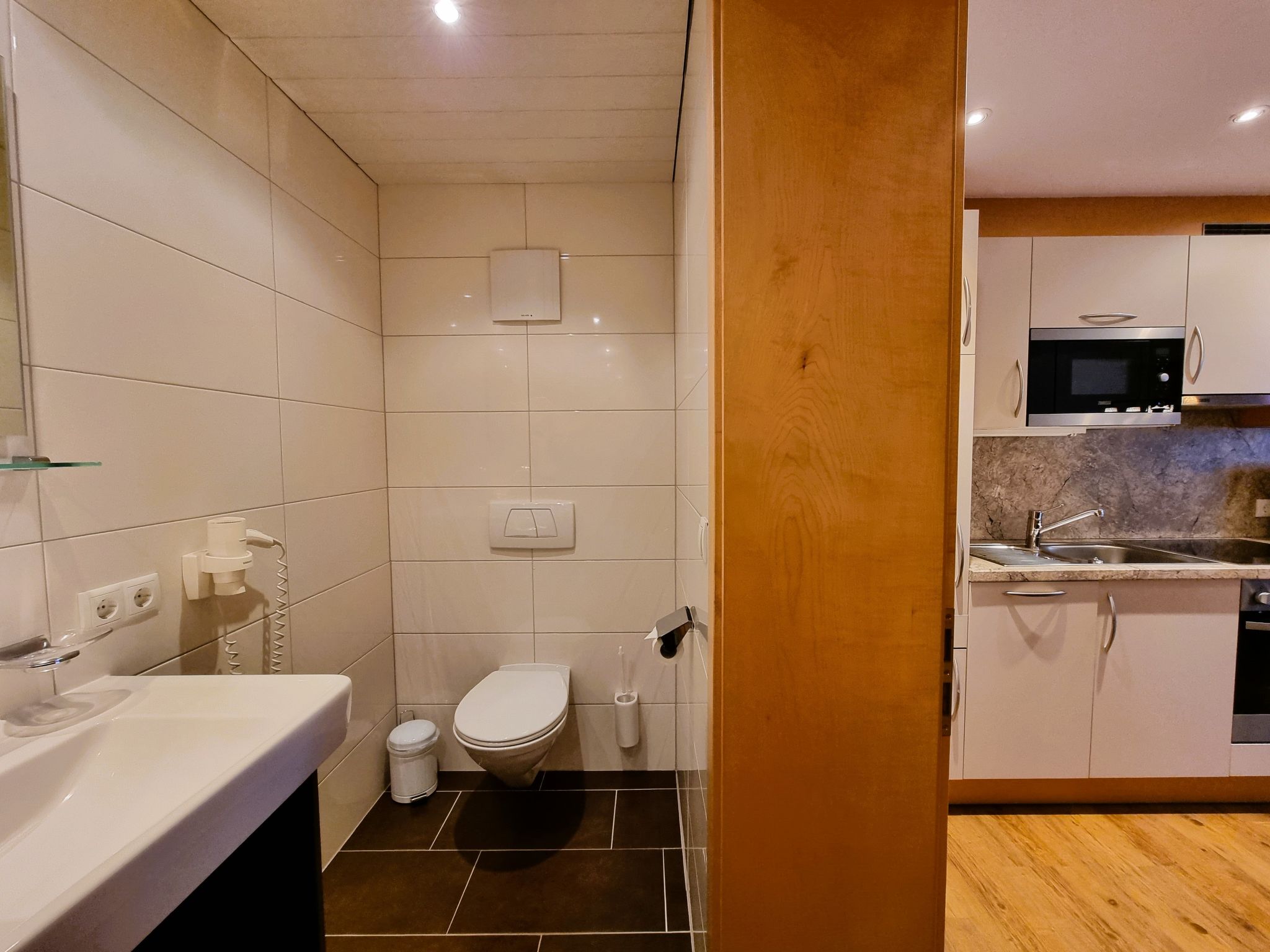 2-Zimmer-Wohnung, Erdgeschoss, ca. 50 m². Separater Eingang. Wohn-/Schlafraum mit Doppelbettcouch (1,60 m breit), Essplatz (Eckbank), Küchenzeile (4 Ceranfelder, Backofen, Mikrowelle, Geschirrspüler, Kühl-/Gefrierkombination, Kaffeemaschine, Toaster). Schlafzimmer mit Doppelbett und Einzelbett. Geräumiges Badezimmer mit Dusche/WC.