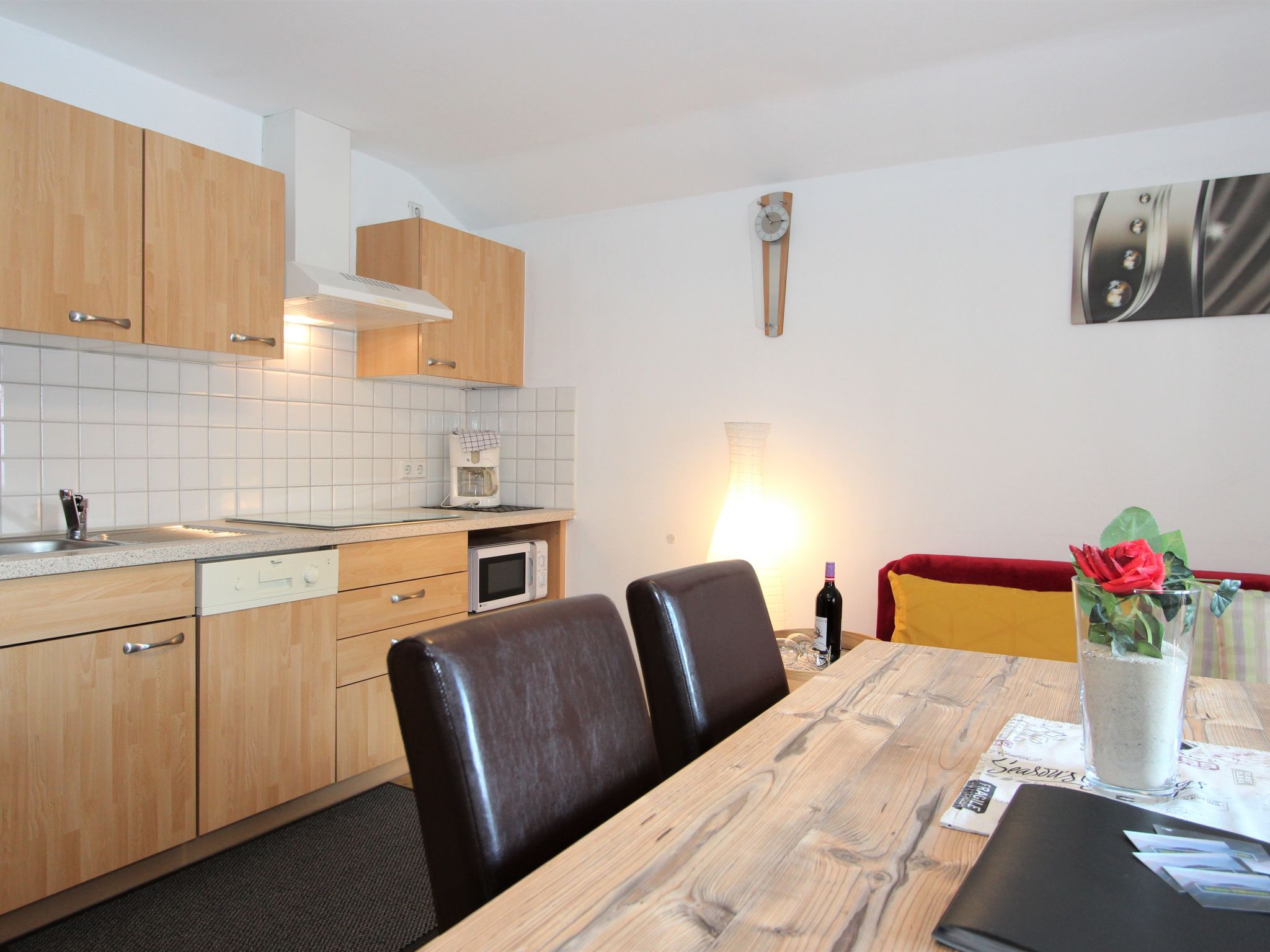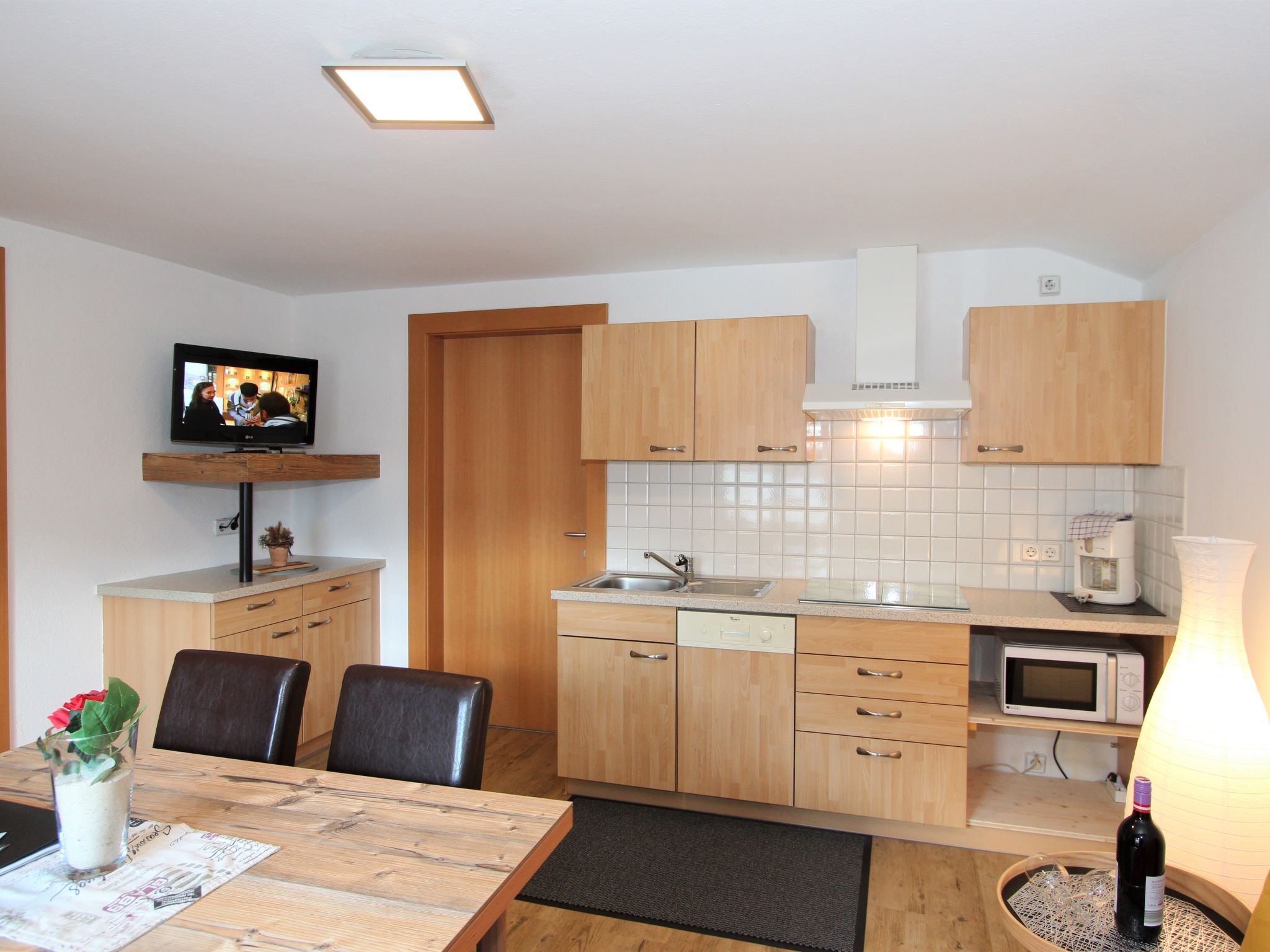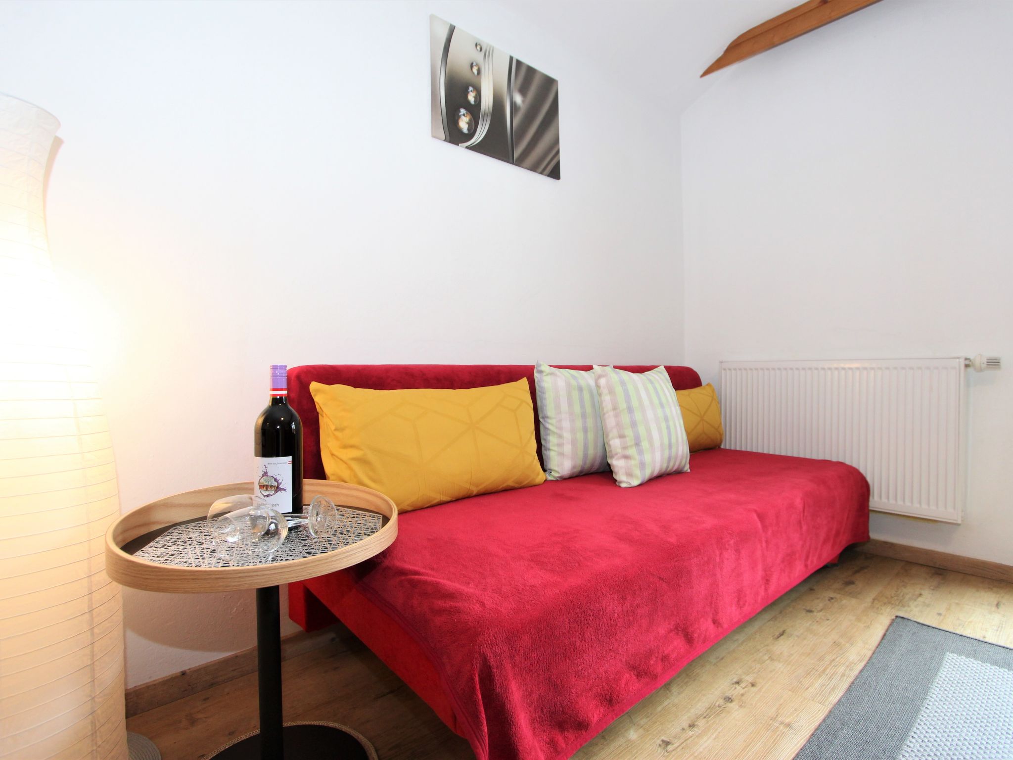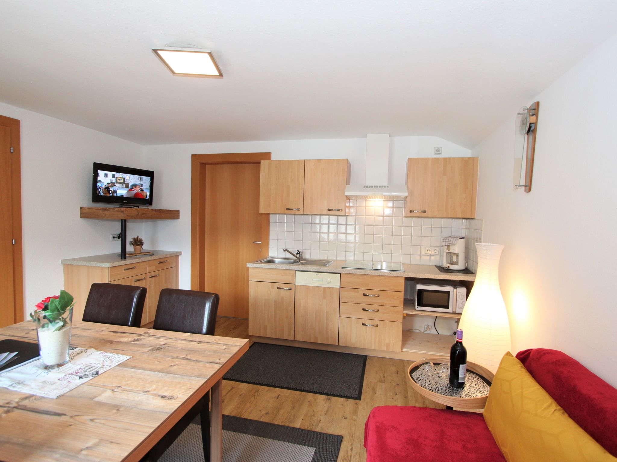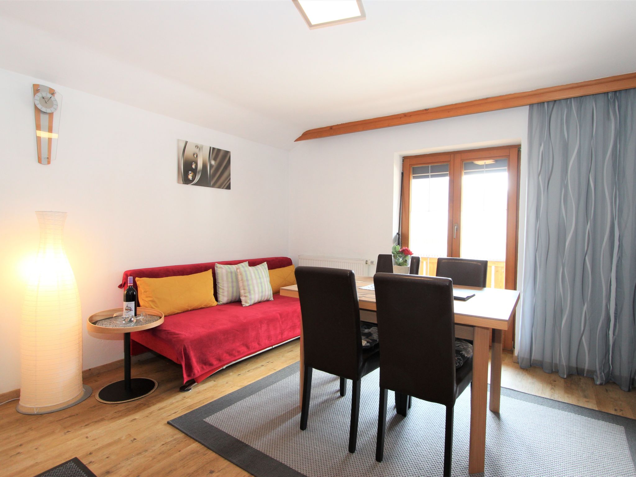 2-Zimmer-Wohnung 40 m2 im 2. Stock. Schön und gemütlich eingerichtet: 1 Zimmer mit 1 Doppeldiwanbett (160 cm, Länge 200 cm), 1 Doppelbett (180 cm, Länge 200 cm), sep. WC und Dusche. Ausgang zum Balkon. Wohn-/Esszimmer mit 1 Diwanbett, Esstisch und Sat-TV (Flachbildschirm). Offene Küche (Geschirrspüler, 4 Glaskeramikherd Platten, Mikrowelle). Balkon, Südlage. Balkonmöbel. Sehr schöne Sicht auf die Berge und die Ortschaft. Zur Verfügung: Internet (Wireless LAN).