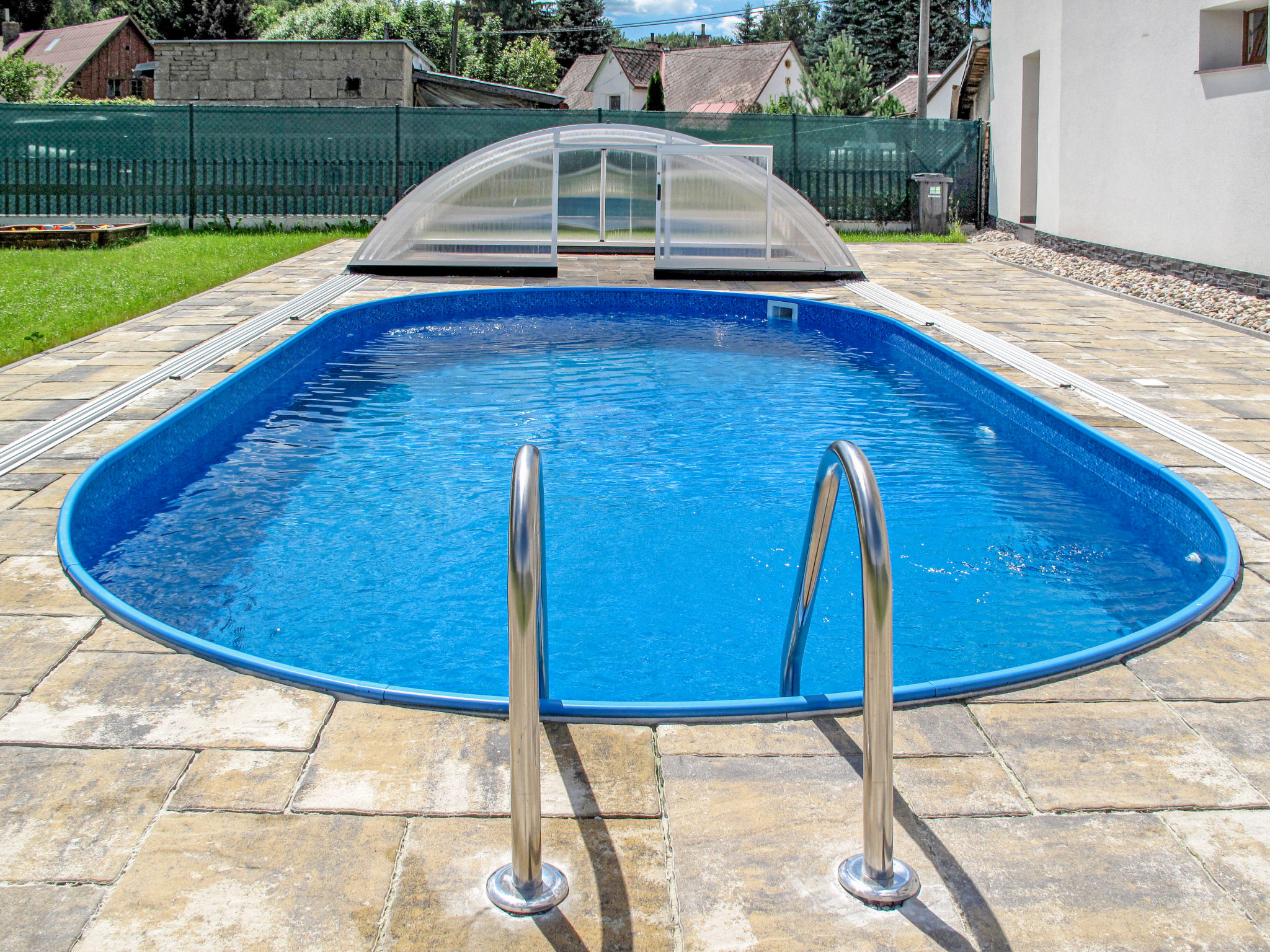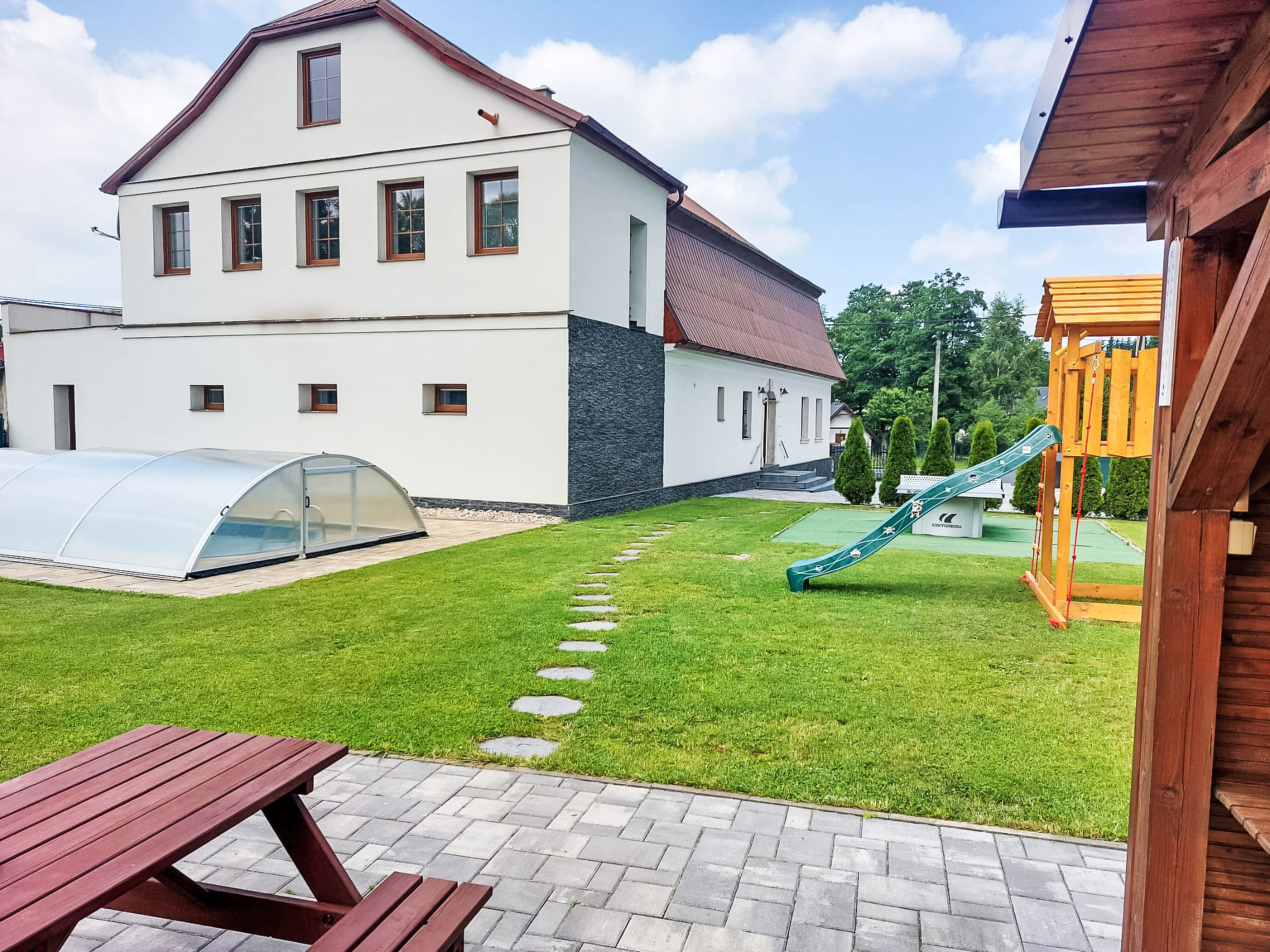 Moderner, schöner, alleinstehender Landsitz "IVA (OVH100)", 610 m.ü.M. im Jahre 2019. 300 m vom Zentrum von Olešnice v Orlických horách, 16 km vom Zentrum von Dobruška, Nové Město nad Metují, 22 km vom Zentrum von Náchod, zentrale Lage, 20 km vom See. Zur Alleinbenutzung: Grundstück 800 m2, Garten (eingezäunt), Schwimmbad (7 x 3 m, 140 cm tief, 02.05.-26.09.). Pergola, Gartenmöbel, Grill. Im Hause: Sauna, Sprudelbad, Tischtennis, Trampolin. Parkplatz (für 6 Autos) auf dem Grundstück. Einkaufsgeschäft 500 m, Supermarkt 16 km, Bushaltestelle "Olešnice v Orlických horách" 400 m, Bahnstation "Dobruška" 16 km, Grasstrand 20 km, Freibad 16 km, Hallenbad 16 km, Badesee "Broumar" 20 km. Wanderwege ab Haus, Radweg 50 m, Skilift, Sessellift, Skipisten, Skiverleih, Skischule 850 m, Langlaufloipe 500 m. Nahe gelegene Sehenswürdigkeiten: Nové Město nad Metují 16 km, Náchod 22 km, Teplice nad Metují, Adršpach 40 km, Hradec Králové 50 km. Bekannte Skigebiete sind gut erreichbar: Olešnice v Orlických horách 850 m, Deštné v Orlických horách 10 km. Bekannte Seen in der Umgebung sind gut erreichbar: Broumar 20 km, Rozkoš 29 km.