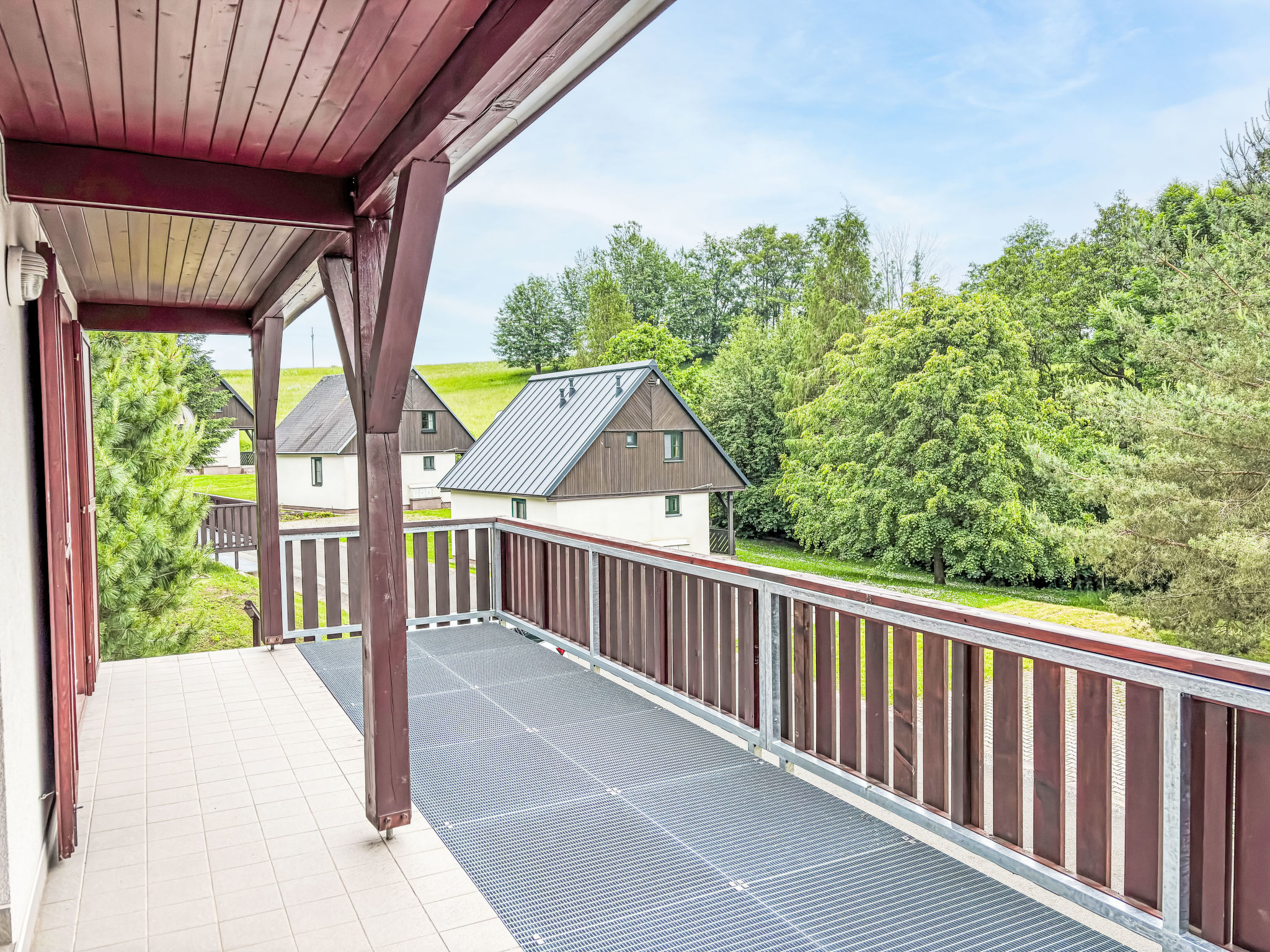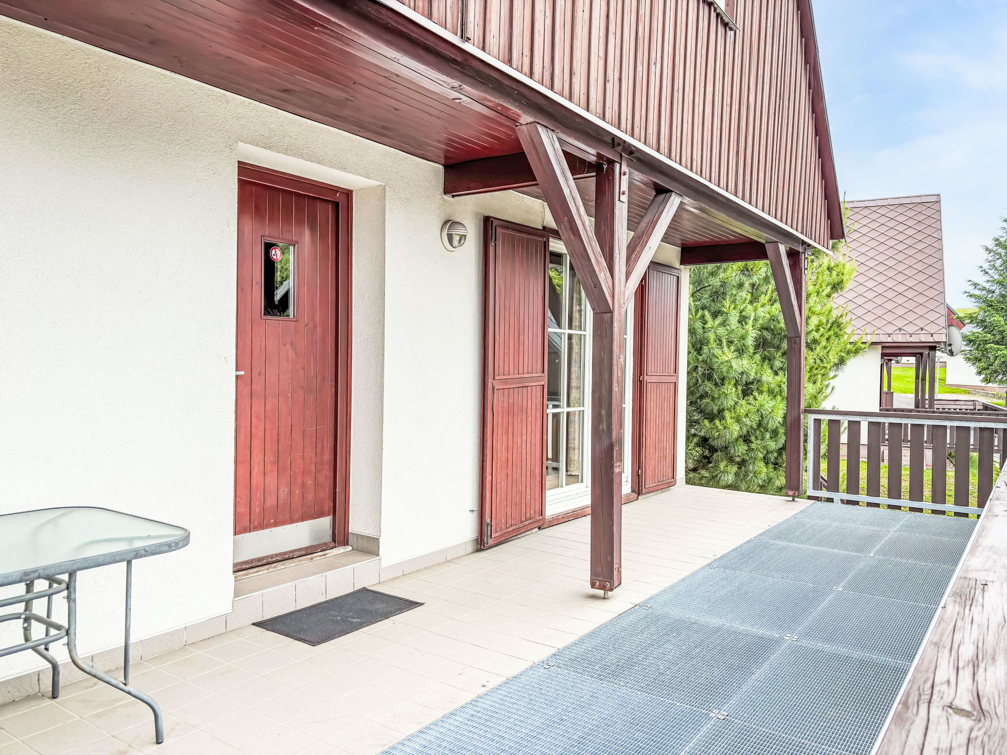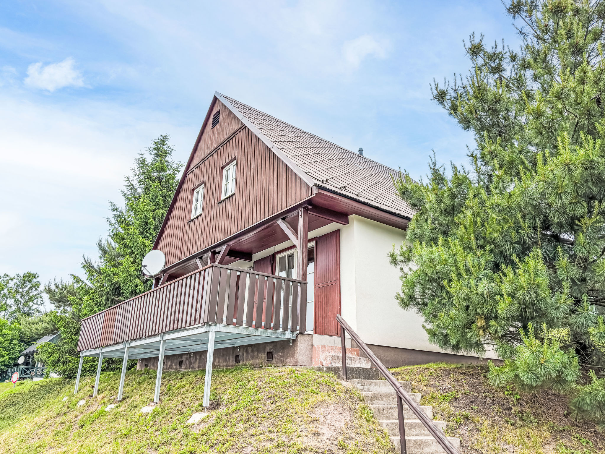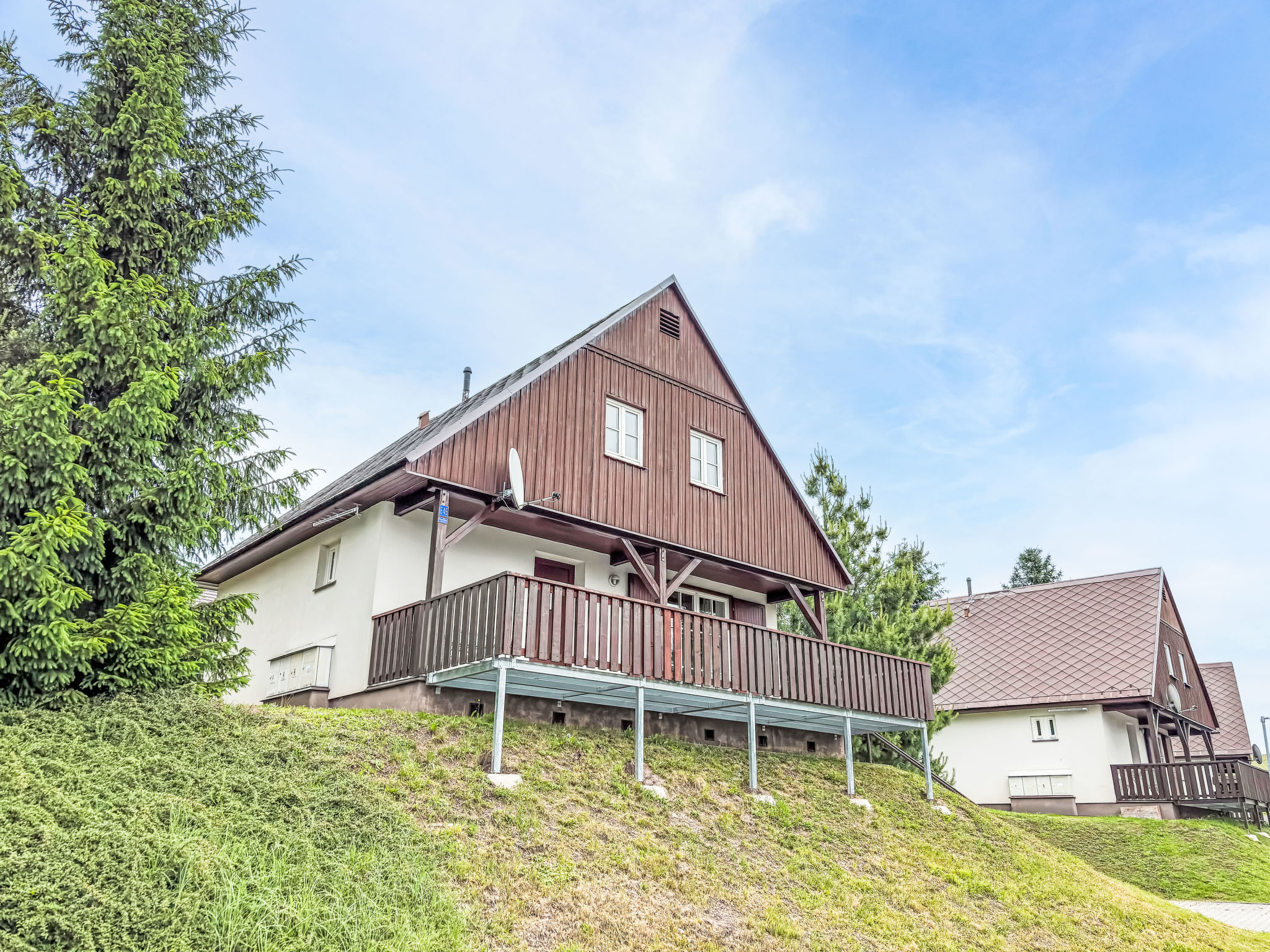 Čistá v Krkonoších 2 km von Černý Důl: Kinderfreundliches, schönes, komfortables Feriendorf "Holiday Hill", 500 m.ü.M., umgeben von Bäumen und Wiesen. 43 Häuser im Ferienresort. Am Ortsrand, alleinstehende, ruhige, sonnige Lage, 1.5 km vom See, 3 km vom Skigebiet, im Grünen. Zur Mitbenutzung: Grundstück 6 ha, Wiese, Schwimmbad beheizt (9 x 4 m, 120 cm tief, saisonale Verfügbarkeit: 01.Jun.-26.Sep. Öffnungszeiten Schwimmbad: 09:00-20:00). Dusche/WC im Poolbereich, Tischtennis, Kinderspielplatz (Schaukel, Sandkasten). In der Anlage: Empfang. Parkplatz (für 2 Autos) beim Haus. Einkaufsgeschäft 2.5 km, Lebensmittelgeschäft 2.5 km, Supermarkt 7.5 km, Restaurant 1.6 km, Biergarten 400 m, Bushaltestelle "Černý Důl, Čistá-pošta" 400 m, Sandstrand 1.5 km (klein), Hallenbad 19 km. Golfplatz (18 Loch) 14 km, Tennis 2.5 km, Sportzentrum 2.5 km, Wanderwege ab Haus, Radweg 100 m, Skilift 3 km, Sessellift 3 km, Skipisten 3 km, Skibushaltestelle 100 m, Skischule 3 km, Kinderskischule 3 km, Schlittelbahn 7 km, Langlaufloipe 100 m. Nahe gelegene Sehenswürdigkeiten: Janské Lázně Spa 9 km, Vrchlabí 10 km, Aquapark Trutnov 25 km, Zoo Safari Dvůr Králové 29 km, Bozkovské jeskyně 37 km, Adršpašské skály 44 km. Bekannte Skigebiete sind gut erreichbar: Černý Důl 3 km, Herlíkovice 15 km, Pec pod Sněžkou 22 km. Bekannte Seen in der Umgebung sind gut erreichbar: Čistá 1.5 km, Vrchlabí 9 km. Wandergebiete: Sněžka 25 km.