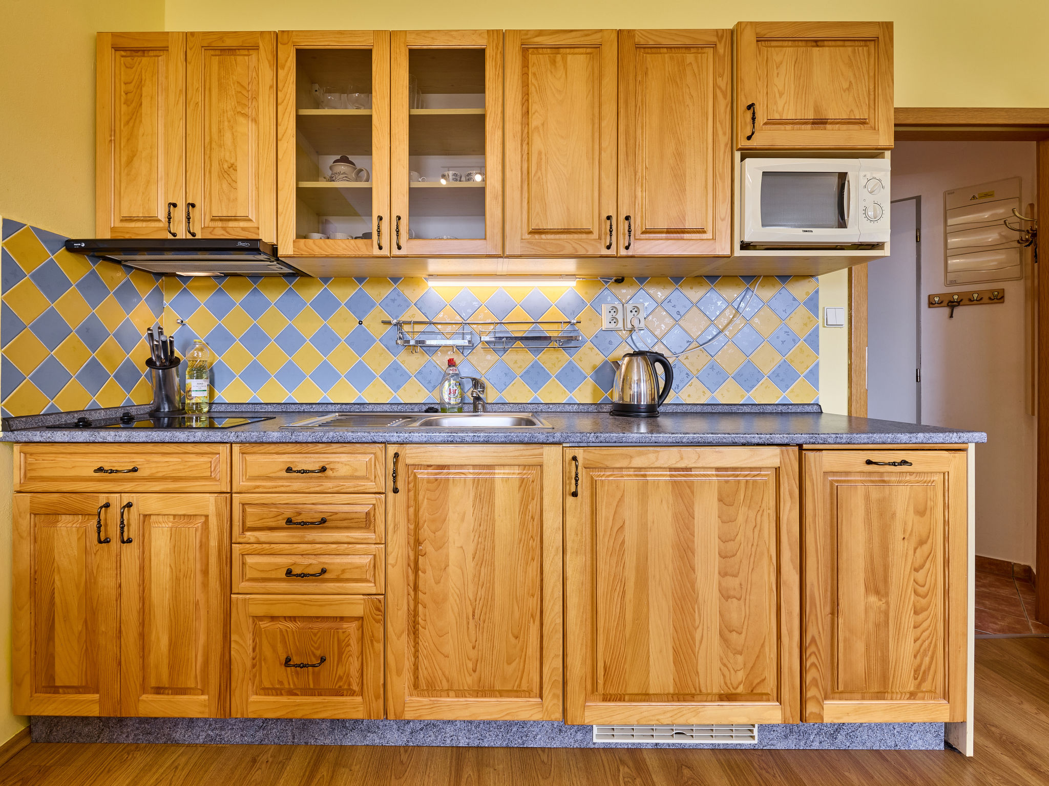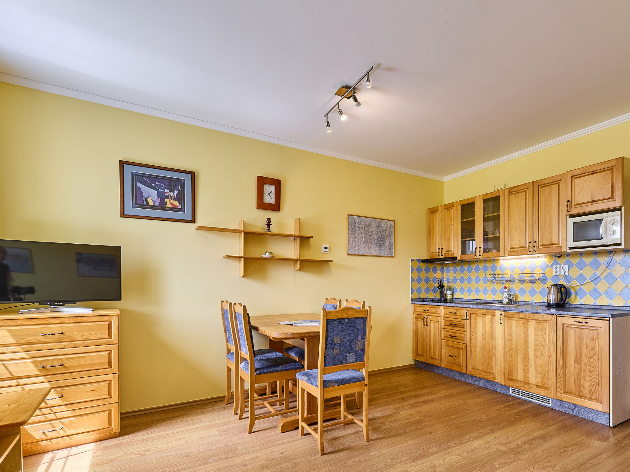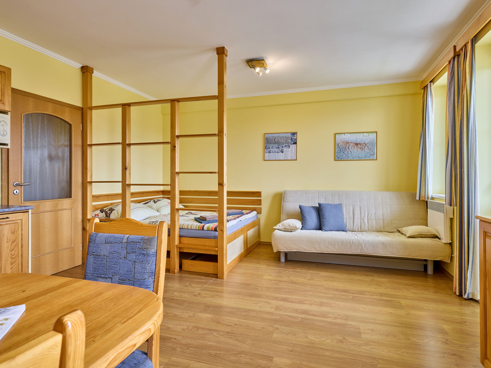 "Horní Mísečky (HMS110)", 1-Zimmer-Wohnung 35 m2, im Erdgeschoss. Komfortabel und gemütlich eingerichtet: Wohn-/Schlafzimmer mit 1 Doppeldiwanbett, 1 Doppelbett, Esstisch, Sat-TV und Internationale TV-Sender. Ausgang zum Balkon. Offene Küche (Geschirrspüler, 2 Glaskeramikherd Platten, Toaster, Wasserkocher, Mikrowelle, elektrische Kaffeemaschine, Kapseln für die Kaffeemaschine (Nespresso) extra). Dusche/WC. E-Heizung. Balkon. Zur Verfügung: Internet (Wireless LAN, gratis). Parkplatz (überdacht). Bitte beachten: Nichtraucher-Unterkunft.