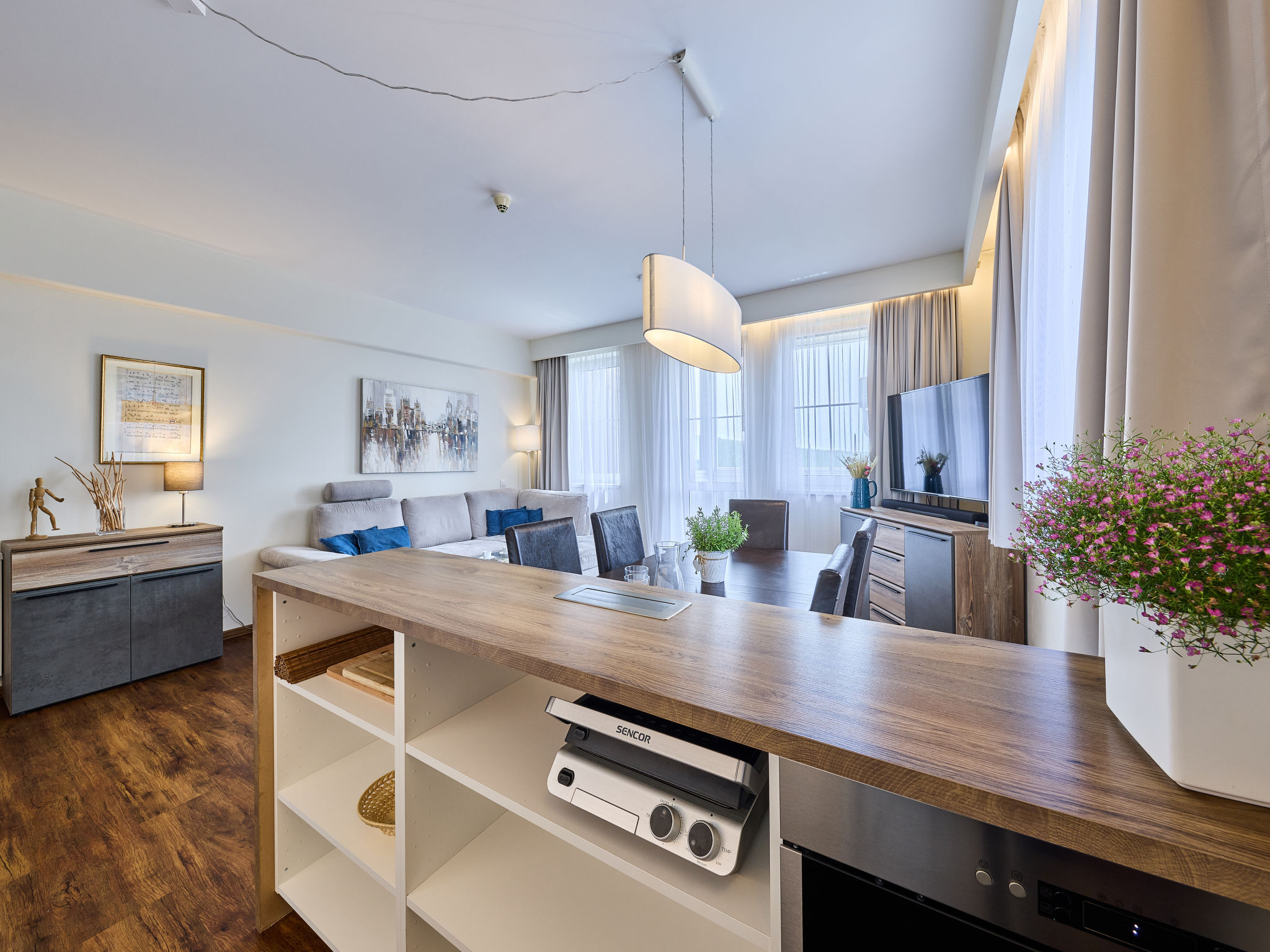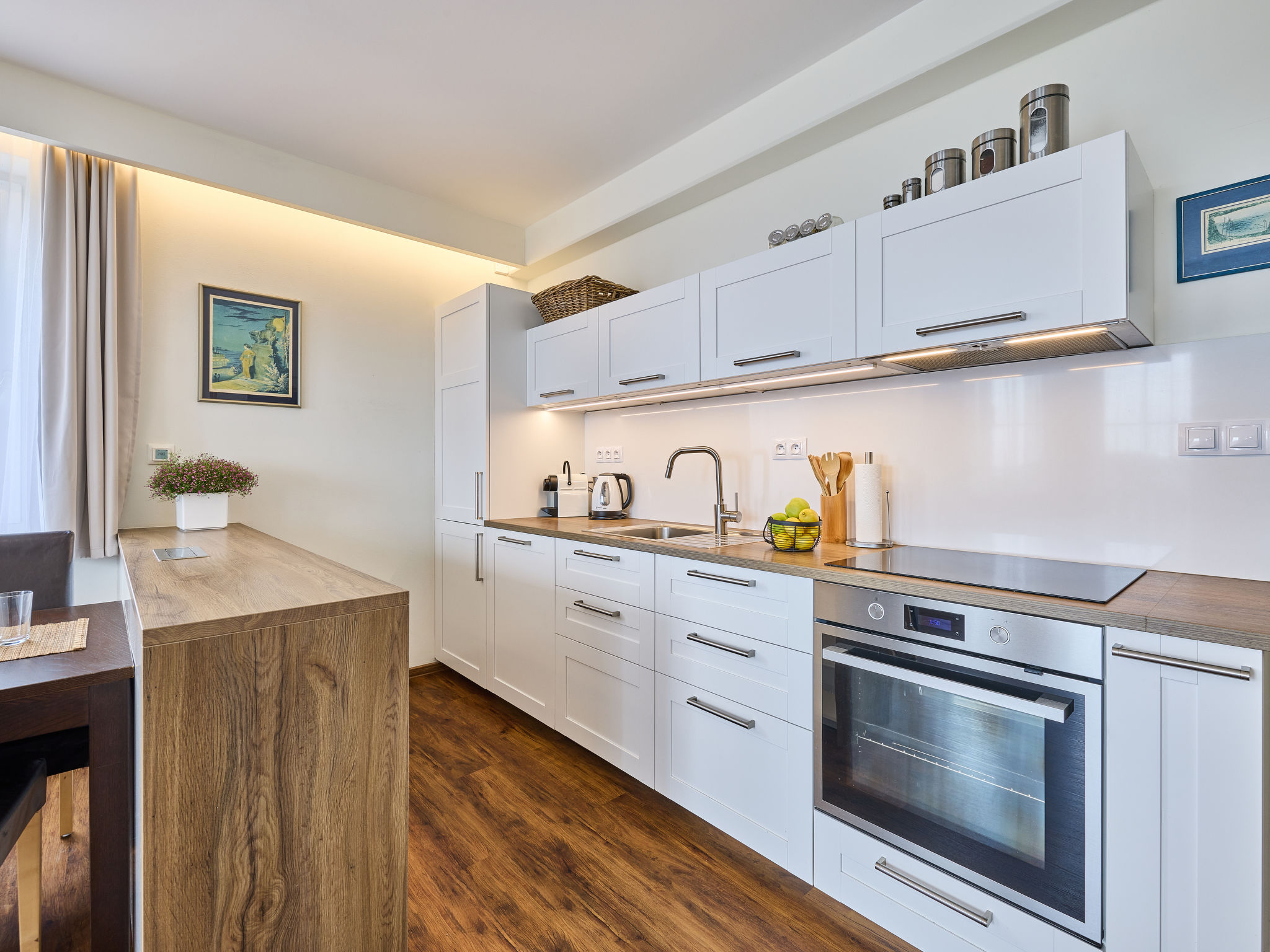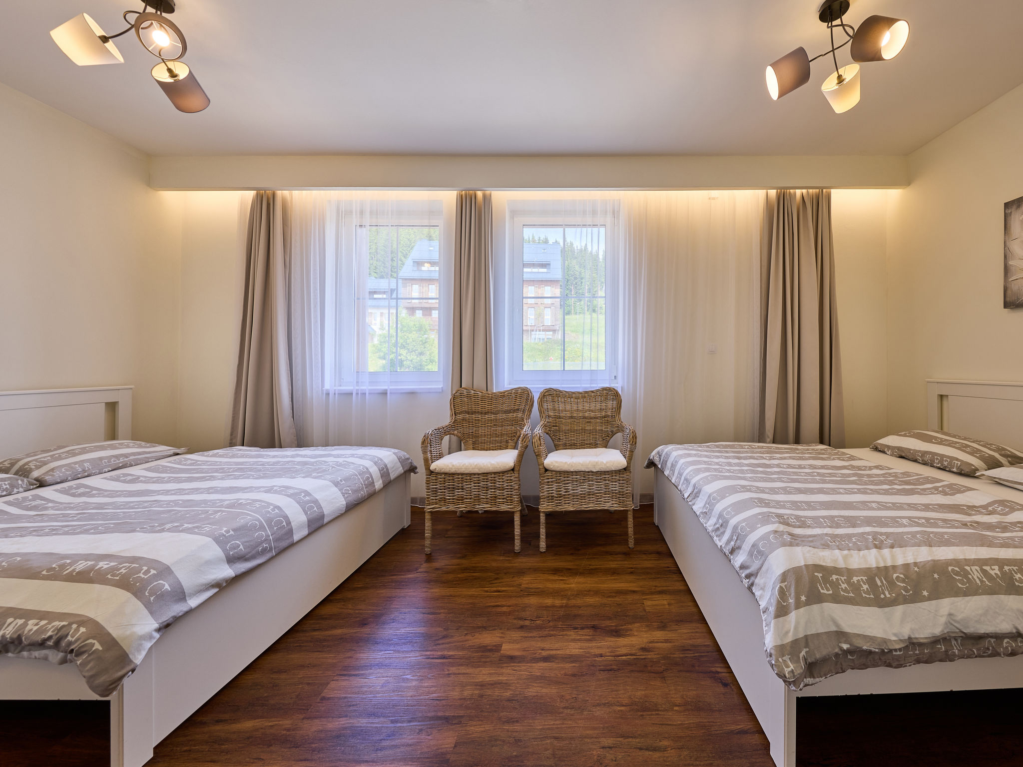 "Horní Mísečky (HMS130)", 2-Zimmer-Wohnung 54 m2 im 2. Stock. Renoviert im Jahre 2018, modern eingerichtet: Wohn-/Schlafzimmer mit 1 Diwanbett, Esstisch und Sat-TV. 1 Zimmer mit 2 Doppelbetten (160 cm). Kochnische (Backofen, Geschirrspüler, 4 Glaskeramikherd Platten, Toaster, Wasserkocher, Mikrowelle, Tiefkühler, elektrische Kaffeemaschine). Dusche/WC. Balkon. Balkonmöbel. Zur Verfügung: Waschmaschine. Internet (Wireless LAN, gratis). Parkplatz (überdacht). Bitte beachten: Nichtraucher-Unterkunft.
