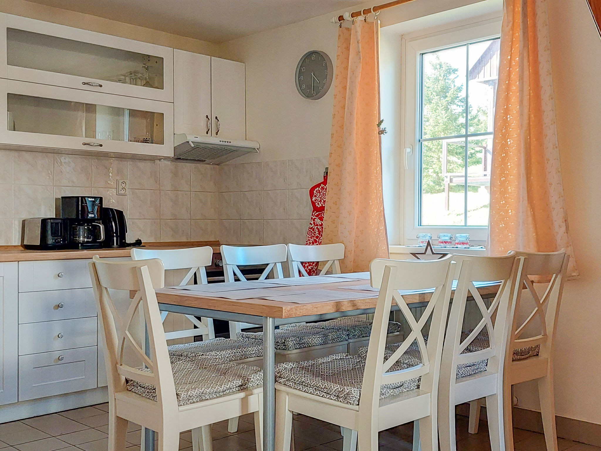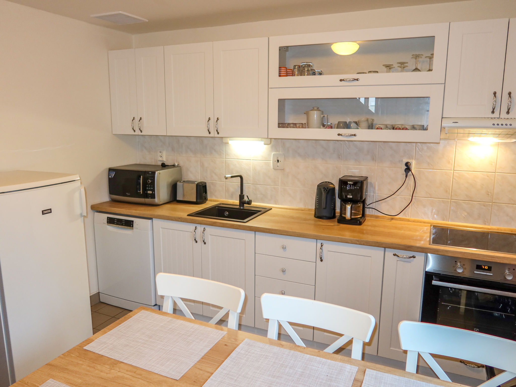 4-Zimmer-Haus 100 m2 auf 2 Stockwerken. Hell, komfortabel und gemütlich eingerichtet: offenes Wohnzimmer mit Sat-TV. Ausgang zur Terrasse. Küche (4 Kochplatten, Wasserkocher, Mikrowelle, Tiefkühler) mit Esstisch. Sep. WC. Obergeschoss: 3 Zimmer, jedes Zimmer mit 2 Betten. Bad/WC. Kleine Terrasse. Terrassenmöbel. Zur Verfügung: Waschmaschine, Babybett. Internet (Wireless LAN, gratis). Bitte beachten: geeignet für Familien. Nichtraucher-Haus. 2 Haustiere/Hunde erlaubt.