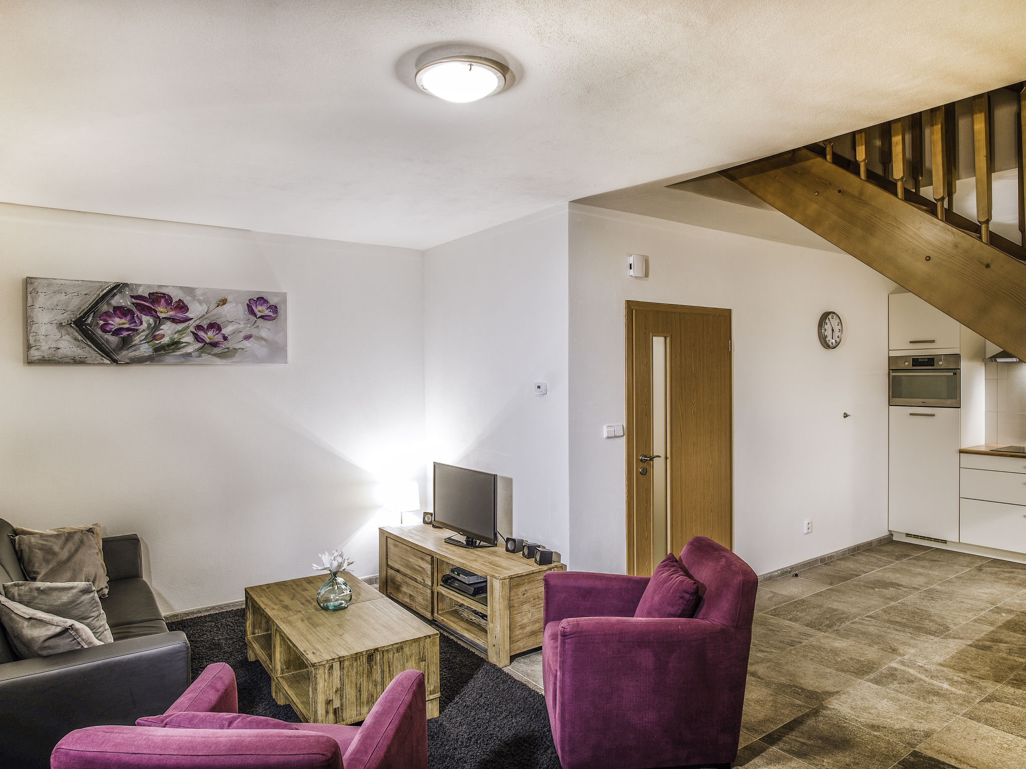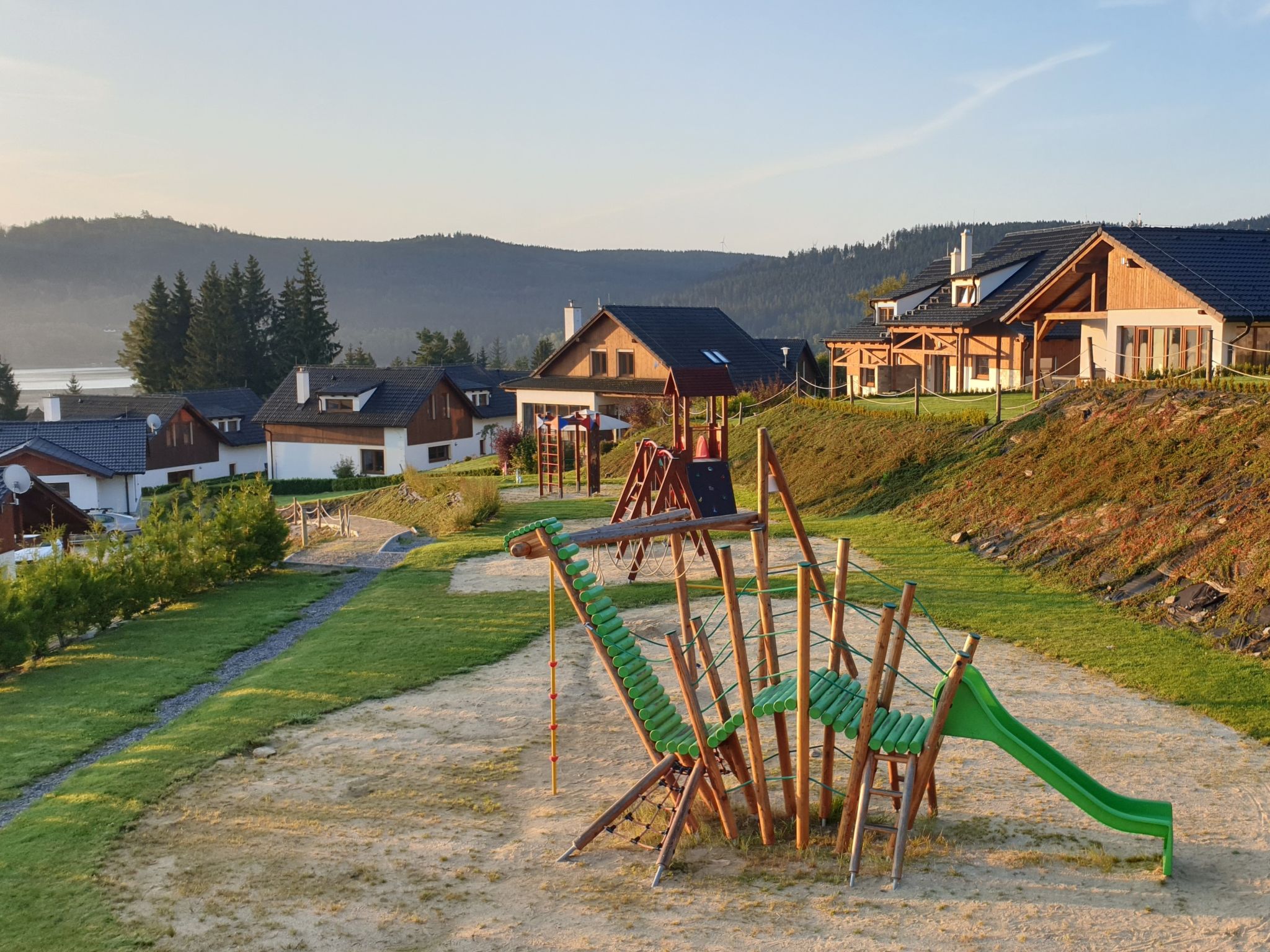 Kinderfreundliches, modernes Feriendorf "Residence Lipno". 40 Häuser im Ferienresort. Am Ortsrand, 1.5 km vom Zentrum von Lipno nad Vltavou, sonnige, erhöhte Lage, 250 m vom See, 2 km vom Skigebiet. Zur Mitbenutzung: Grundstück. Kinderspielplatz (Rutschbahn, Schaukel). Zur Alleinbenutzung: Garten. Terrasse, Gartenmöbel. In der Anlage: Empfang, Einstellraum für Fahrräder, Waschmaschine, Wäschetrockner (zur Mitbenutzung, extra). Parkplatz beim Haus. Lebensmittelgeschäft 1.2 km, Restaurant 200 m, Grasstrand 250 m, Hallenbad 2 km. Sporthafen 1.5 km, Wanderwege ab Haus 10 m, Radweg 200 m, Sessellift 2 km, Skisportanlagen 2 km, Skibushaltestelle 200 m, Skischule 2 km. Nahe gelegene Sehenswürdigkeiten: Aquaworld Lipno 2 km, Hopsárium 2 km, Bobová dráha 2.5 km, Stezka korunami stromů 3.5 km, Království Lesa 3.5 km. Bekannte Skigebiete sind gut erreichbar: Skiareál Lipno 2 km. Alle Häuser/Wohnungen sind individuell eingerichtet. Marina Lipno (1,5 km) mit Yachthafen und Indoor-Wasserwelt (nicht in Betrieb vom 1.11.-30.11.). Golfplatz und Sessellift zum Skizentrum Kramolin 1 km (5 Skipisten, Snowboardpark, 50 km Langlaufloipen). Yacht-, Ski- und Fahrradverleih.
