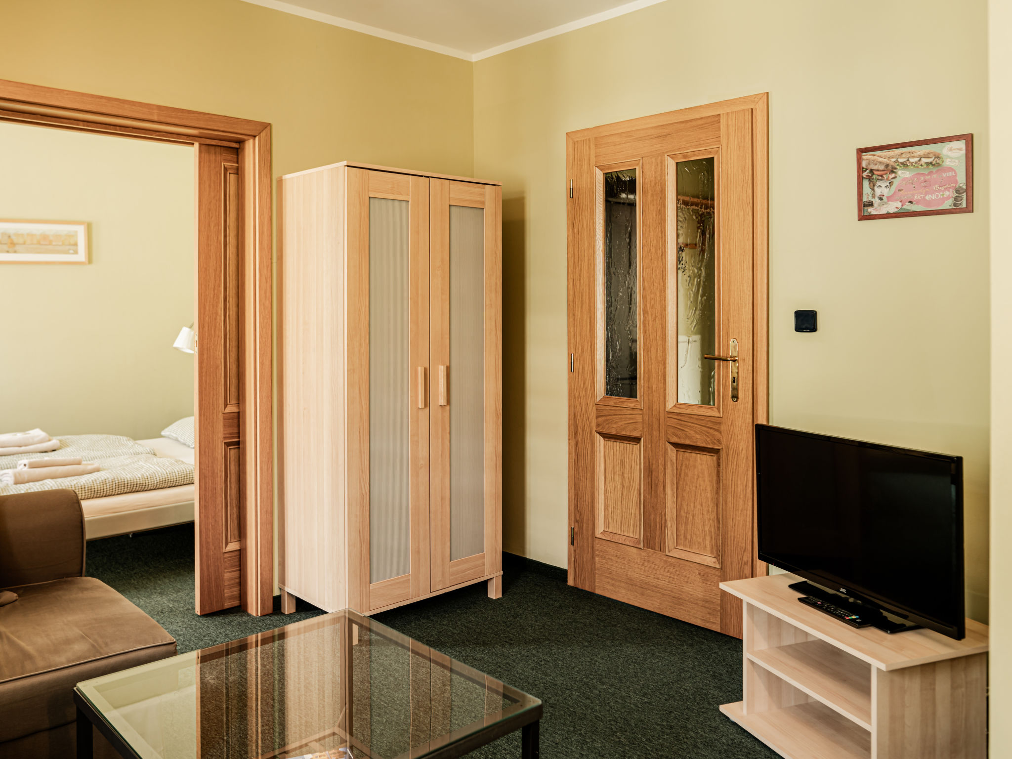 "Chopin", 3-Zimmer-Wohnung 47 m2 im 2. Stock. Schön und gemütlich eingerichtet: Wohn-/Schlafzimmer mit 1 Ausziehbett (2 Pers.), Esstisch und Sat-TV. 2 Zimmer, jedes Zimmer mit 1 Doppelbett. Kochnische (2 Kochplatten, Wasserkocher, Mikrowelle, Tiefkühler). Dusche/WC. Sehr schöne Sicht auf den Garten. Zur Verfügung: Internet (Wireless LAN, gratis). Parkplatz (eingezäunt) beim Haus. Bitte beachten: Nichtraucher-Unterkunft. Maximal 1 Haustier/Hund erlaubt.