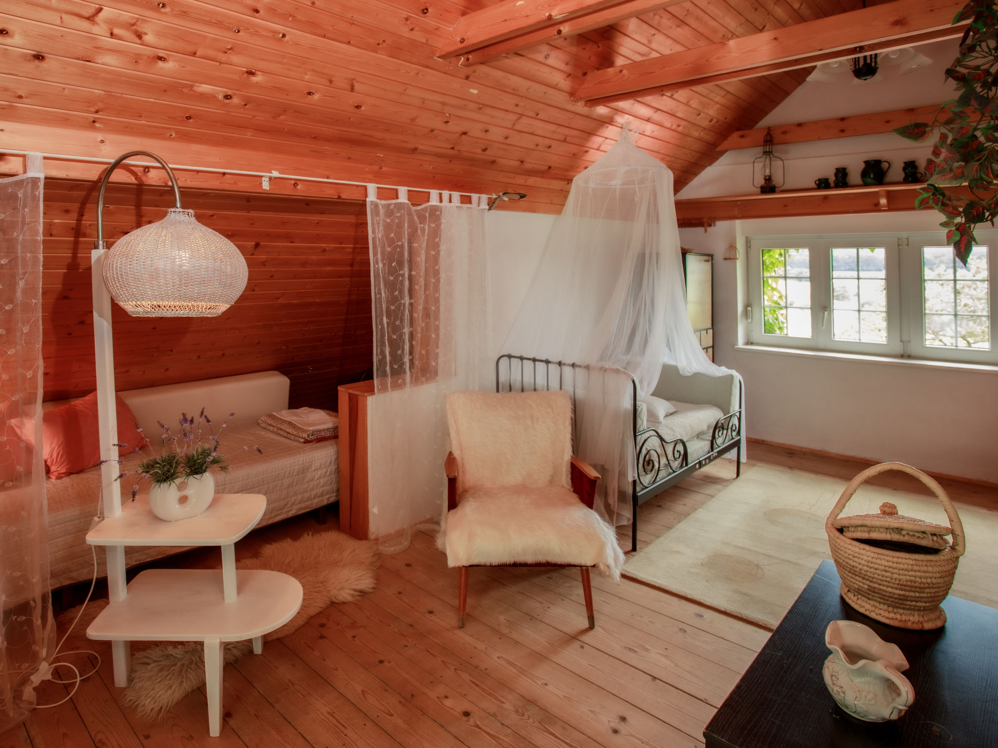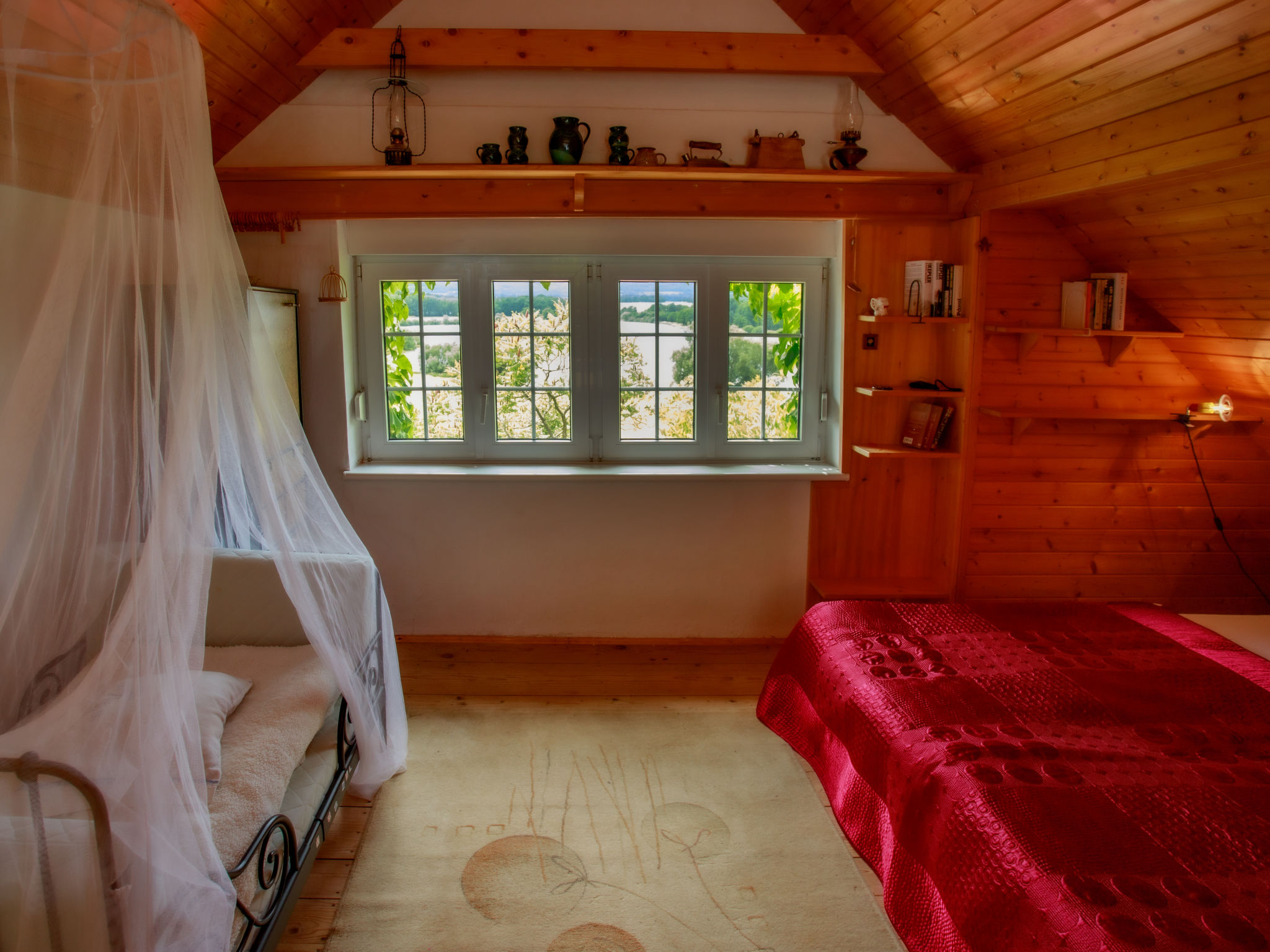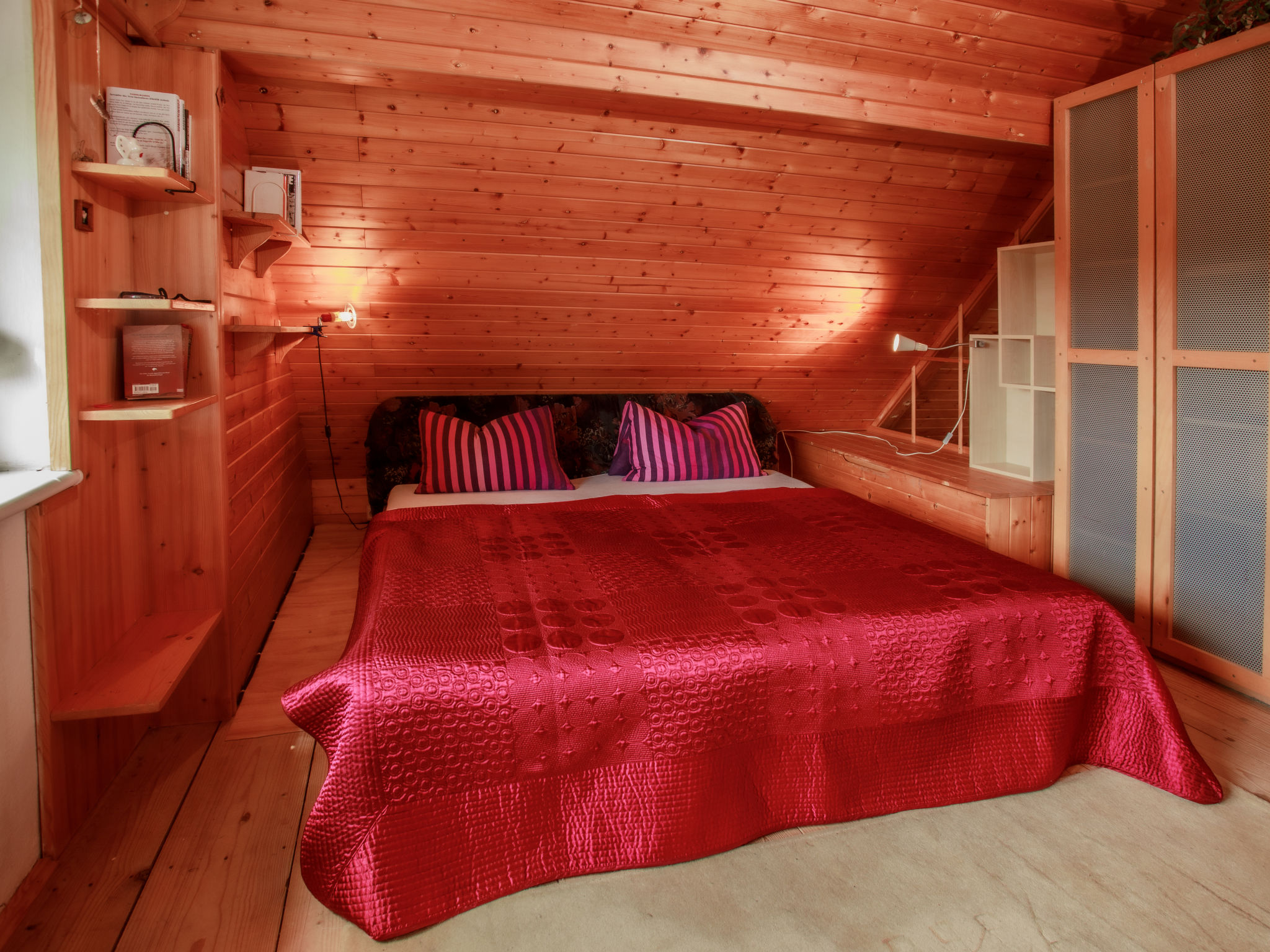 2-Zimmer-Haus 75 m2 auf 2 Stockwerken. Vollständig renoviert im Jahre 2005, schön und geschmackvoll eingerichtet: Wohn-/Schlafzimmer mit 1 Doppeldiwanbett, Schwedenofen, Esstisch, Sat-TV und Radio. Offene Küche (4 Kochplatten, Backofen, Geschirrspüler, Toaster, Wasserkocher, Mikrowelle, Tiefkühler, elektrische Kaffeemaschine). Bad, sep. WC. E-Heizung, Bodenheizung. Obergeschoss: 1 abgeschrägtes Zimmer mit 1 franz. Bett (130 cm), 1 Doppelbett. Terrasse. Terrassenmöbel, Liegestühle (4), Abstellkammer. Panoramasicht auf den See. Zur Verfügung: Waschmaschine, Kinderhochstuhl, Babybett. Internet (Wireless LAN, gratis). Bitte beachten: Nichtraucher-Unterkunft. Maximal 3 kleine Haustiere/Hunde erlaubt.