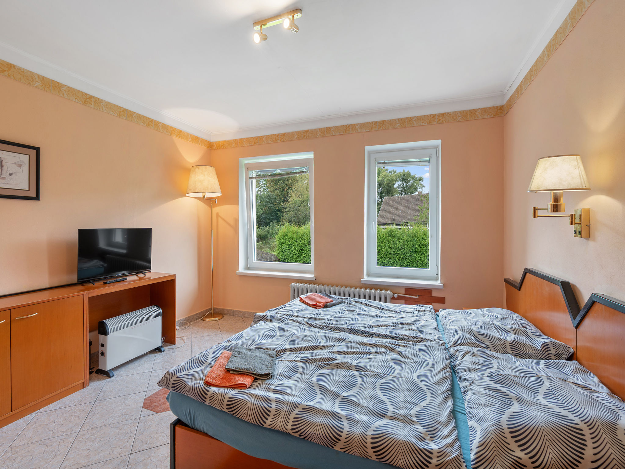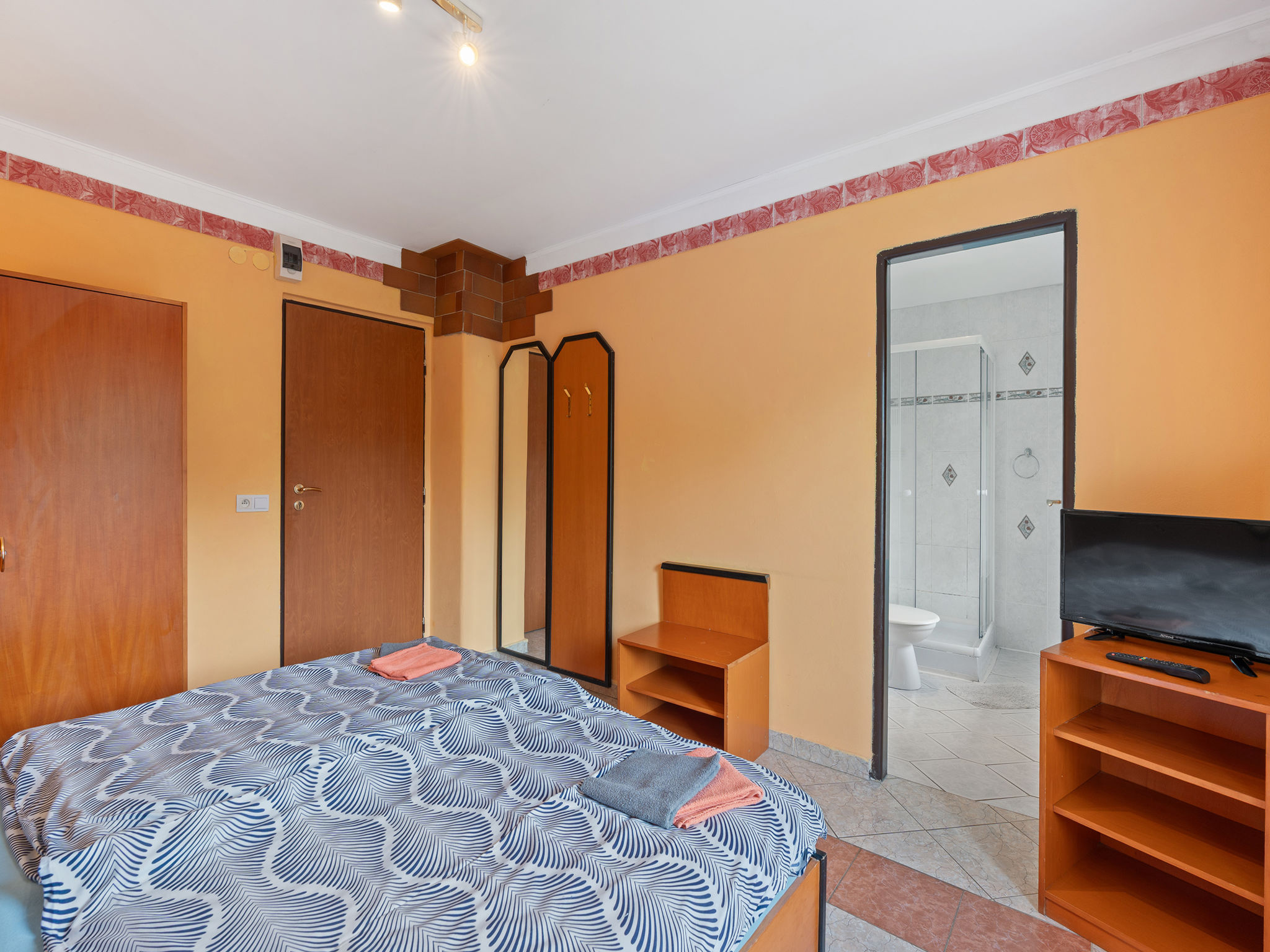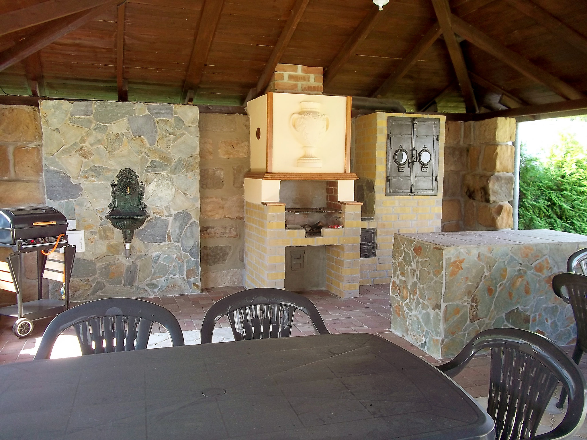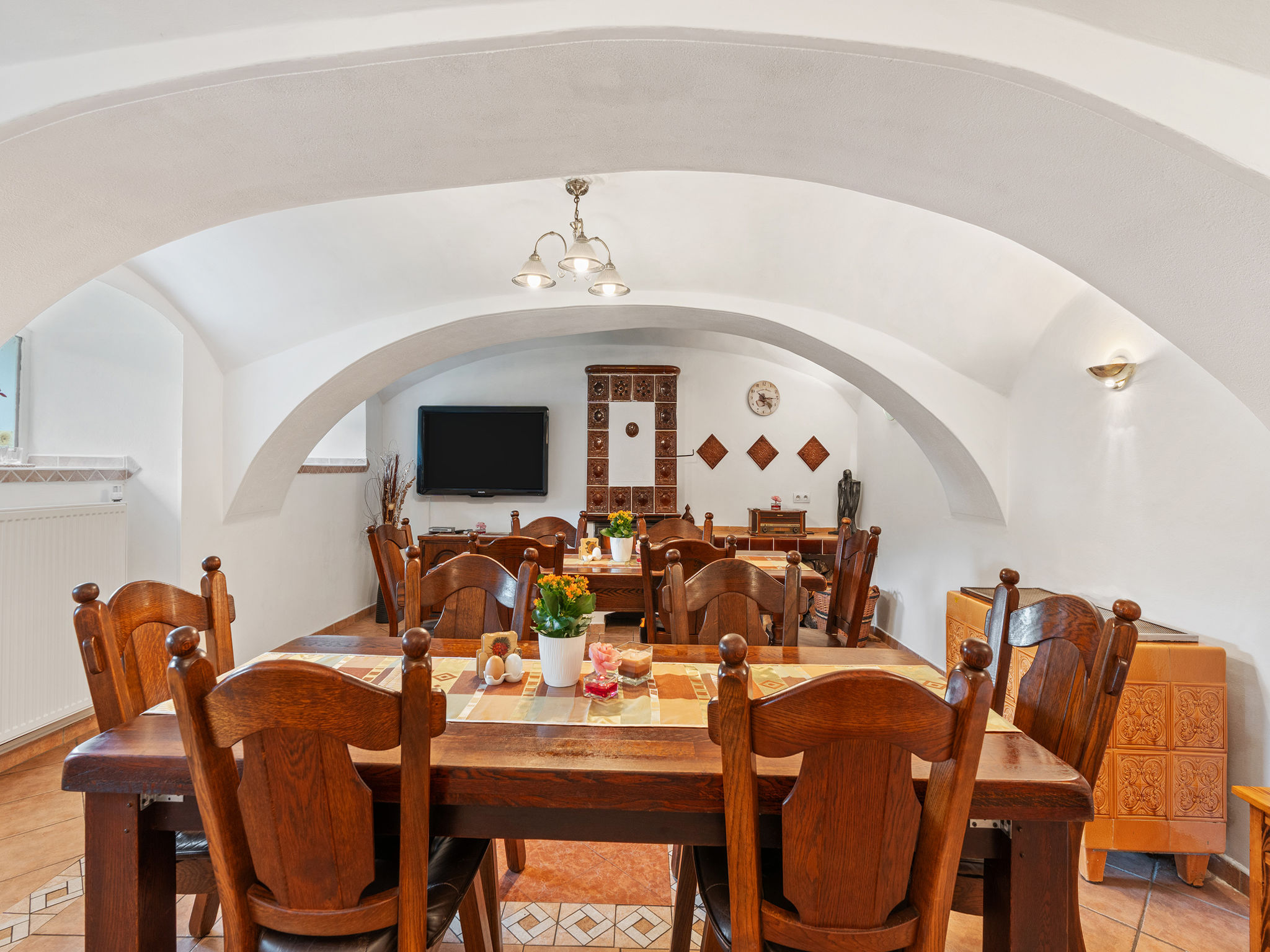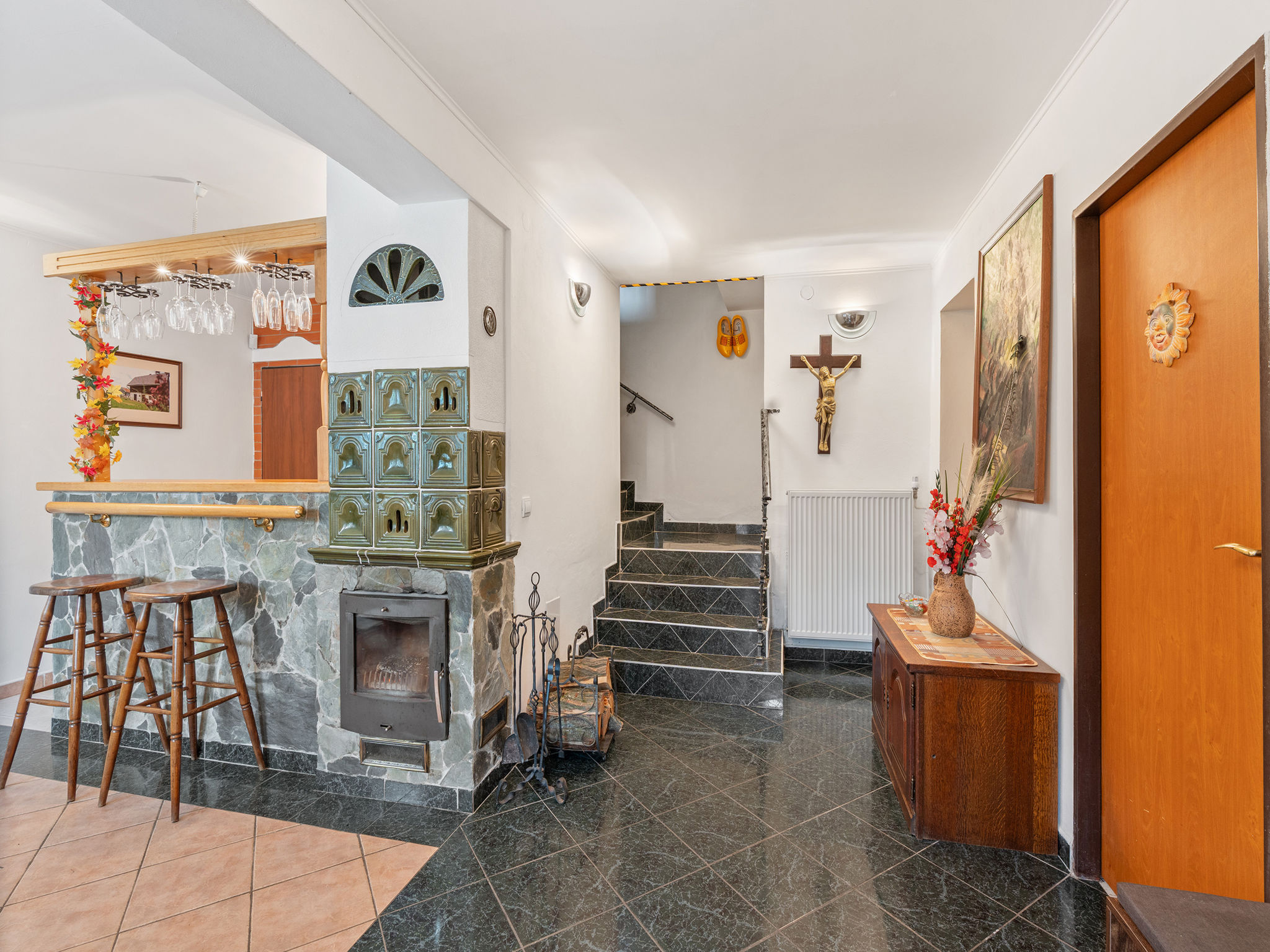 8-Zimmer-Haus 335 m2 auf 2 Stockwerken. Geräumig, komfortabel eingerichtet: Wohn-/Esszimmer mit Schwedenofen und Sat-TV (Flachbildschirm), Kachelofen. Kleiner Salon mit Schwedenofen. Grosse Küche (Backofen, Geschirrspüler, 4 Glaskeramikherd Platten, Toaster, Wasserkocher, Mikrowelle, Tiefkühler, Grill, Dampfgarer) mit sep. WC. 2 sep. WC's, Doppelwaschbecken. Obergeschoss: 3 Doppelzimmer, jedes Zimmer mit 1 franz. Bett, Dusche/WC, TV und Heizofen. Wohn-/Schlafzimmer mit 2 Betten, Dusche/WC und TV. Kleines Wohnzimmer mit Dusche/WC. 2. Obergeschoss: (Wendeltreppe) abgeschrägte kleine Galerie mit 2 Doppelbetten. Zur Verfügung: Internet (Wireless LAN, gratis). 2 Haustiere/Hunde erlaubt.