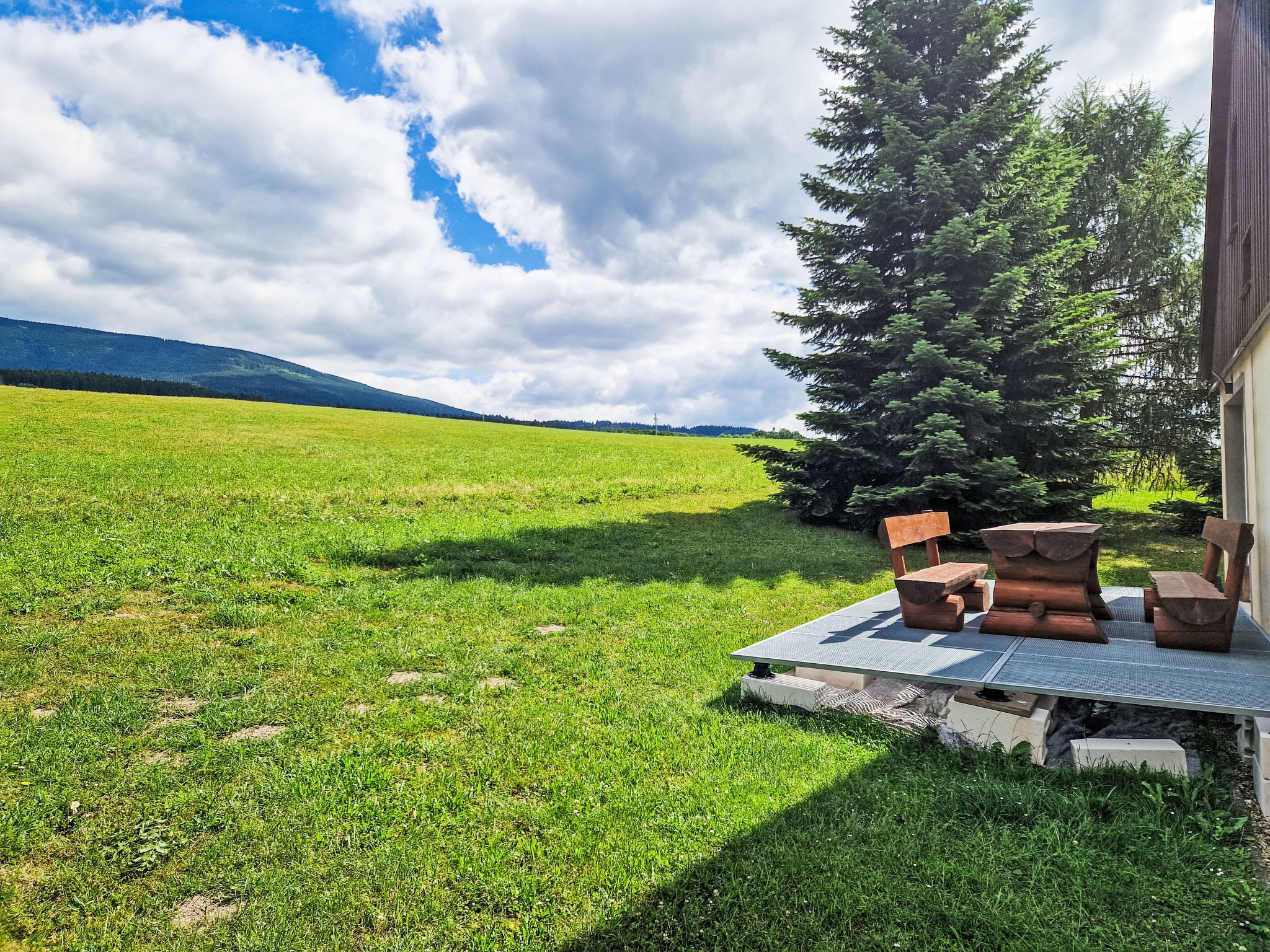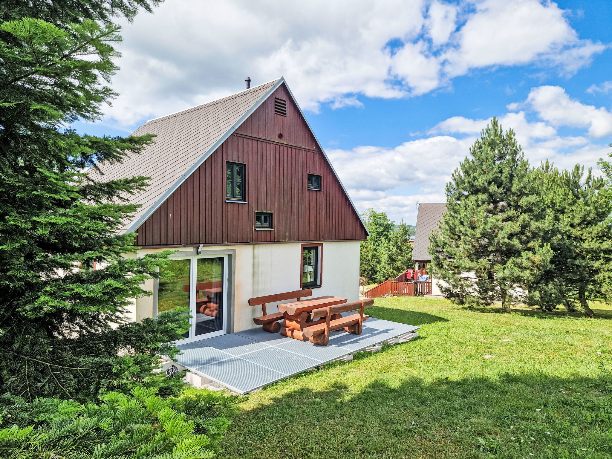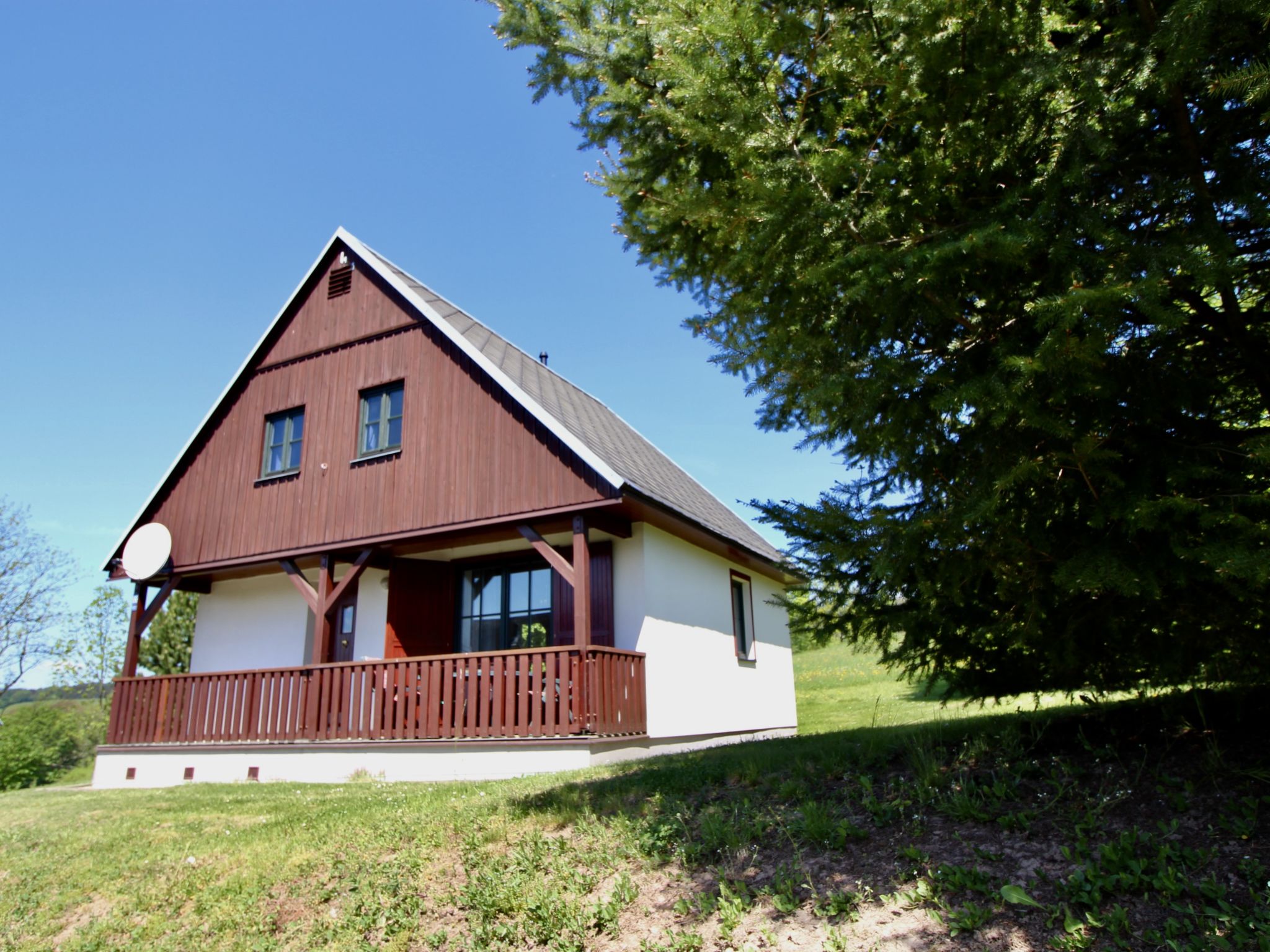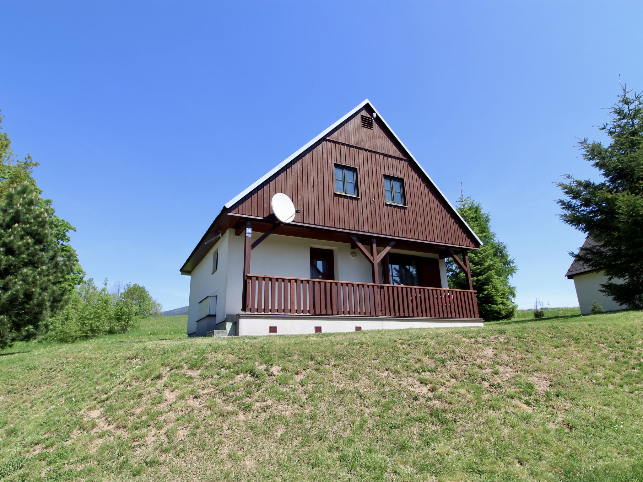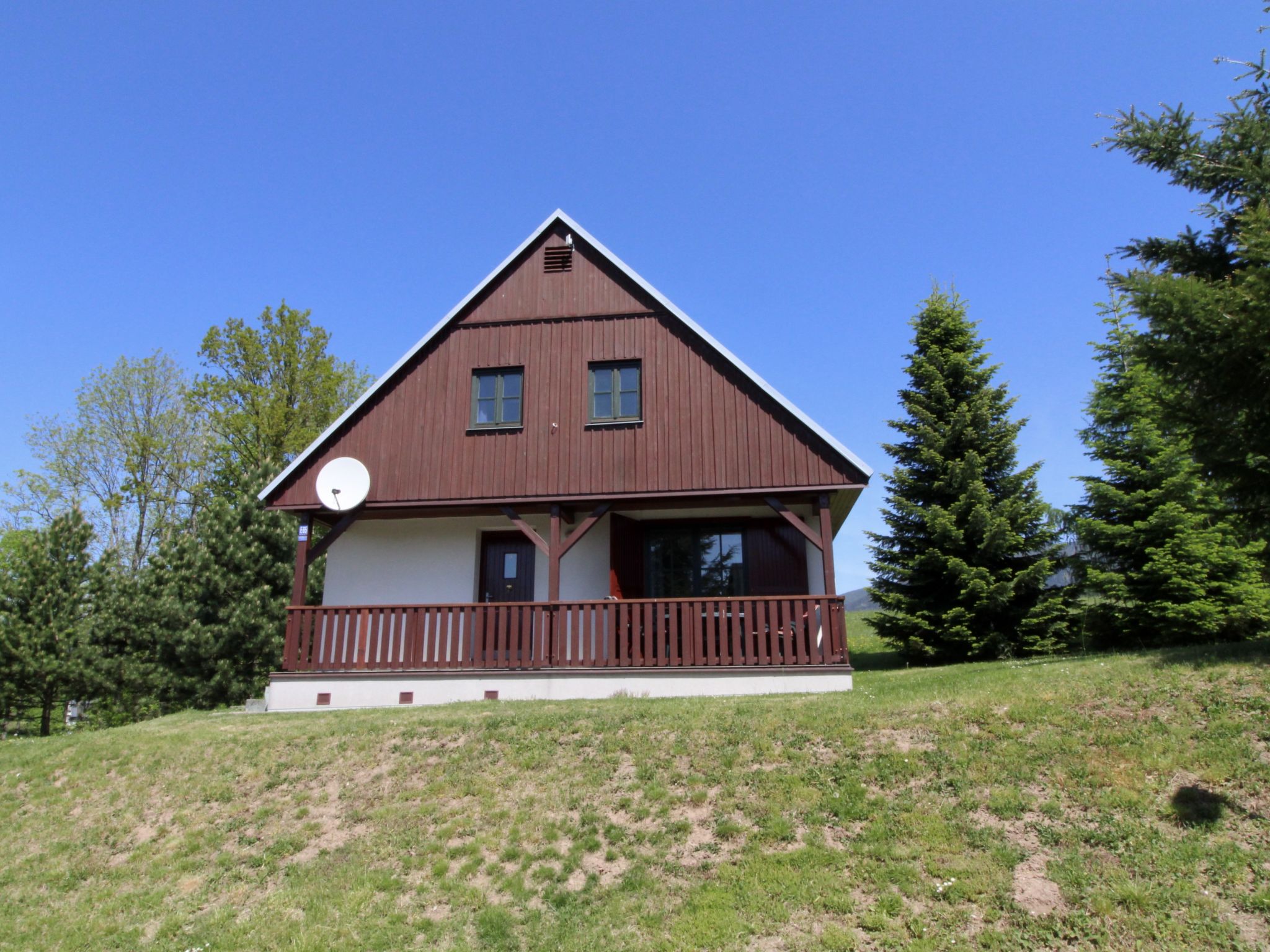 Čistá v Krkonoších 2 km von Černý Důl: Kinderfreundliches, schönes, komfortables Feriendorf "Holiday Hill", 500 m.ü.M., umgeben von Bäumen und Wiesen. 43 Häuser im Ferienresort. Am Ortsrand, alleinstehende, ruhige, sonnige Lage, 1.5 km vom See, 3 km vom Skigebiet, im Grünen. Zur Mitbenutzung: Grundstück 6 ha, Wiese, Schwimmbad beheizt (9 x 4 m, 120 cm tief, saisonale Verfügbarkeit: 01.Jun.-26.Sep. Öffnungszeiten Schwimmbad: 09:00-20:00). Dusche/WC im Poolbereich, Tischtennis, Kinderspielplatz (Schaukel, Sandkasten). In der Anlage: Empfang. Parkplatz (für 2 Autos) beim Haus. Einkaufsgeschäft 2.5 km, Lebensmittelgeschäft 2.5 km, Supermarkt 7.5 km, Restaurant 1.6 km, Biergarten 400 m, Bushaltestelle "Černý Důl, Čistá-pošta" 400 m, Sandstrand 1.5 km (klein), Hallenbad 19 km. Golfplatz (18 Loch) 14 km, Tennis 2.5 km, Sportzentrum 2.5 km, Wanderwege ab Haus, Radweg 100 m, Skilift 3 km, Sessellift 3 km, Skipisten 3 km, Skibushaltestelle 100 m, Skischule 3 km, Kinderskischule 3 km, Schlittelbahn 7 km, Langlaufloipe 100 m. Nahe gelegene Sehenswürdigkeiten: Janské Lázně Spa 9 km, Vrchlabí 10 km, Aquapark Trutnov 25 km, Zoo Safari Dvůr Králové 29 km, Bozkovské jeskyně 37 km, Adršpašské skály 44 km. Bekannte Skigebiete sind gut erreichbar: Černý Důl 3 km, Herlíkovice 15 km, Pec pod Sněžkou 22 km. Bekannte Seen in der Umgebung sind gut erreichbar: Čistá 1.5 km, Vrchlabí 9 km. Wandergebiete: Sněžka 25 km.