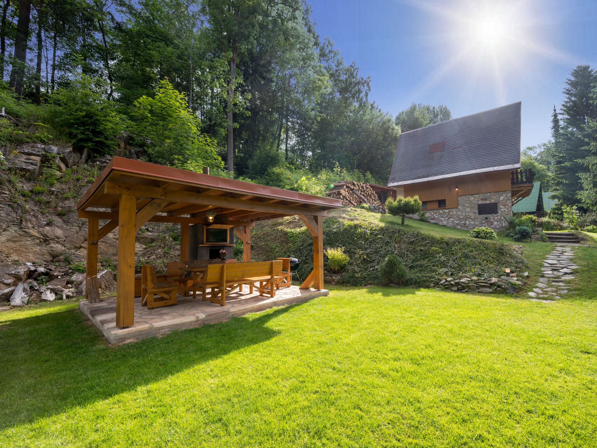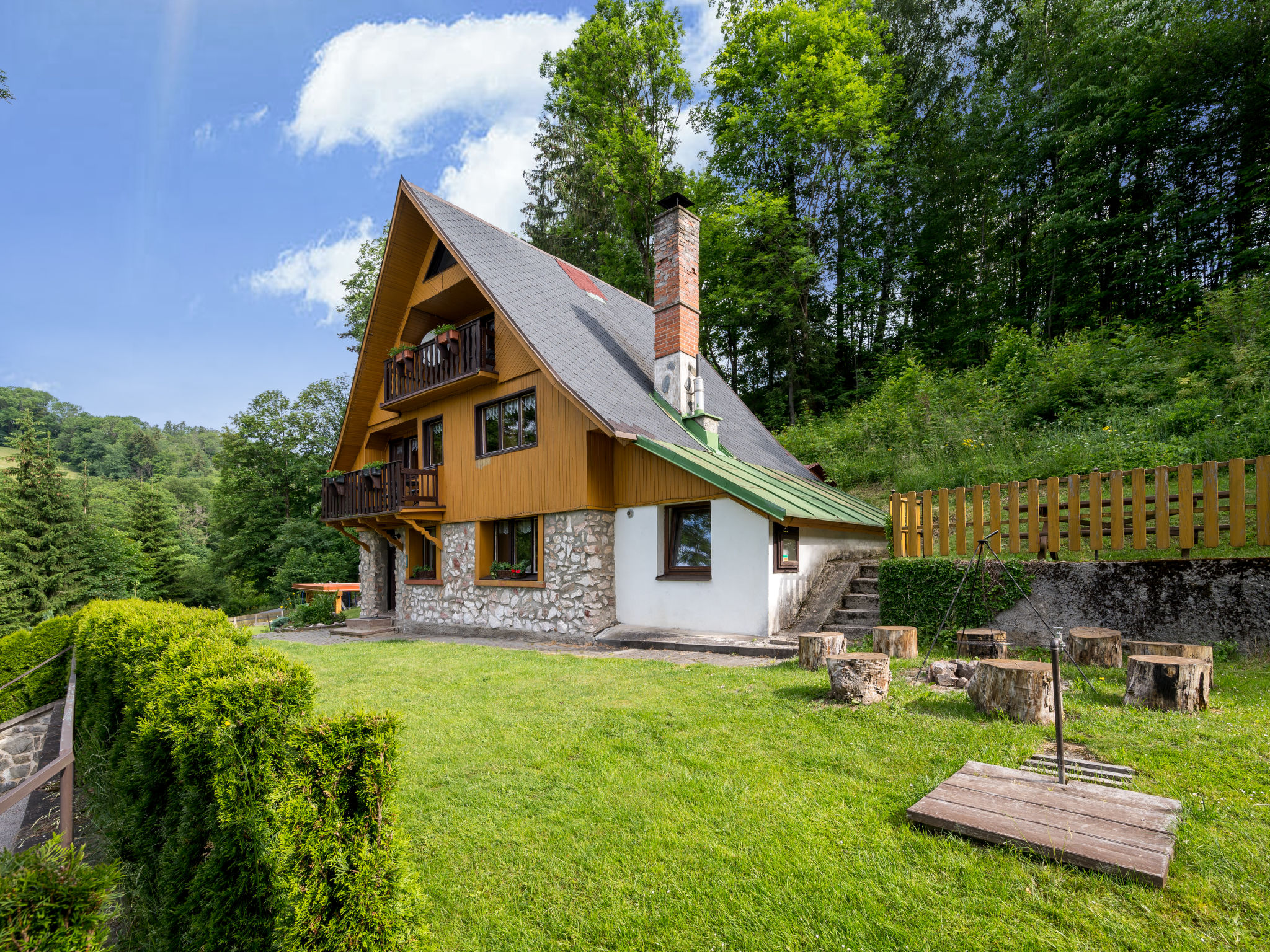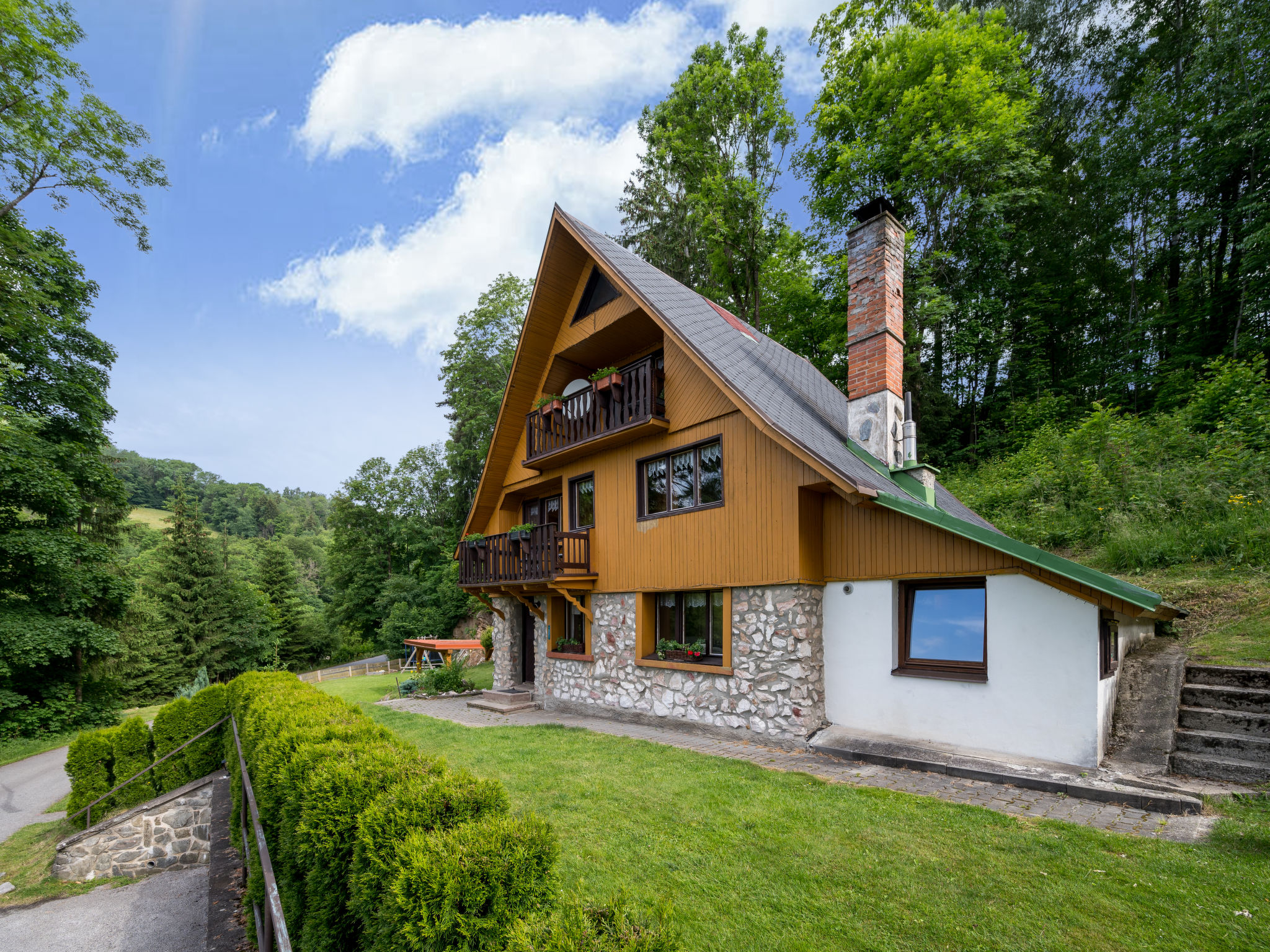Mrklov 2 km von Benecko: Schönes, gemütliches, alleinstehendes Chalet "Mrklov", auf 3 Stockwerken, Baujahr 1975, renoviert im Jahre 2010. Ruhige, sonnige, erhöhte Lage, 10 m vom Waldrand, 300 m vom Skigebiet, im Grünen. Zur Alleinbenutzung: Grundstück 700 m2, Garten mit Rasen. Pergola, Gartenmöbel, Grill, Kinderspielplatz (Schaukel, Sandkasten). Im Hause: Trampolin, Zentralheizung. Parkplatz beim Haus. Einkaufsgeschäft 2 km, Lebensmittelgeschäft 2 km, Supermarkt 4 km, Restaurant 400 m, Bushaltestelle "Benecko-Štěpanická Lhota/u lomu" 100 m, Bahnstation "Hrabačov" 500 m, Freibad 7 km, Hallenbad 4 km. Tennis 4 km, Radweg 700 m, Luftseilbahn 800 m, Skilift 200 m, Sessellift 800 m, Skipisten 200 m, Skiverleih, Skischule, Kinderskischule 800 m, Langlaufloipe 2 km, Kinderspielplatz 2 km. Nahe gelegene Sehenswürdigkeiten: rozhledna Sovinec 4 km, Jilemnice 6 km, Vrchlabí 9 km. Bekannte Skigebiete sind gut erreichbar: Benecko 2 km, Herlíkovice 11 km, Špindlerův Mlýn 19 km. Wandergebiete: Bucharova cesta 1 km.