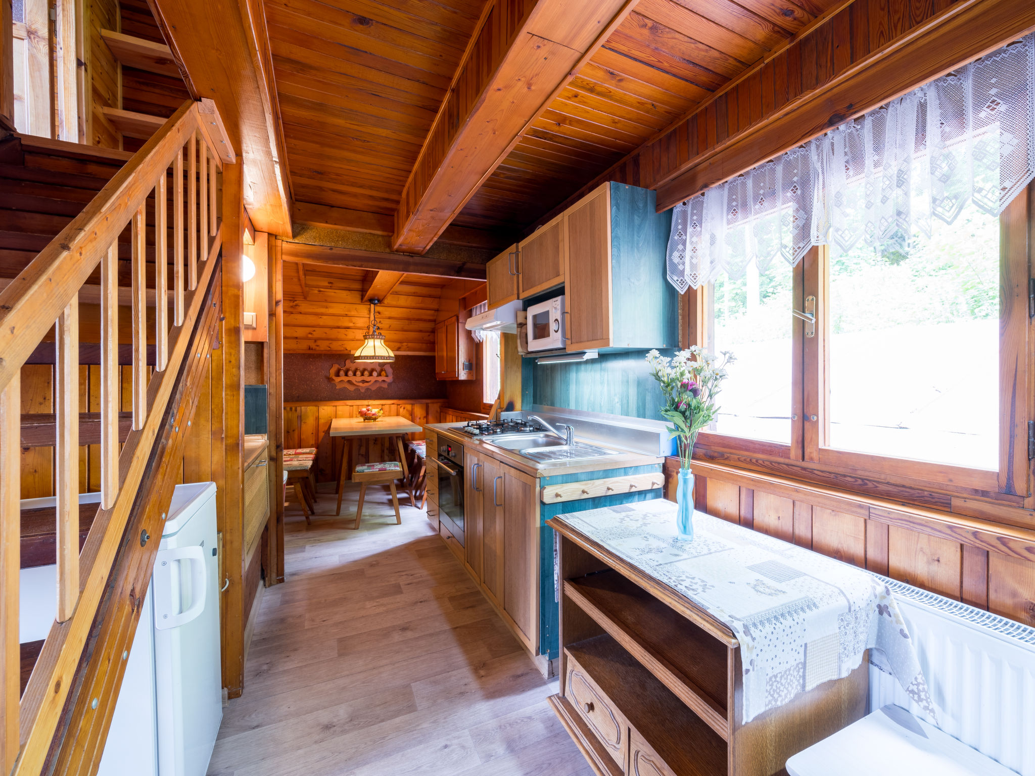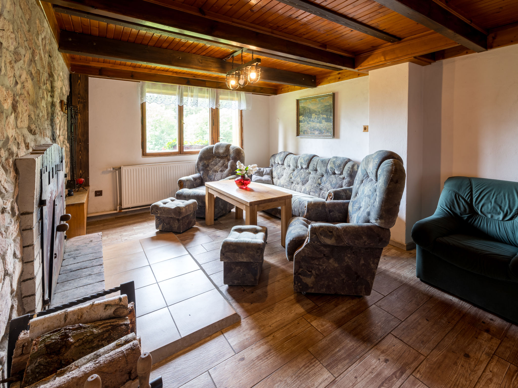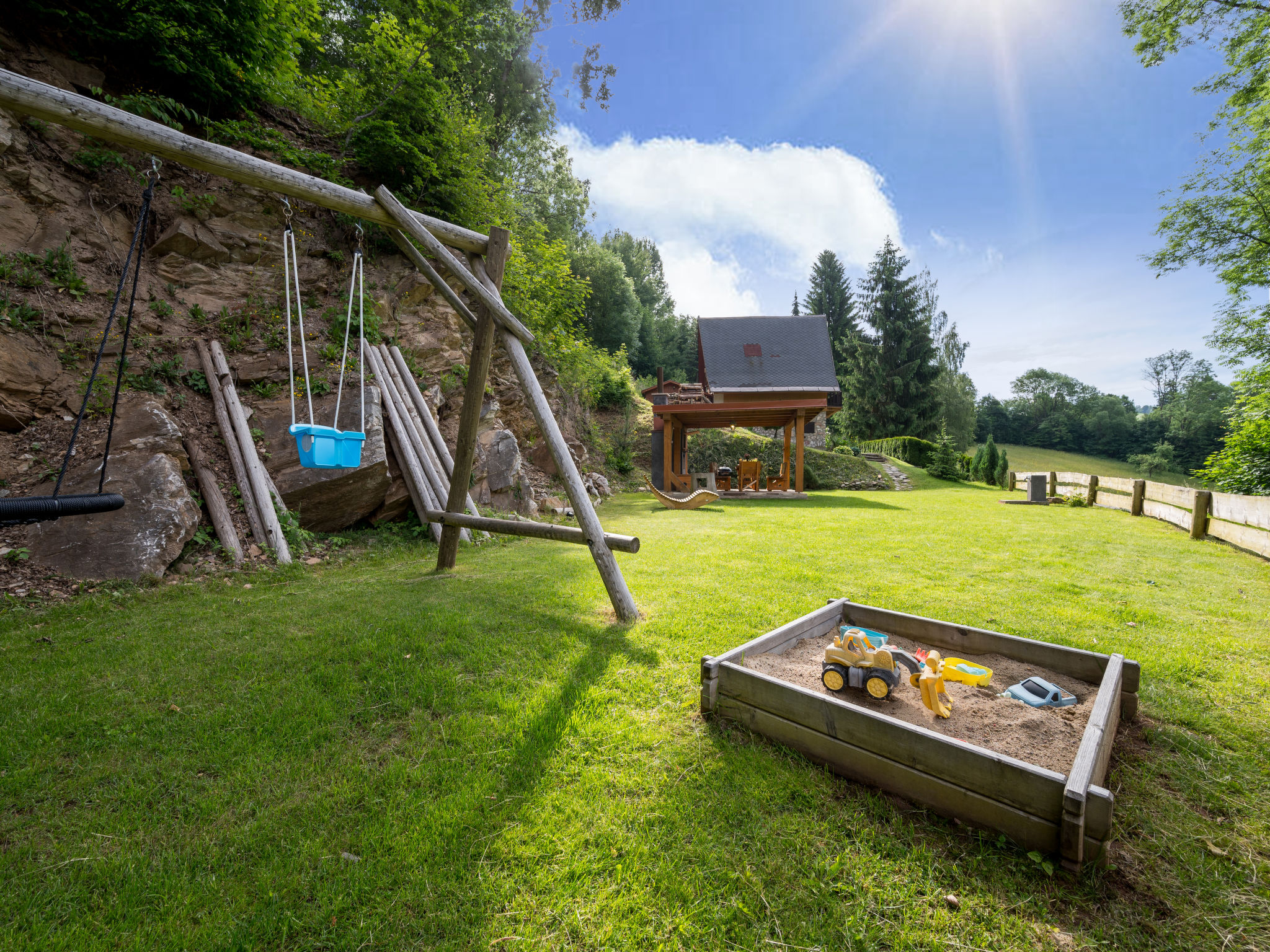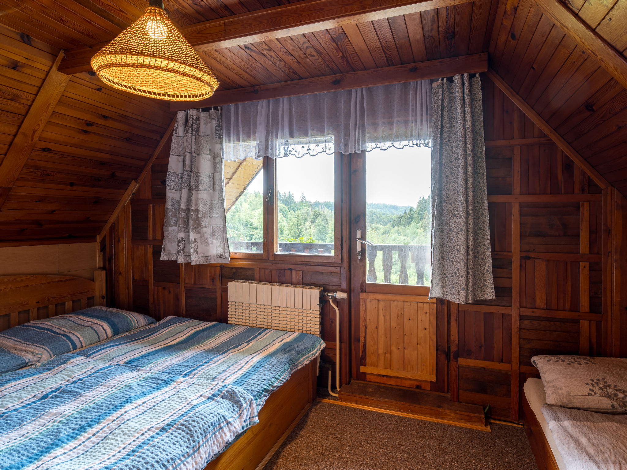 5-Zimmer-Chalet 140 m2 auf 3 Stockwerken. Renoviert im Jahre 2010: grosses Wohnzimmer mit offenem Kamin, Radio, CD und DVD. Wohnzimmer mit Sat-TV (Flachbildschirm). Küche (4 Kochplatten, Backofen, Mikrowelle, Tiefkühler, elektrische Kaffeemaschine) mit Esstisch. Obergeschoss: 3 Zimmer, jedes Zimmer mit 2 Betten. 1 Zimmer mit 1 Diwanbett. Sep. WC, Bad/Dusche/WC. 2 Balkone, Südlage, Gartensitzplatz. Terrassenmöbel. Sehr schöne Sicht auf die Landschaft und den Wald. Zur Verfügung: Babybett. Internet (Wireless LAN, gratis). 2 Haustiere/Hunde erlaubt.