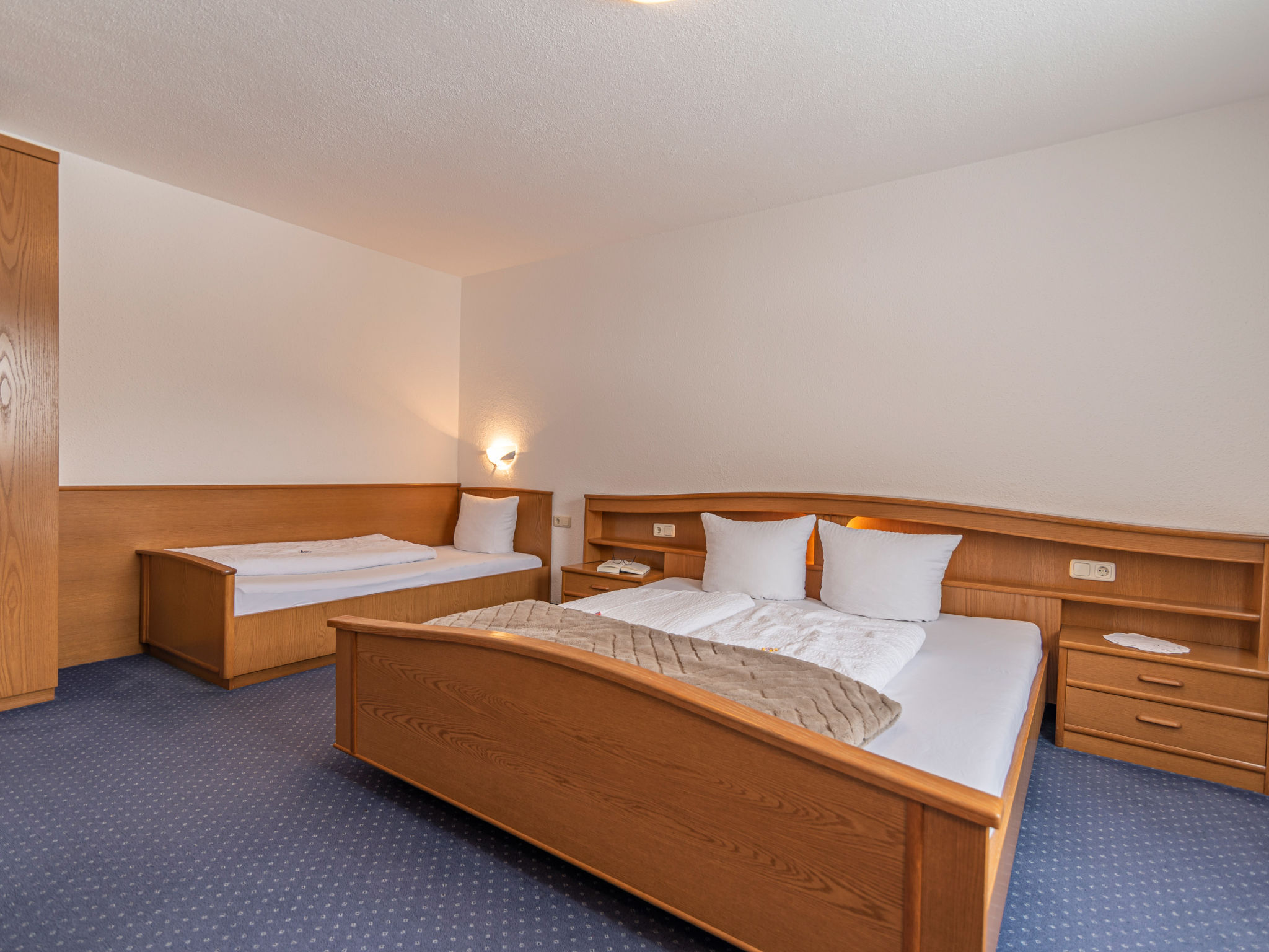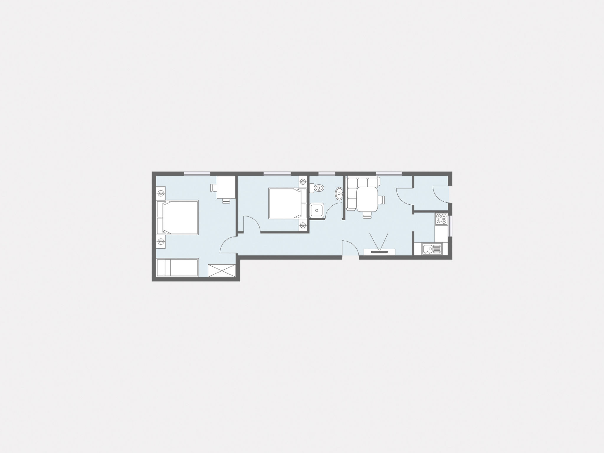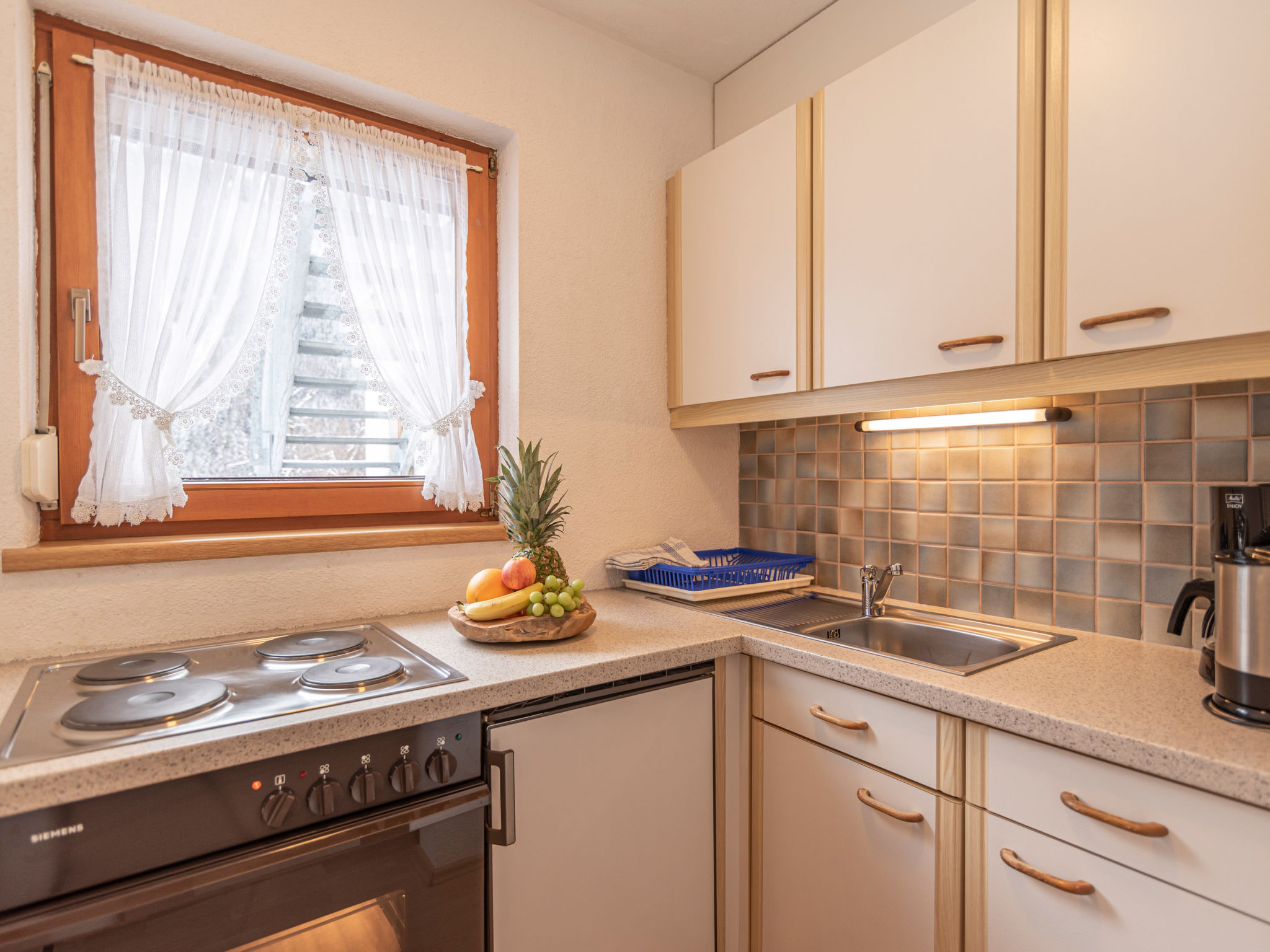 3-Zimmer Wohnung, Erdgeschoss, ca. 60 m². Wohnraum mit Essplatz (Eckbank). Zum Wohnraum offene Küche (4 Platten, Backofen, Kühlschrank, Kaffeemaschine, Wasserkocher). Doppelzimmer. Schlafzimmer mit Doppelbett und Einzelbett. Dusche/WC.