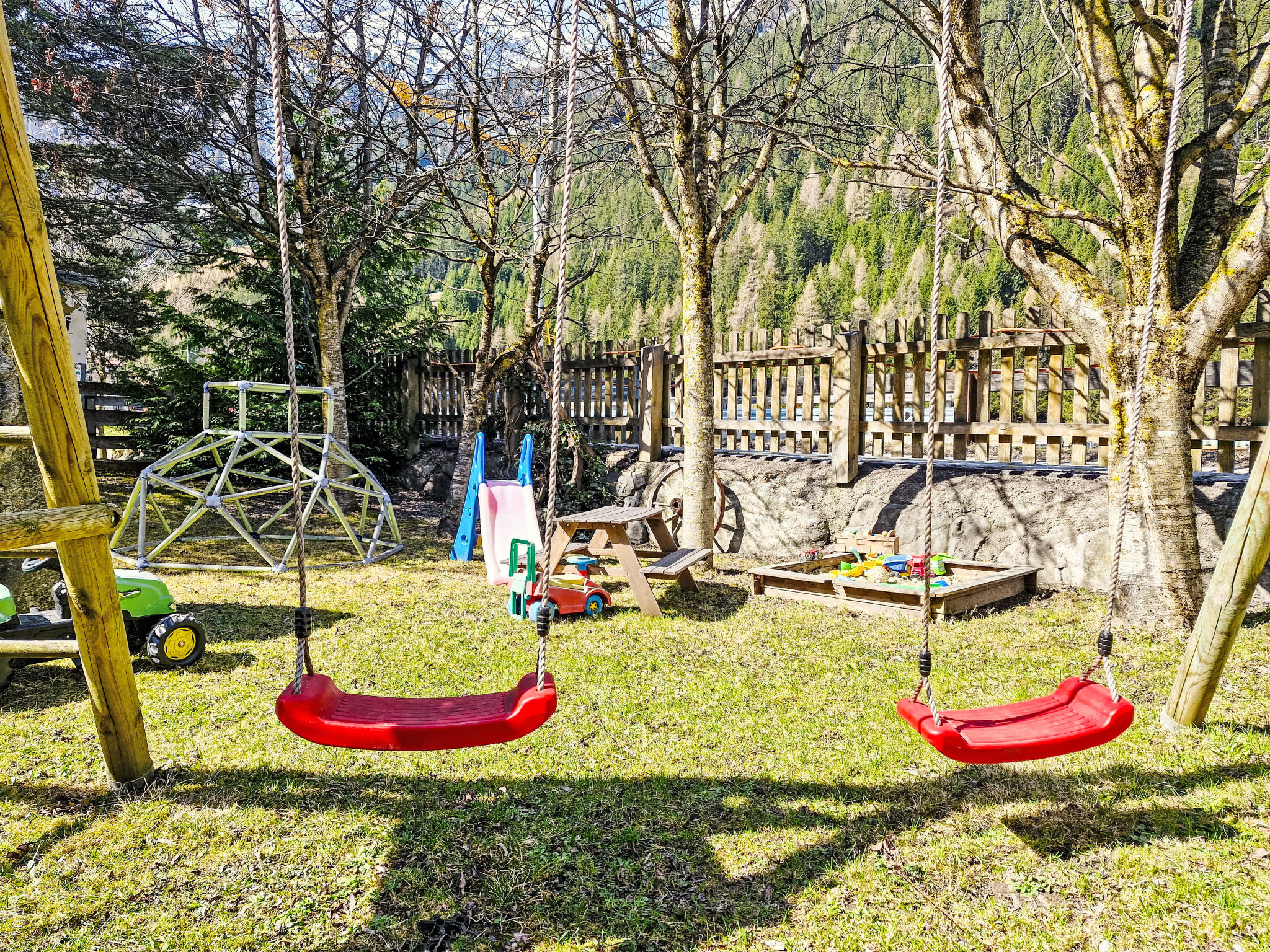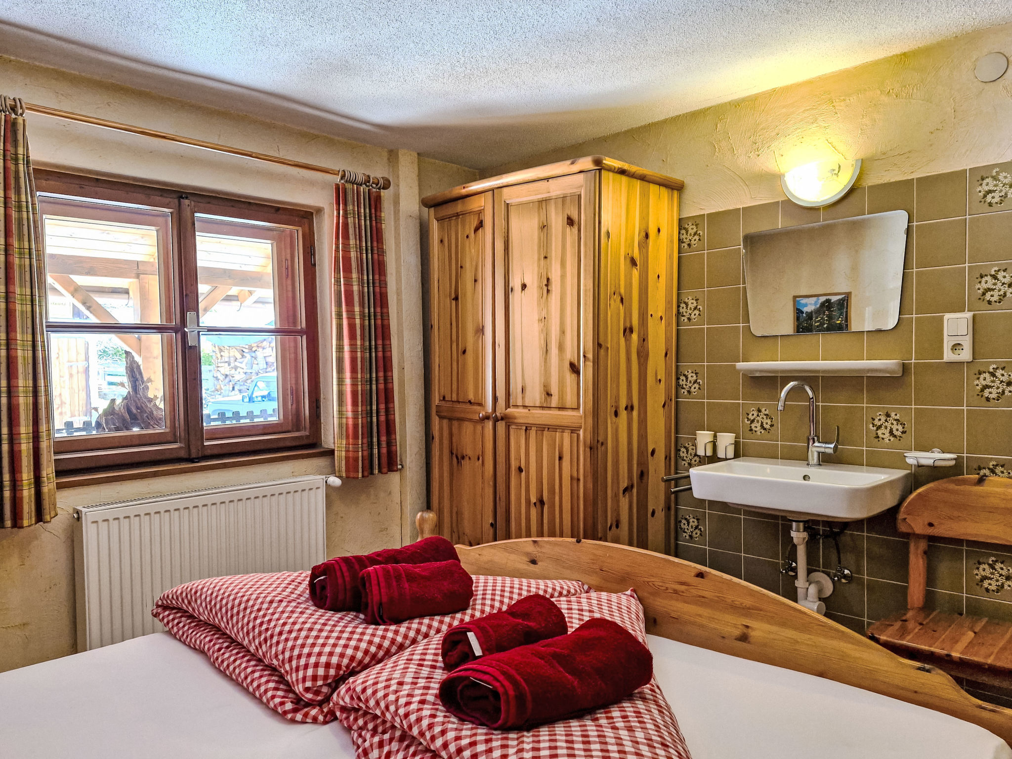 4-Zimmer-Wohnung 'Almrose', Erdgeschoss, ca. 60 m². Wohn-/Schlafraum mit Sitzgruppe/Doppelbettcouch mit Kamin. Wohnküche (4 Ceranfelder, Backofen, Geschirrspüler, Mikrowelle, Kühlschrank, Kaffeemaschine, Wasserkocher, Toaster) mit Essplatz (Eckbank) und Sitzcouch. 2 Doppelzimmer. Dusche/WC. Föhn vorhanden. Bei Belegung mit weniger Personen als der maximalen Personenzahl stehen nicht alle Wohneinheiten zur Verfügung.