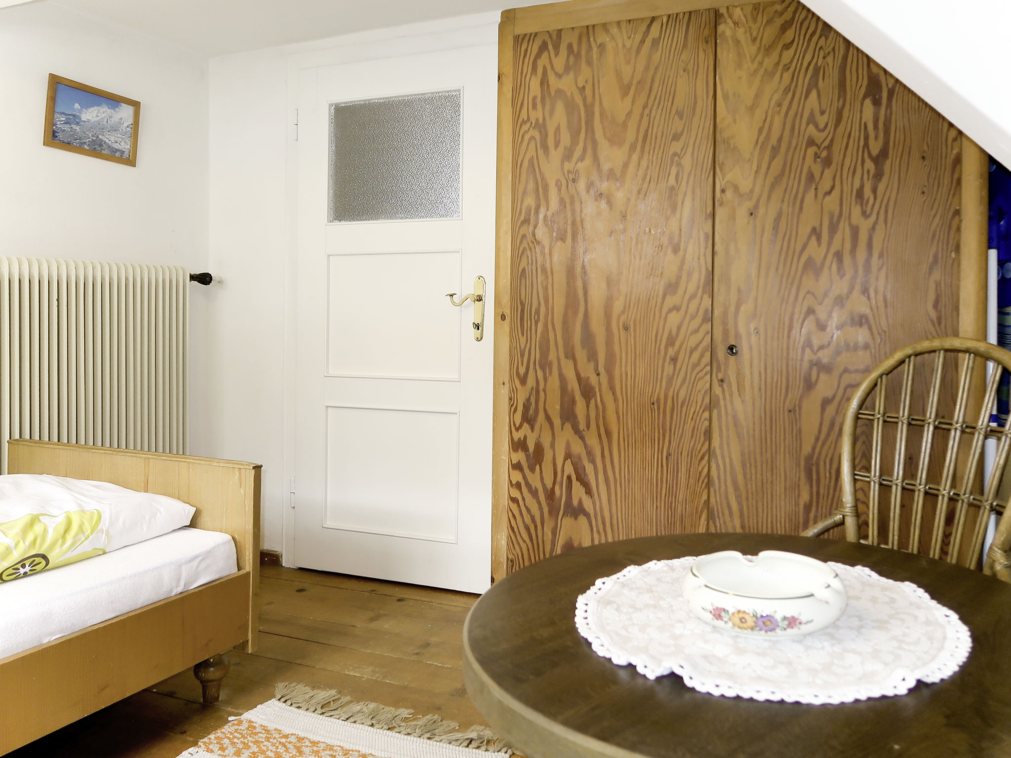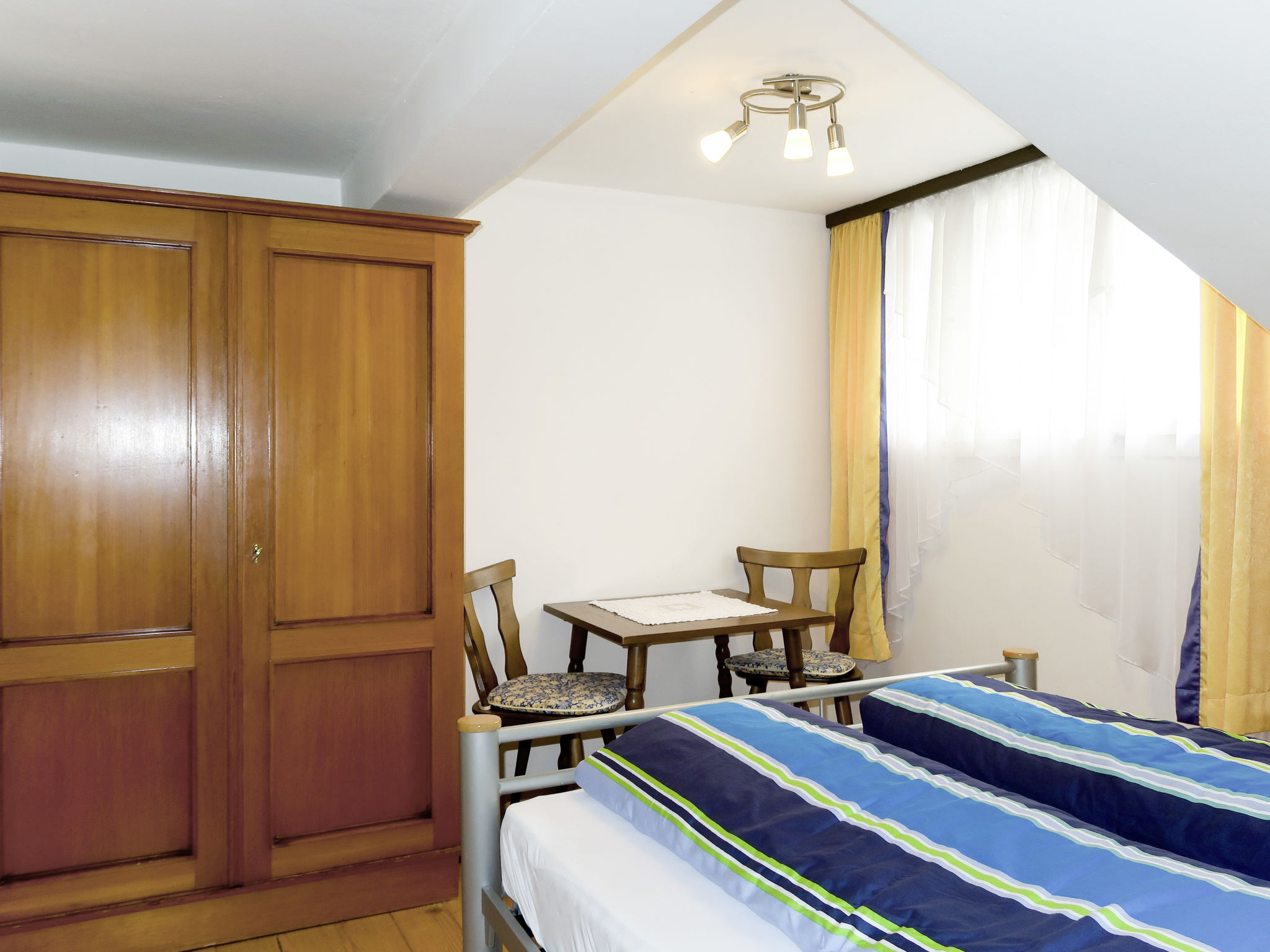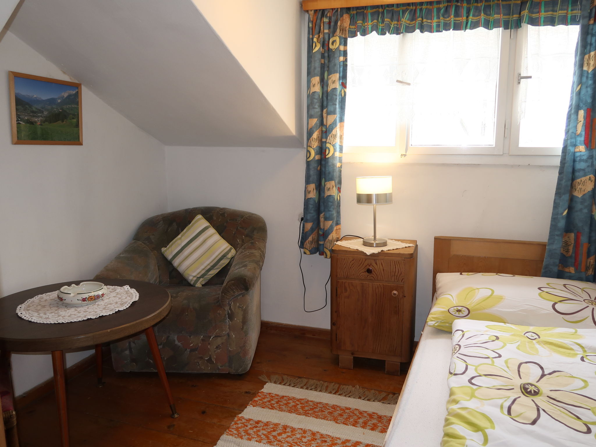 "Huber (GIT110)", 4-Zimmer-Wohnung 60 m2 im 2. Stock. Einfach eingerichtet: Wohnzimmer, Deckenhöhe 195 cm, niedrige Türrahmen, Höhe 175 cm mit Sat-TV. Ausgang zum Balkon. 1 abgeschrägtes Zimmer mit 1 franz. Bett. 1 Doppelzimmer. 1 Zimmer mit 1 Bett. Küche (Backofen, Geschirrspüler, 4 Glaskeramikherd Platten, Toaster, Wasserkocher, elektrische Kaffeemaschine) mit Essecke. Ausgang zum Balkon. Dusche/WC. Ölheizung. Holzböden. Balkon. Balkonmöbel, Abstellkammer. Zur Verfügung: Internet (Wireless LAN, gratis). Parkplatz (1 Auto). 1 Haustier/Hund erlaubt.