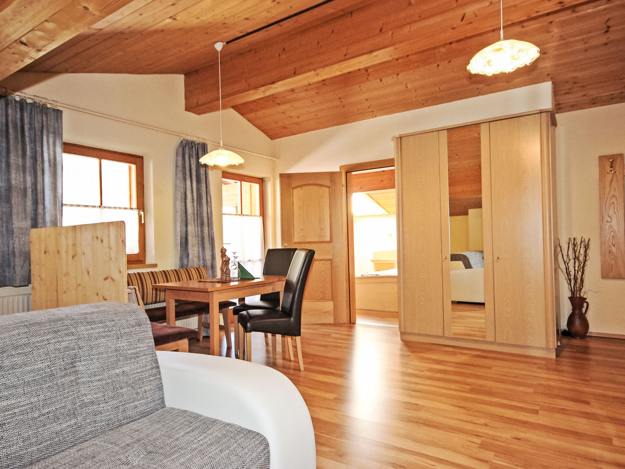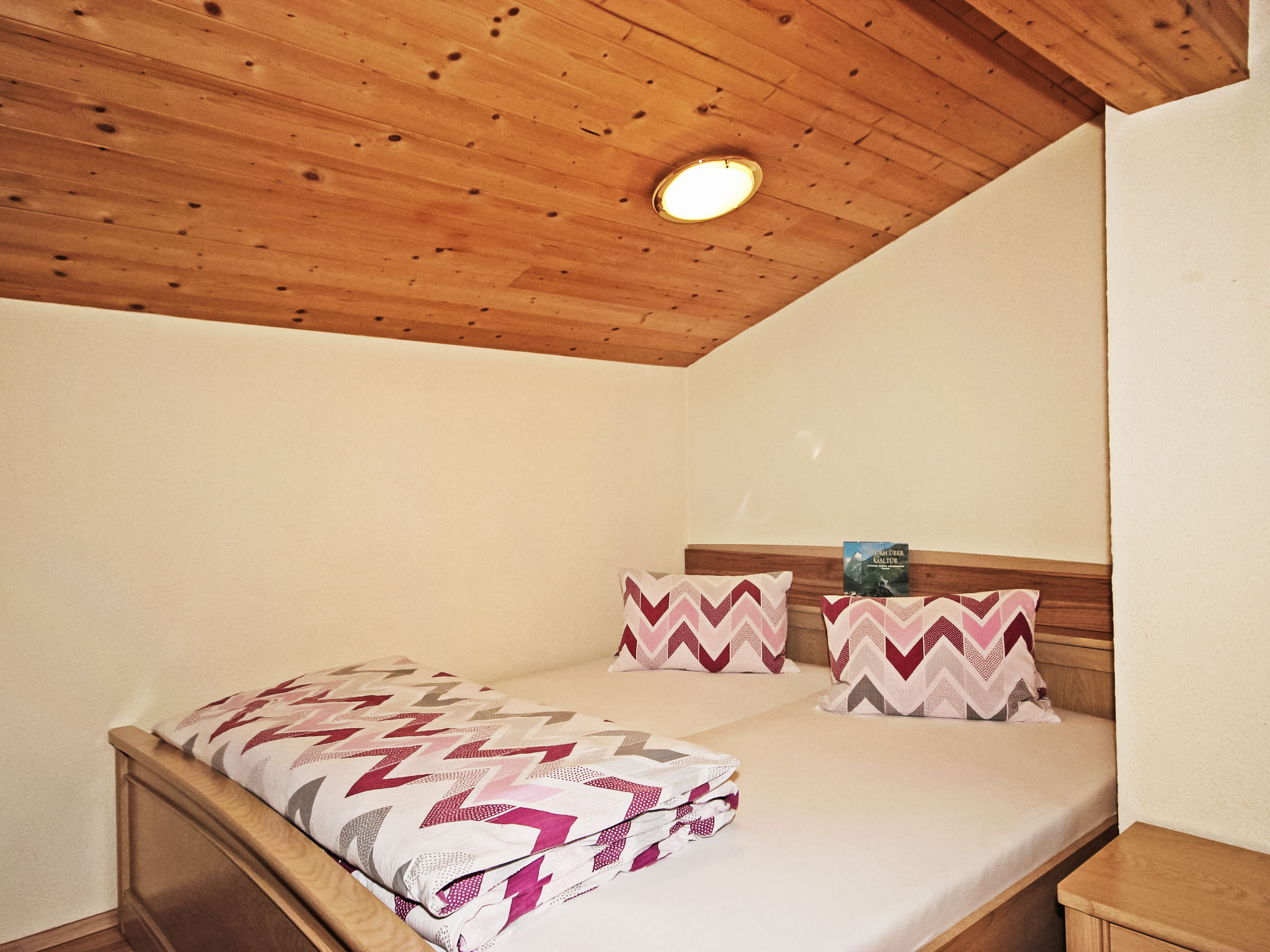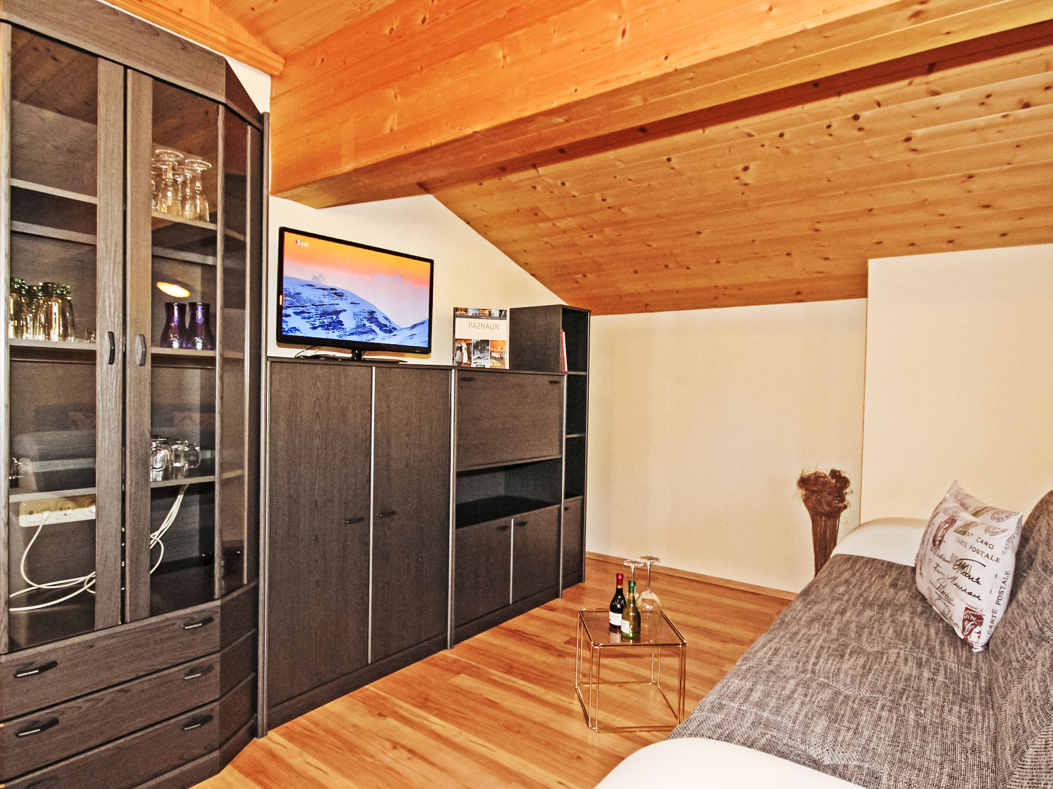 2-Zimmer-Wohnung 60 m2 im 2. Stock. Teilweise abgeschrägt, gemütlich eingerichtet: Eingang. Grosses Wohn-/Schlafzimmer mit 1 Doppelbett, Essecke und Sat-TV (Flachbildschirm). Ausgang zum Balkon. 1 Doppelzimmer. Offene Küche (4 Kochplatten, Backofen, Mikrowelle, elektrische Kaffeemaschine). Dusche/WC. Balkon. Terrassenmöbel. Schöne Sicht auf die Berge. Zur Verfügung: Internet (Wireless LAN, gratis).