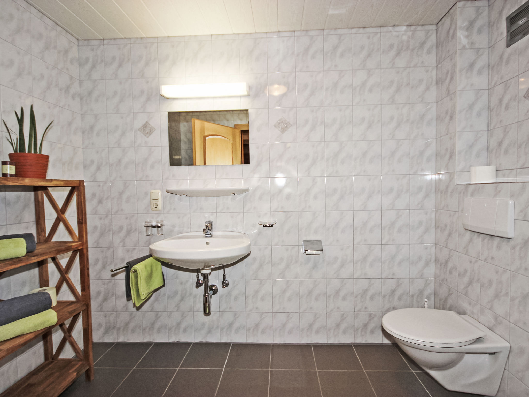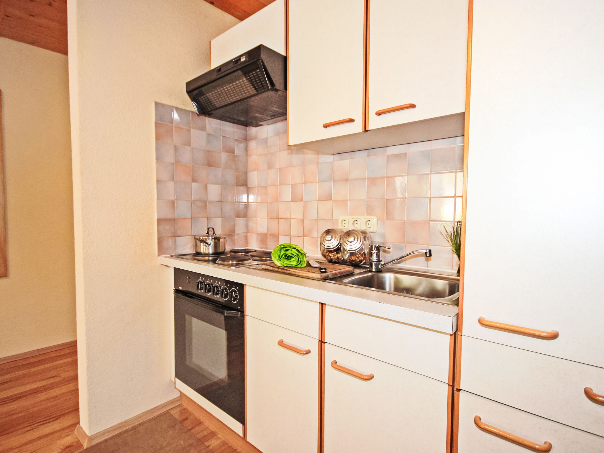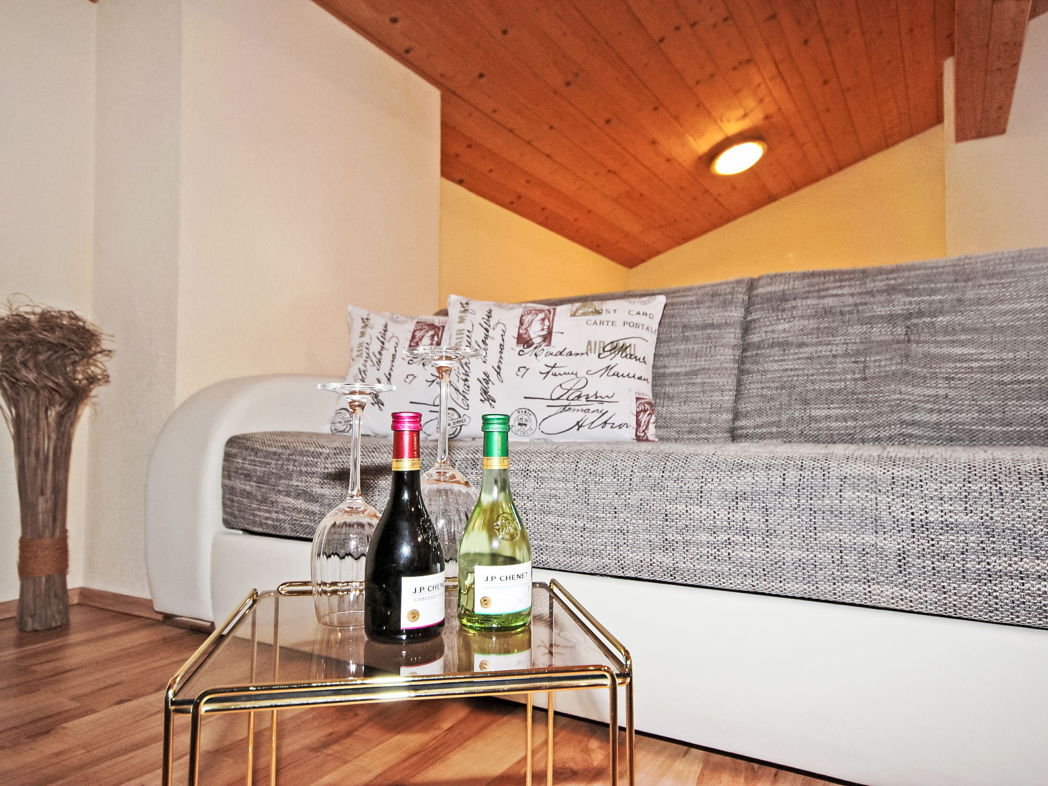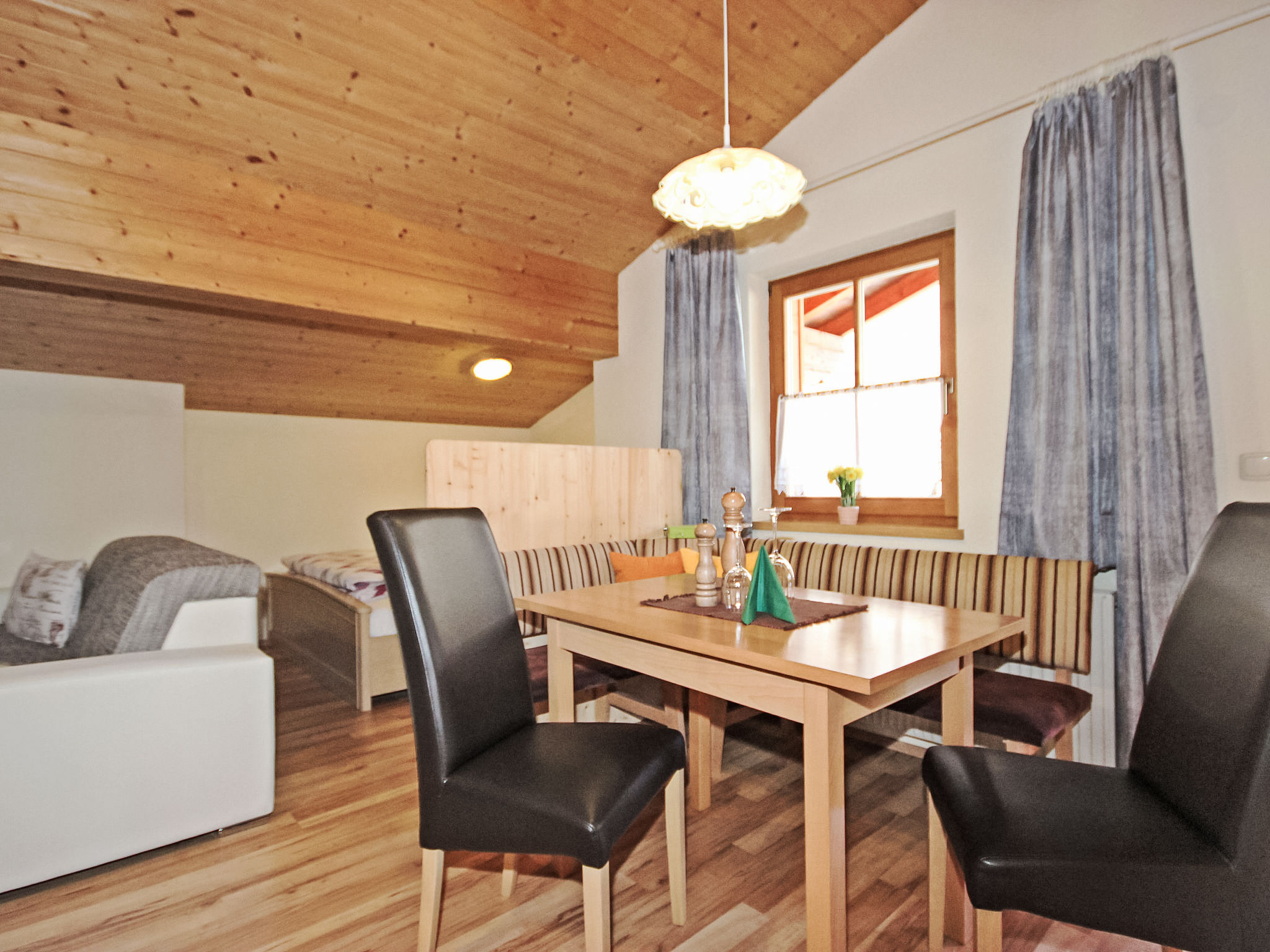 2-Zimmer-Wohnung 60 m2 im 2. Stock. Teilweise abgeschrägt, gemütlich eingerichtet: Eingang. Grosses Wohn-/Schlafzimmer mit 1 Doppelbett, Essecke und Sat-TV (Flachbildschirm). Ausgang zum Balkon. 1 Doppelzimmer. Offene Küche (4 Kochplatten, Backofen, Mikrowelle, elektrische Kaffeemaschine). Dusche/WC. Balkon. Terrassenmöbel. Schöne Sicht auf die Berge. Zur Verfügung: Internet (Wireless LAN, gratis).